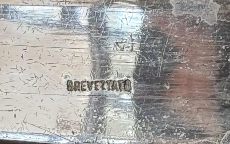 Marcajul „BREVETTATO” este un termen italian care înseamnă „Brevetat” (înregistrat ca invenție/design), confirmând faptul că pieasa este de fabricație italiană din secolul XX.