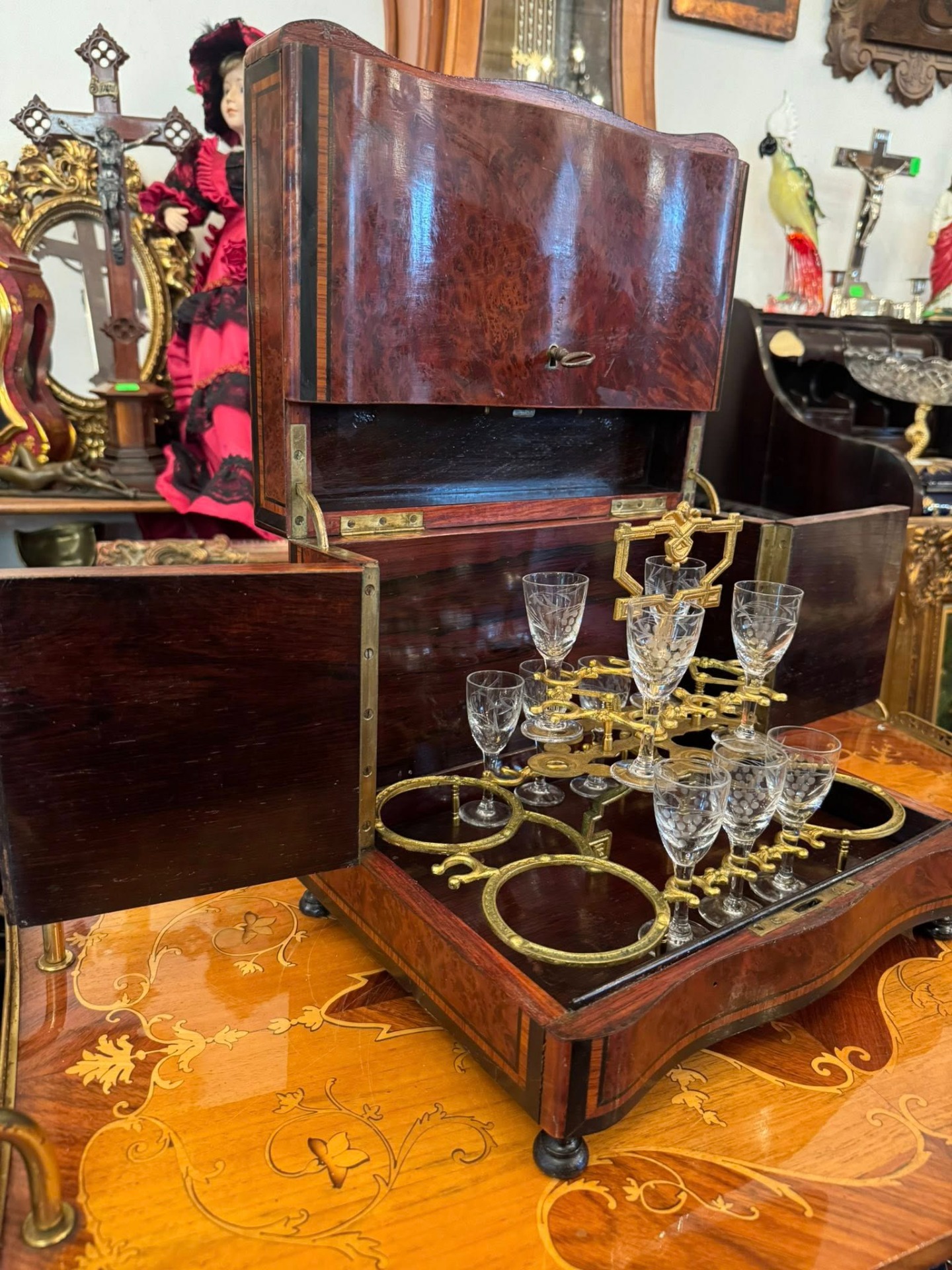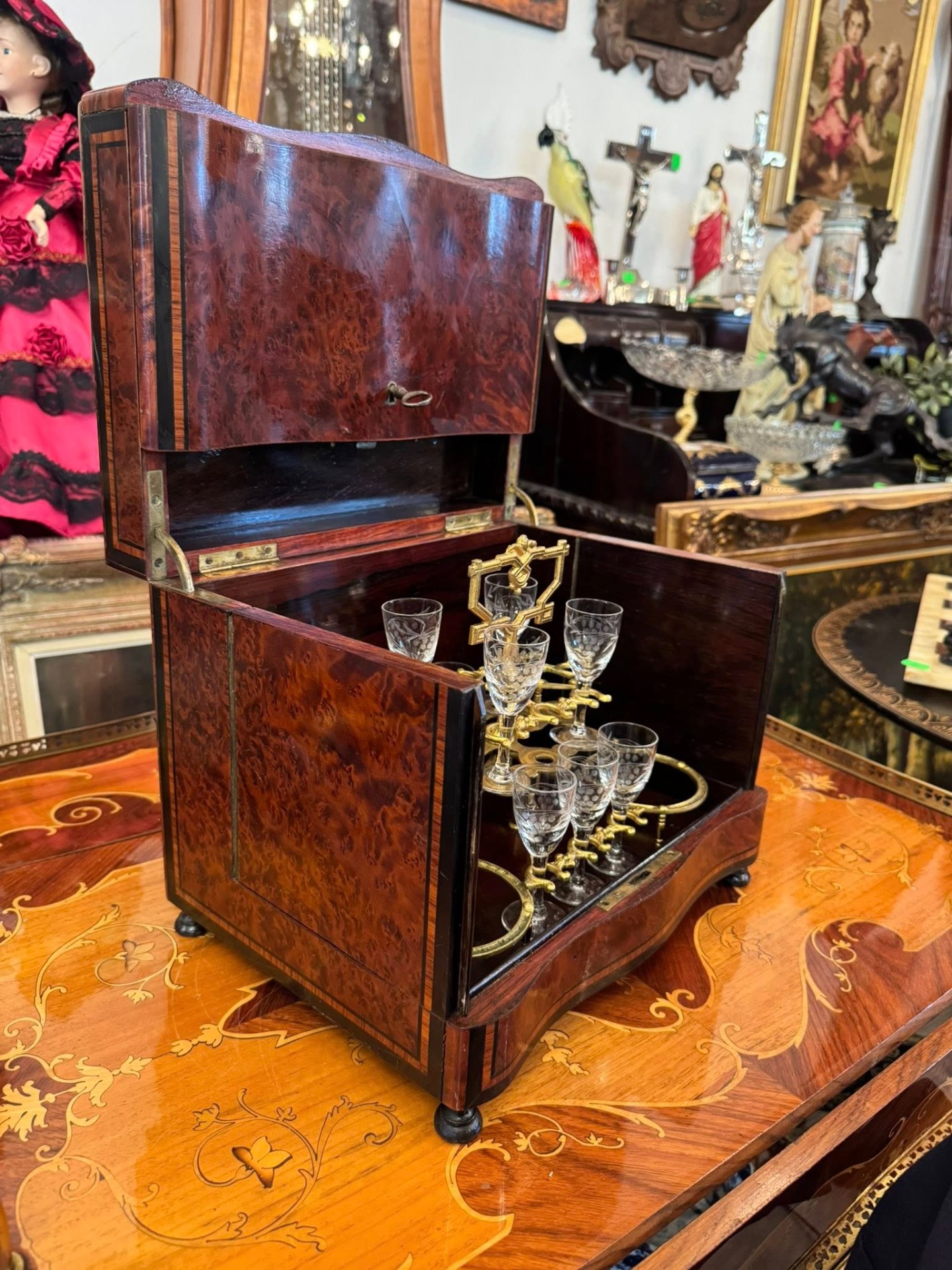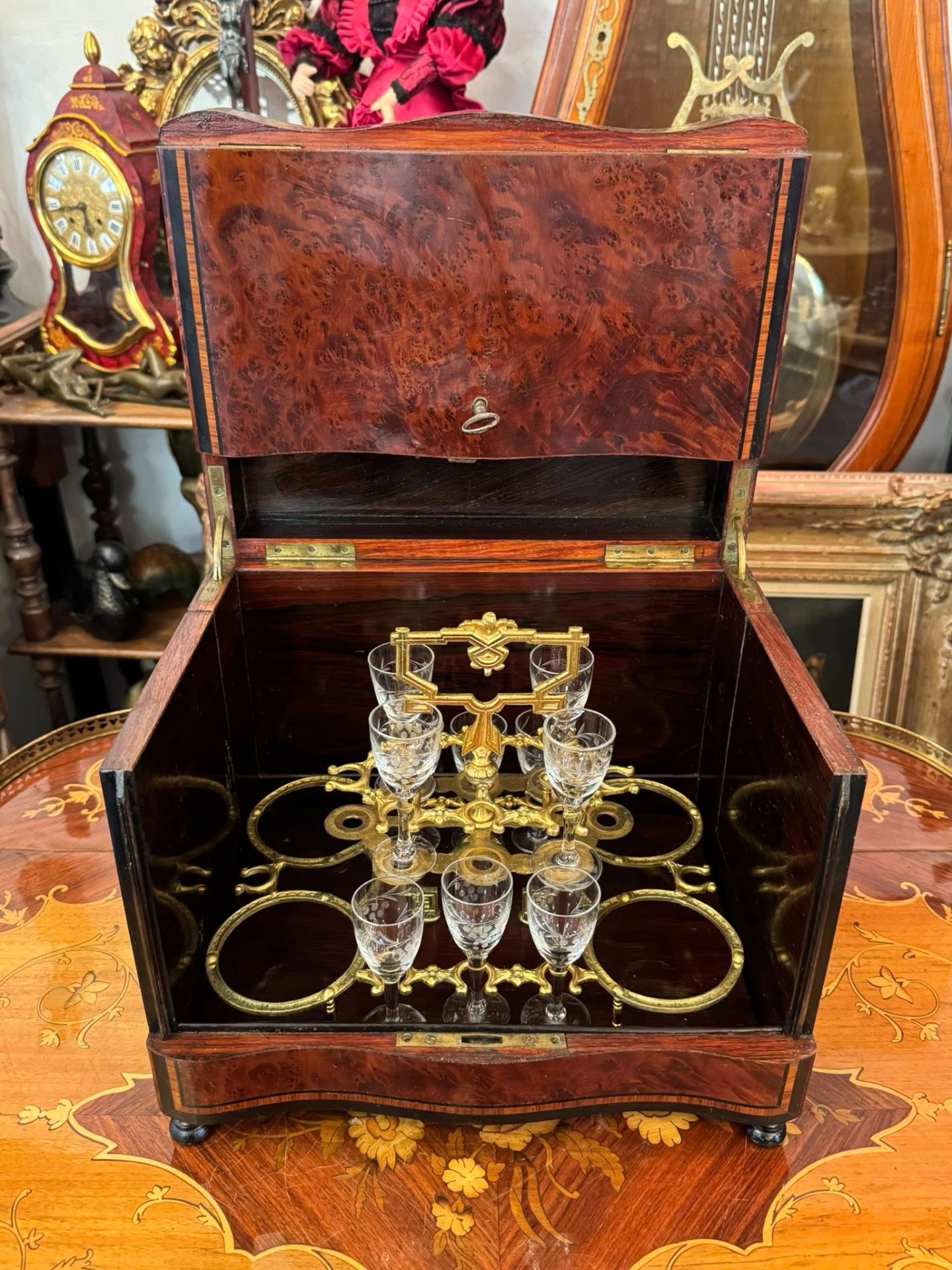 Casetă pentru lichior cu 10 pahare „Cave à Liqueur”, un obiect de lux tipic pentru secolul al XIX-lea, destinat servirii rafinate a băuturilor spirtoase. (Franța)
