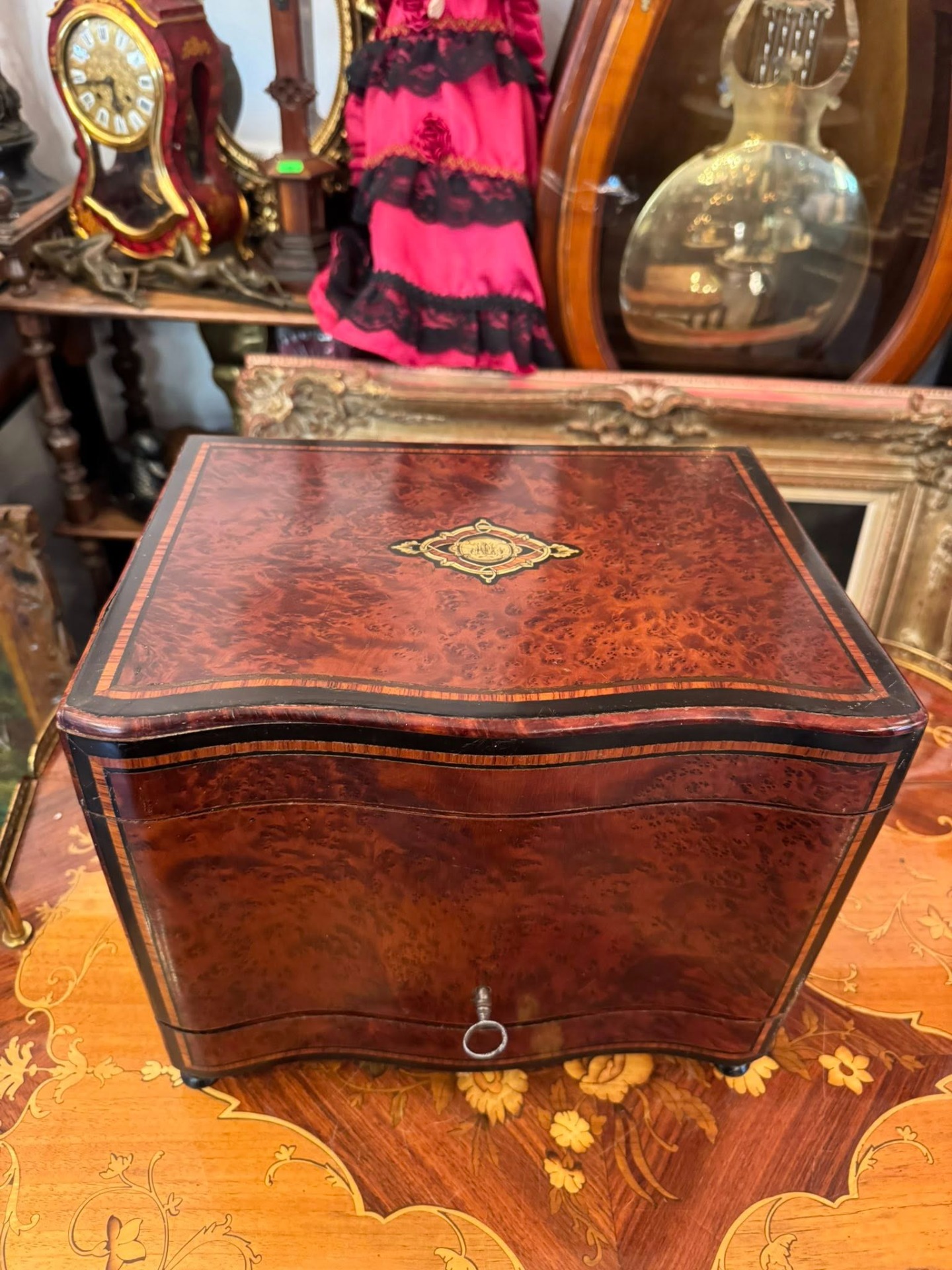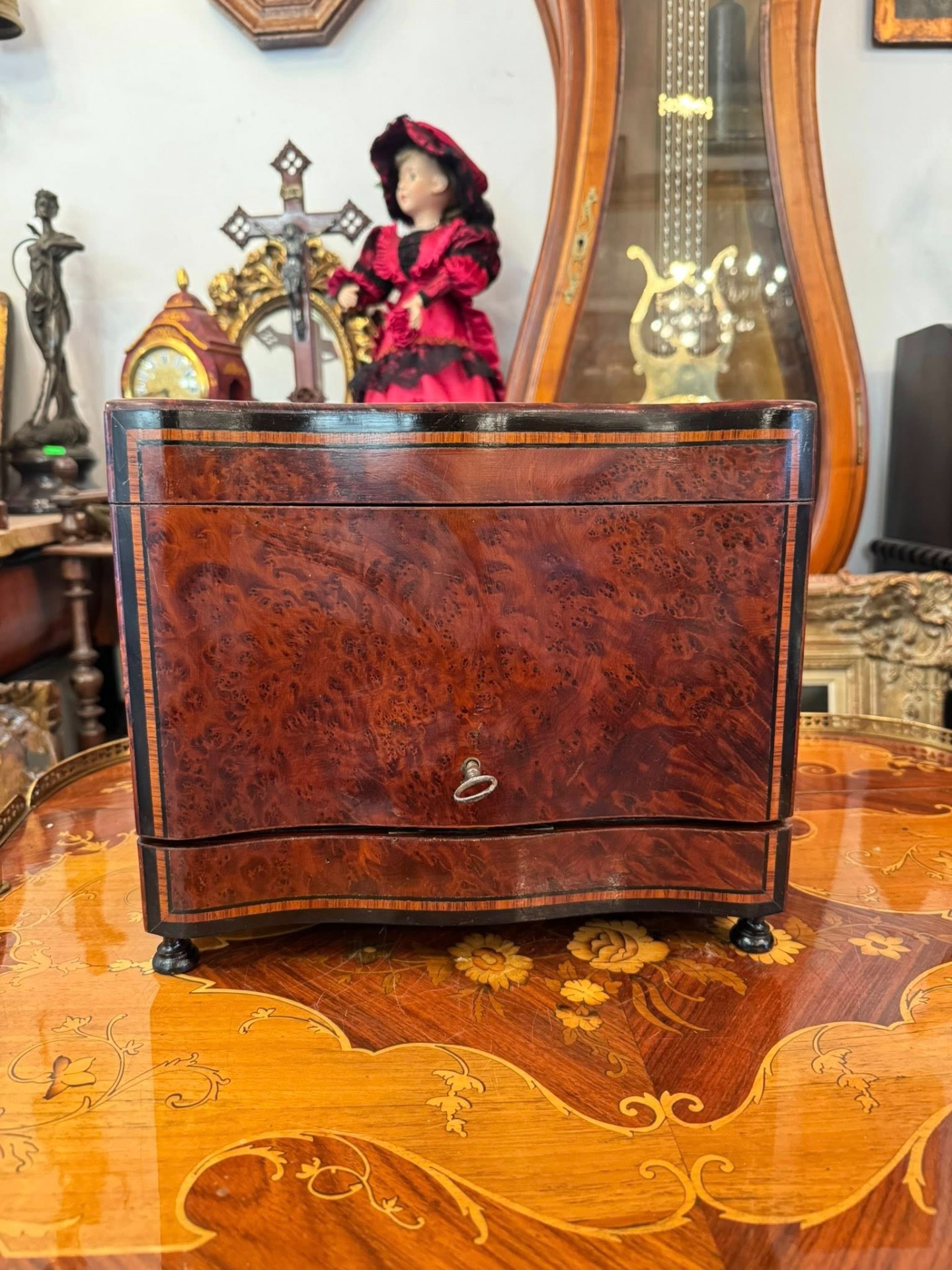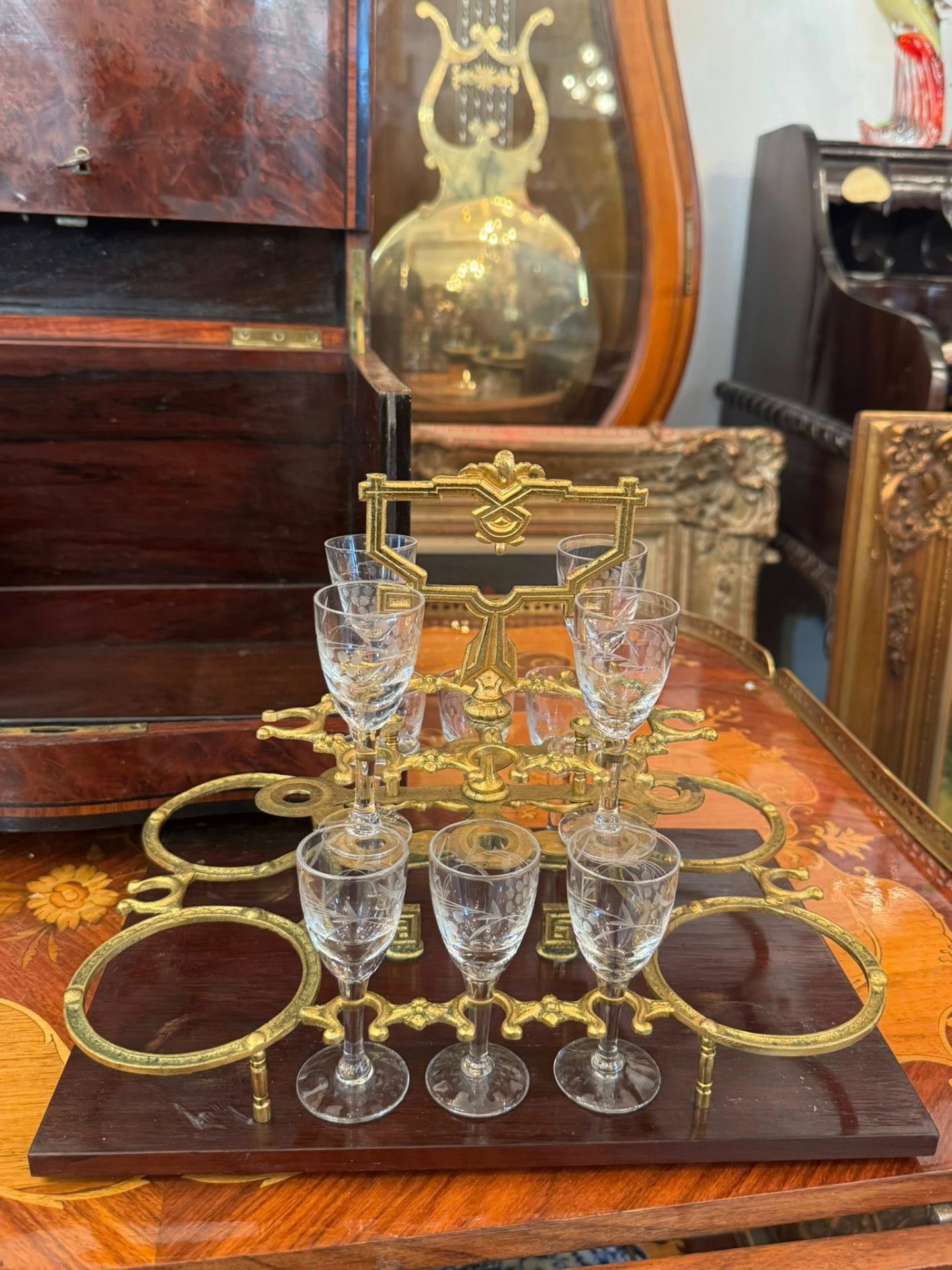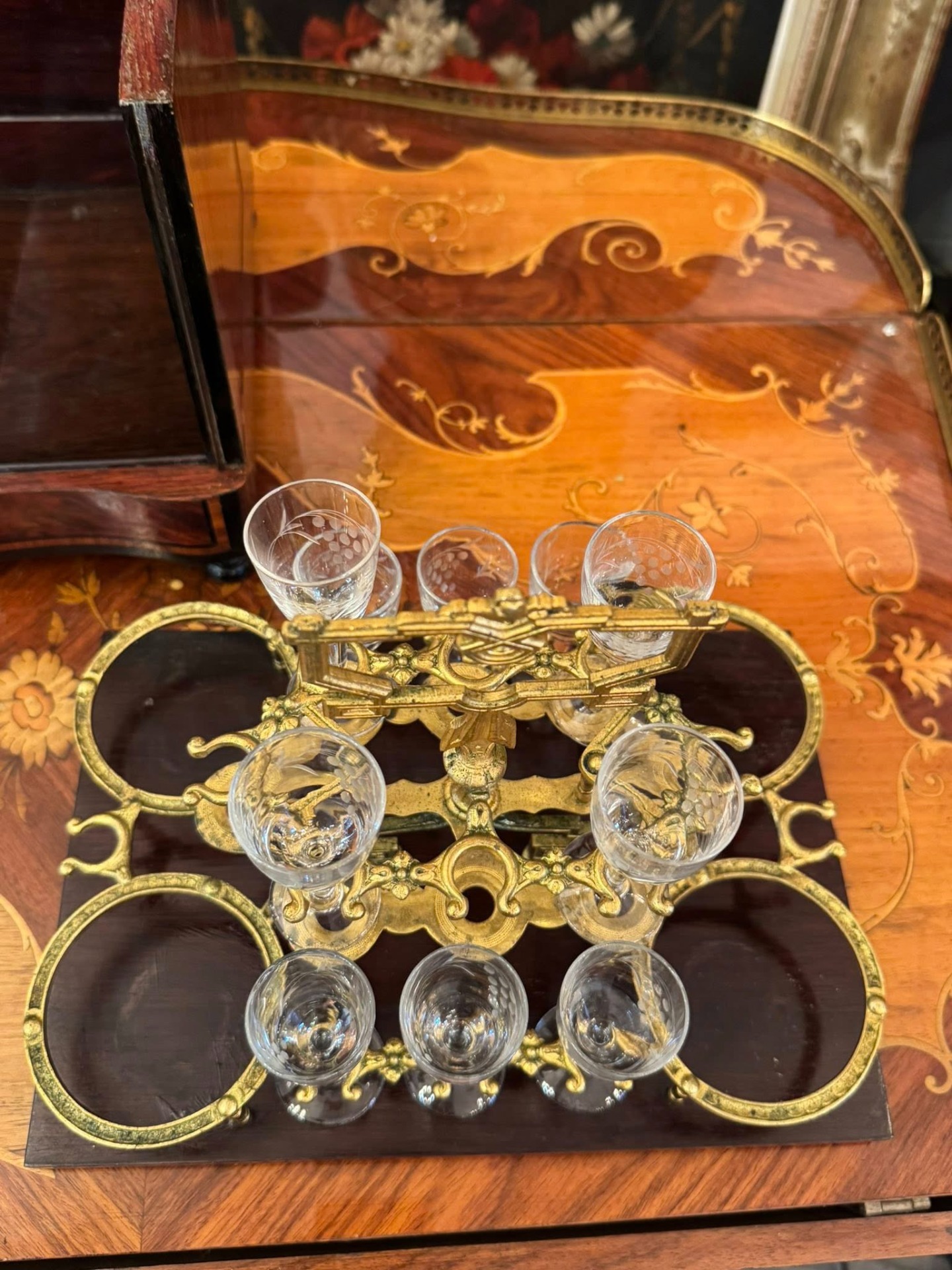 Casetă pentru lichior cu 10 pahare „Cave à Liqueur”, un obiect de lux tipic pentru secolul al XIX-lea, destinat servirii rafinate a băuturilor spirtoase. (Franța)
