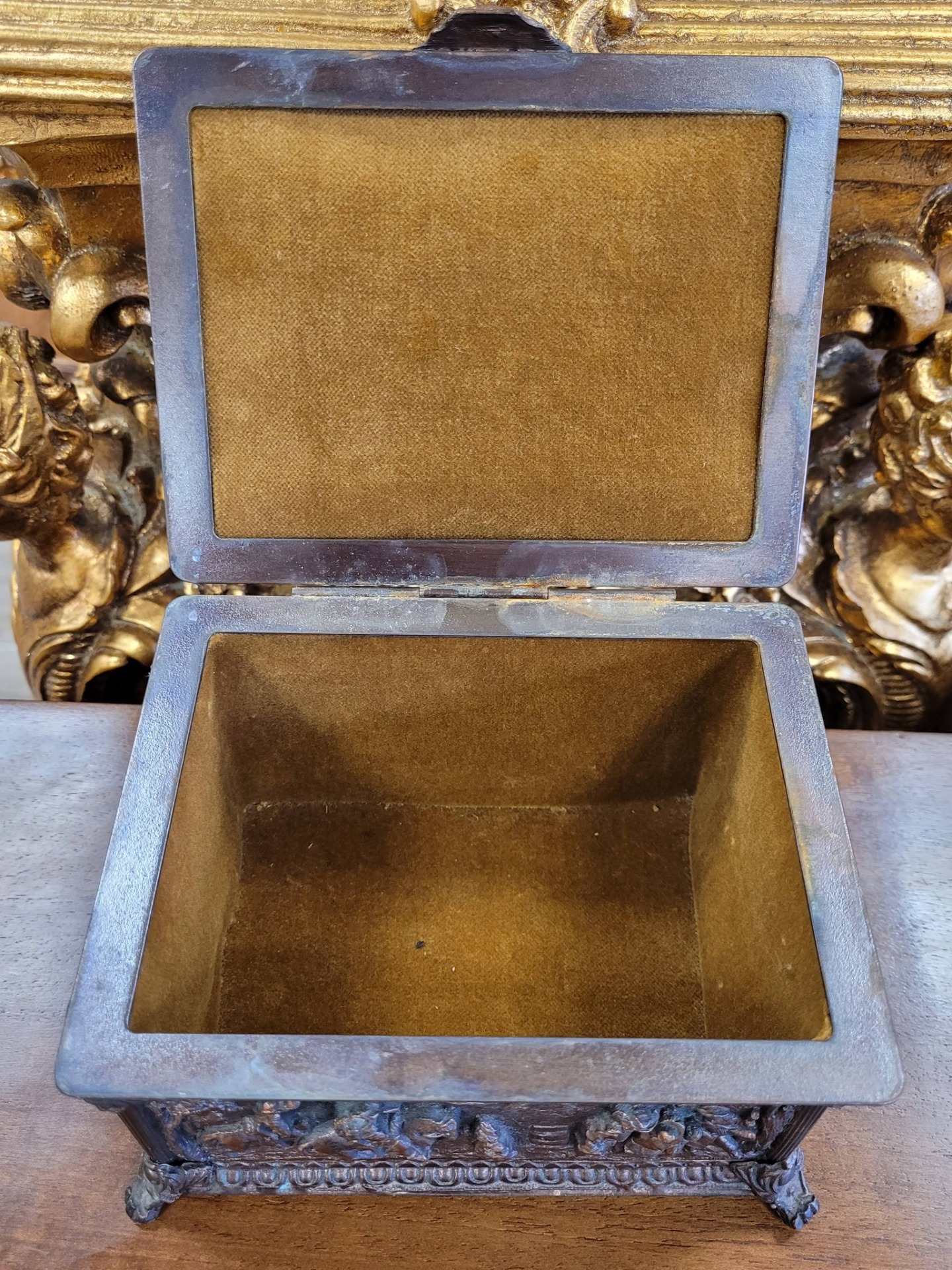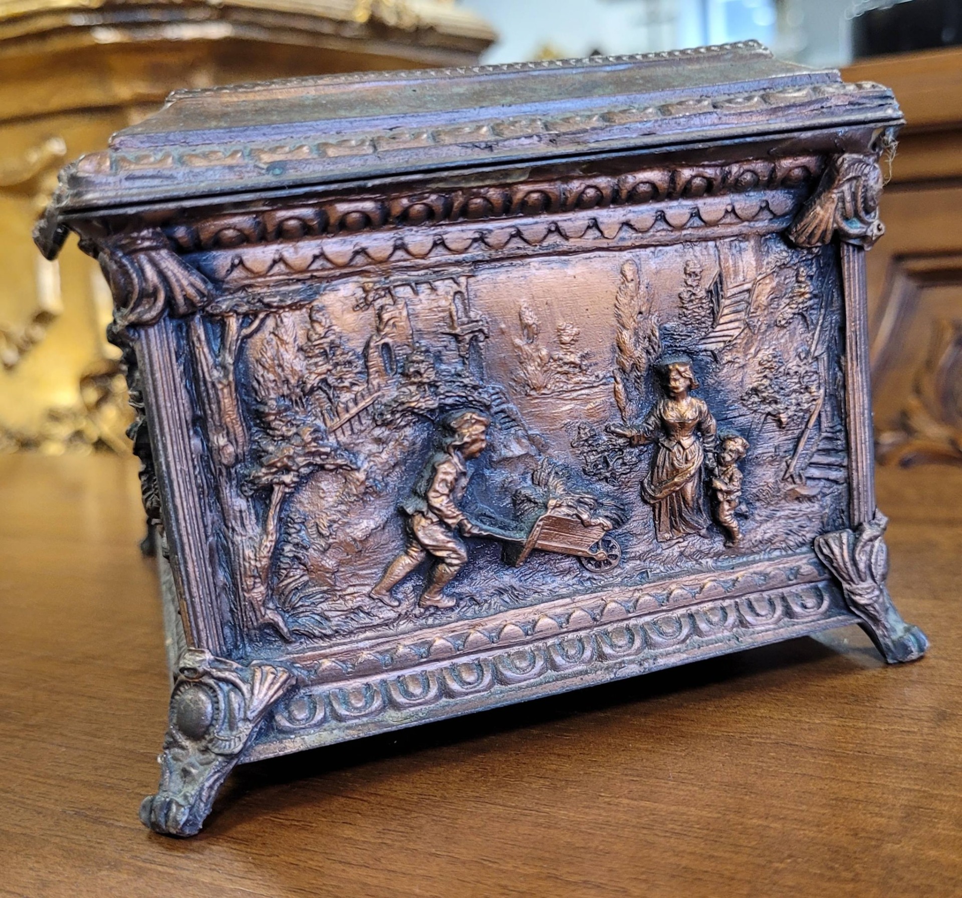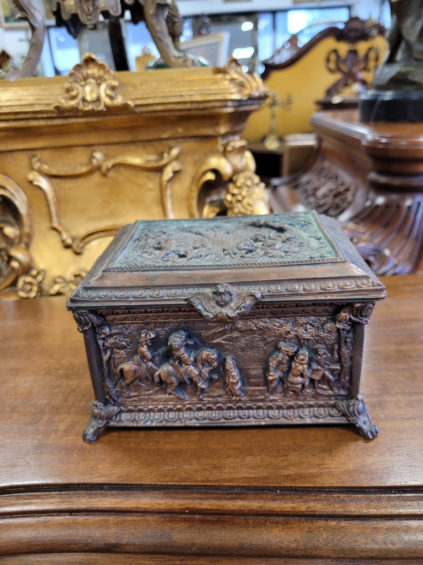 Casetă veche pentru bijuterii, din bronz patinat, decorată cu reliefuri narative,