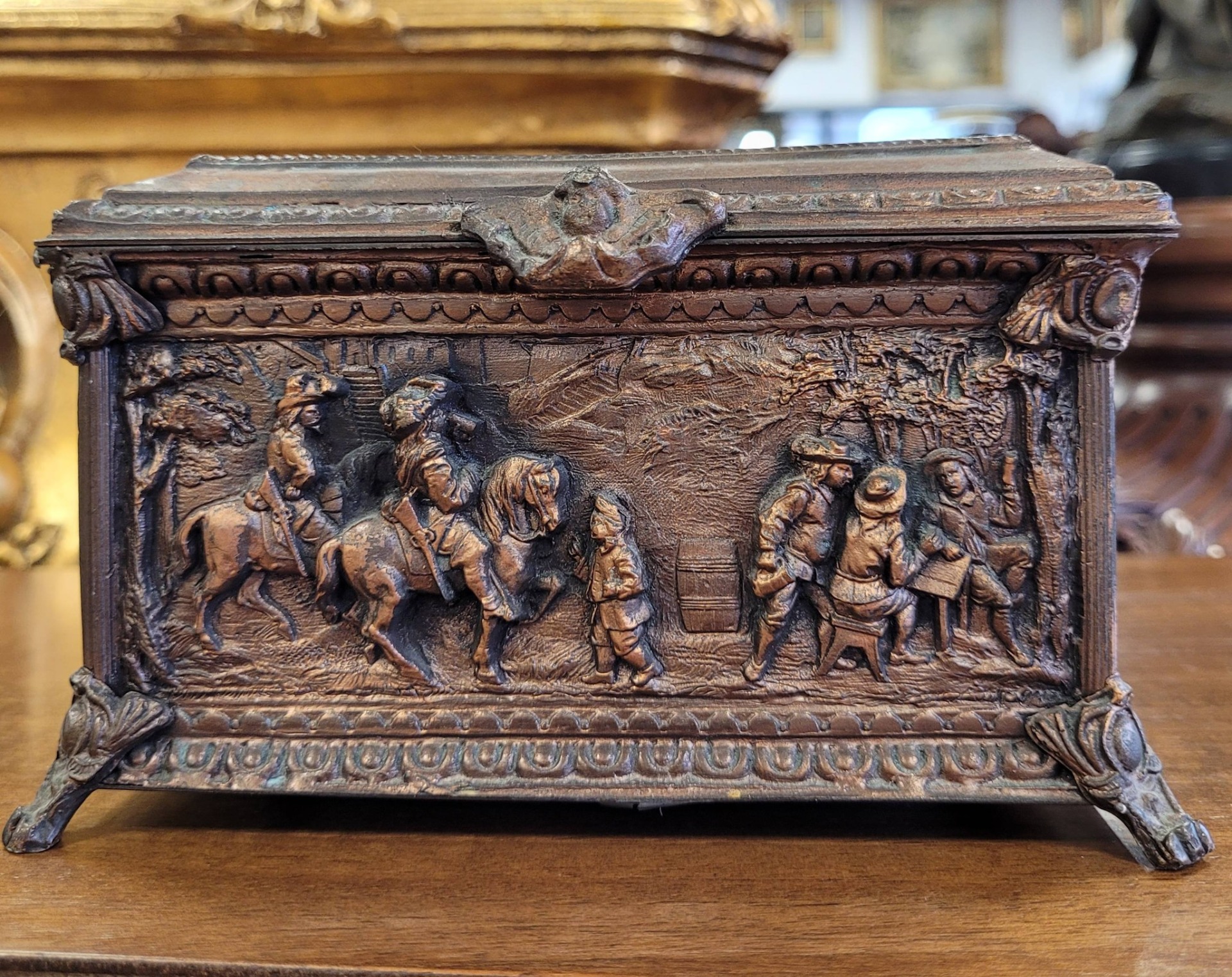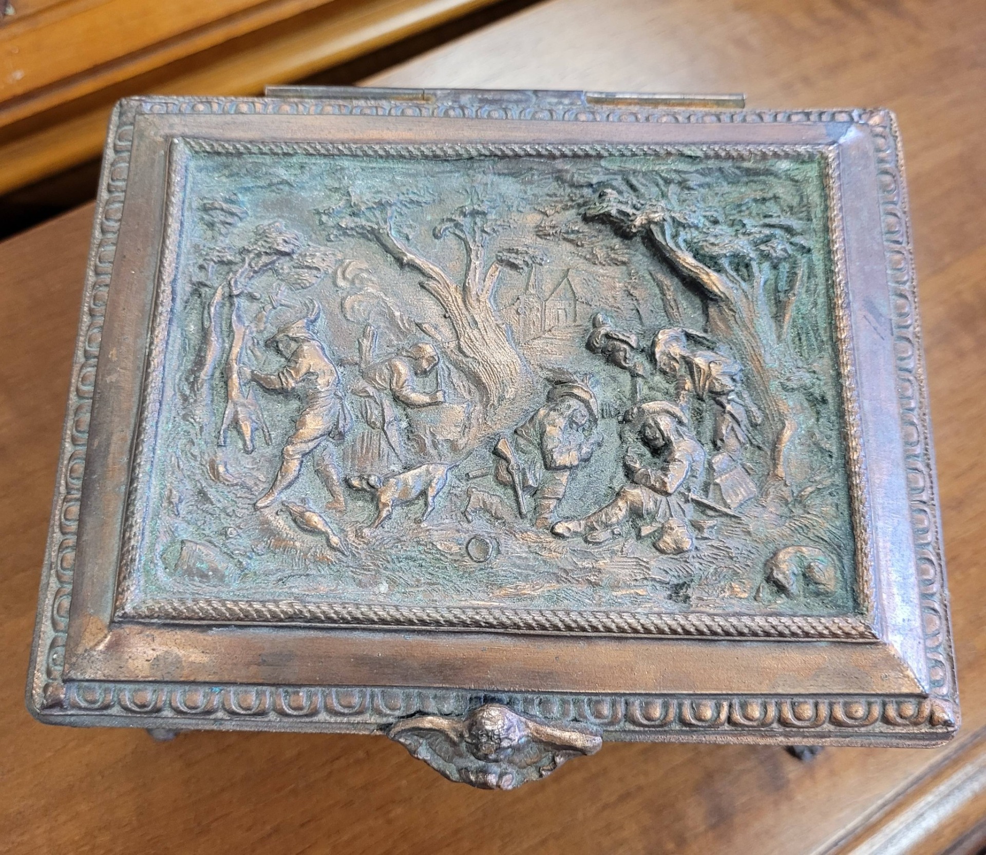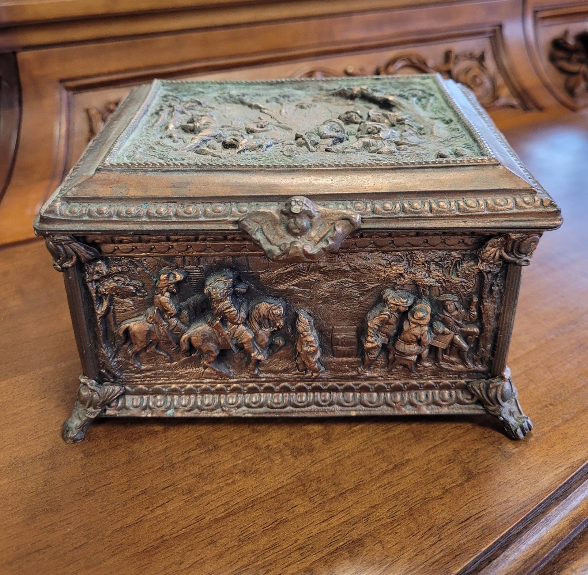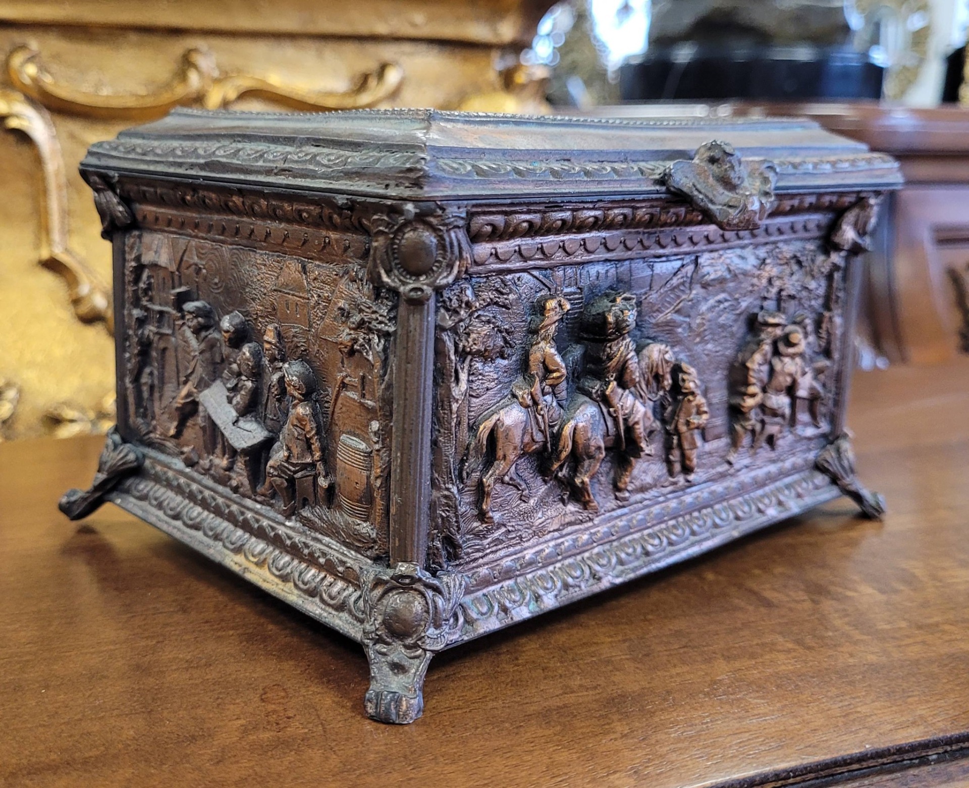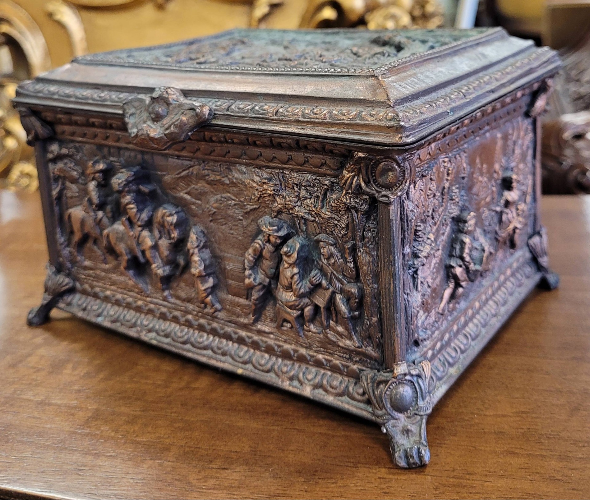 Casetă veche pentru bijuterii, din bronz patinat, decorată cu reliefuri narative, cu design neorenascentist.