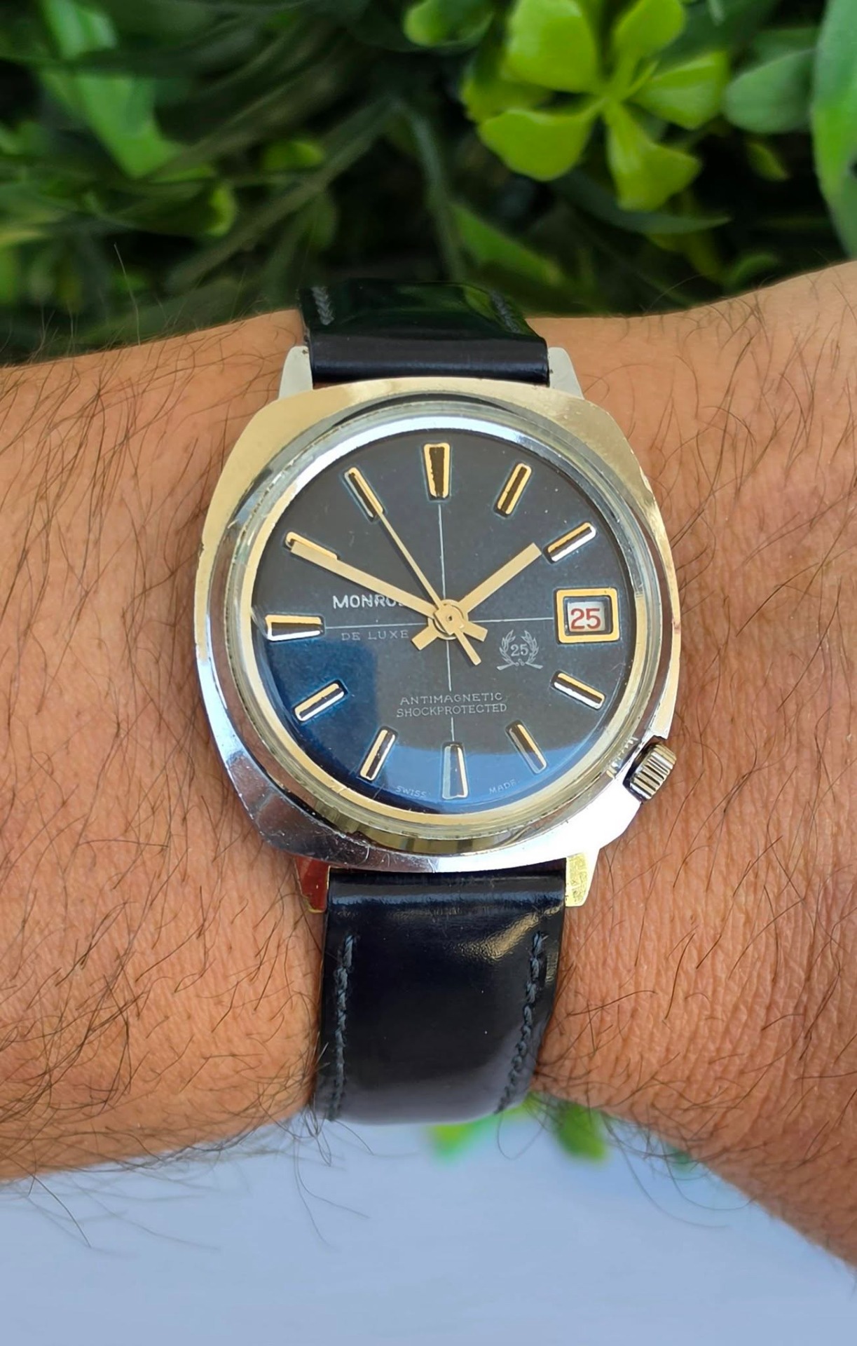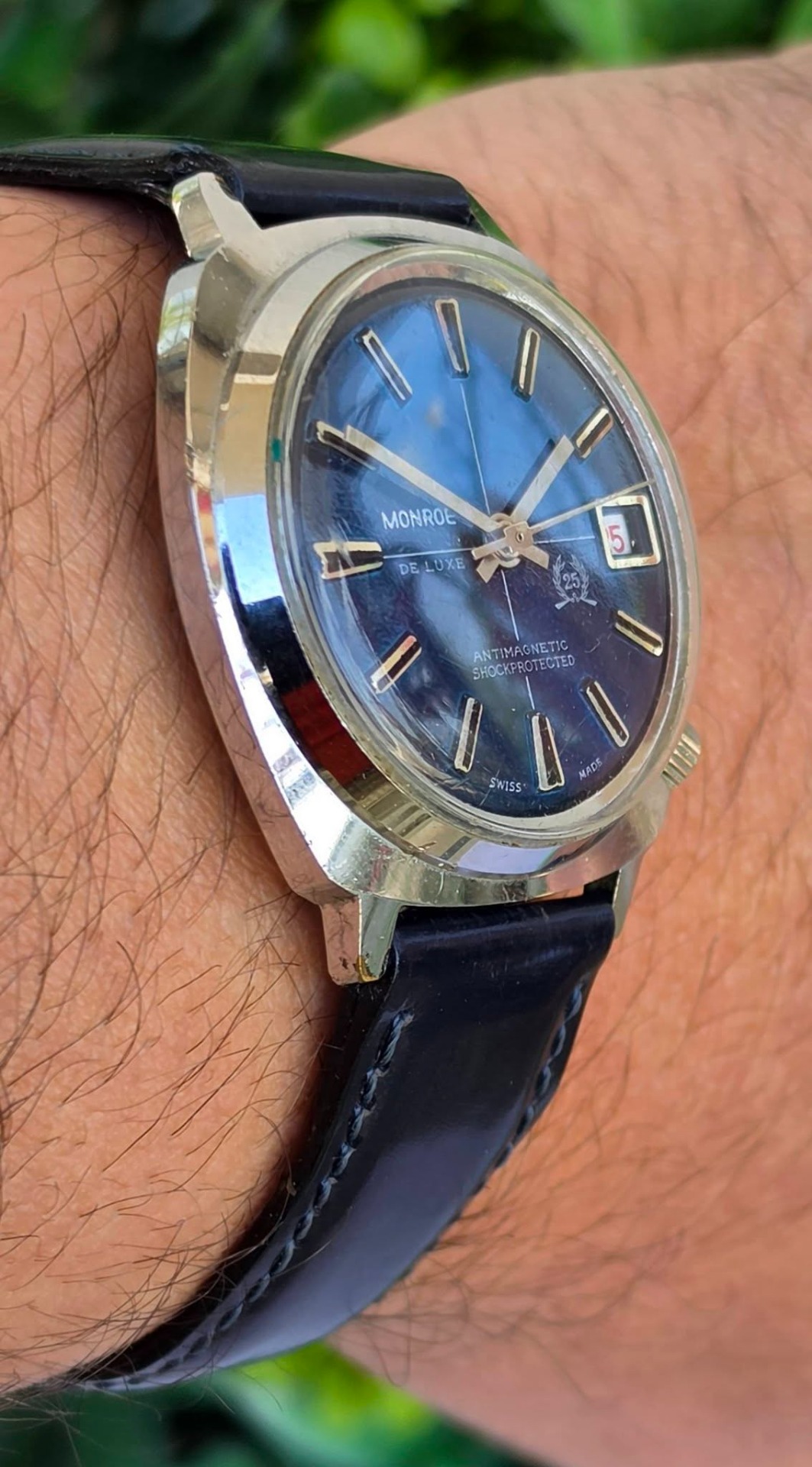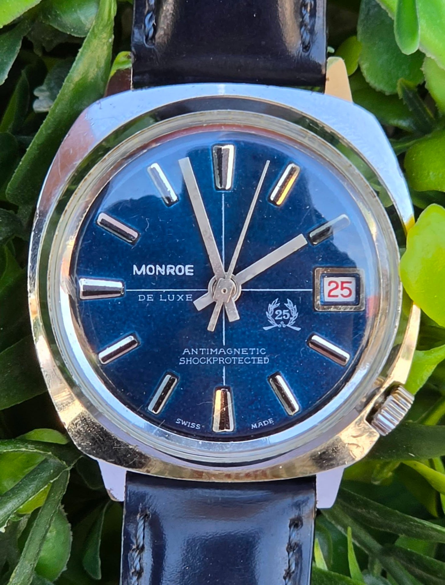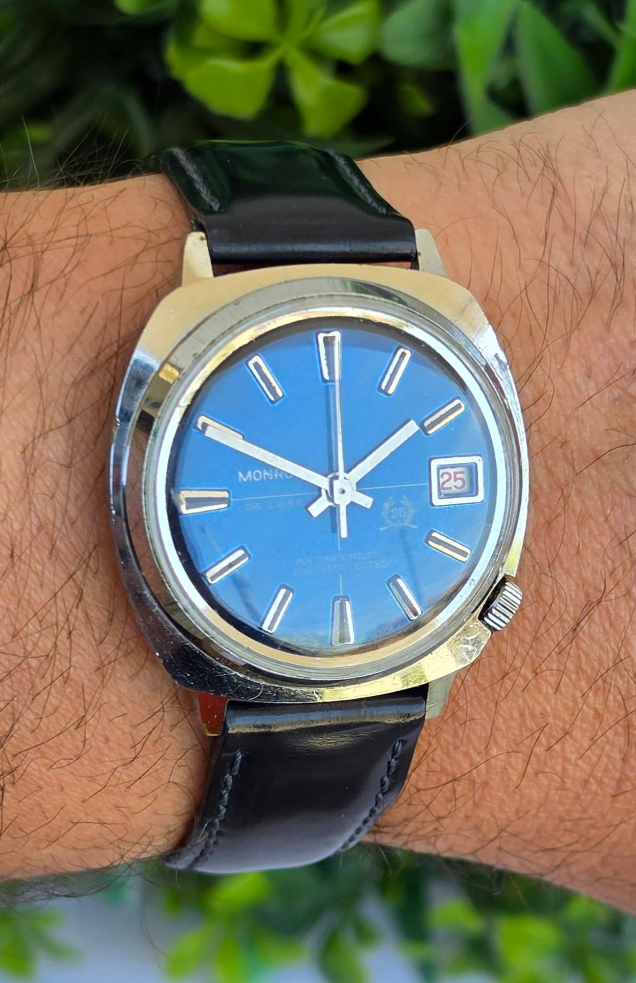 Ceas bărbătesc vintage Monroe De Luxe, specific perioadei anilor 1970, funcțional, în stare estetică foarte bună, cu mecanism elvețian, cu întoarcere manuală marcat "Diamond Tooled", cadran albastru metalizat (sunburst) deosebit, cu indici reliefați și fereastră pentru dată în dreptul orei 3, carcasă: model „cushion” (perniță), tipic pentru era disco, cu coroana plasată strategic la ora 4 pentru confort sporit, antimagnetic, shockprotected, capac spate din oțel inoxidabil înșurubat și curea nouă Benetton din piele neagră, care completează perfect aspectul elegant-sportiv.