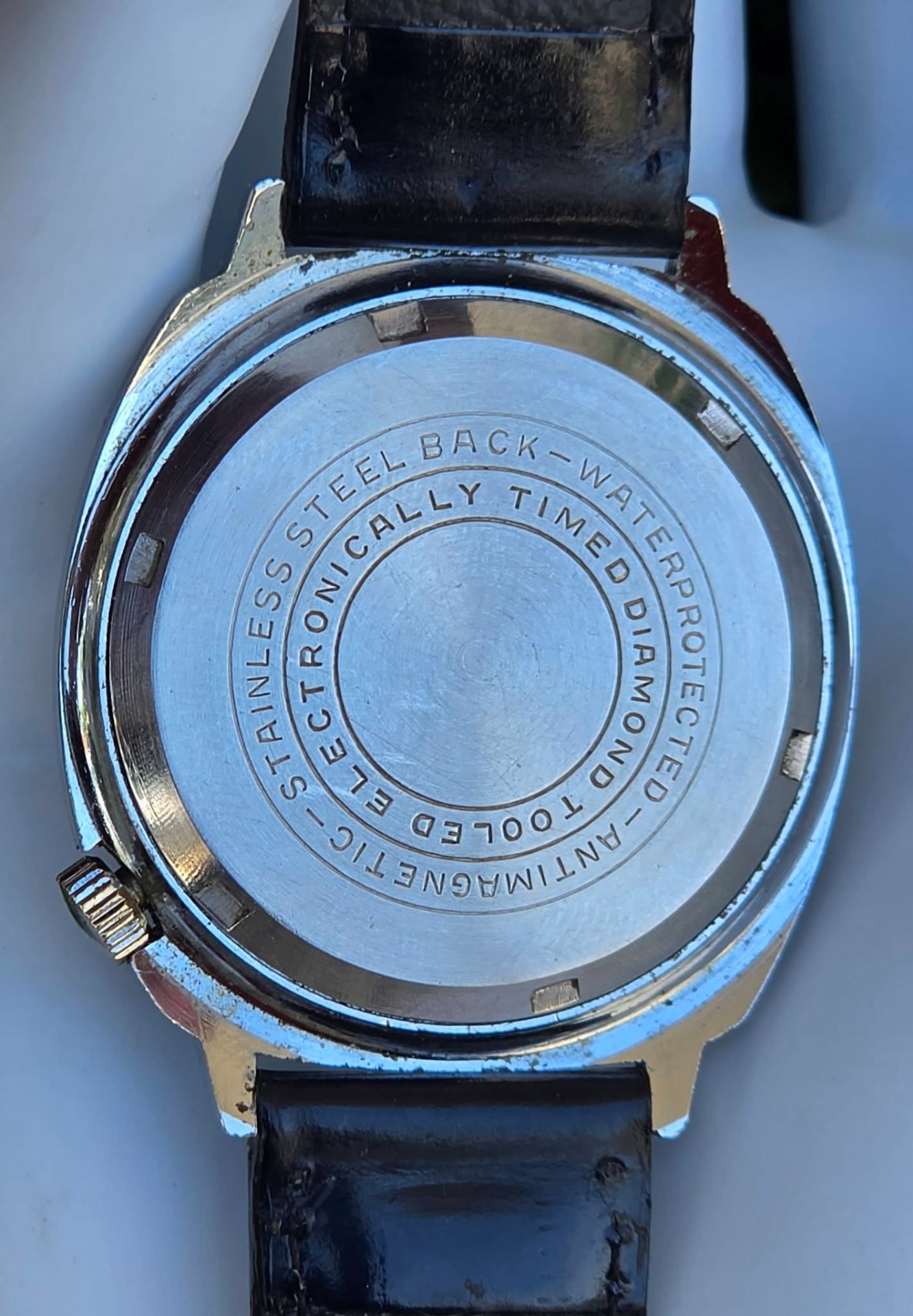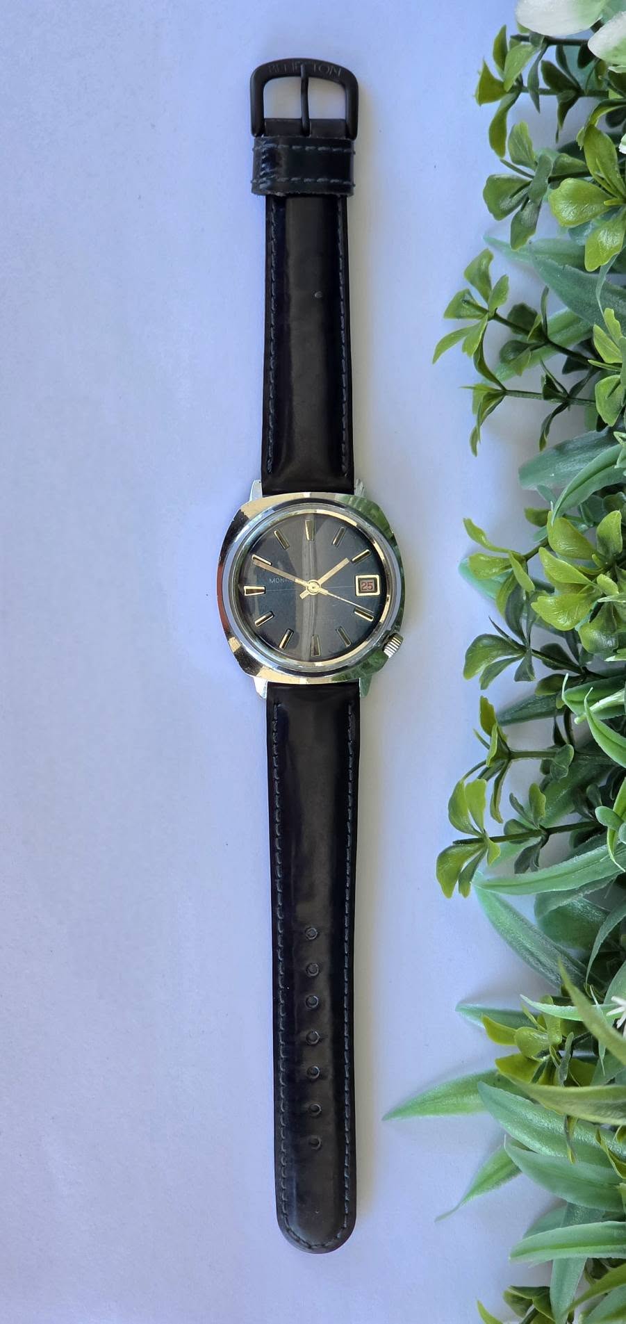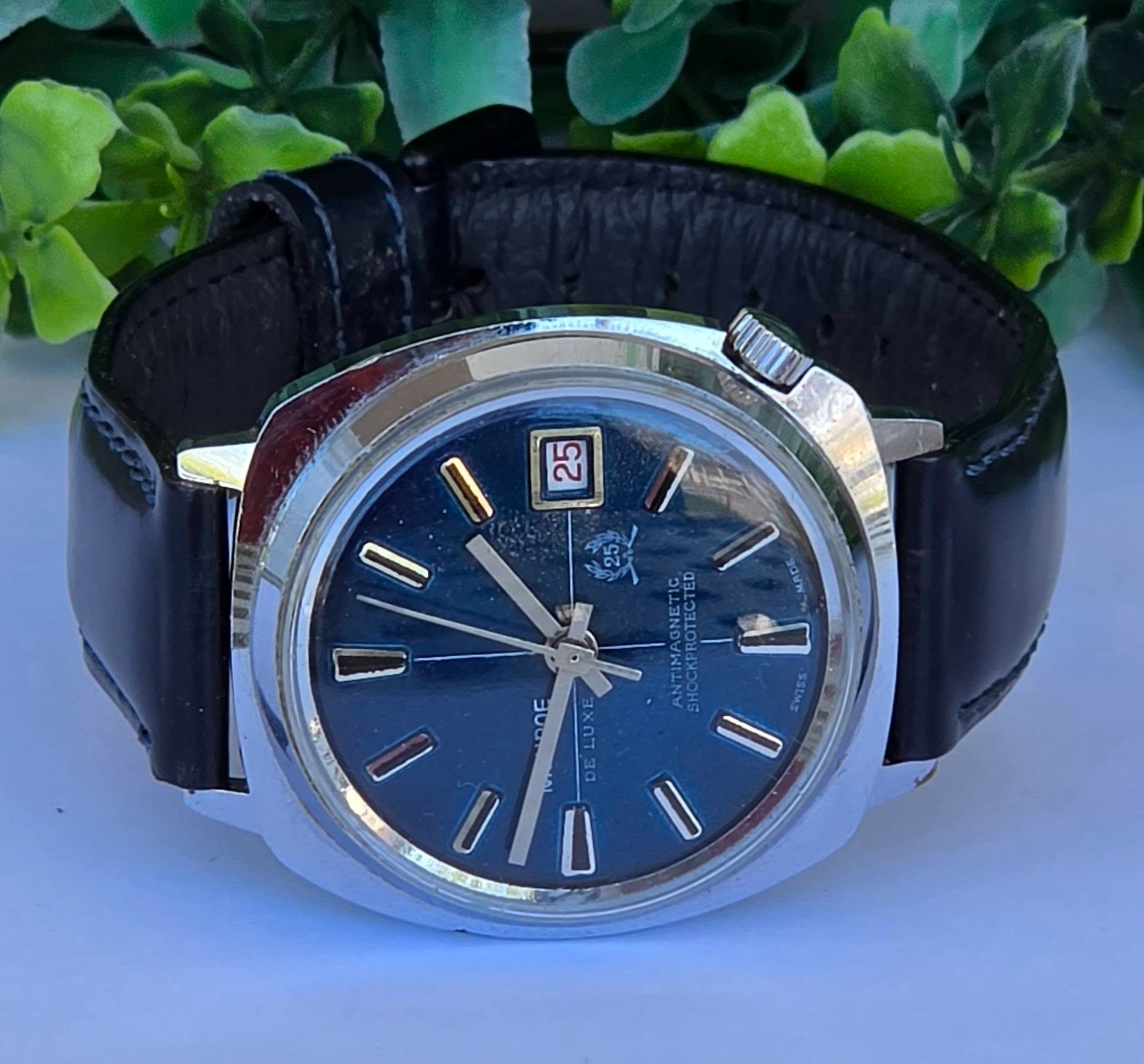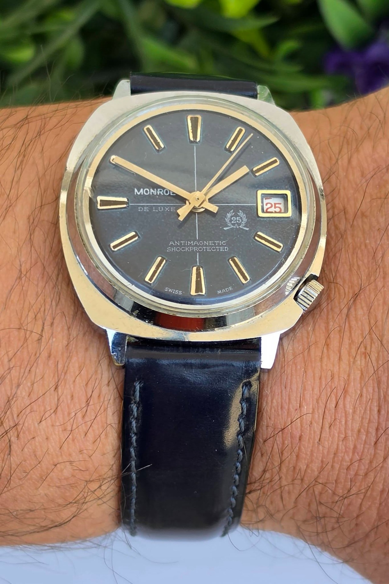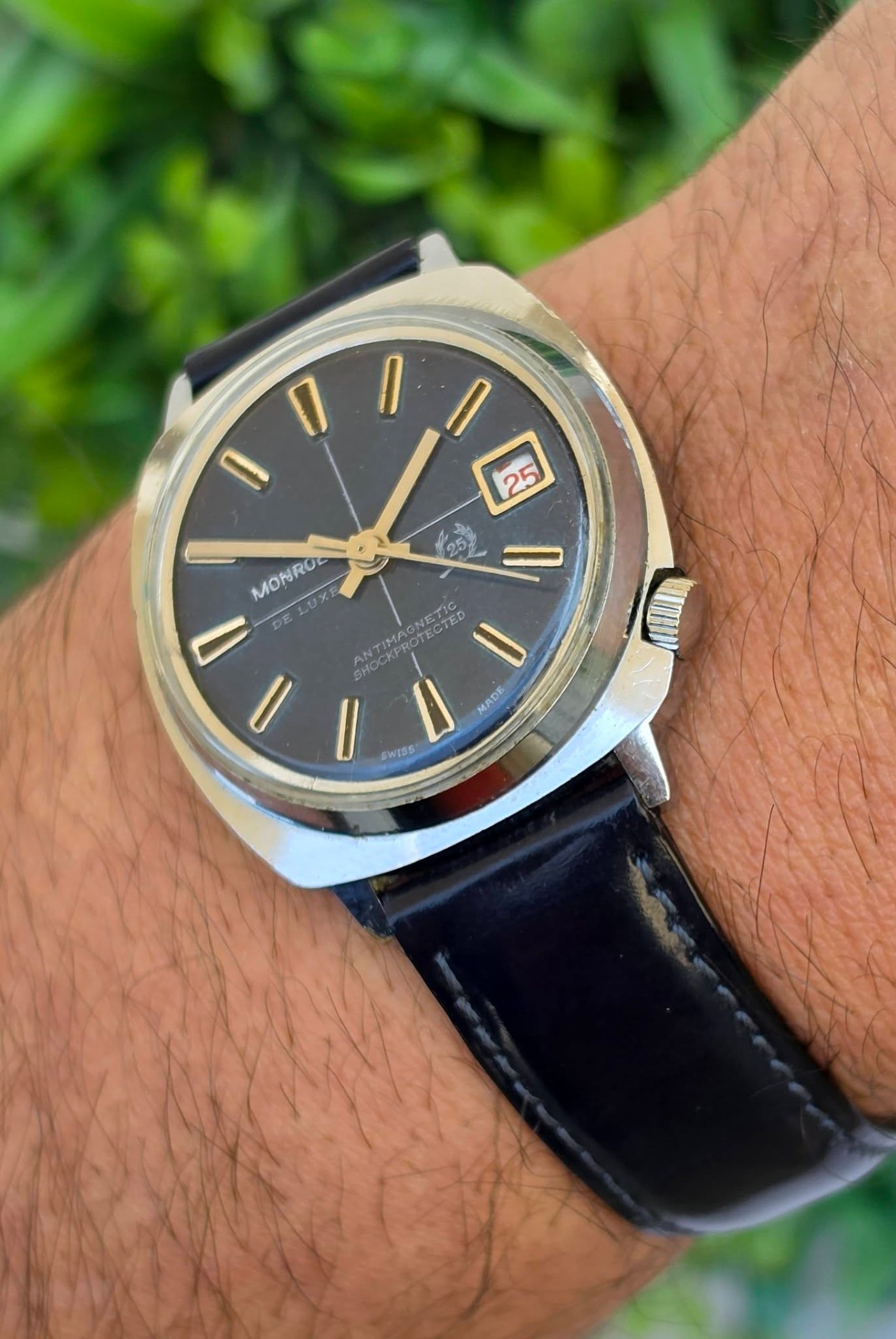 Ceas bărbătesc vintage Monroe De Luxe, specific perioadei anilor 1970, funcțional, în stare estetică foarte bună, cu mecanism elvețian, cu întoarcere manuală marcat "Diamond Tooled", cadran albastru metalizat (sunburst) deosebit, cu indici reliefați și fereastră pentru dată în dreptul orei 3, carcasă: model „cushion” (perniță), tipic pentru era disco, cu coroana plasată strategic la ora 4 pentru confort sporit, antimagnetic, shockprotected, capac spate din oțel inoxidabil înșurubat și curea nouă Benetton din piele neagră, care completează perfect aspectul elegant-sportiv.