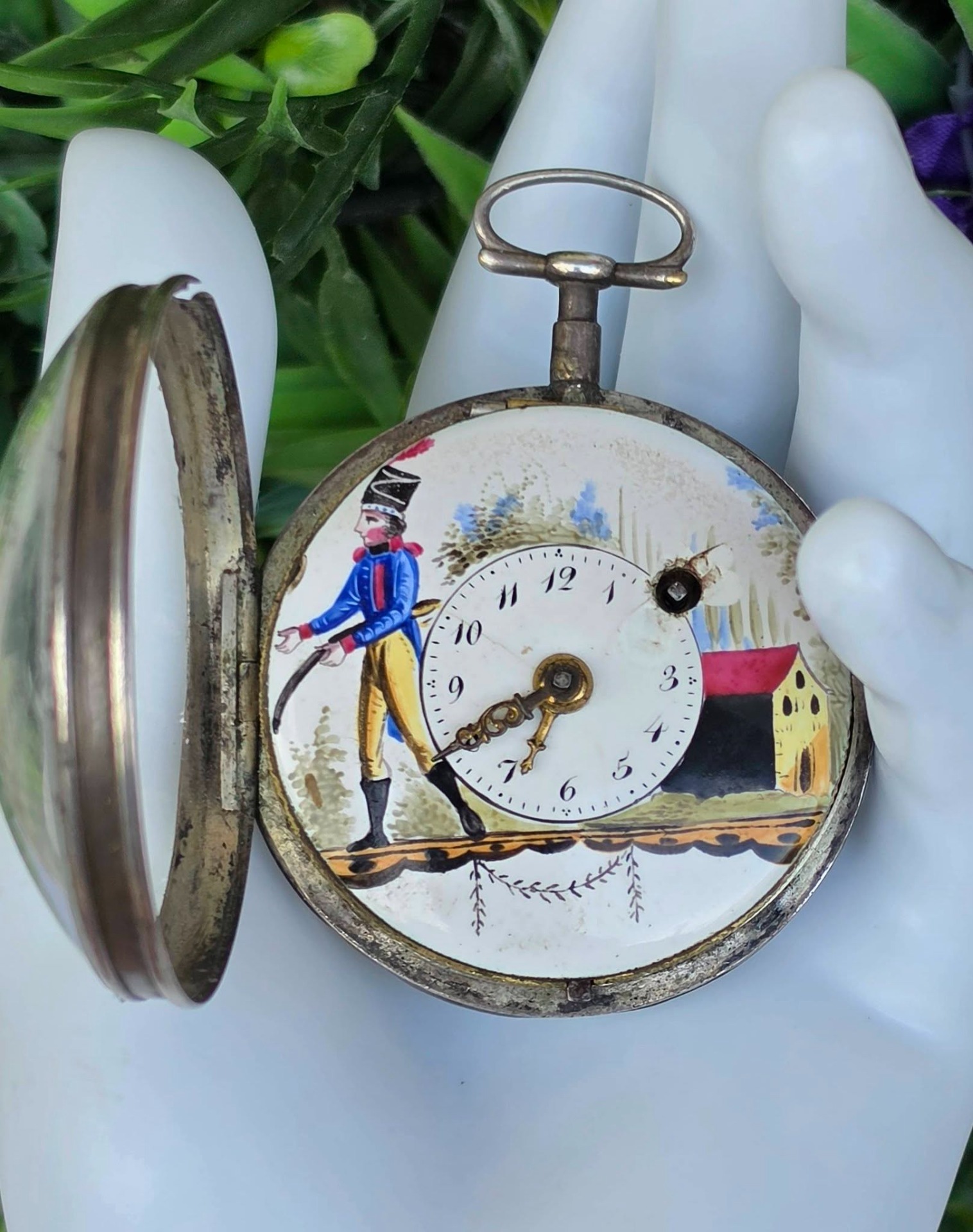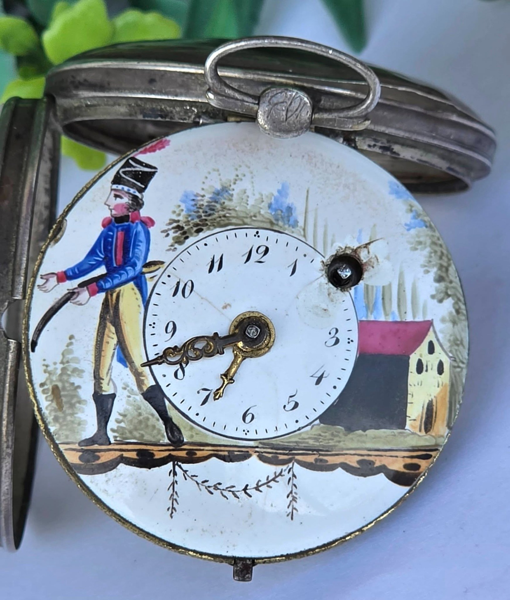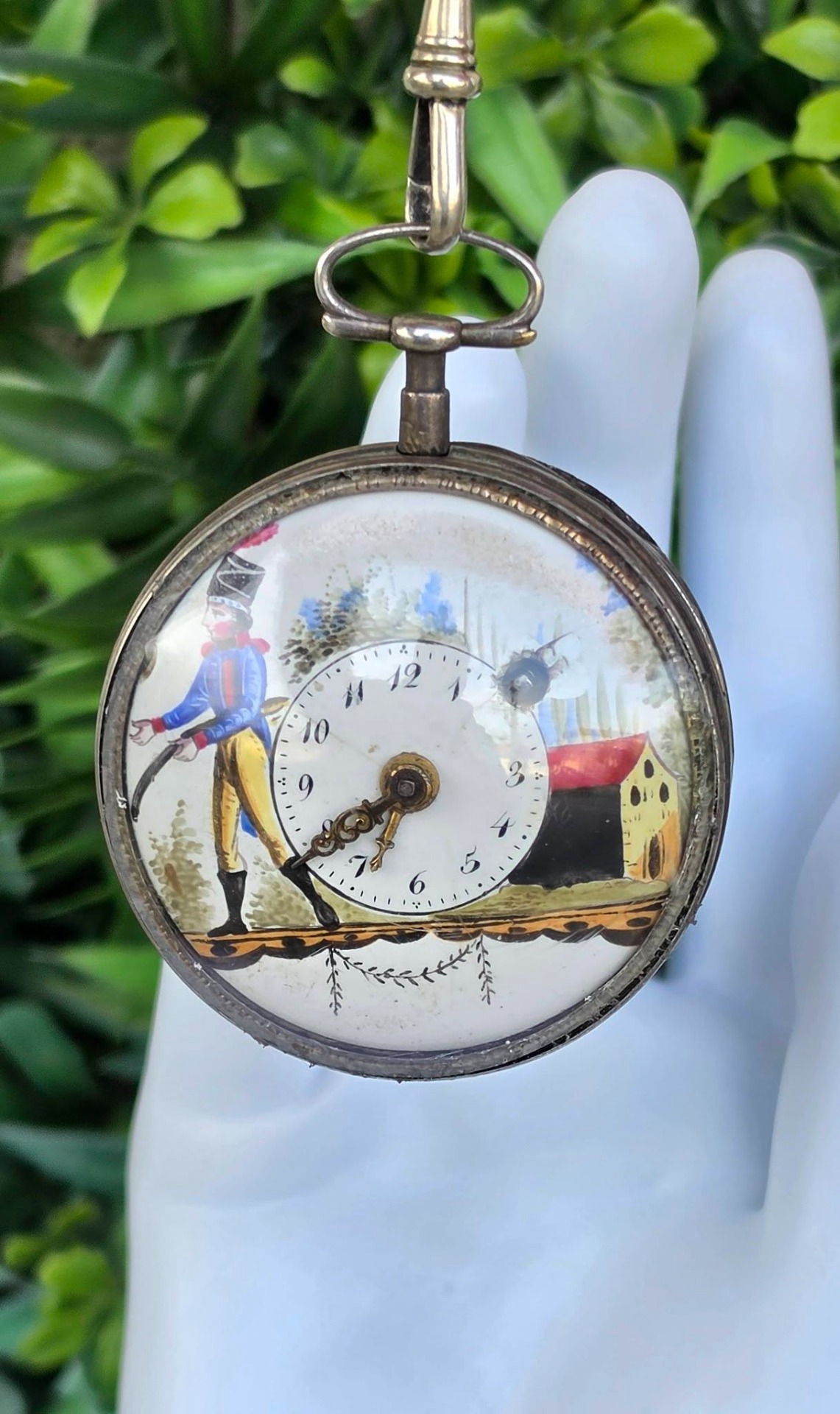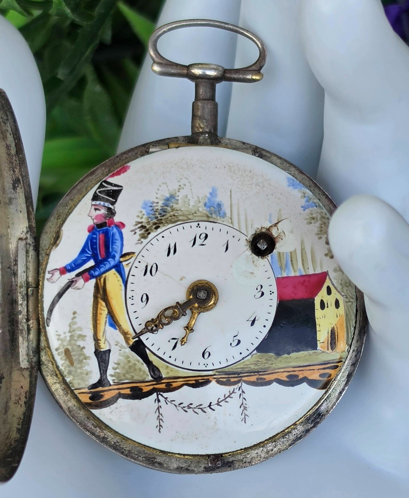 Ceas de buzunar cu mecanism Verge Fusee (cu fulie și lanț), piesă deosebită de colecție, datând din perioada 1790 – 1810, exemplar autentic, cu cadran unic, cu email pictat manual cu scenă de epocă (soldat în uniformă din perioada Războaielor Napoleoniene), orar excentric cu cifre arabe, mecanism "Verge Fusee" (eșapament cu vergea), cu piloni ornamentali și punte balansier (balance cock) lucrată manual în filigran, sistem de întoarcere cu cheiță, funcțional, carcasă din argint.
