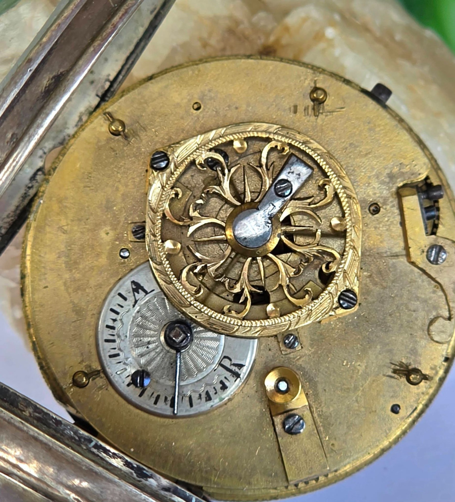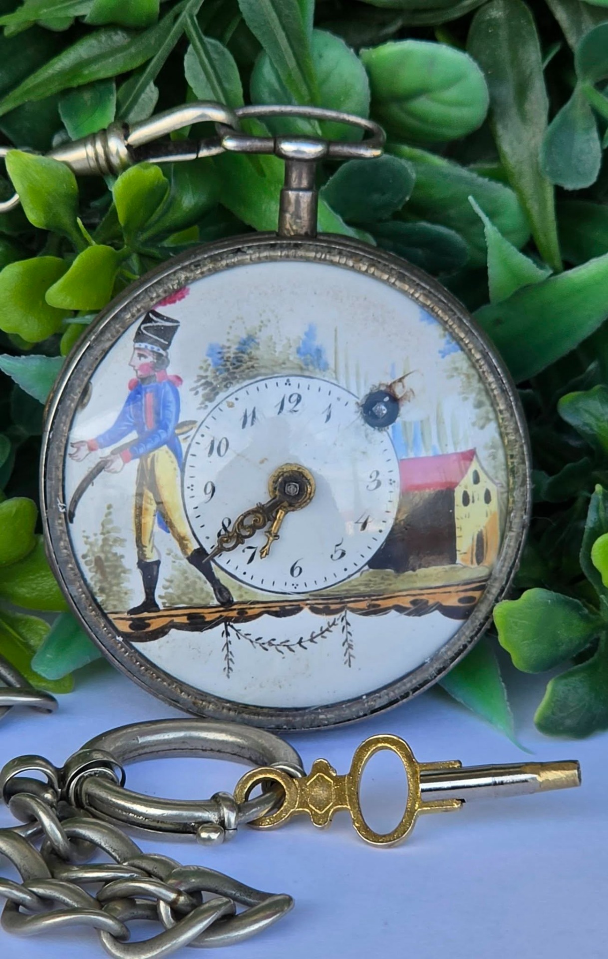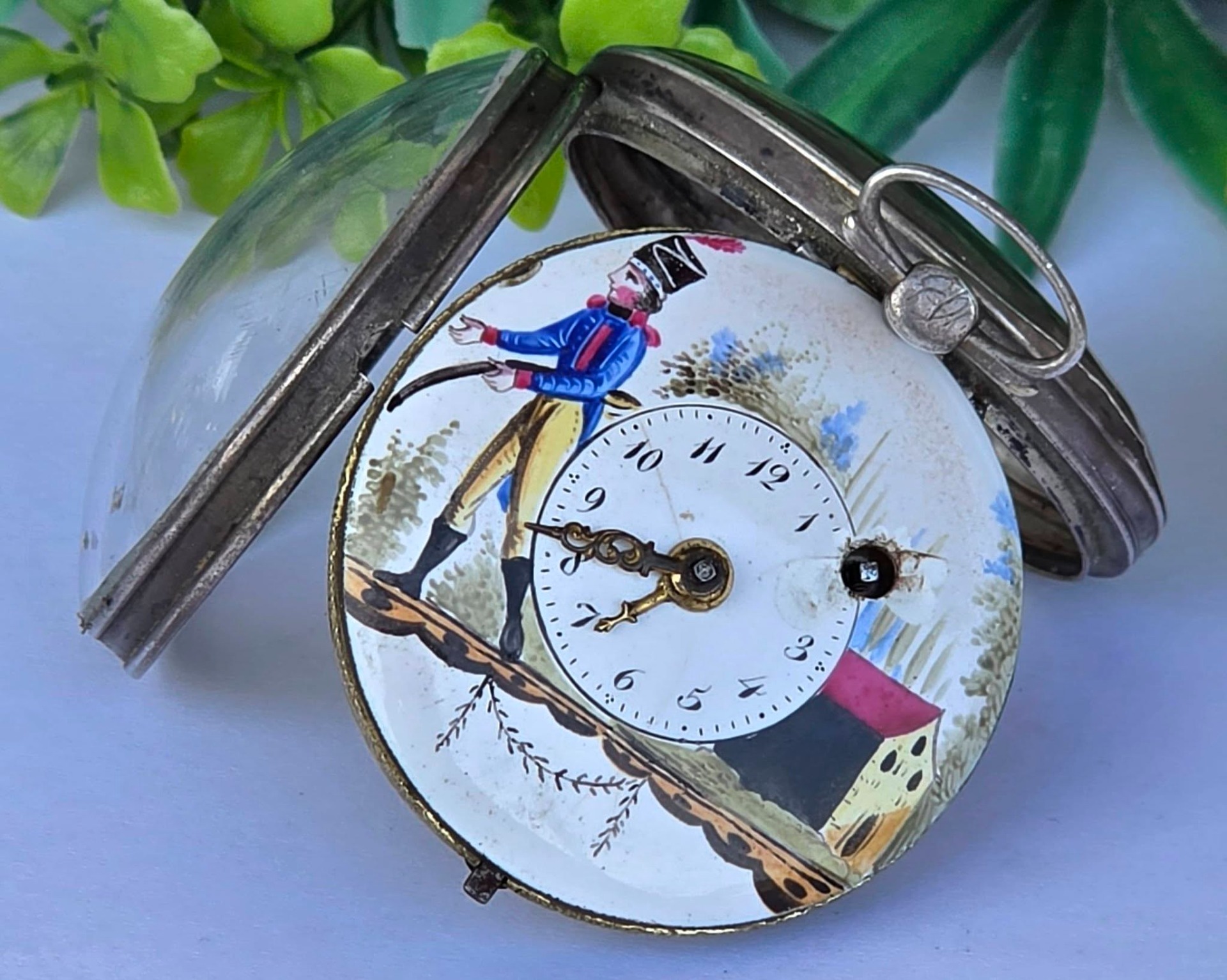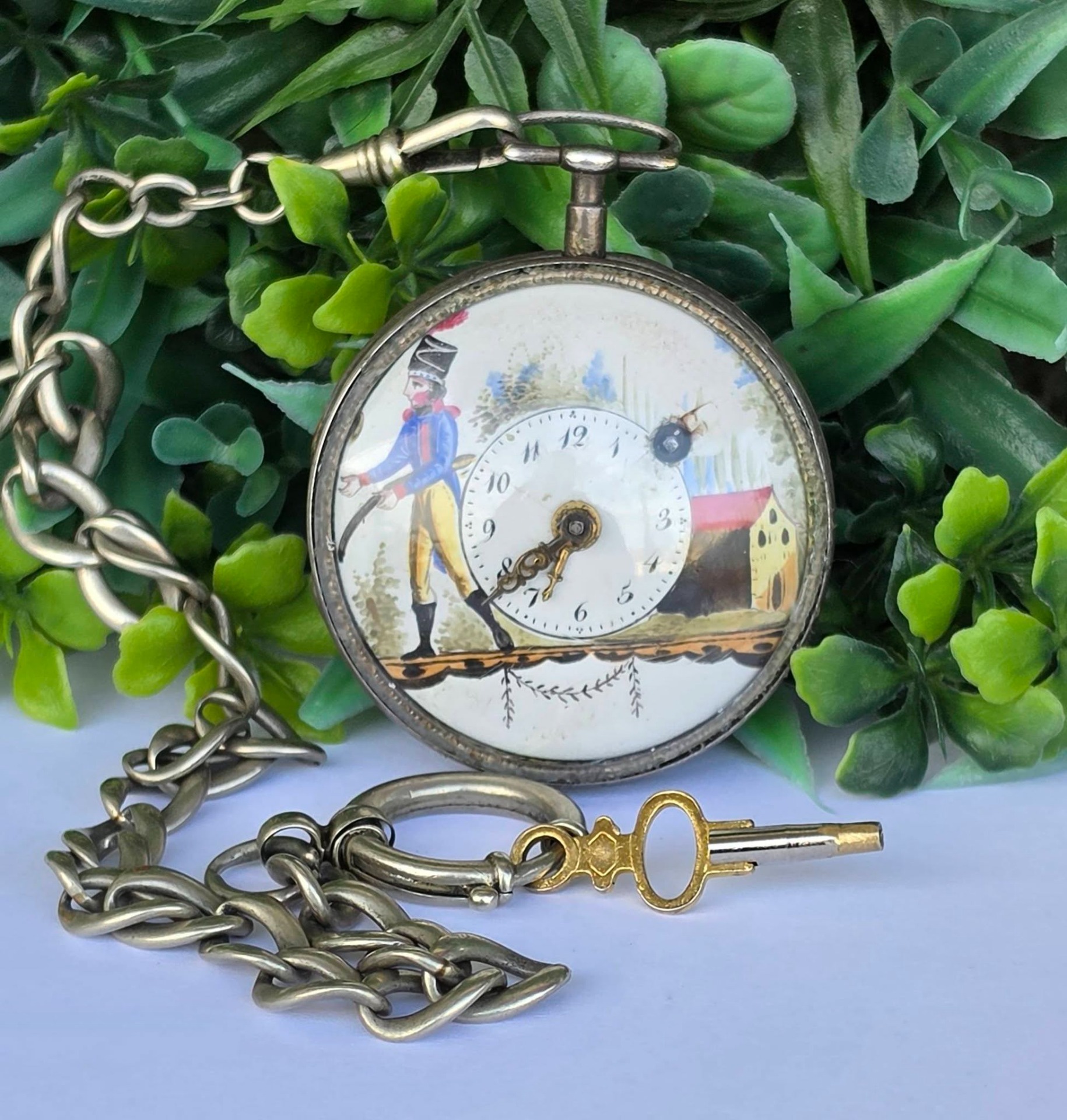 Ceas de buzunar cu mecanism Verge Fusee (cu fulie și lanț), piesă deosebită de colecție, datând din perioada 1790 – 1810, exemplar autentic, cu cadran unic, cu email pictat manual cu scenă de epocă (soldat în uniformă din perioada Războaielor Napoleoniene), orar excentric cu cifre arabe, mecanism "Verge Fusee" (eșapament cu vergea), cu piloni ornamentali și punte balansier (balance cock) lucrată manual în filigran, sistem de întoarcere cu cheiță, funcțional, carcasă din argint.