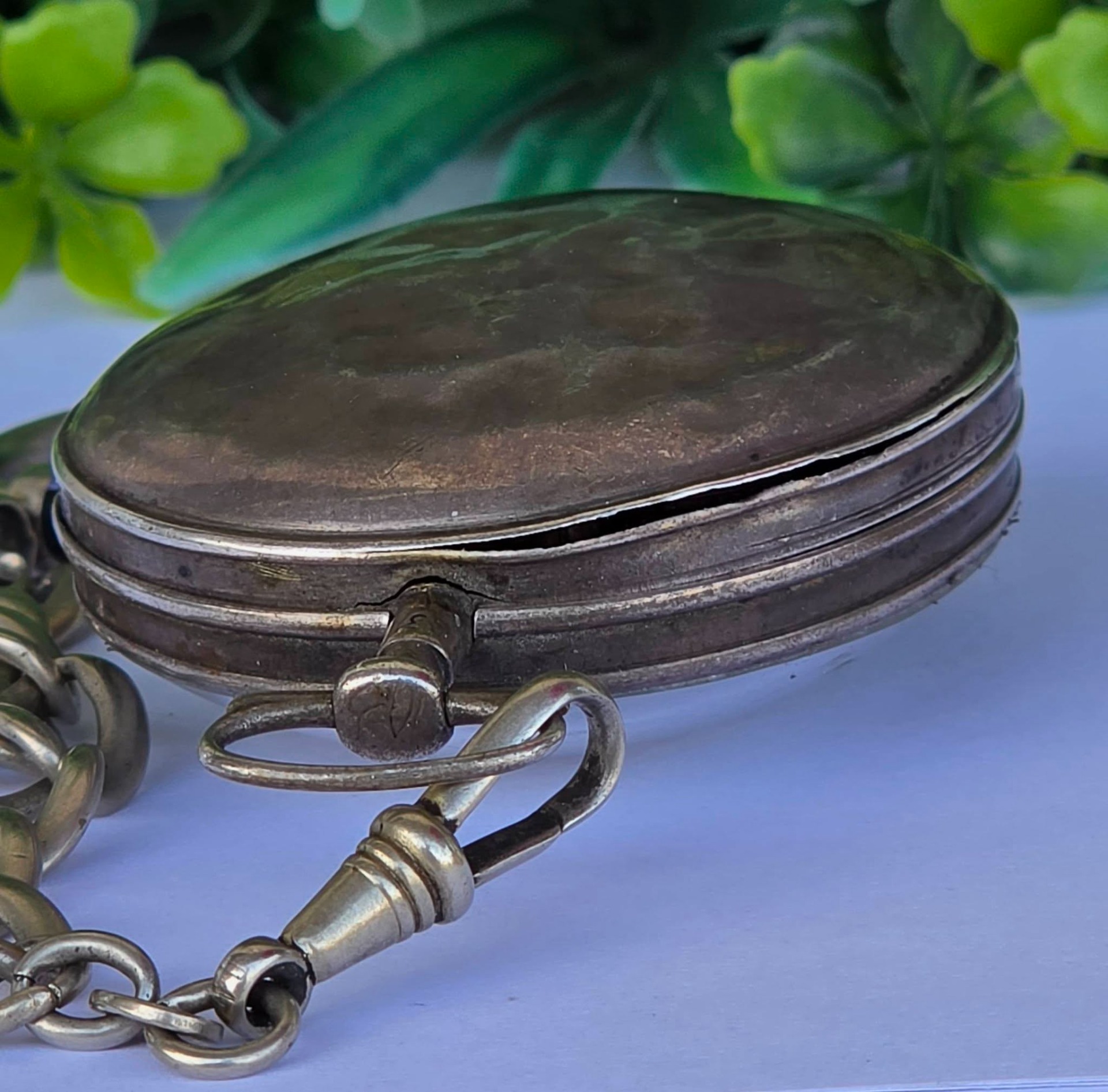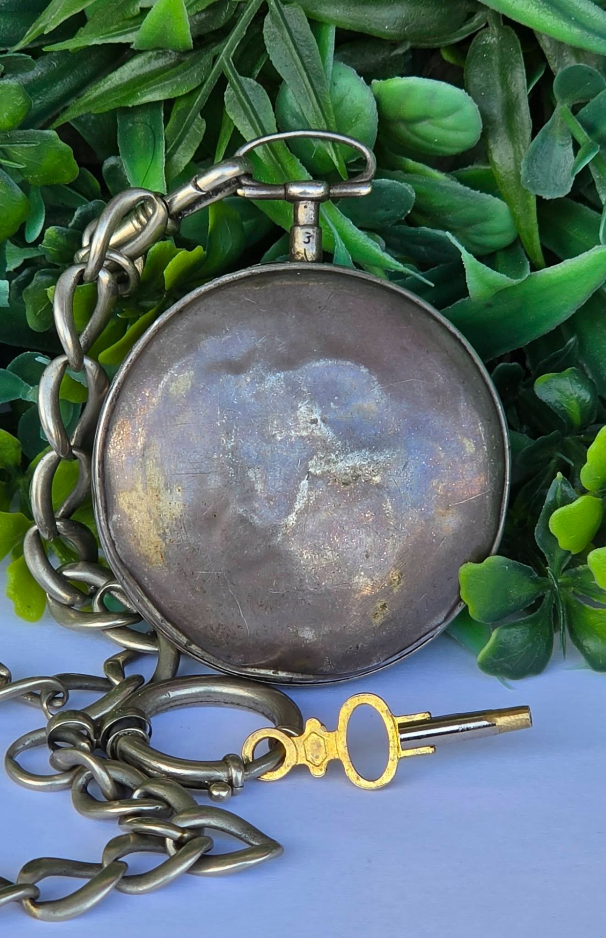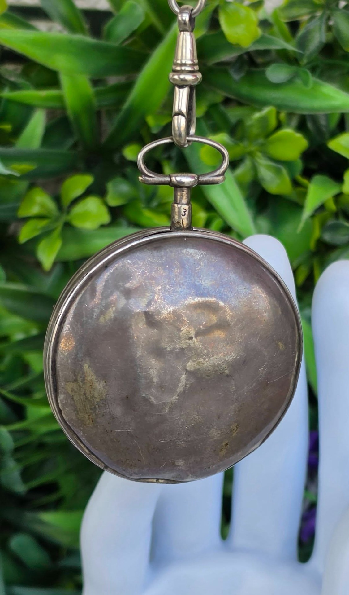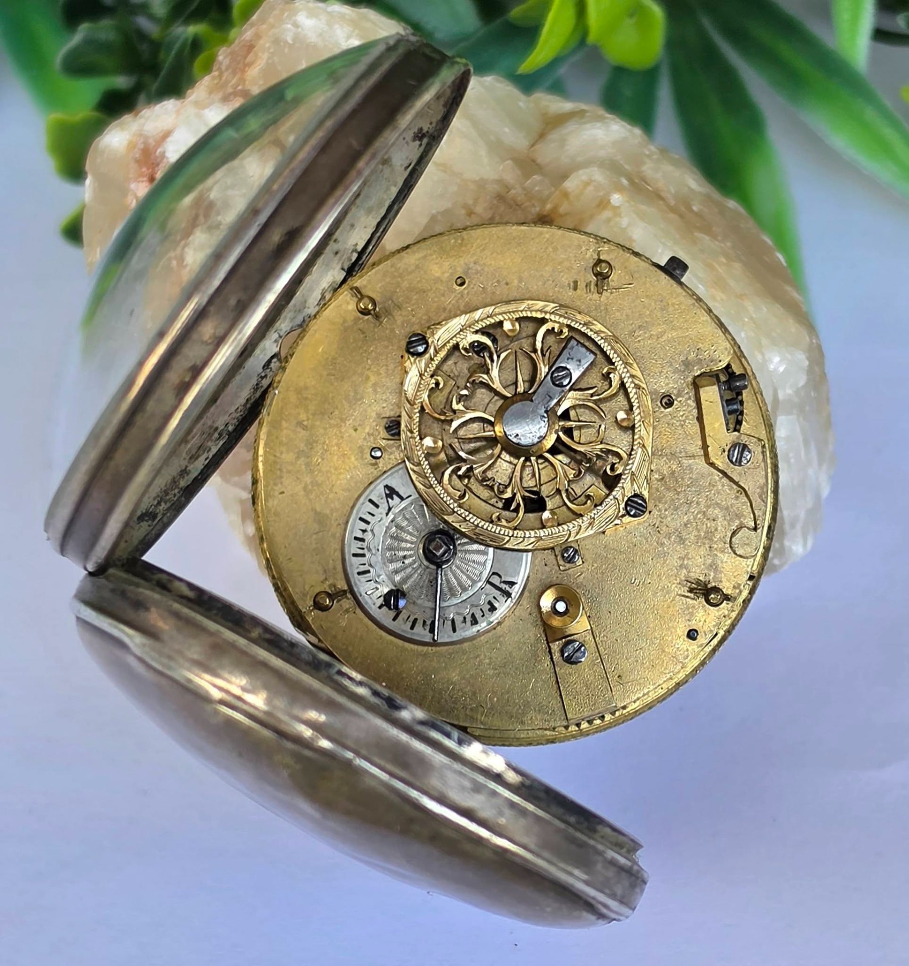 Ceas de buzunar cu mecanism Verge Fusee (cu fulie și lanț), piesă deosebită de colecție, datând din perioada 1790 – 1810, exemplar autentic, cu cadran unic, cu email pictat manual cu scenă de epocă (soldat în uniformă din perioada Războaielor Napoleoniene), orar excentric cu cifre arabe, mecanism "Verge Fusee" (eșapament cu vergea), cu piloni ornamentali și punte balansier (balance cock) lucrată manual în filigran, sistem de întoarcere cu cheiță, funcțional, carcasă din argint.