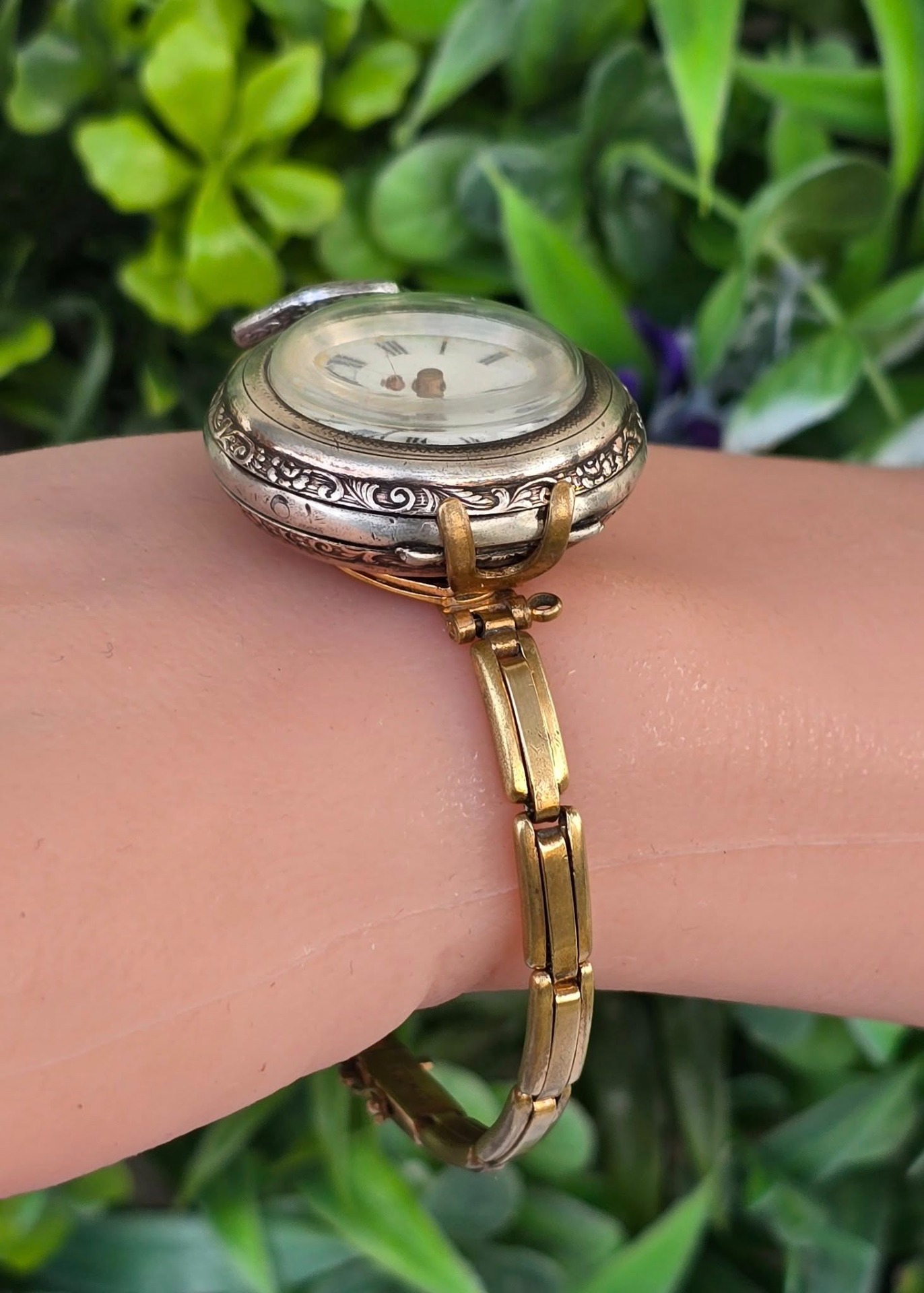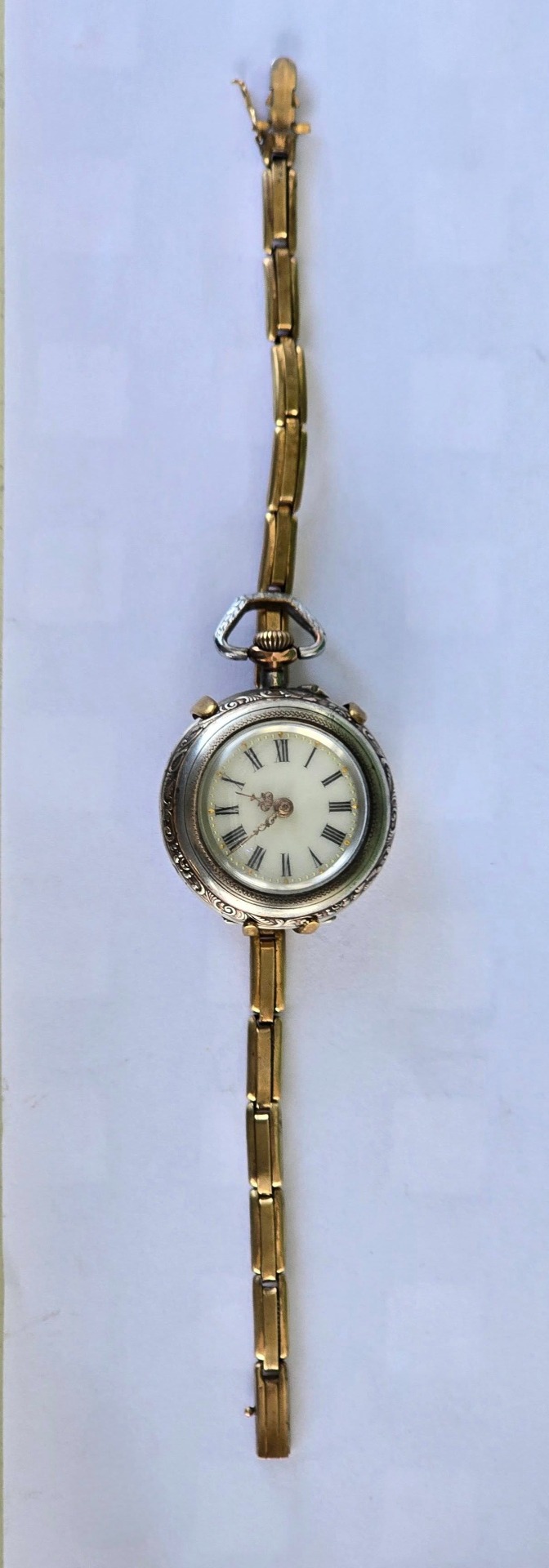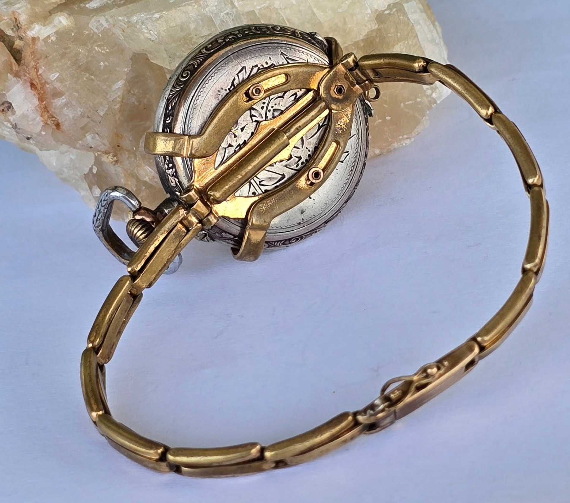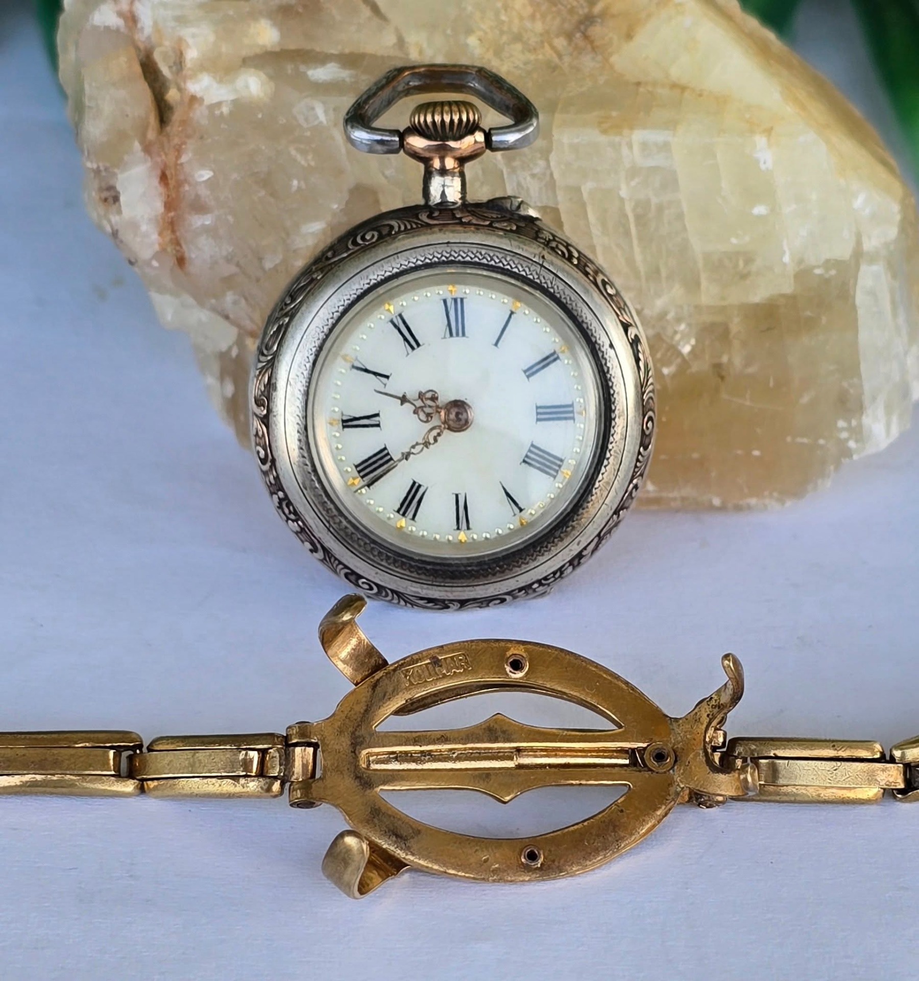 Ceas de buzunar de damă din argint, reglaj cu "pin", mecanism cu armare manuală funcțional, indicatori "Louis XV", cu brățară specială din alamă aurită,