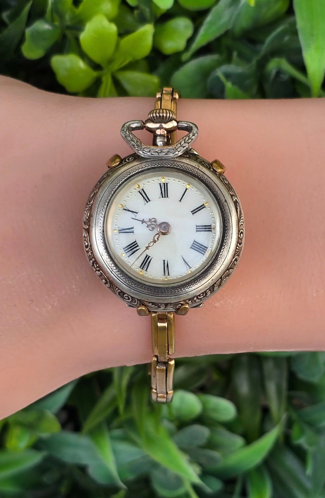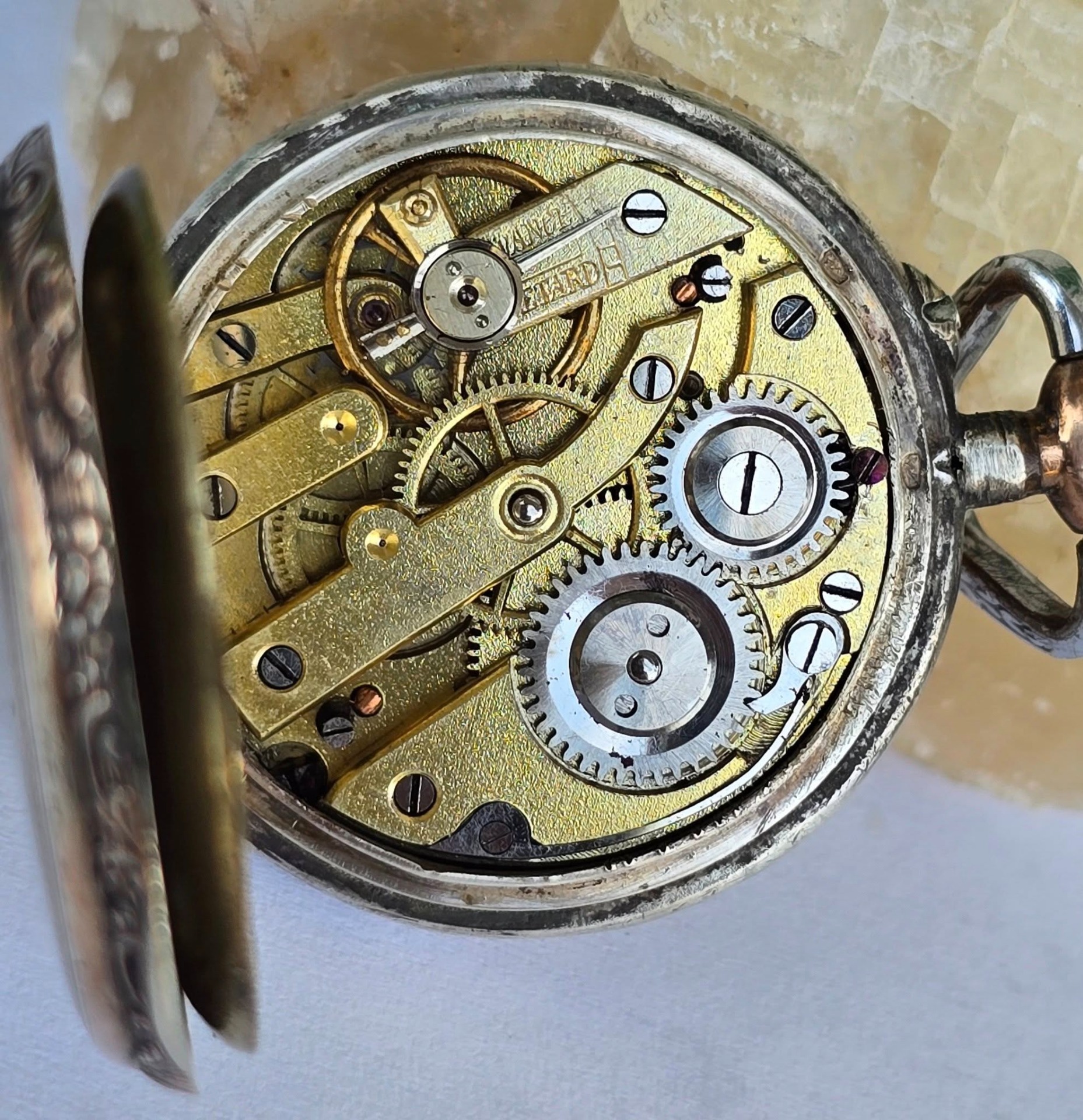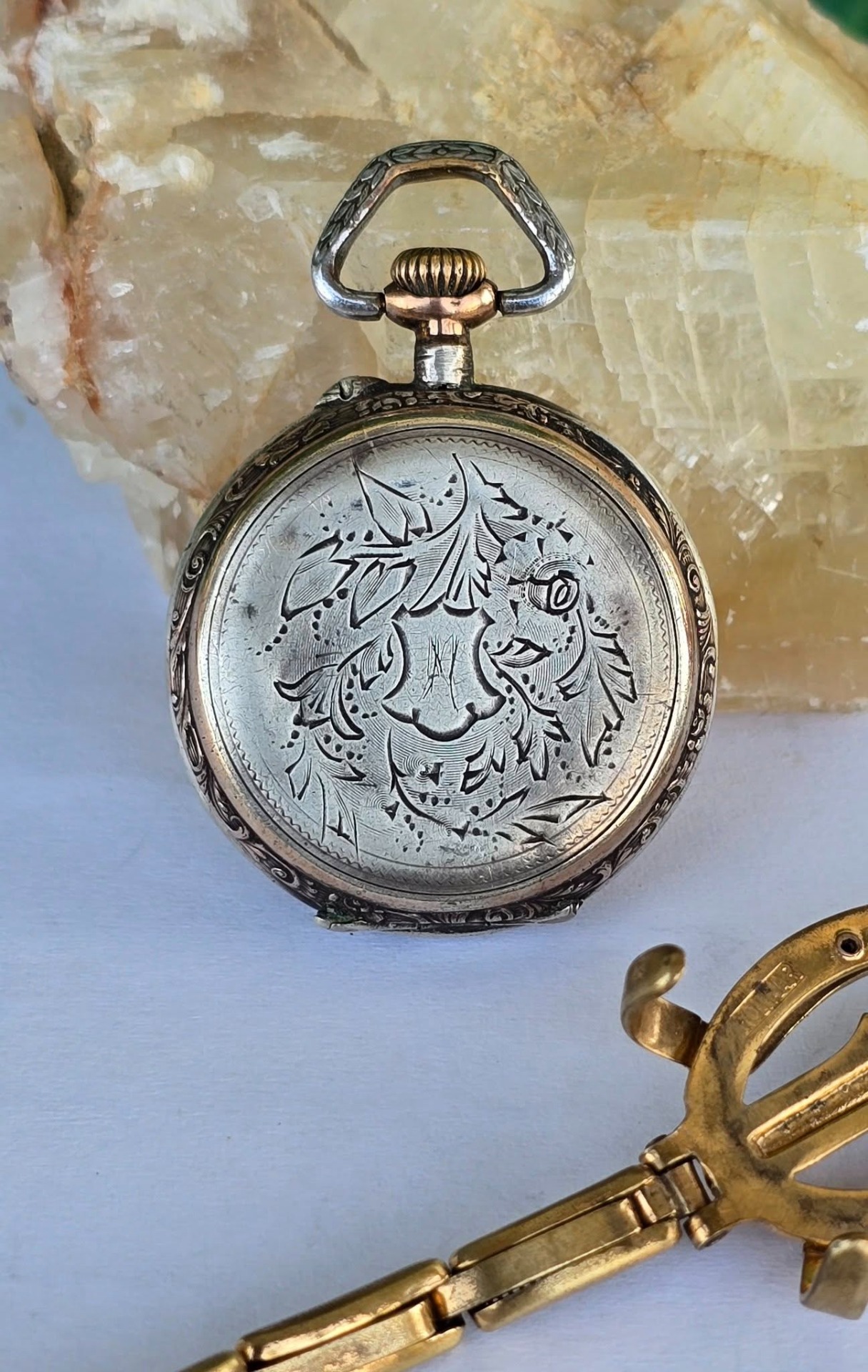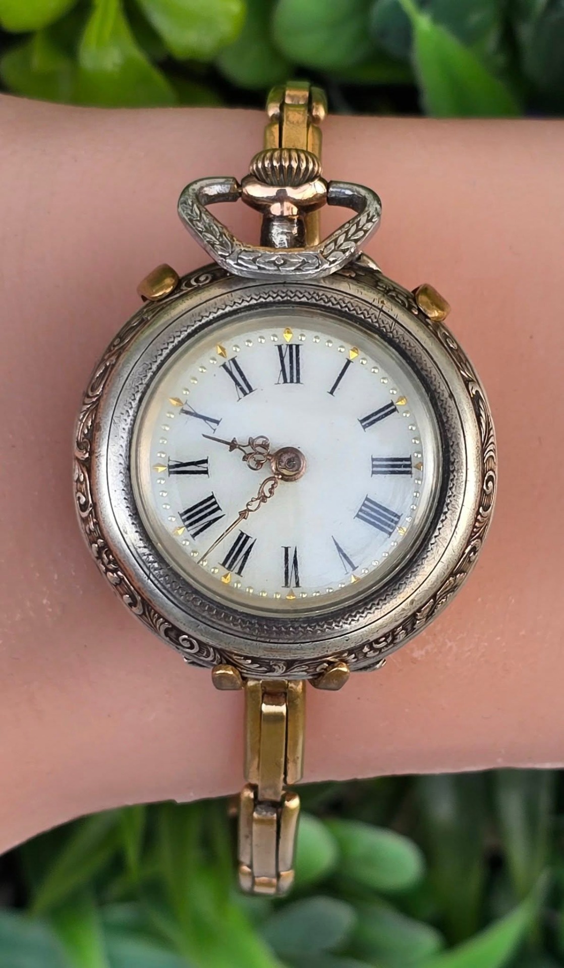 Ceas de buzunar de damă din argint, reglaj cu "pin", mecanism cu armare manuală funcțional, indicatori "Louis XV", cu brățară specială din alamă aurită,