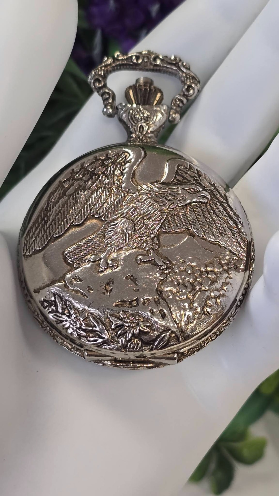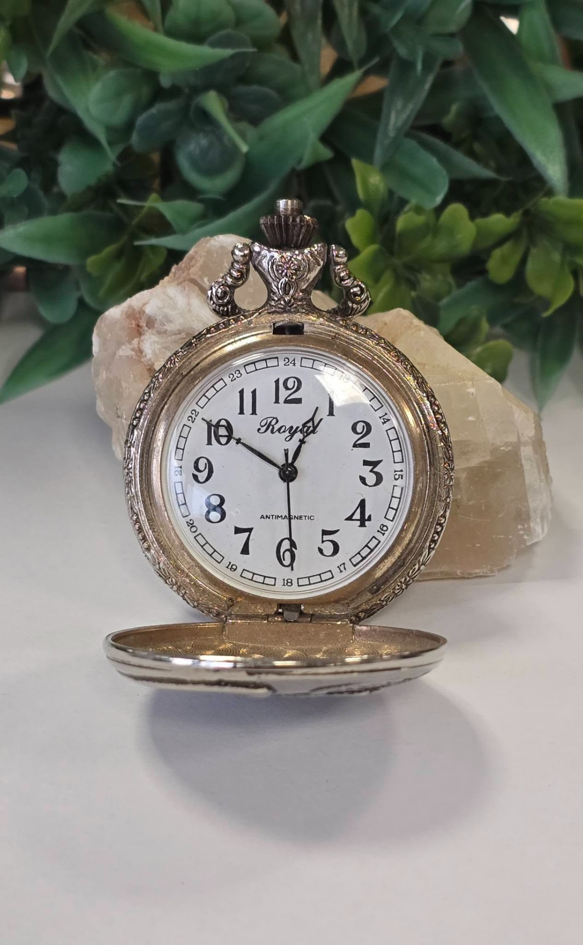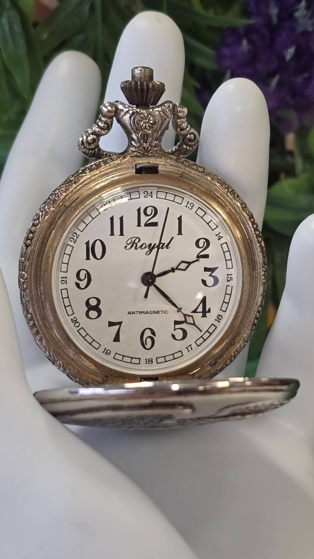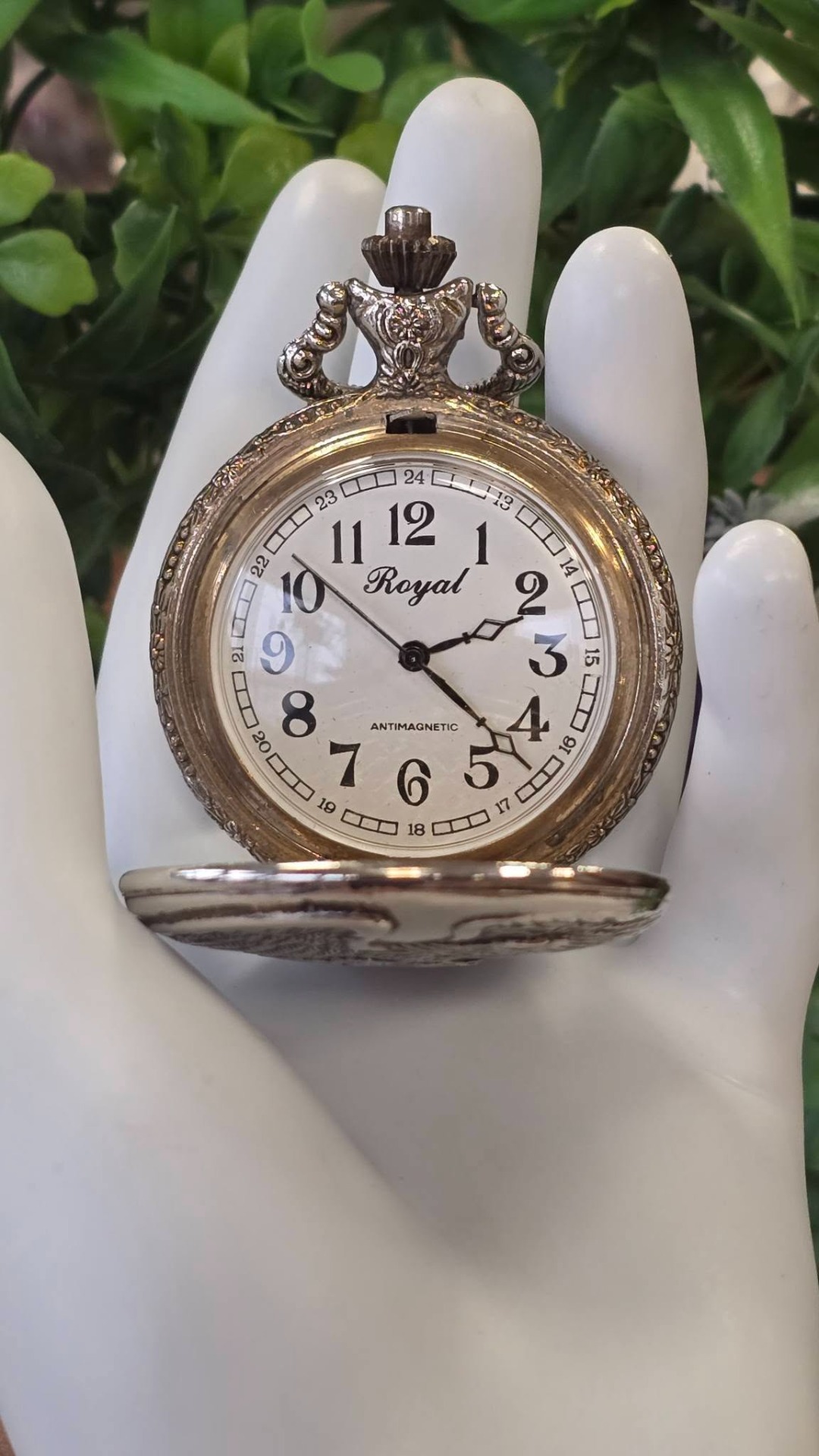 Ceas de buzunar Royal, din metal argintat, frumos gravat cu vultur și motiv floral, mecanism cu armare manuală, funcțional (anii 1980, Germania).