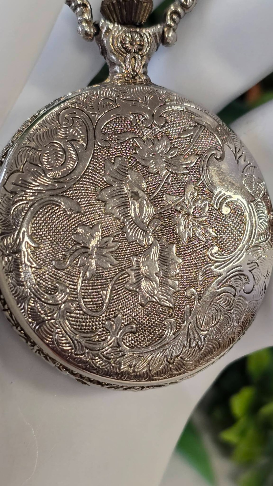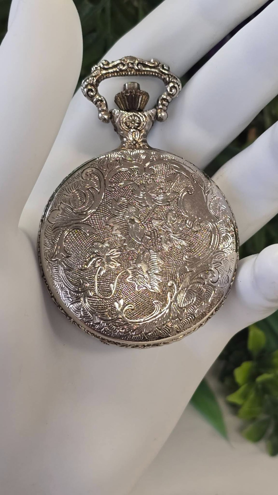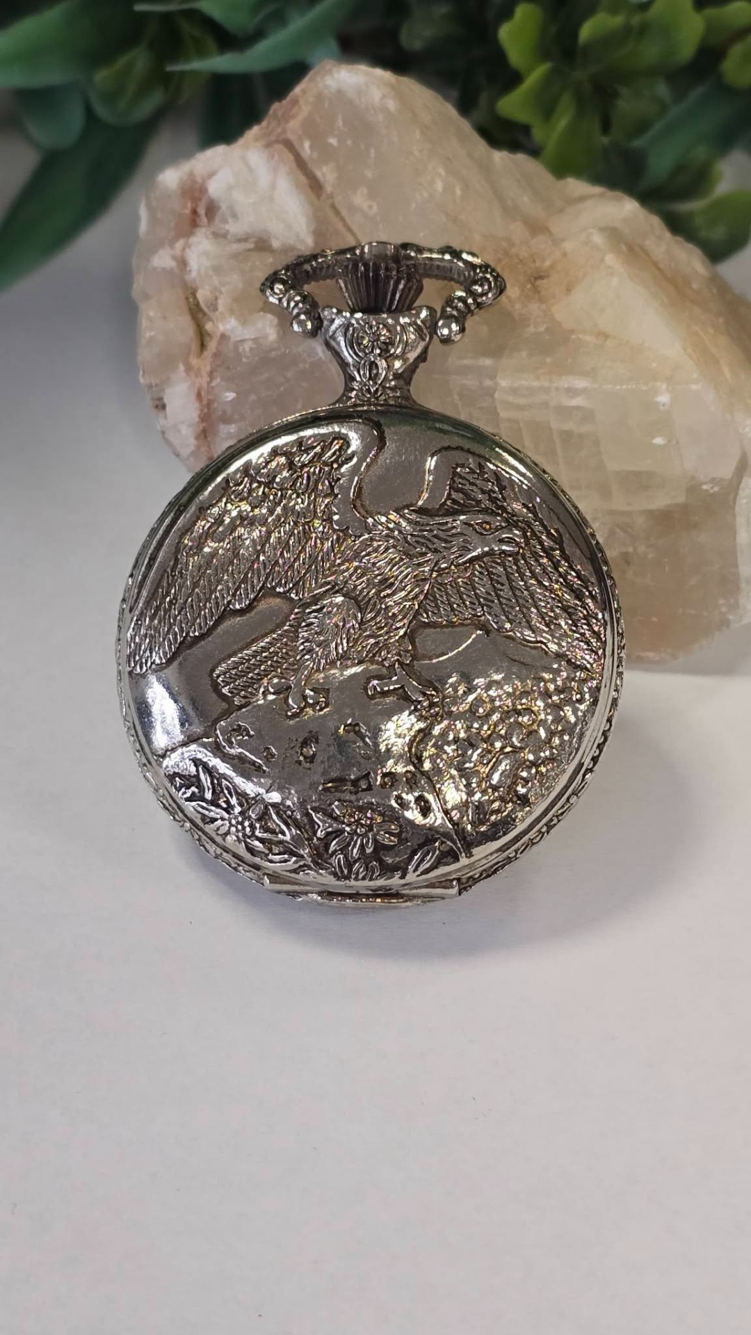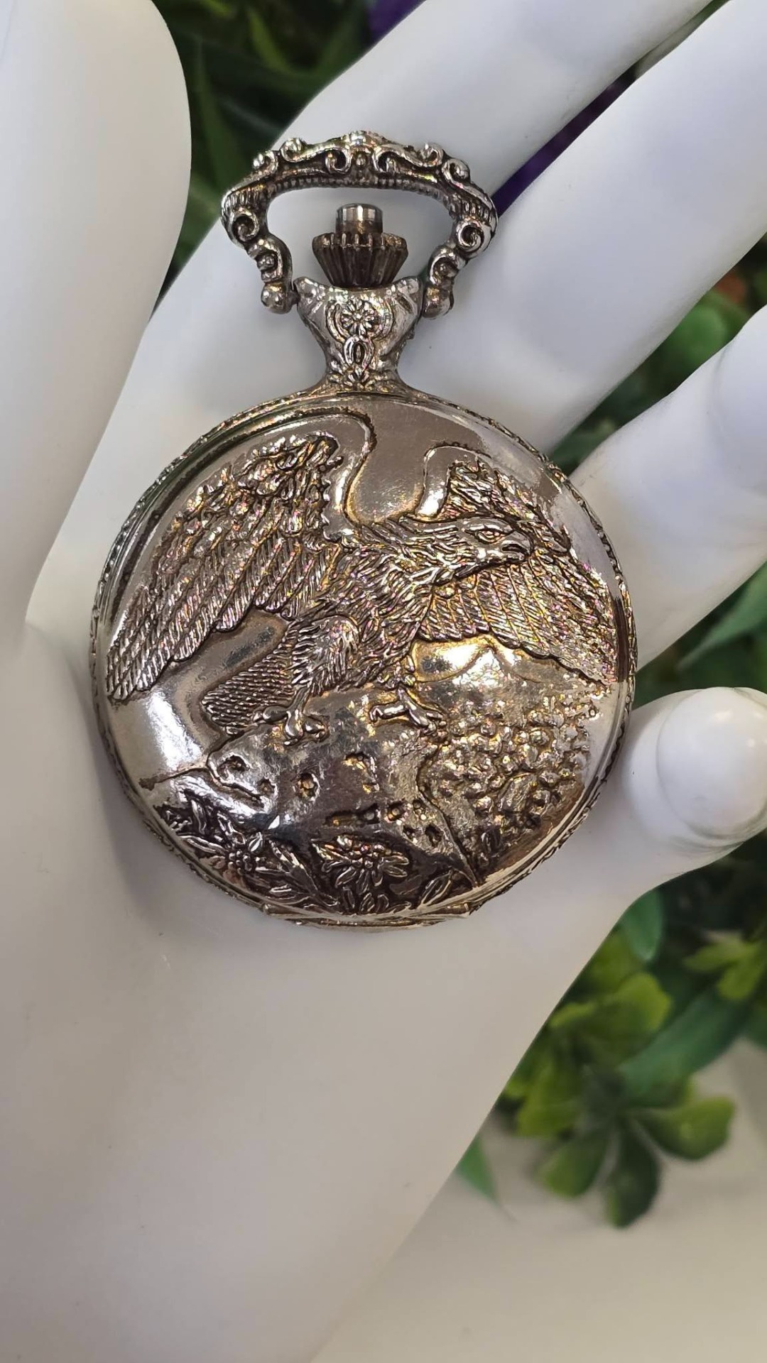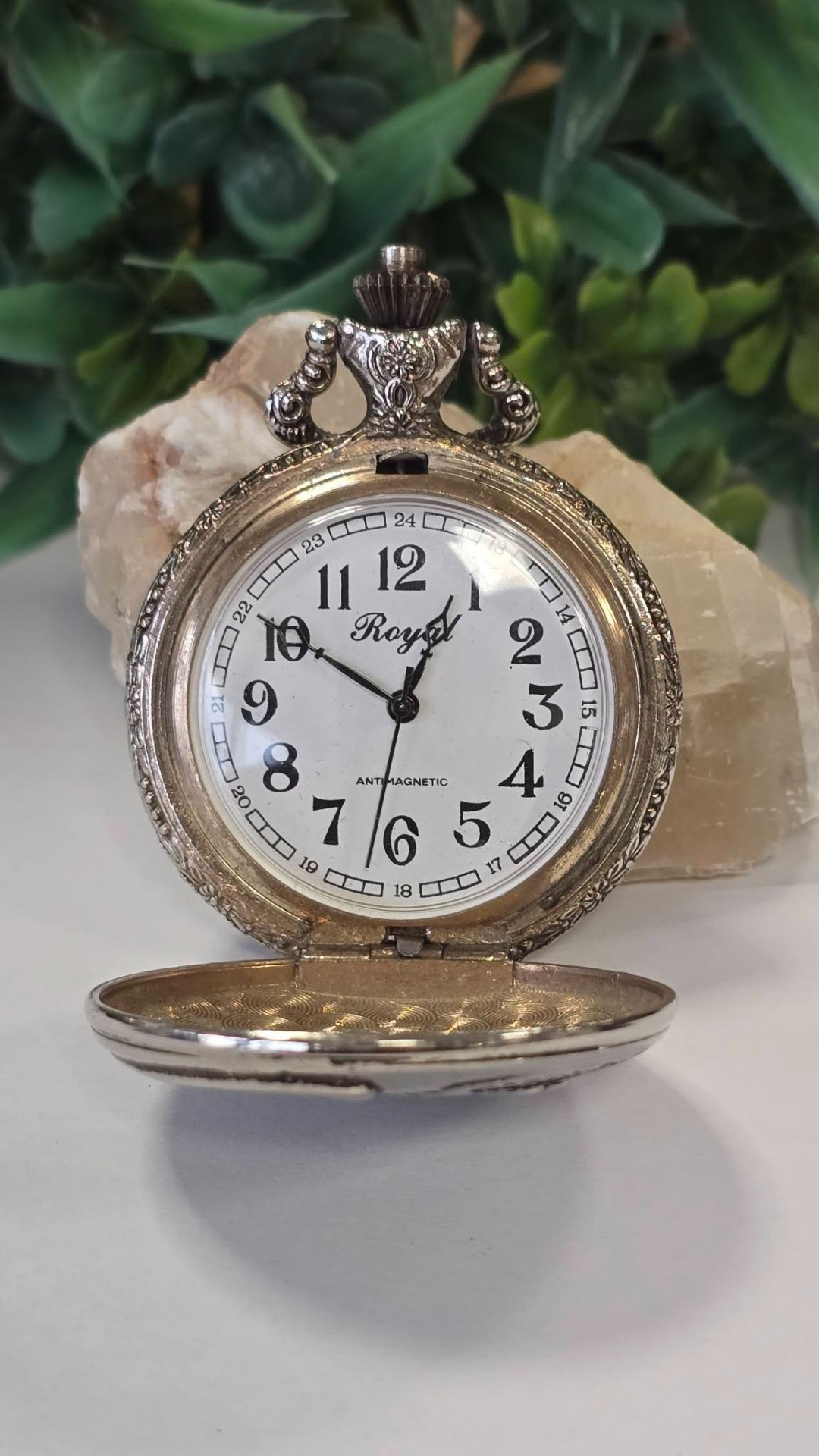 Ceas de buzunar Royal, din metal argintat, frumos gravat cu vultur și motiv floral, mecanism cu armare manuală, funcțional (anii 1980, Germania).