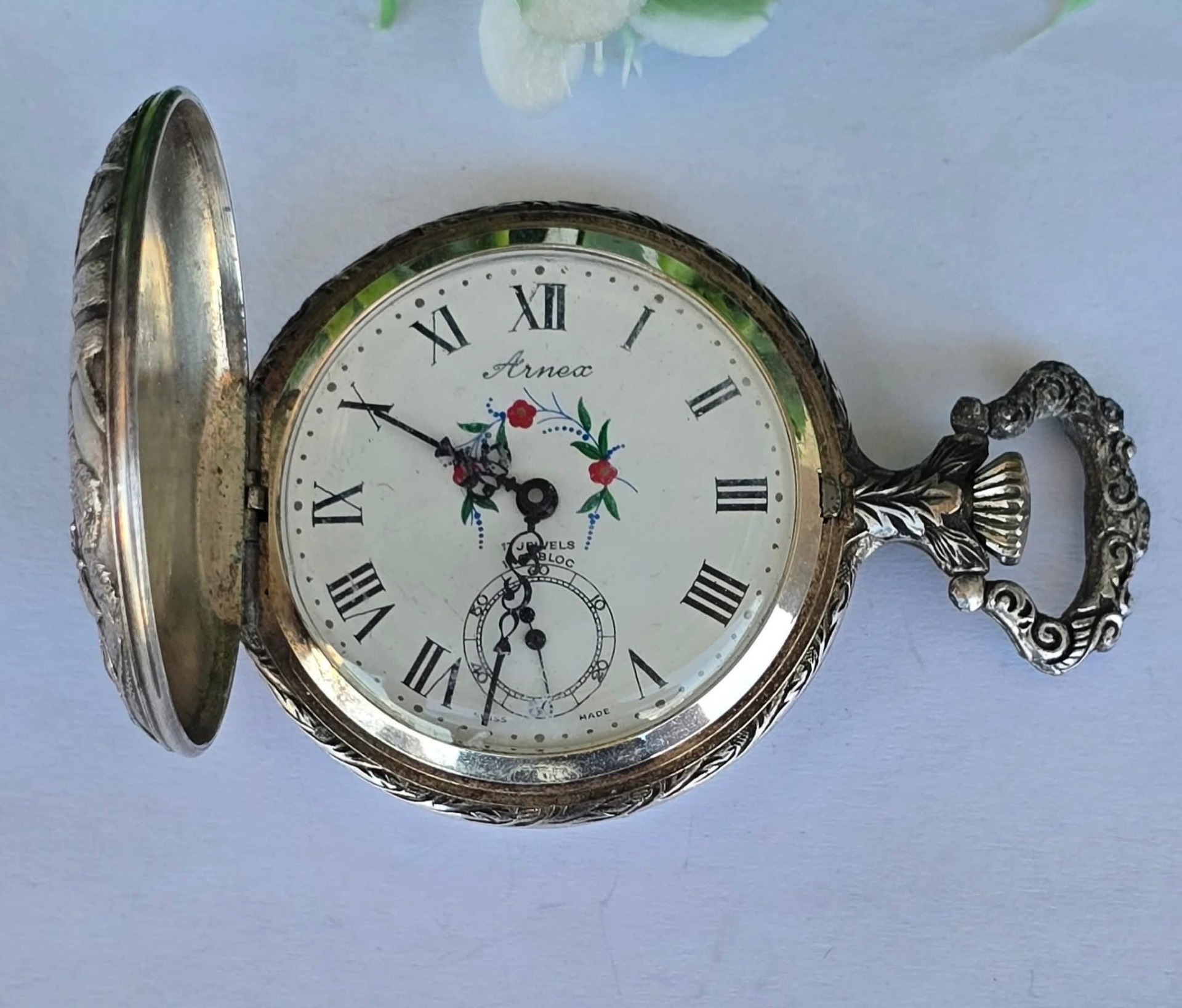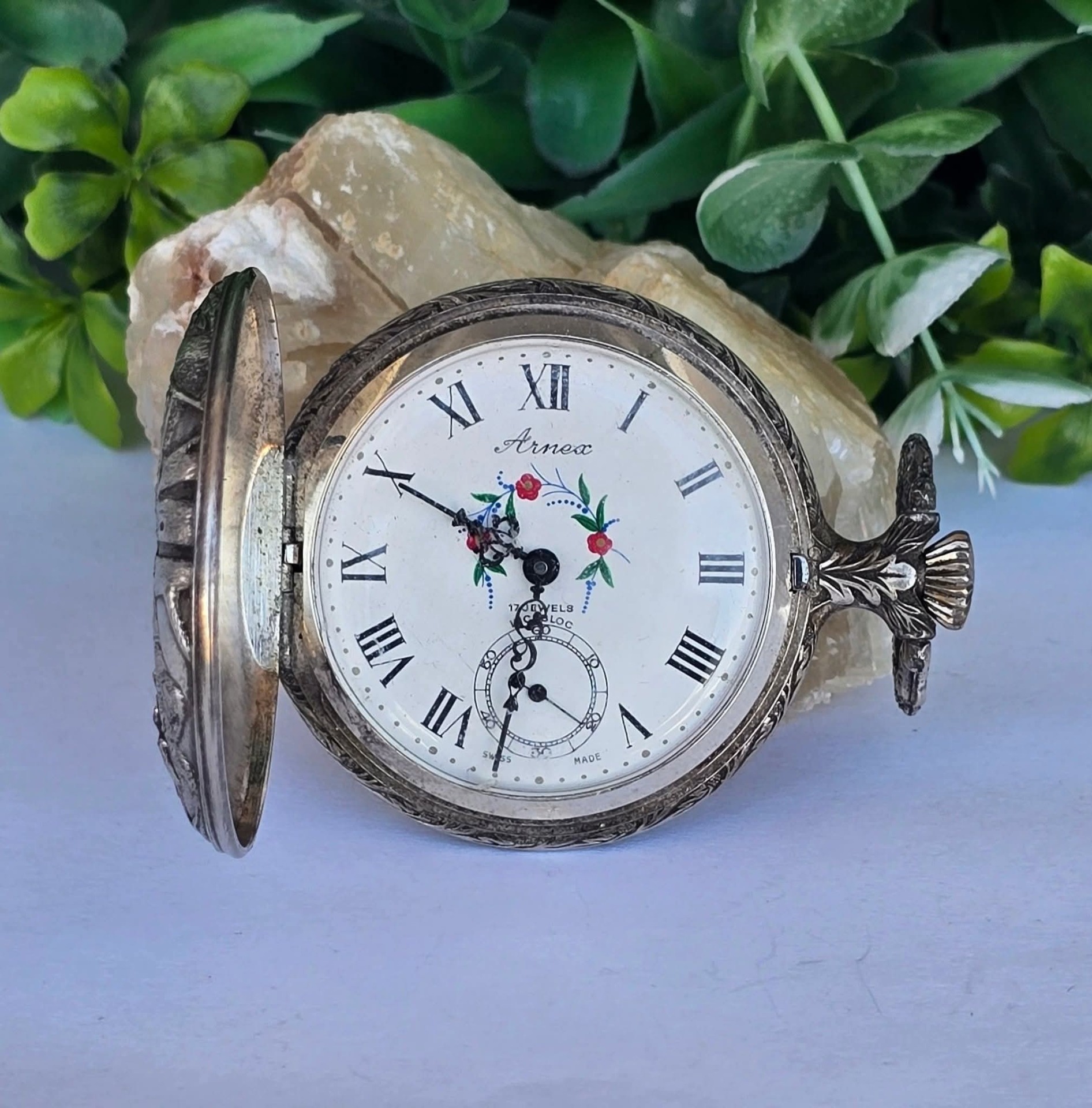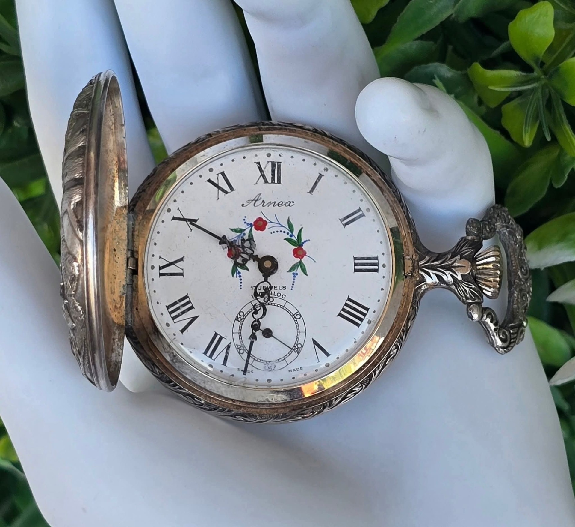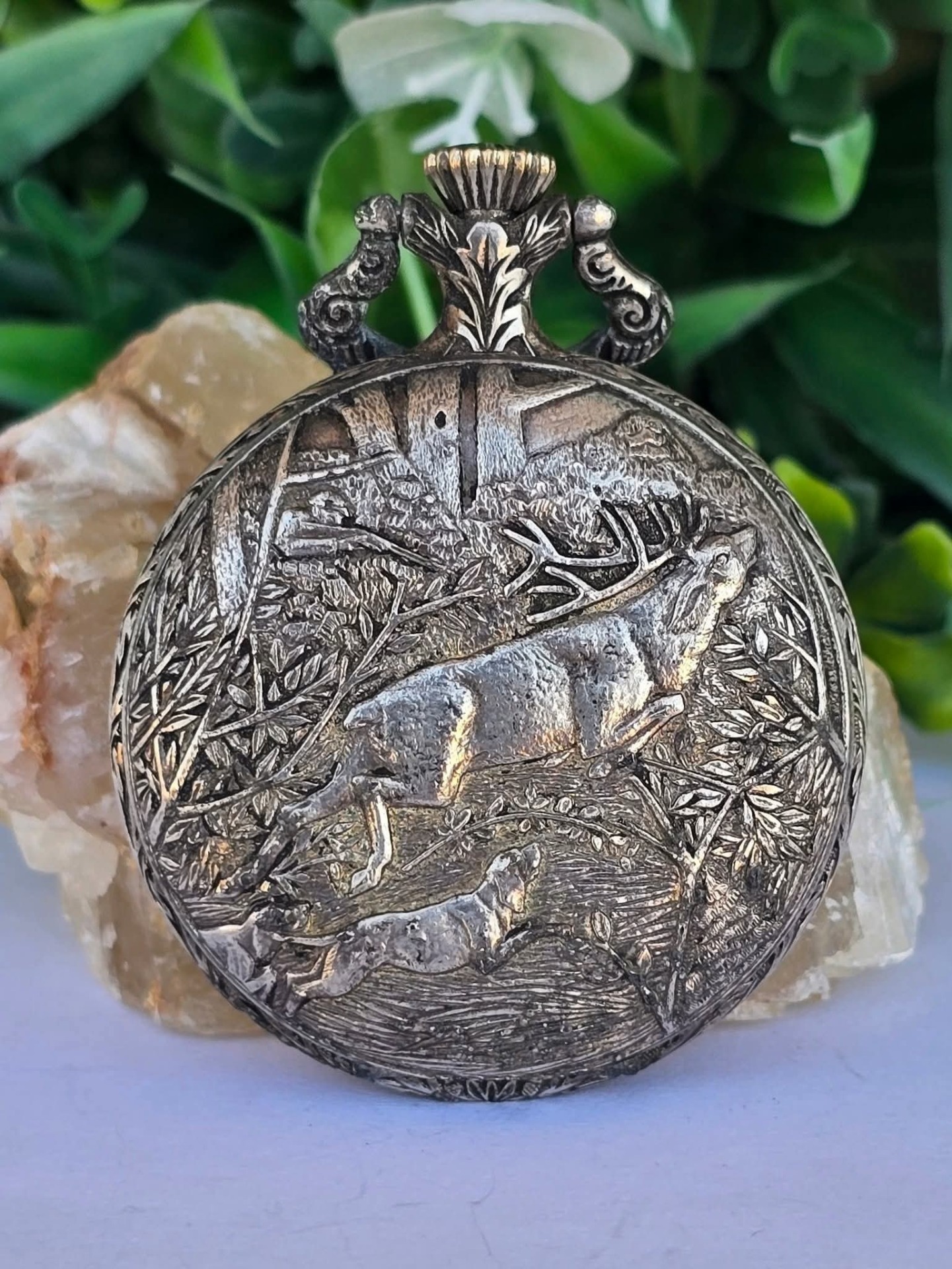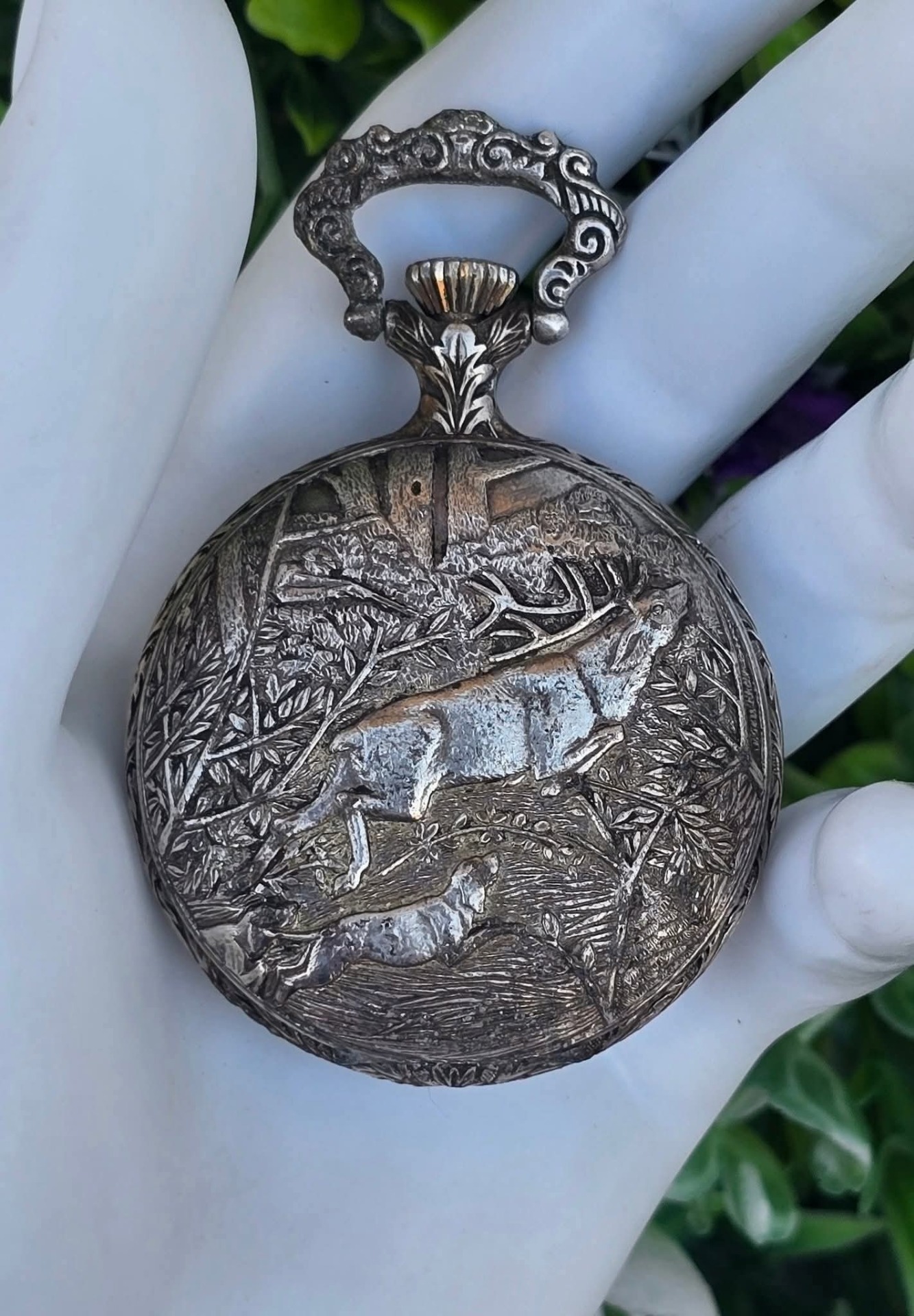 Ceas de buzunar vintage Arnex, cu motiv "Deer Hunter", de colecție, din metal argintat, mecanism elvețian cu armare manuală, funcțional, 17 jewels (anii 1950,