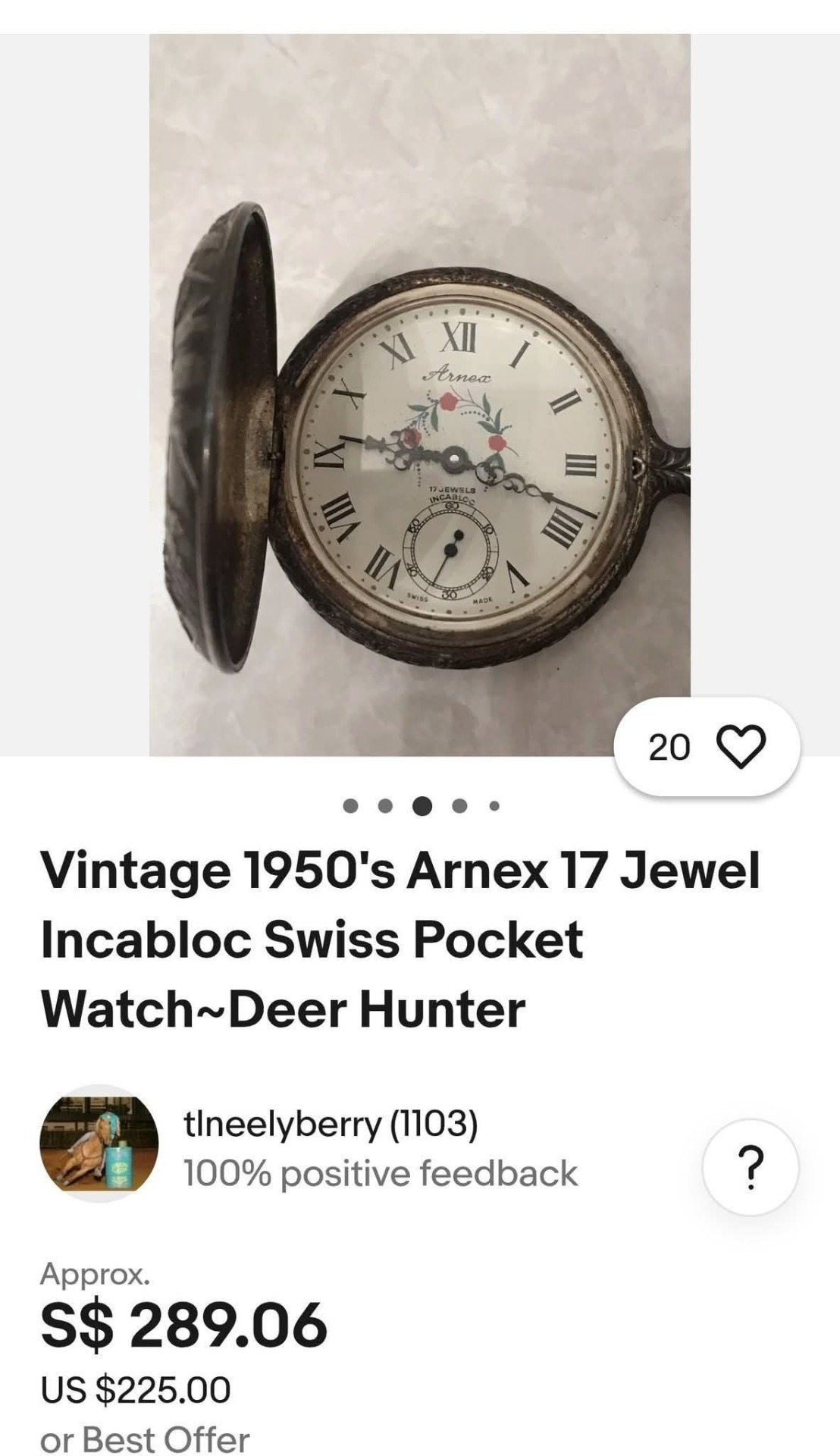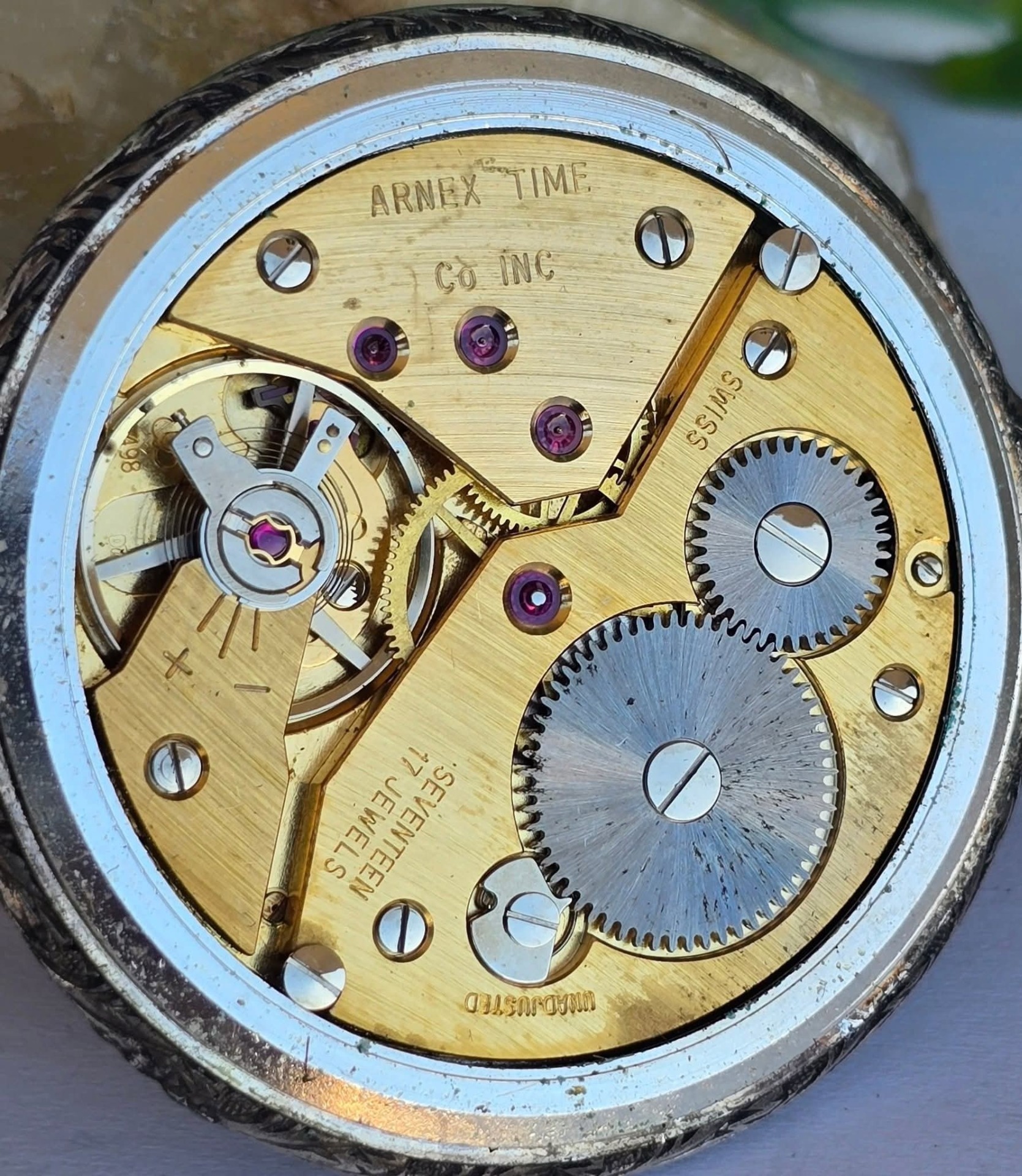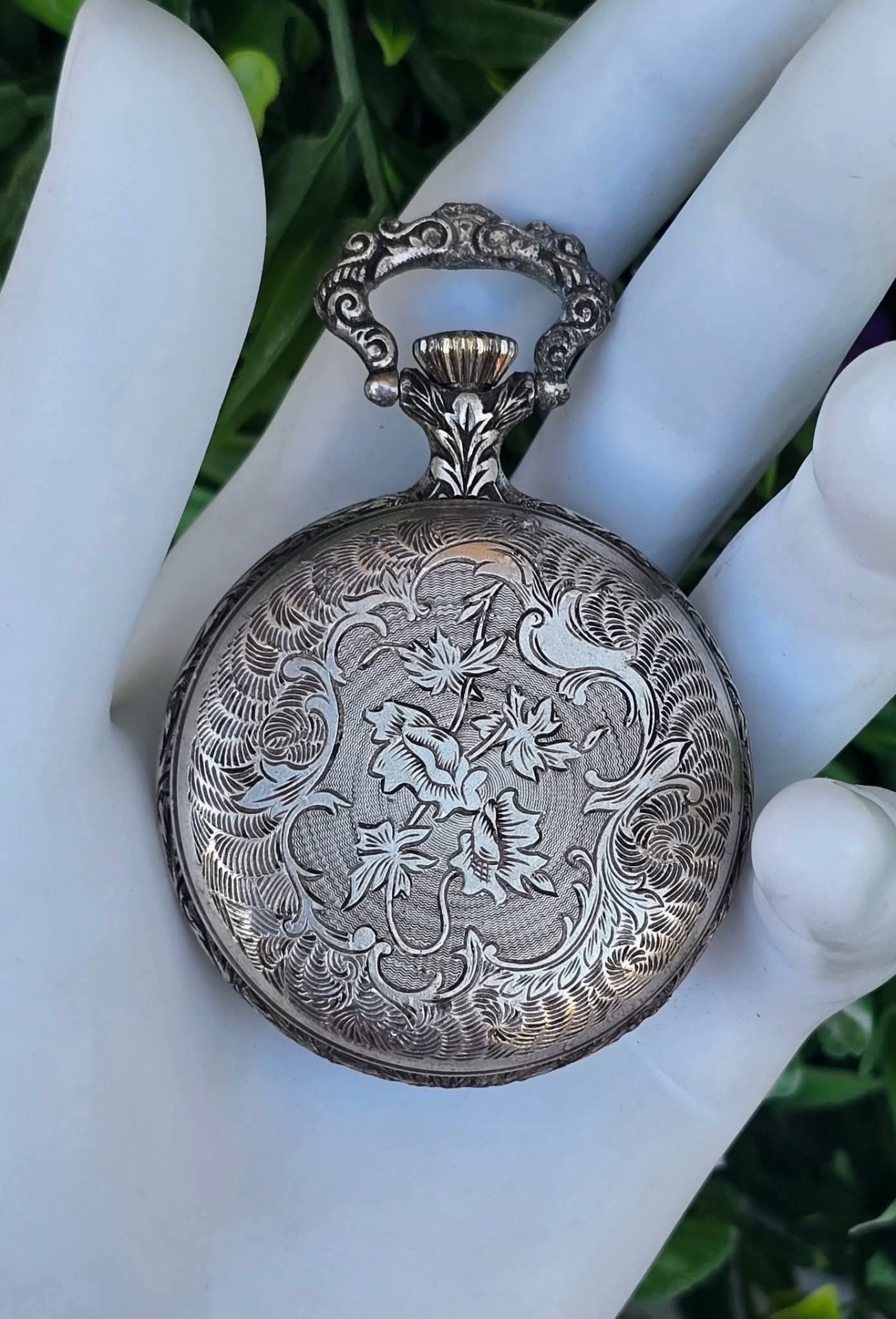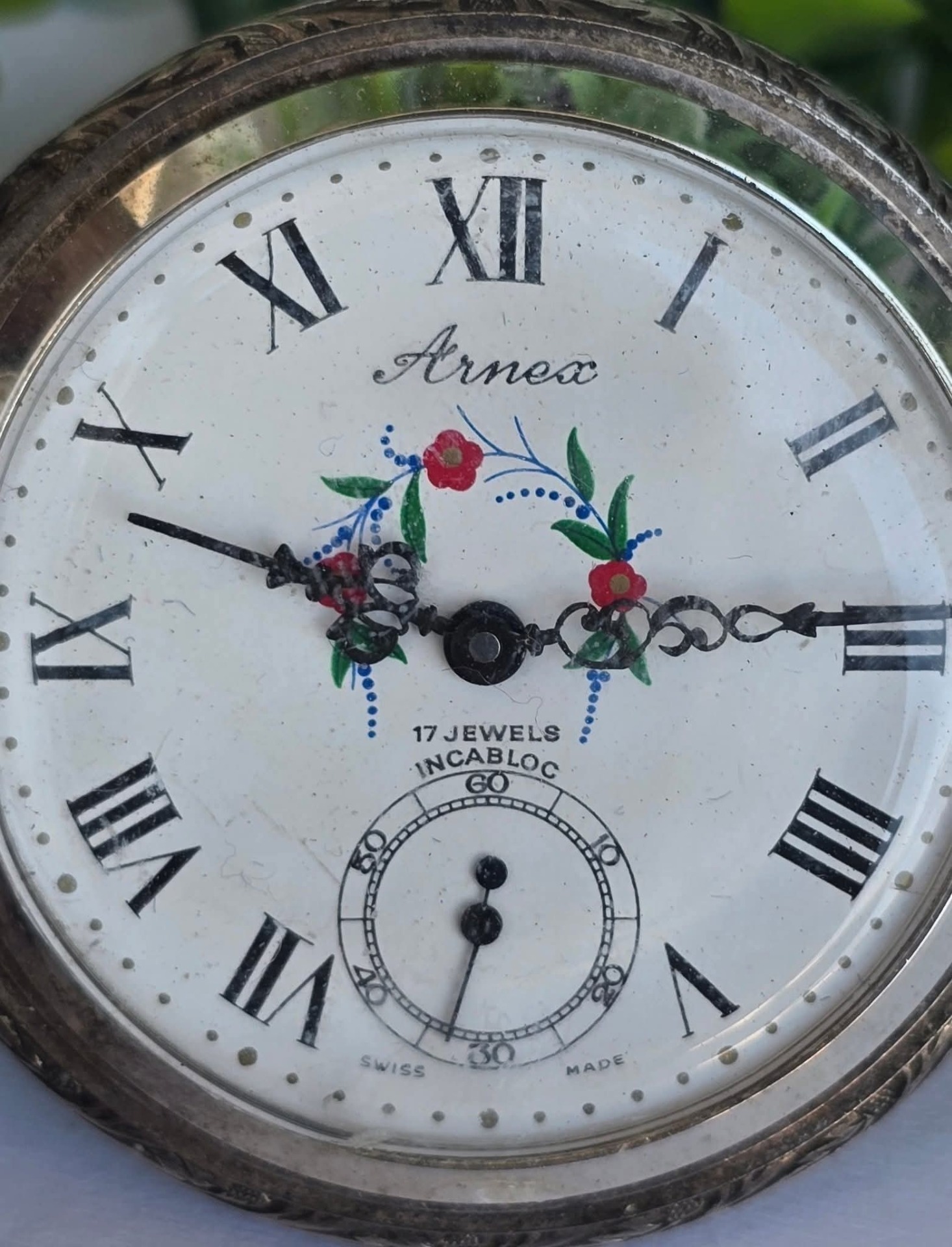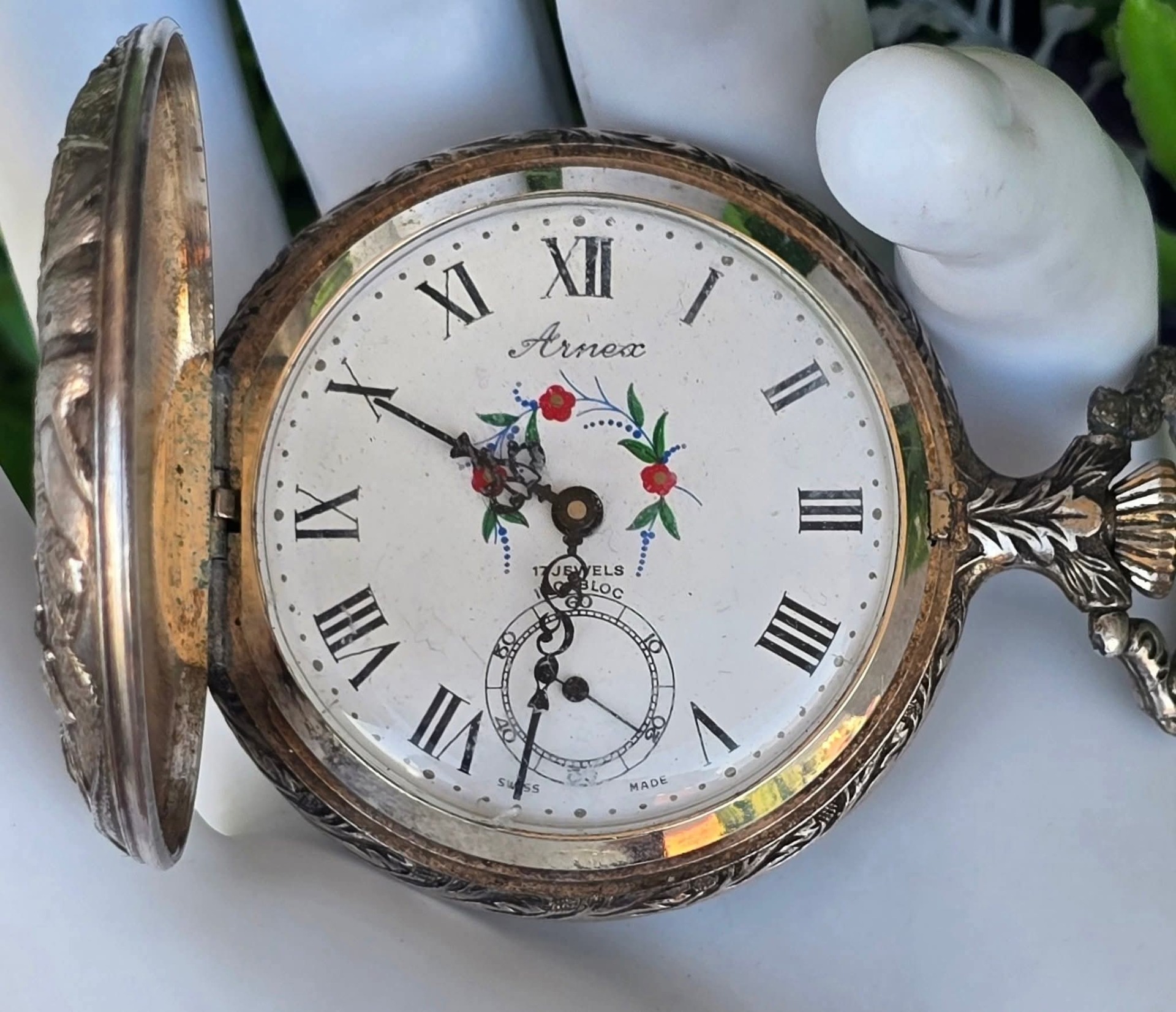 Ceas de buzunar vintage Arnex, cu motiv "Deer Hunter", de colecție, din metal argintat, mecanism elvețian cu armare manuală, funcțional, 17 jewels (anii 1950,