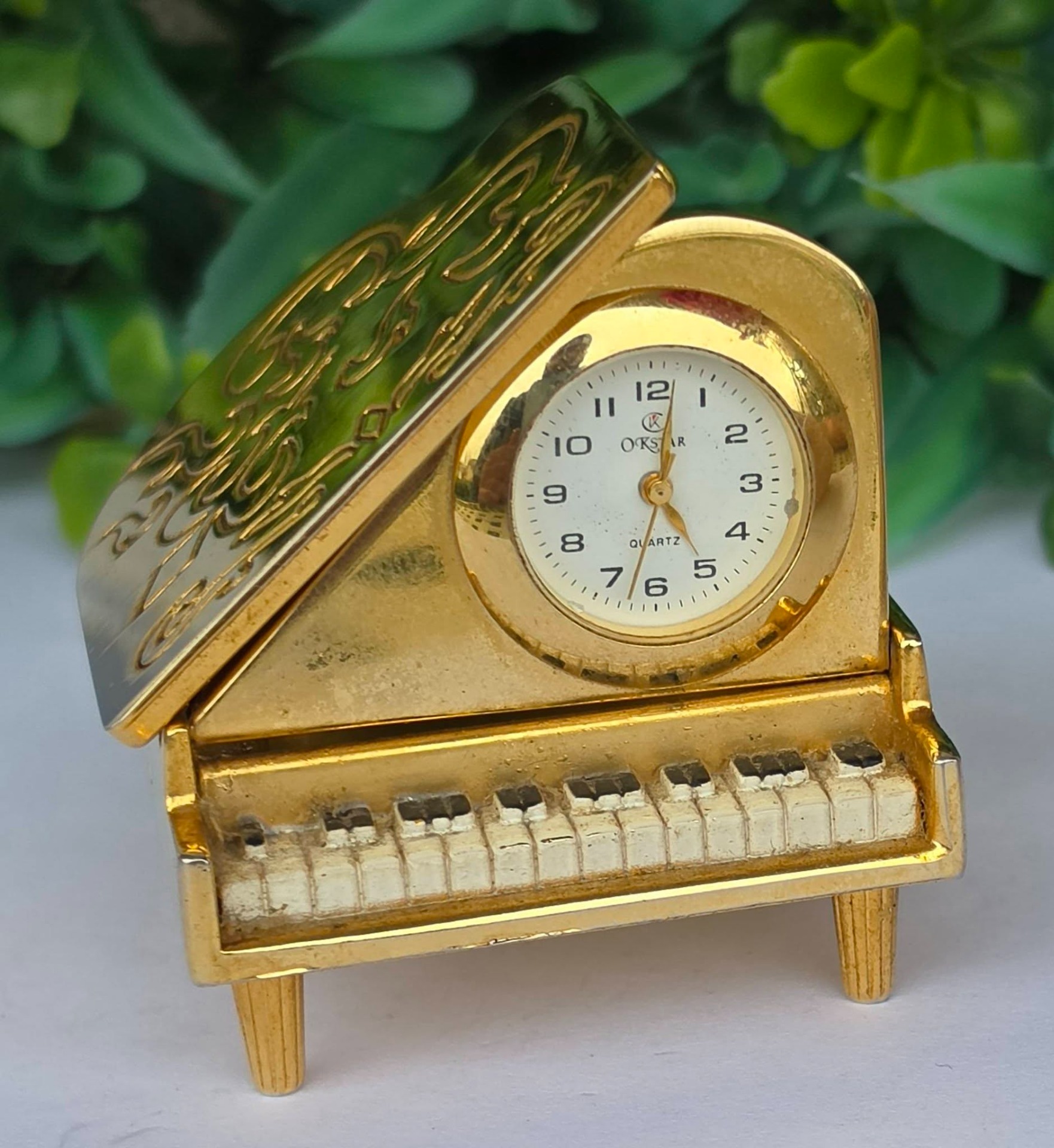 Ceas de masă în miniatură, din metal aurit, cu mecanism quartz în stare de funcționare.