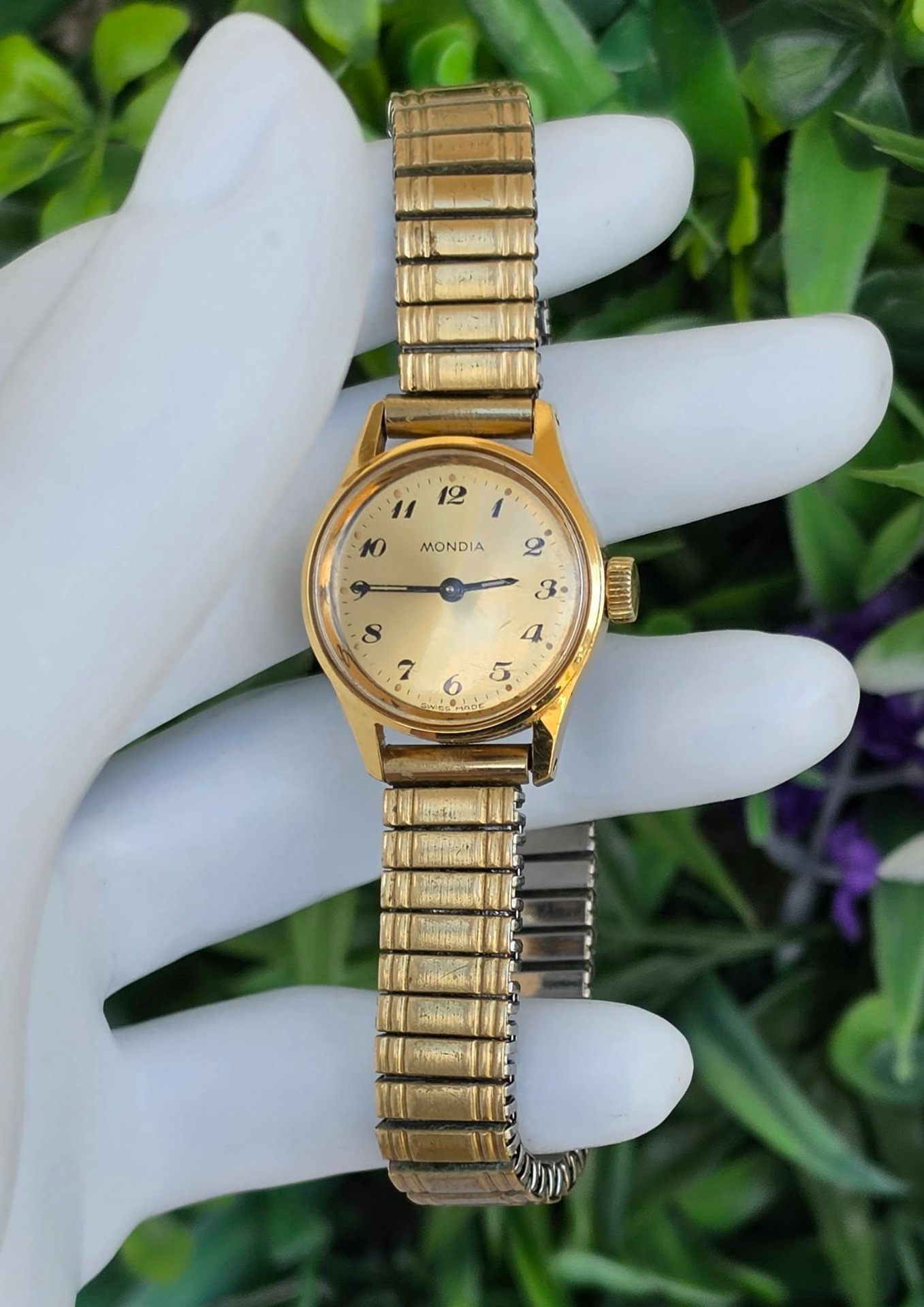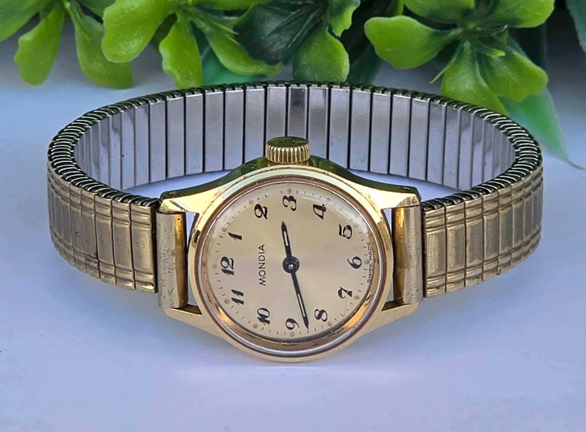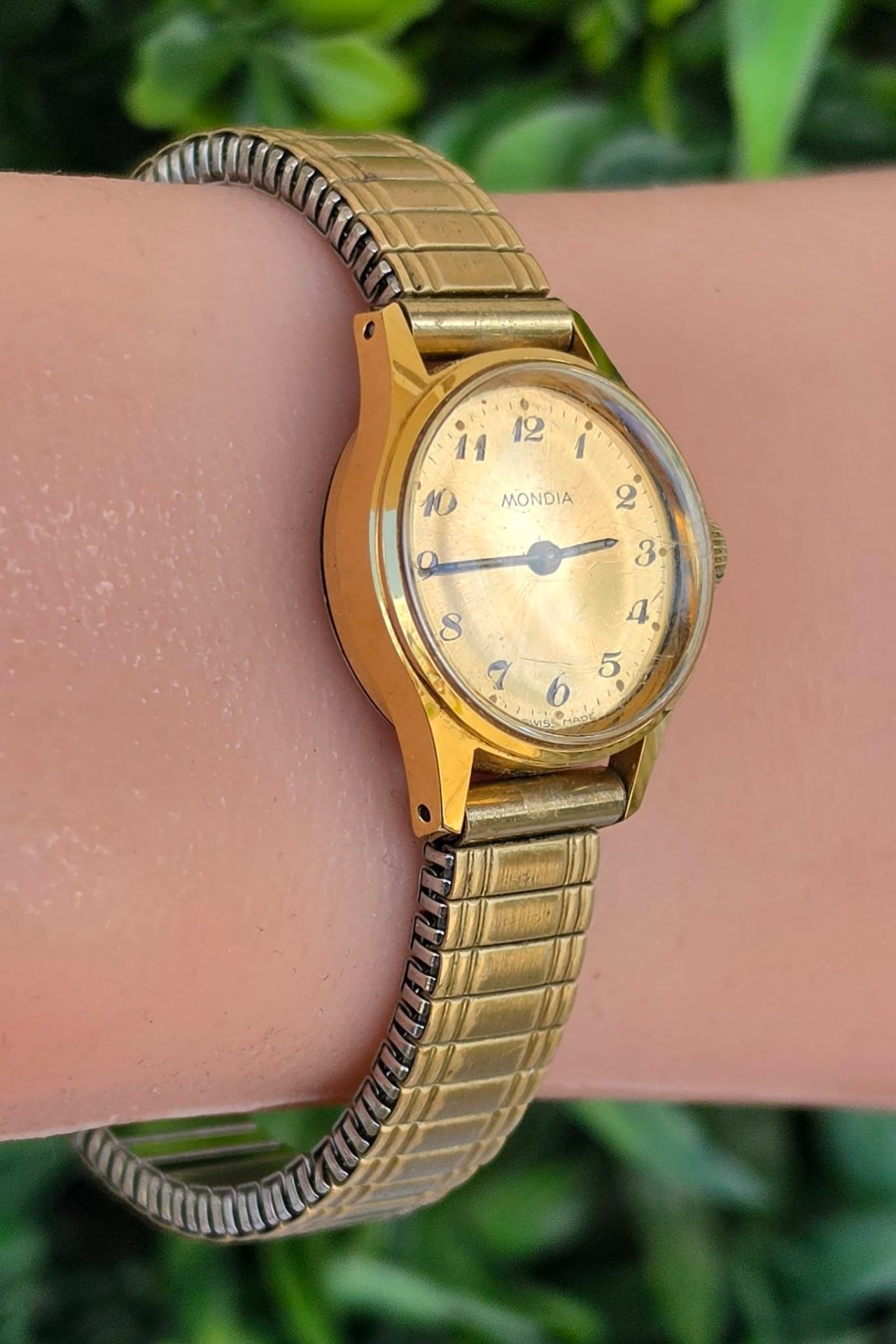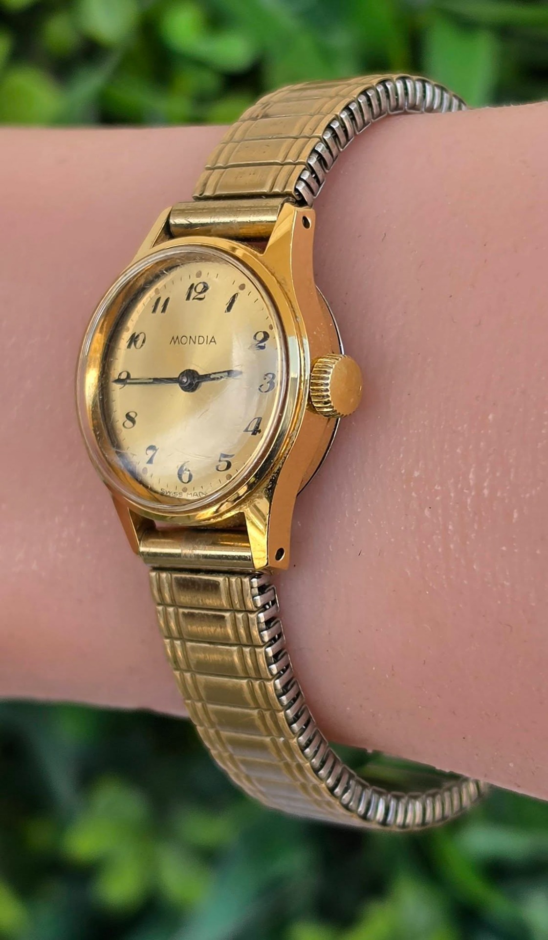 Ceas elvețian Mondia vintage, din metal aurit, cu mecanism cu armare manuală în stare de funcționare, 17 jewels, cu brățară extensibilă placată cu aur (anii 1960-1970, Elveția).