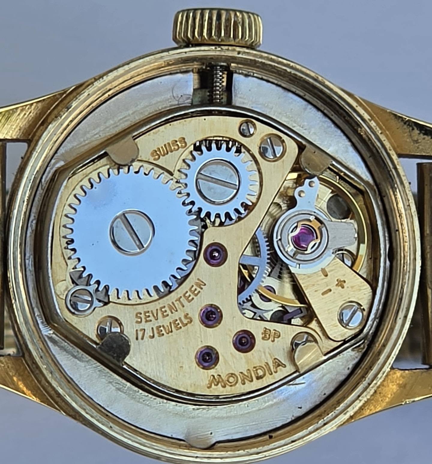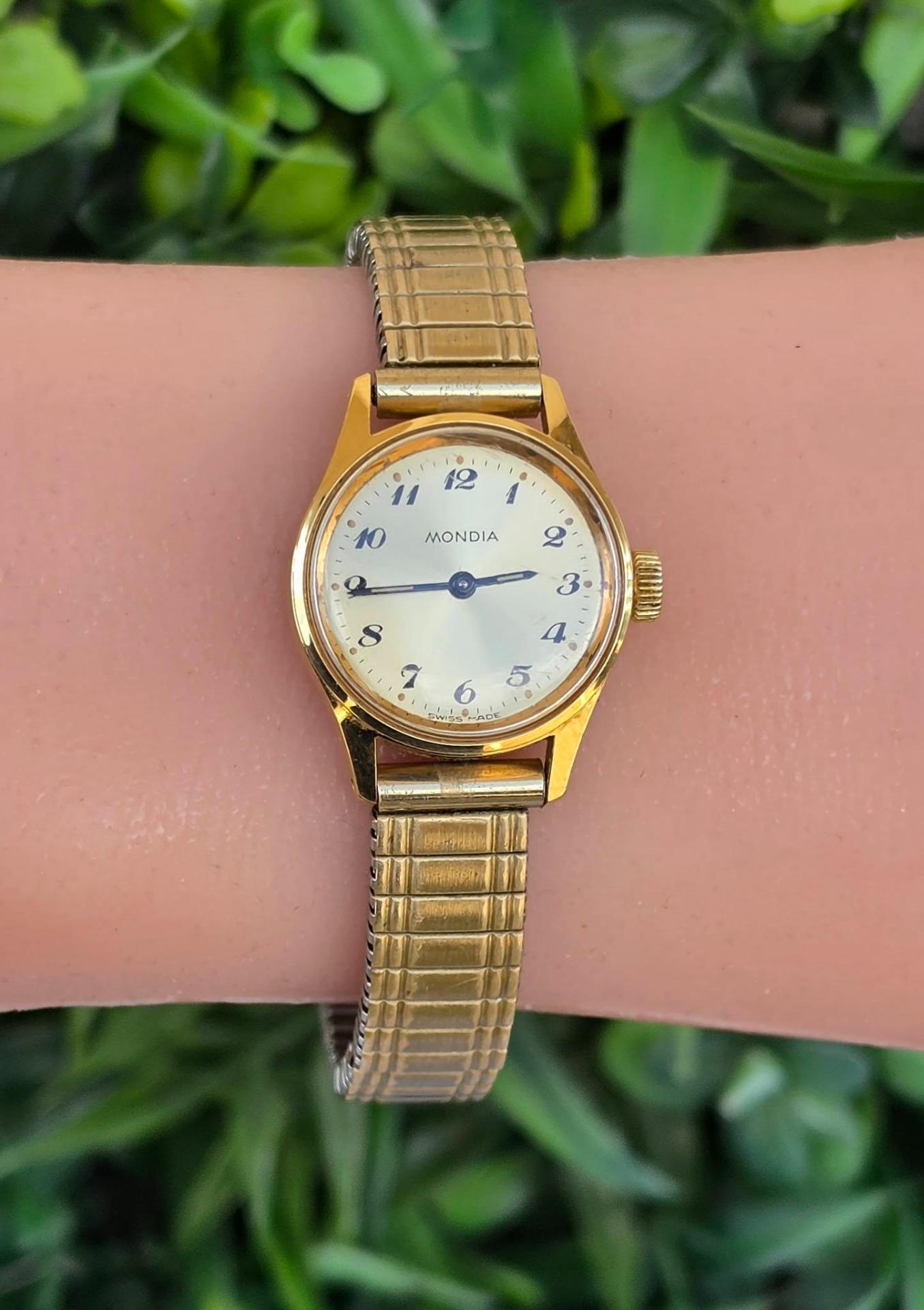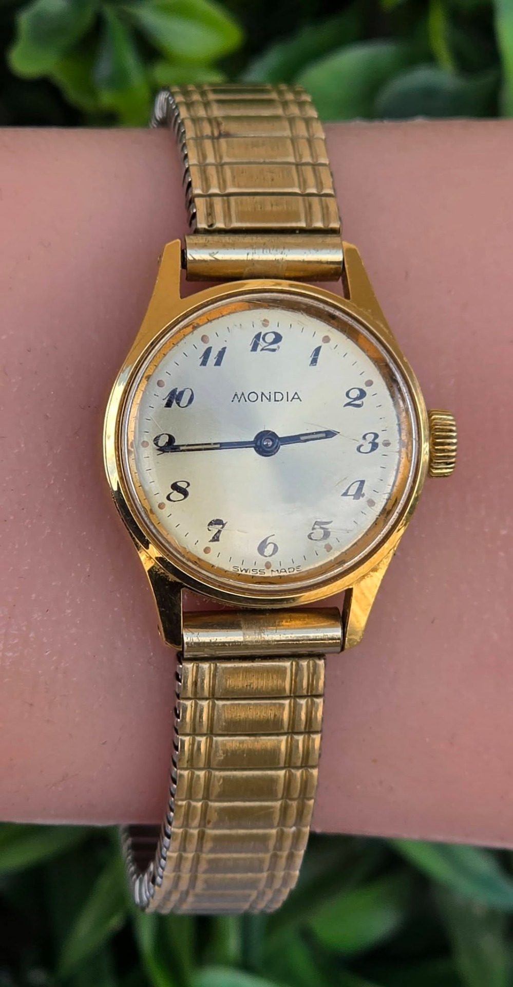 Ceas elvețian Mondia vintage, din metal aurit, cu mecanism cu armare manuală în stare de funcționare, 17 jewels, cu brățară extensibilă placată cu aur (anii 1960-1970, Elveția).