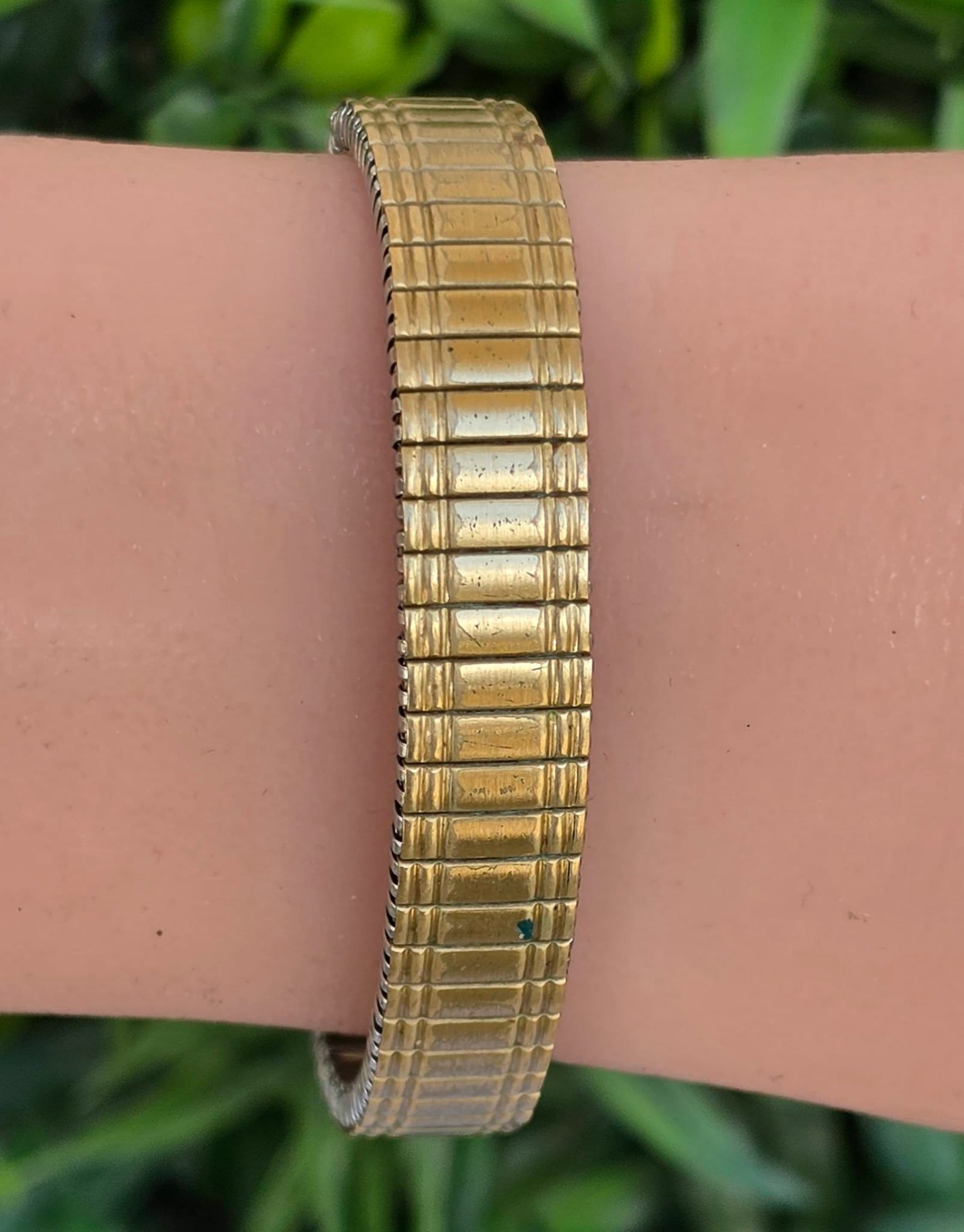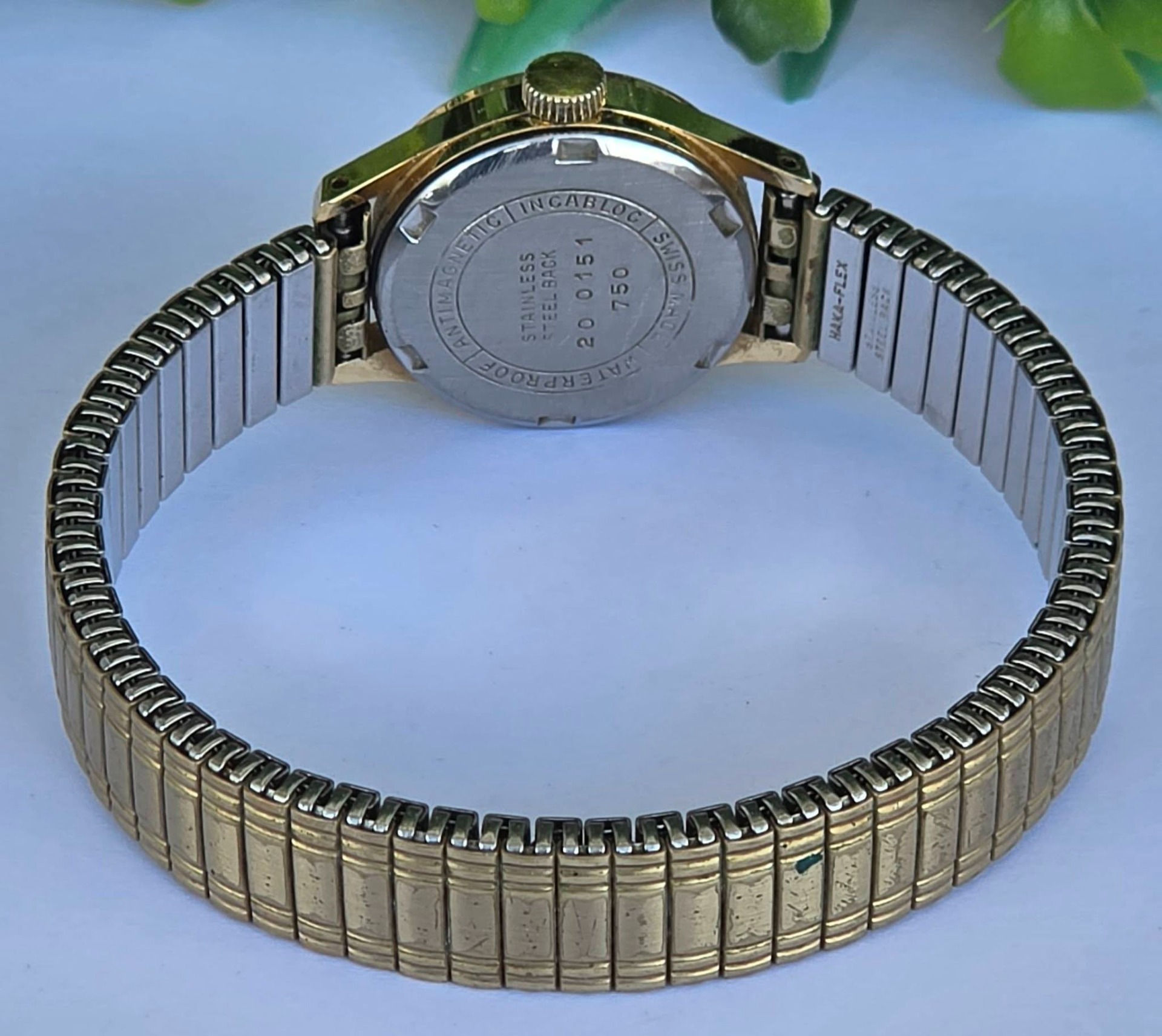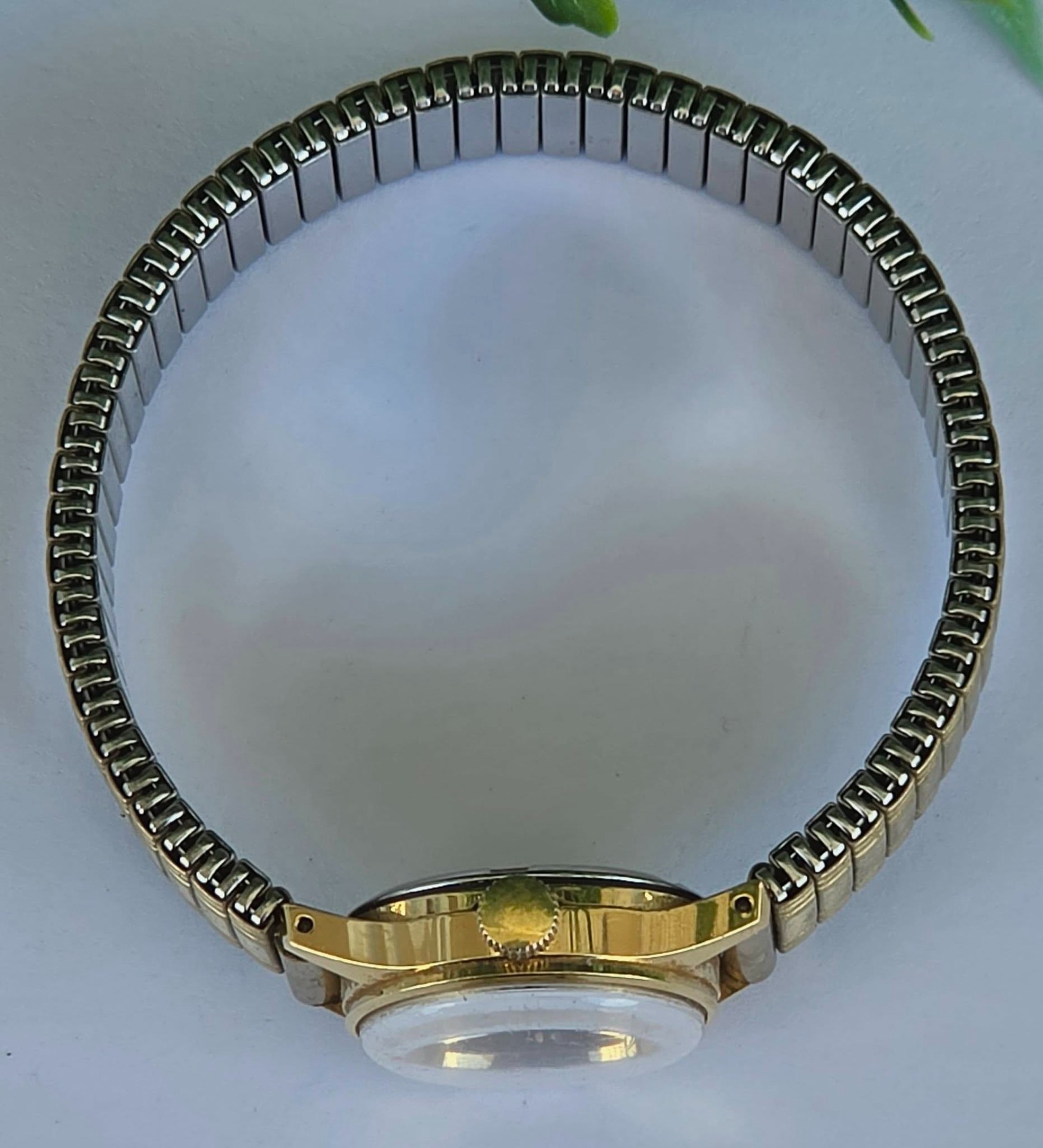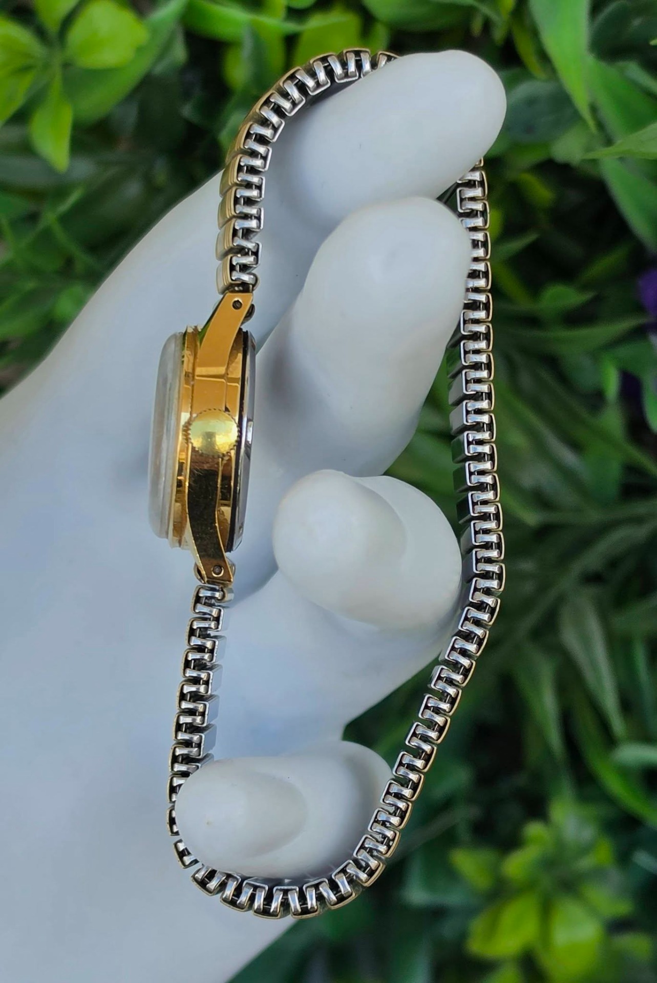 Ceas elvețian Mondia vintage, din metal aurit, cu mecanism cu armare manuală în stare de funcționare, 17 jewels, cu brățară extensibilă placată cu aur (anii 1960-1970, Elveția).
