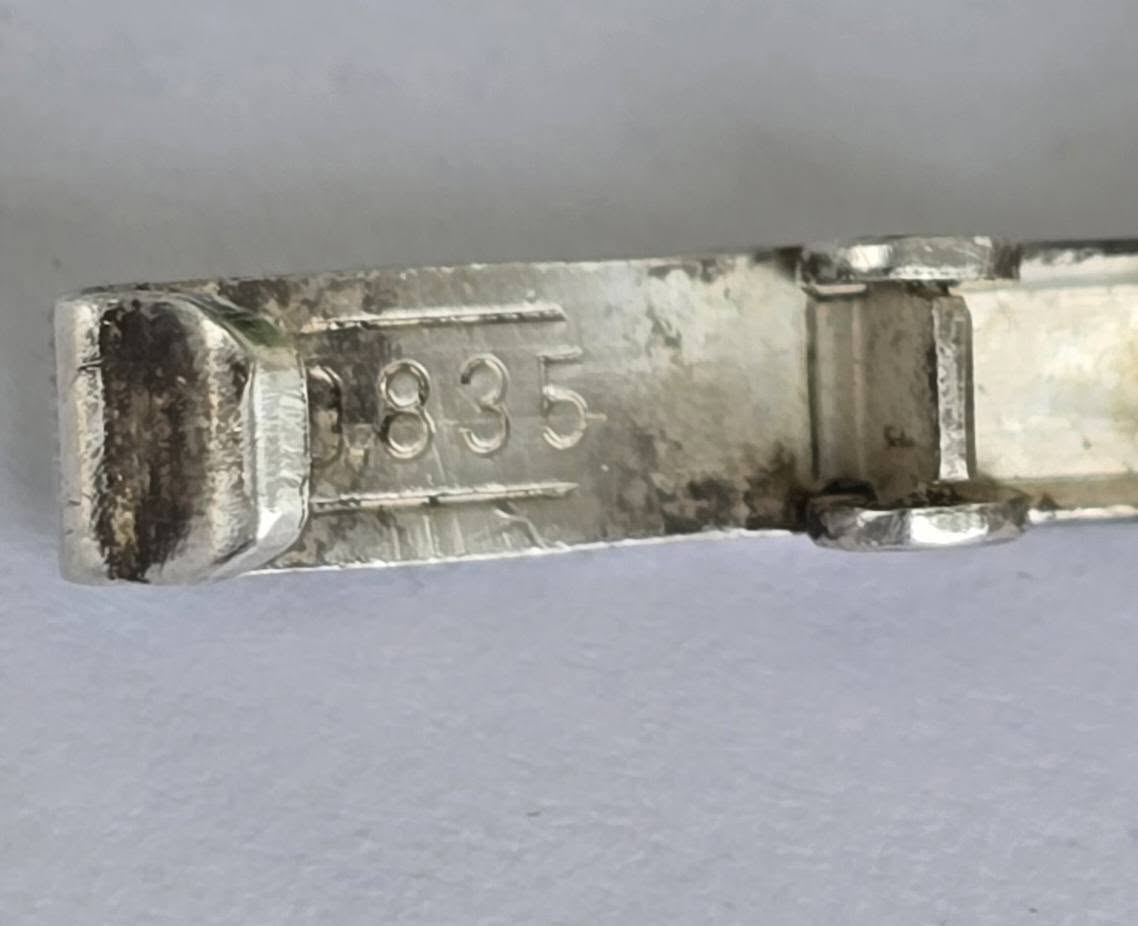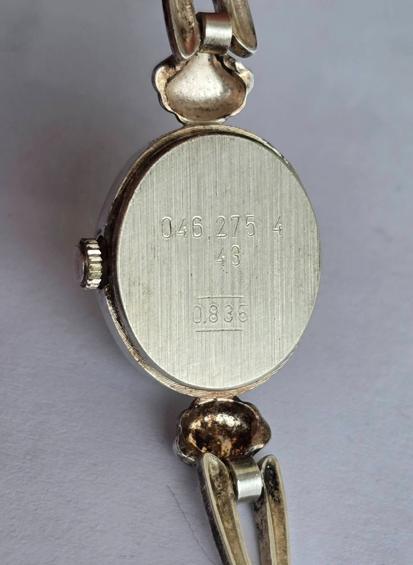 Prezintă marcaje de argint 835, atât ceasul cât și brățara și număr serial.