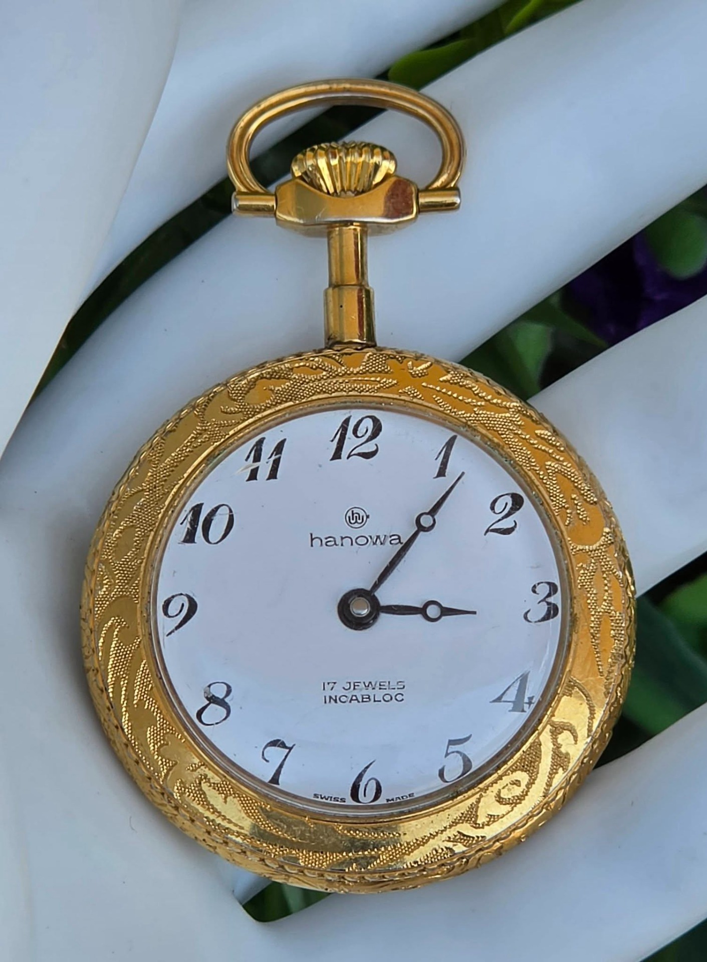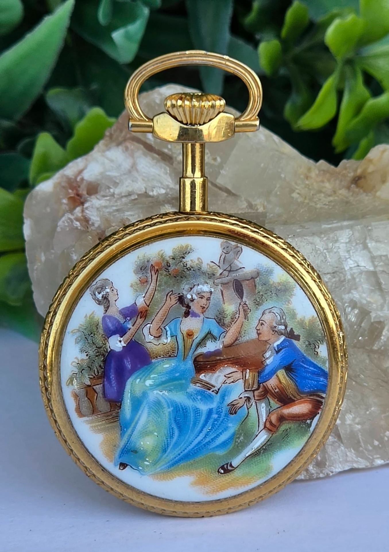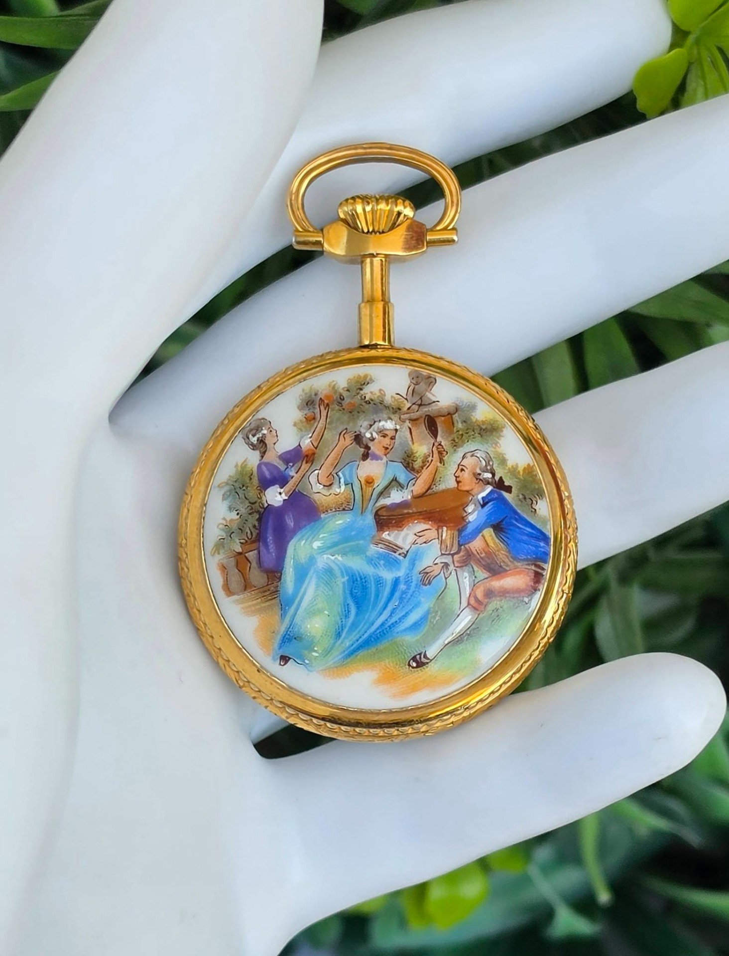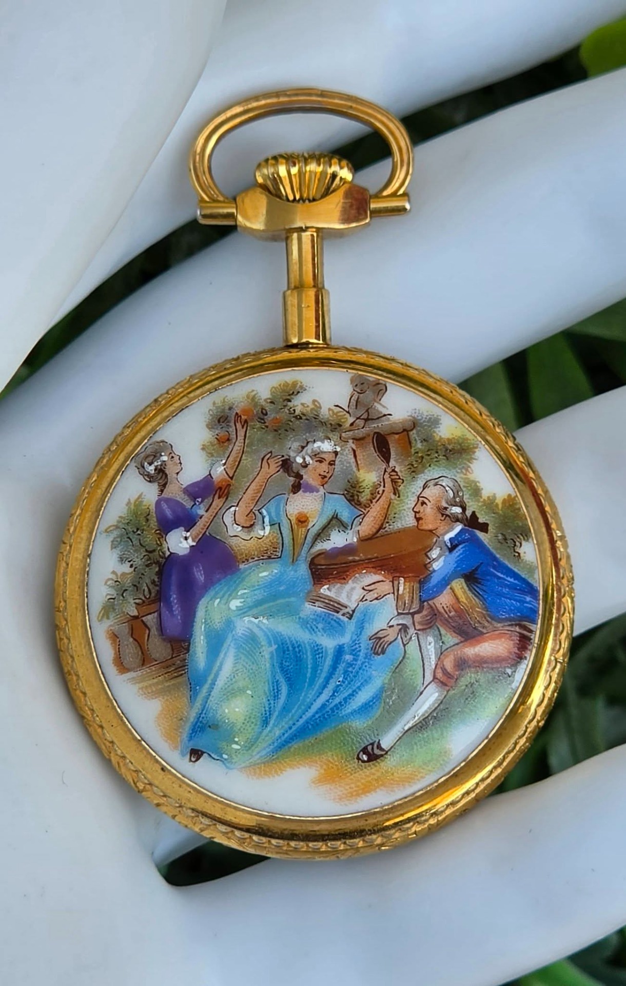 Ceas pandantiv/de buzunar elvețian Hanowa, din metal aurit, cu email pictat cu scenă galantă de tip Fragonard în stil Rococo, mecanism elvețian autentic, cu întoarcere manuală, 17 Jewels, în stare de funcționare, cu cadran alb imaculat, cu cifre arabe stilizate și indicatori "Breguet".