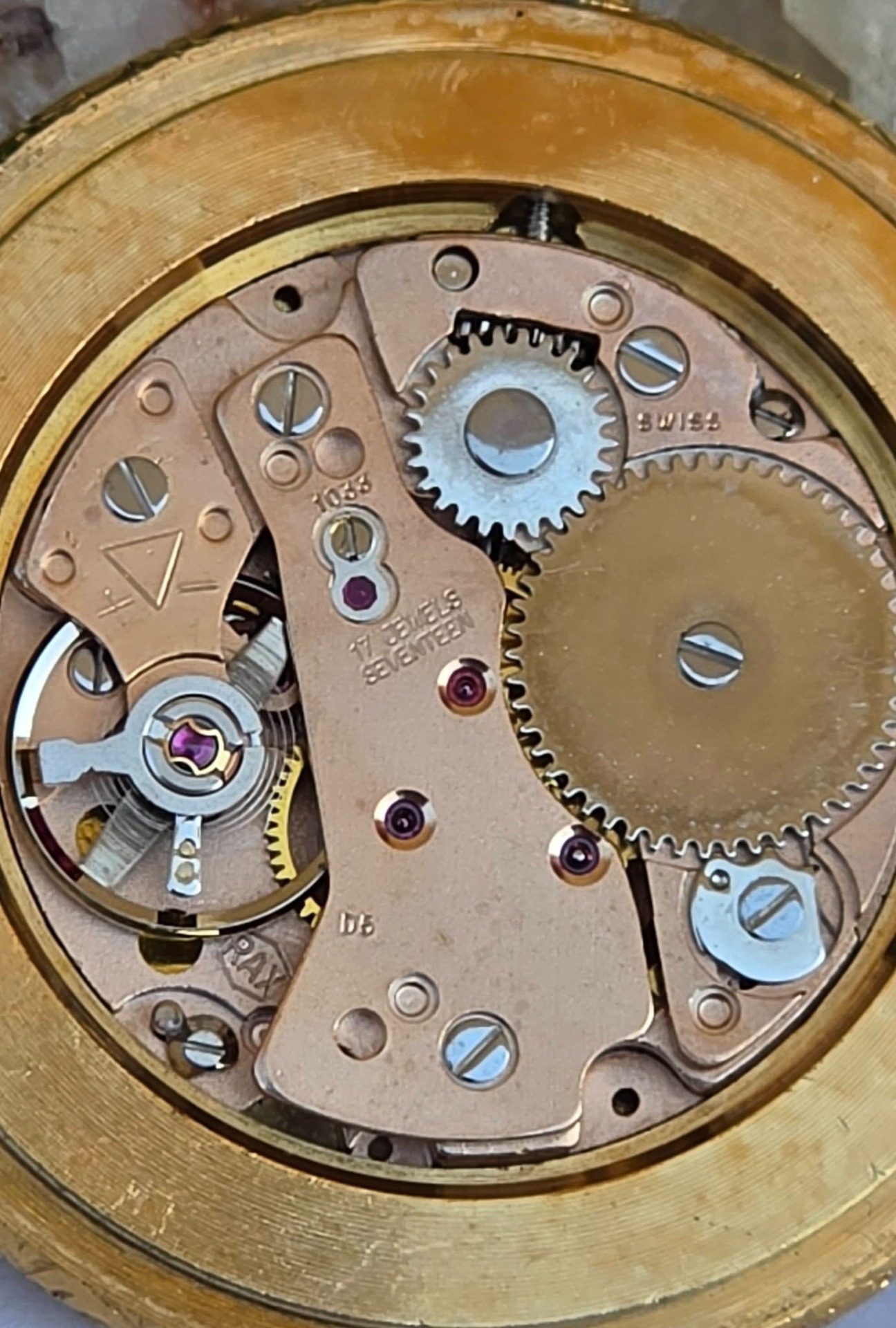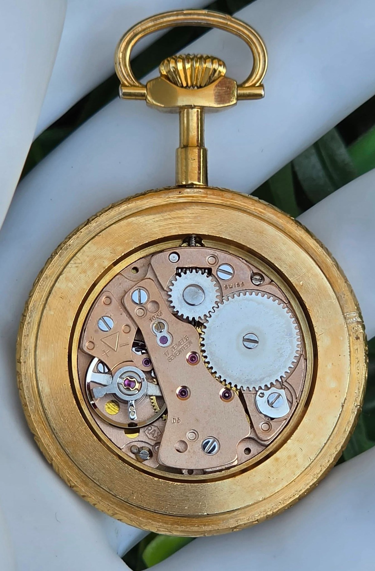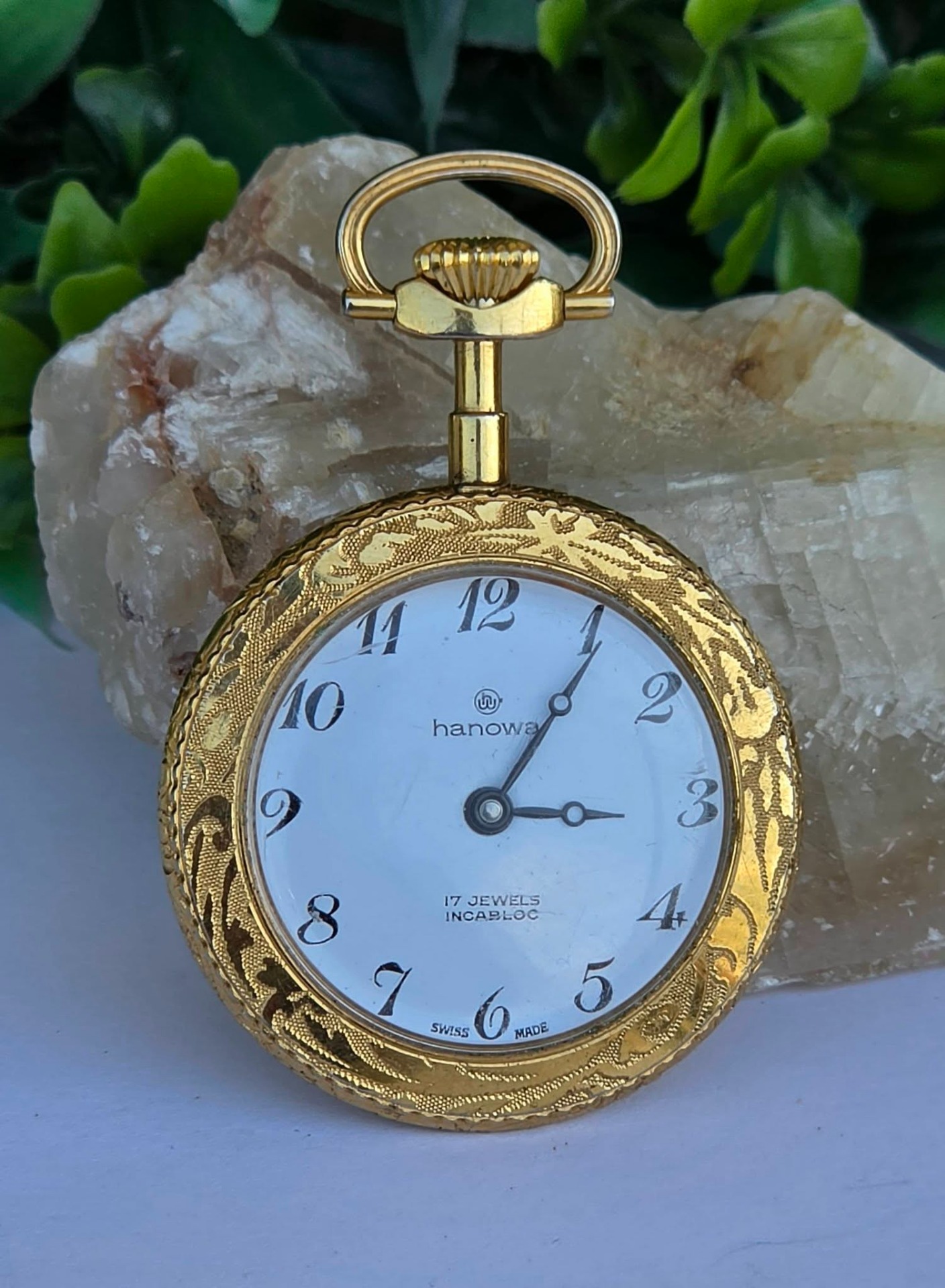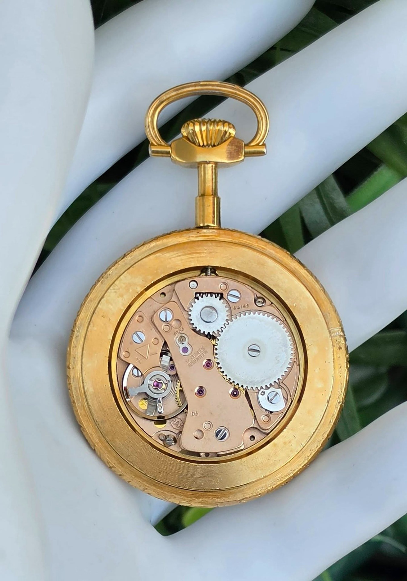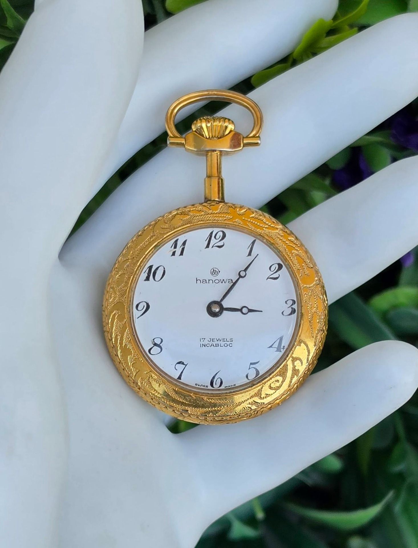 Ceas pandantiv/de buzunar elvețian Hanowa, din metal aurit, cu email pictat cu scenă galantă de tip Fragonard în stil Rococo, mecanism elvețian autentic, cu întoarcere manuală, 17 Jewels, în stare de funcționare, cu cadran alb imaculat, cu cifre arabe stilizate și indicatori "Breguet".