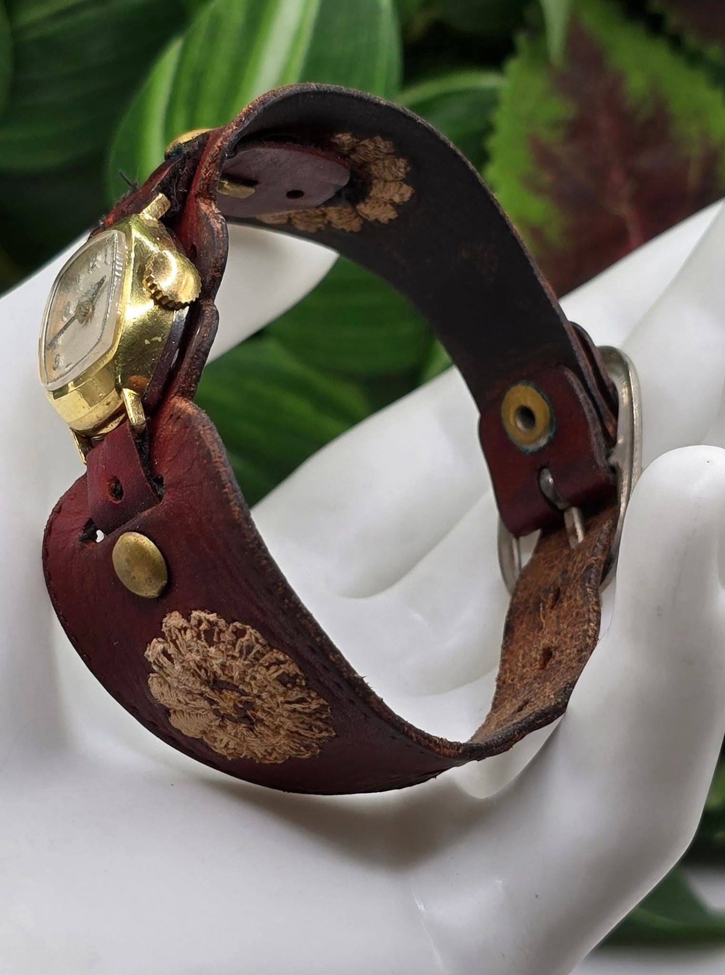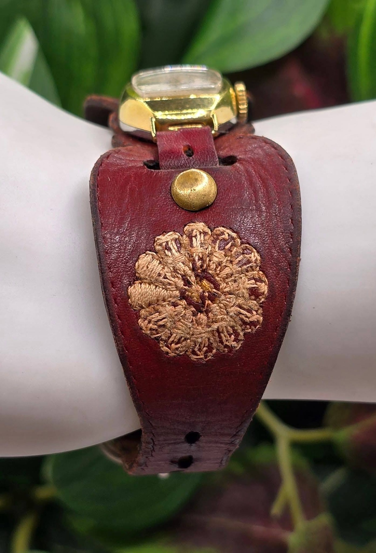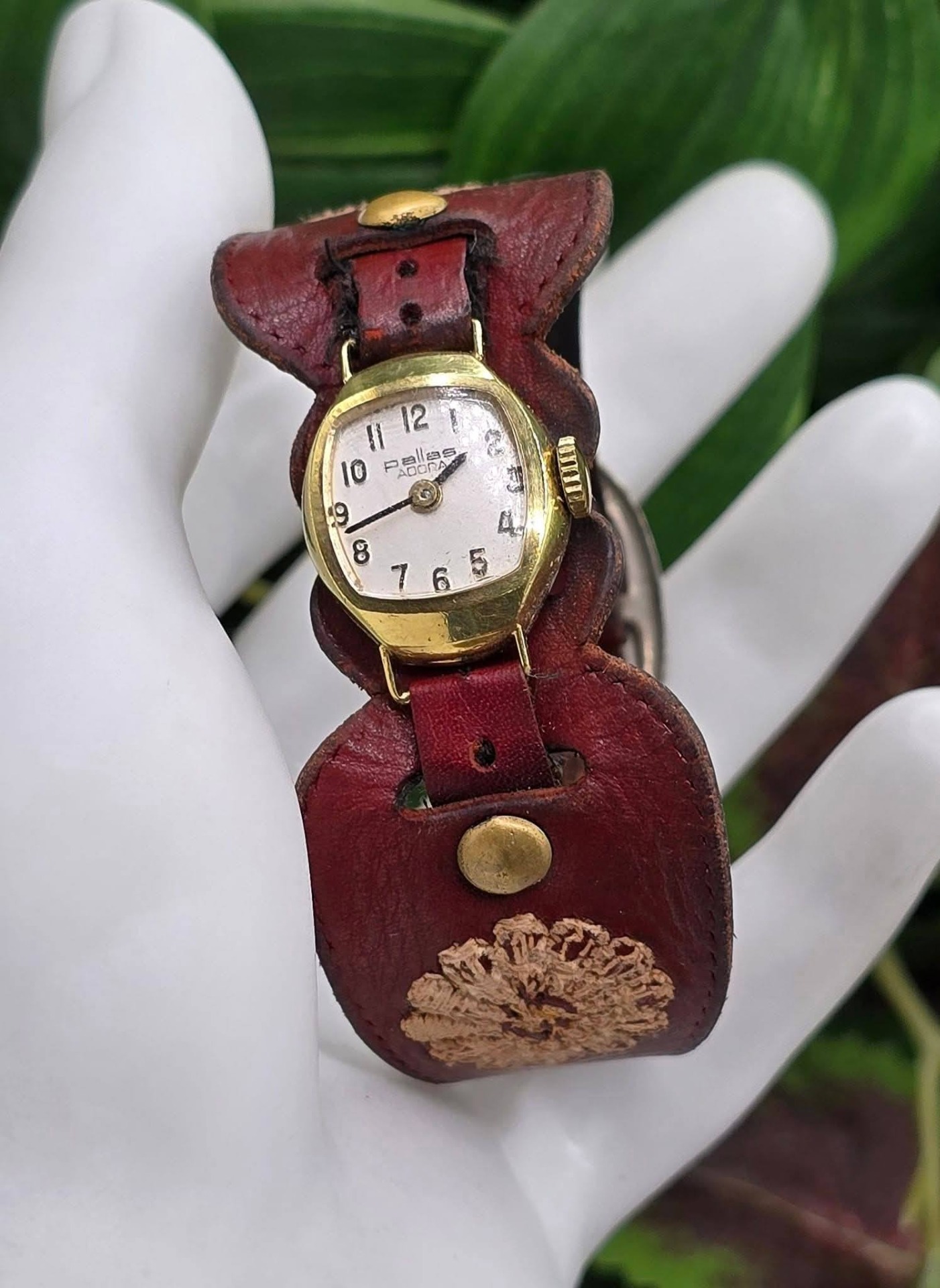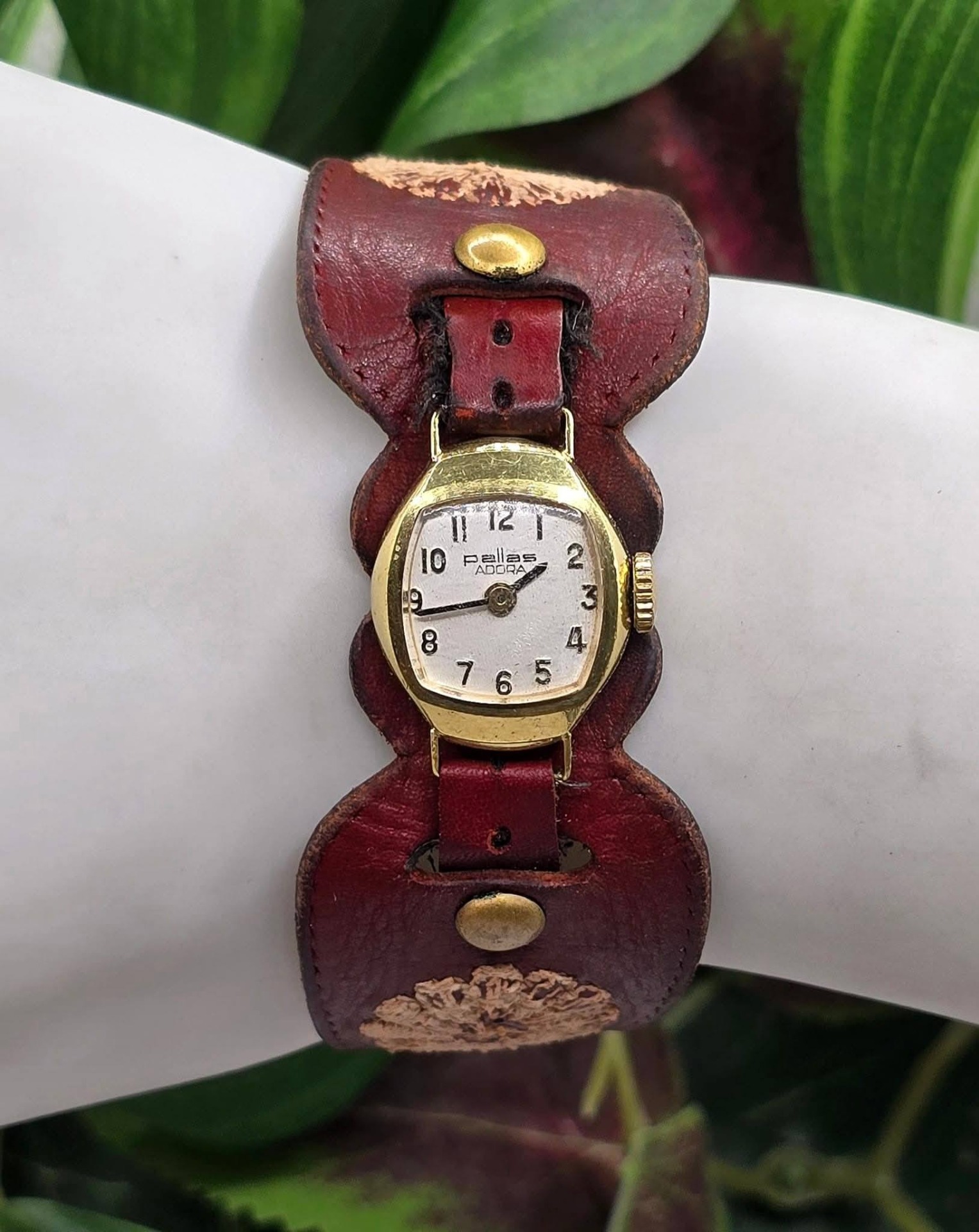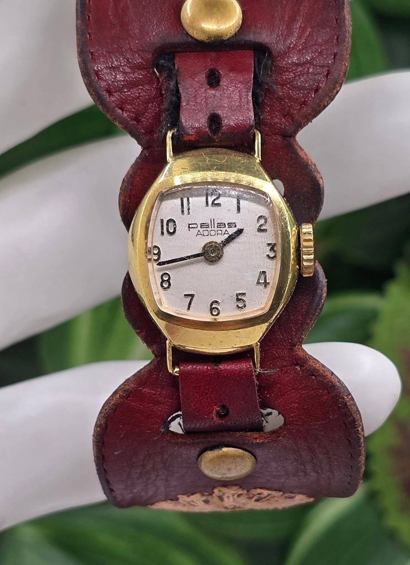 Ceas vintage de damă Pallas Adora, mecanic, în stare de funcționare, curea brodată din piele (anii 1960, Germania).