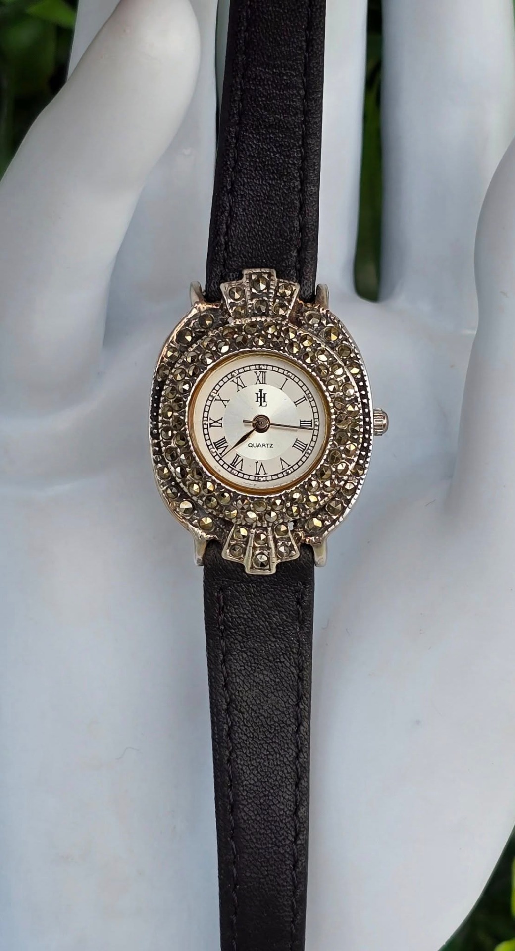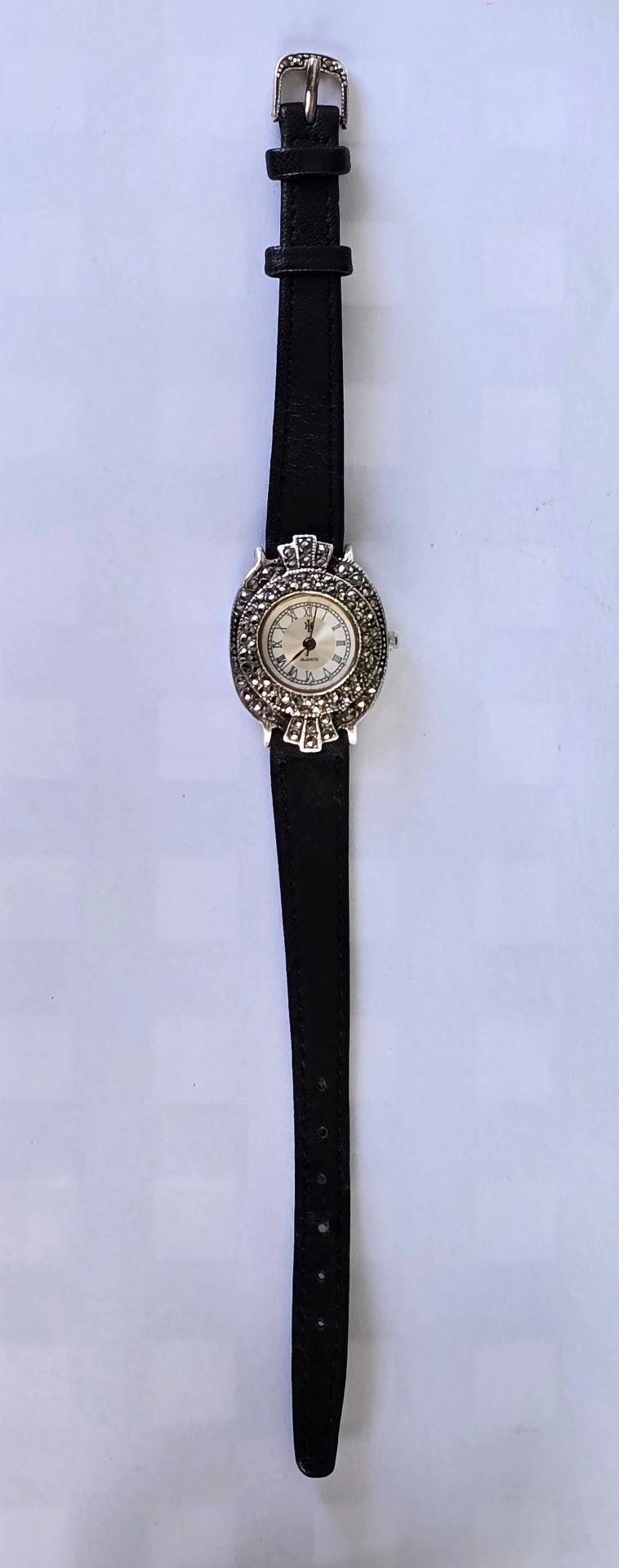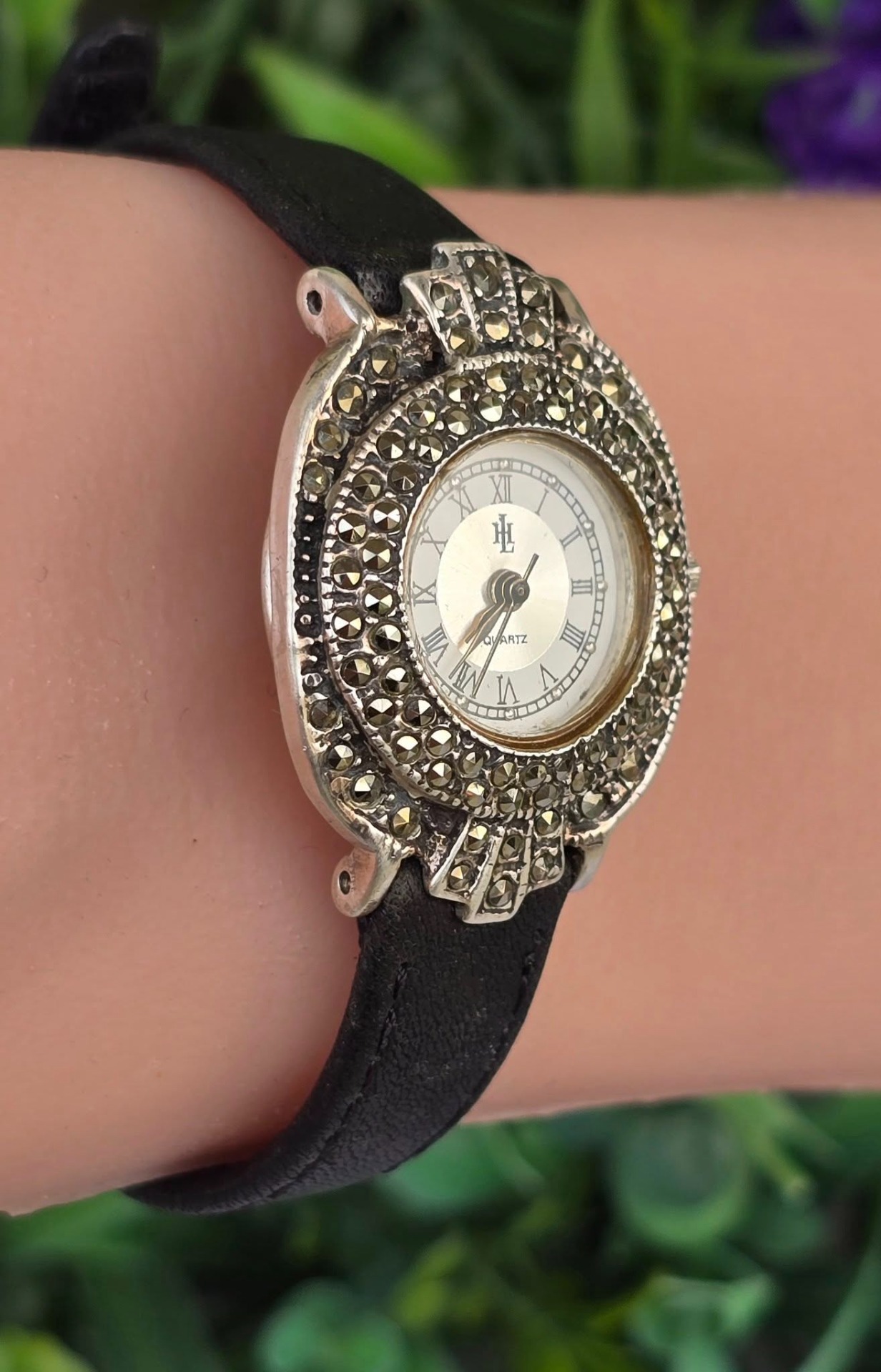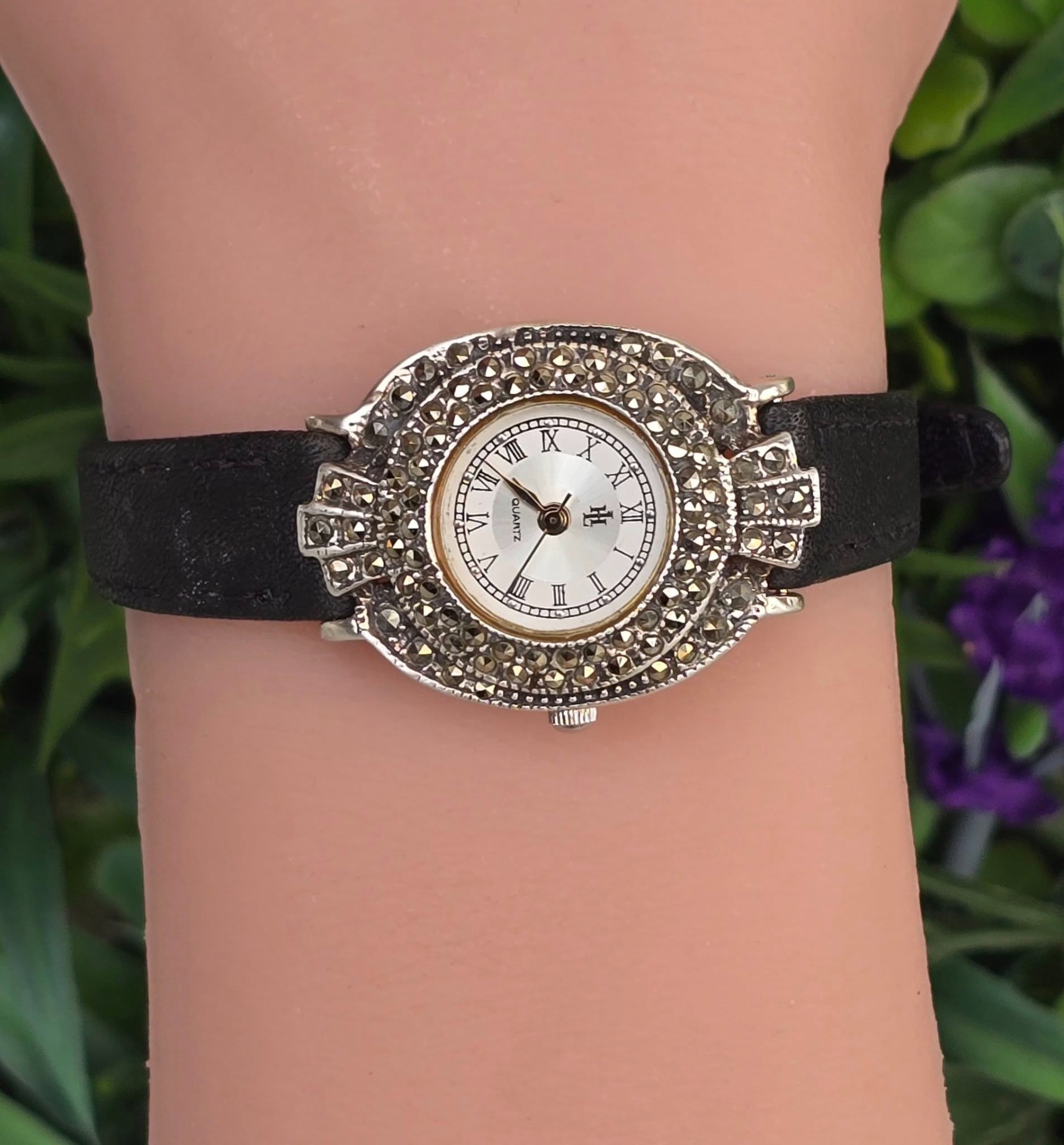 Ceas vintage din argint, cu marcasite, cu design în stil Art Deco, cu mecanism quartz în stare de funcționare și curea din piele (anii 1980-1990, Germania).