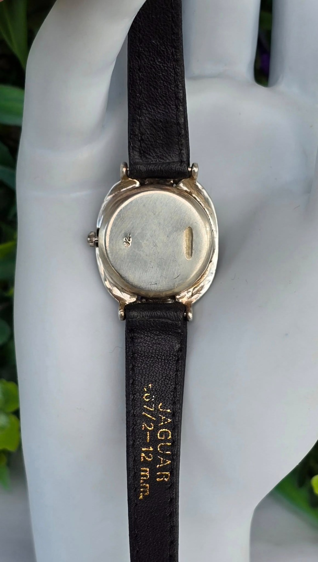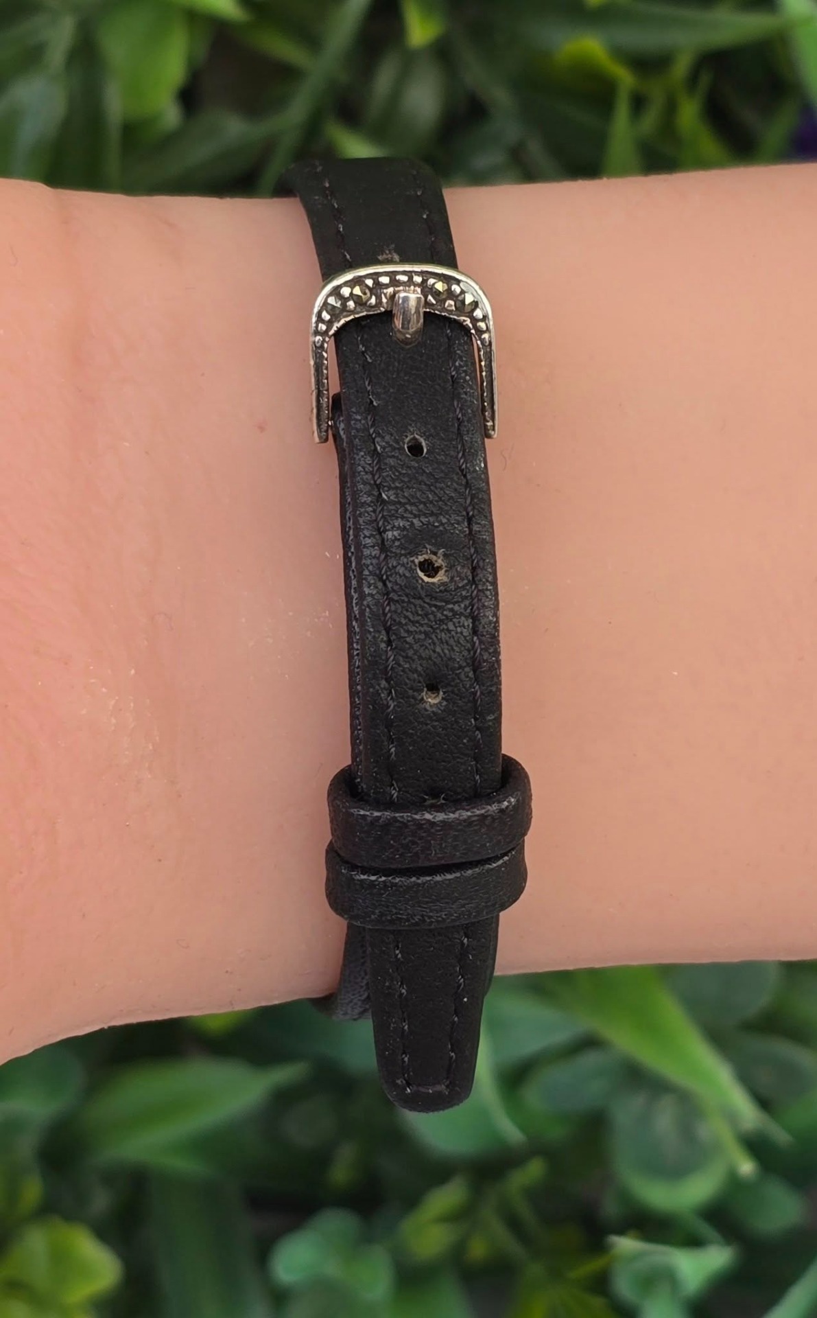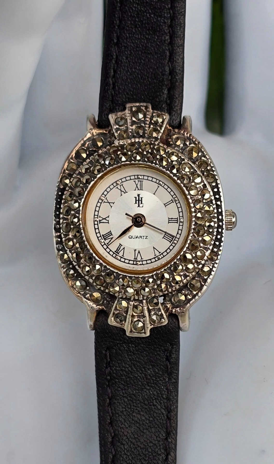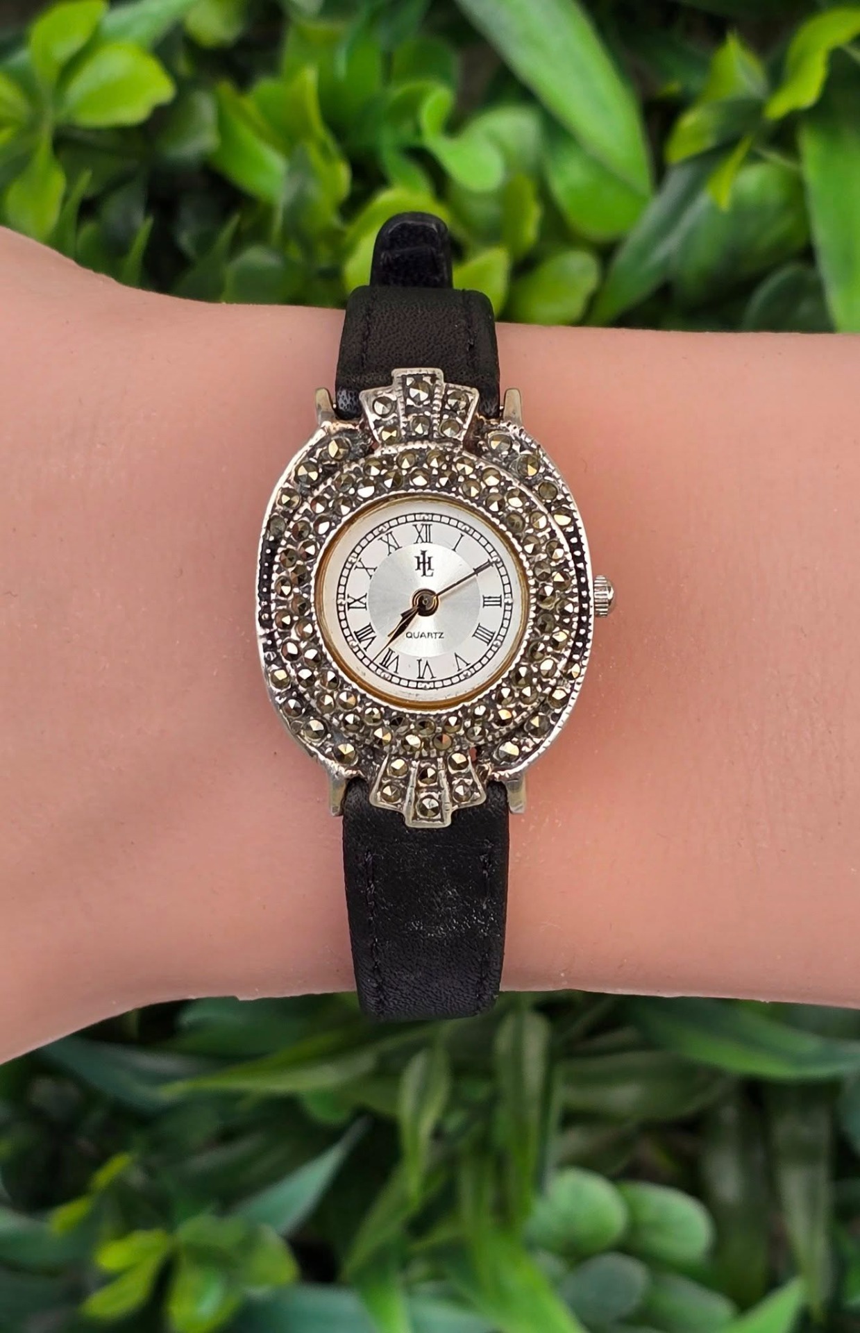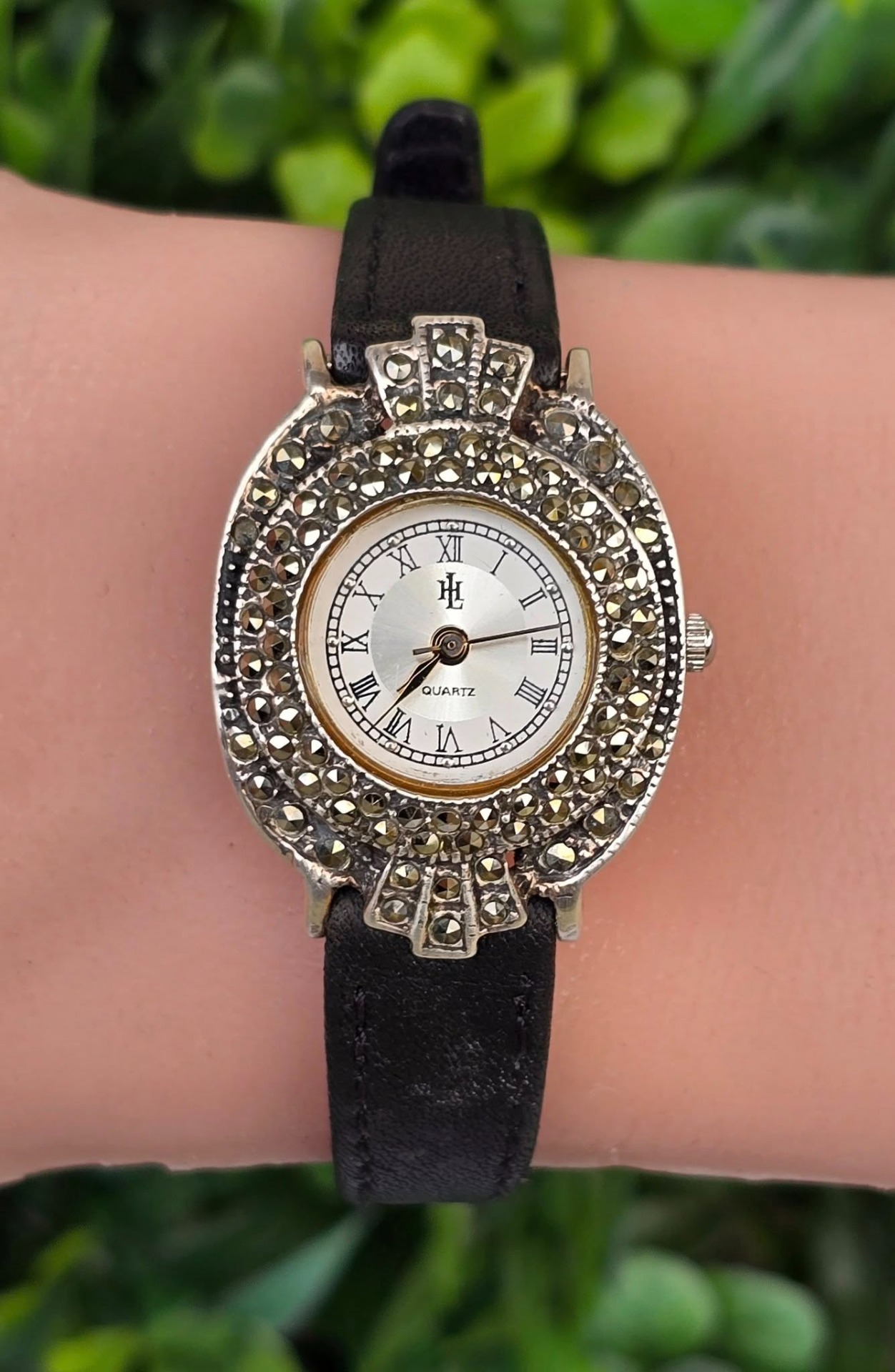 Ceas vintage din argint, cu marcasite, cu design în stil Art Deco, cu mecanism quartz în stare de funcționare și curea din piele (anii 1980-1990, Germania).