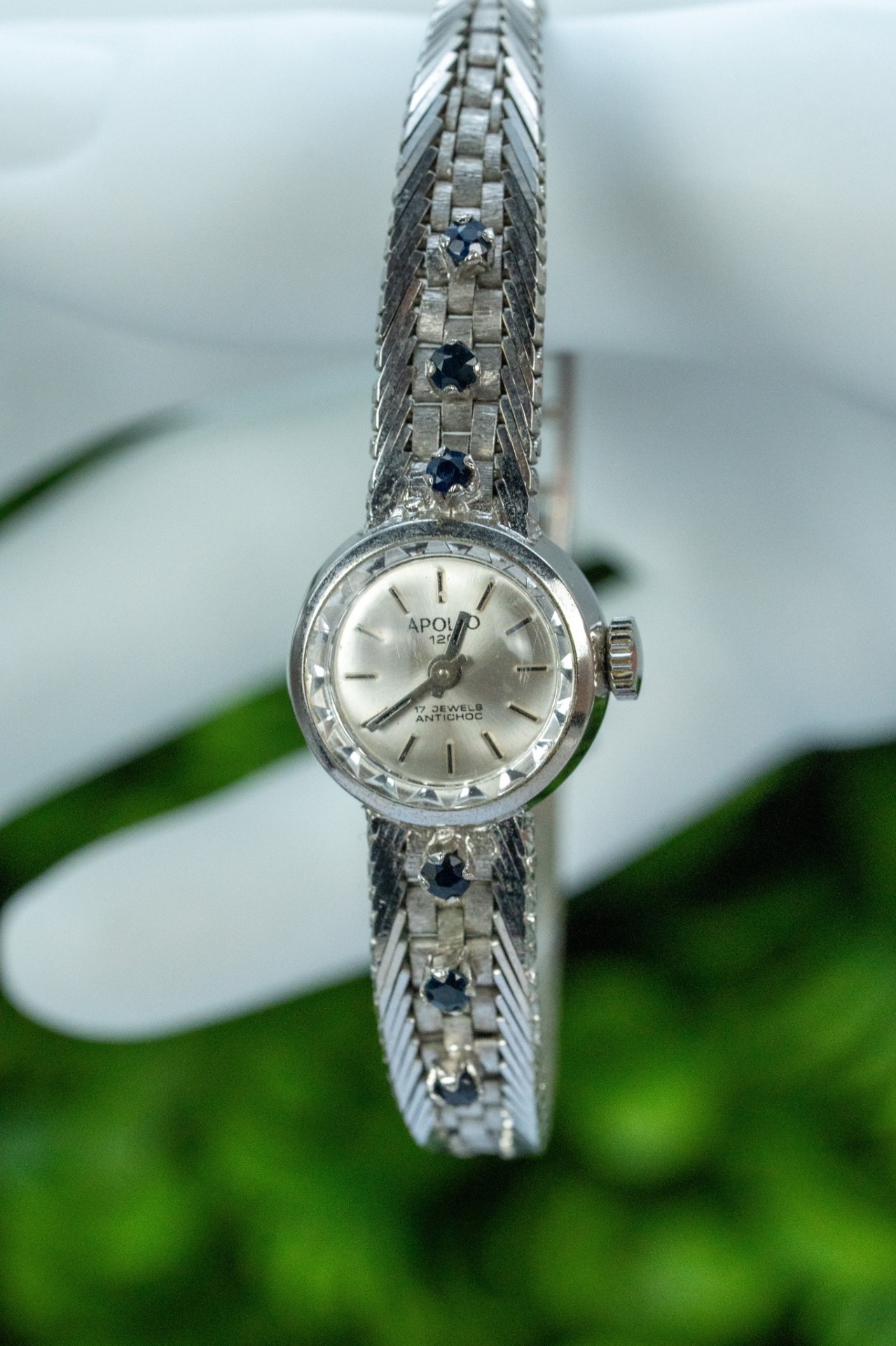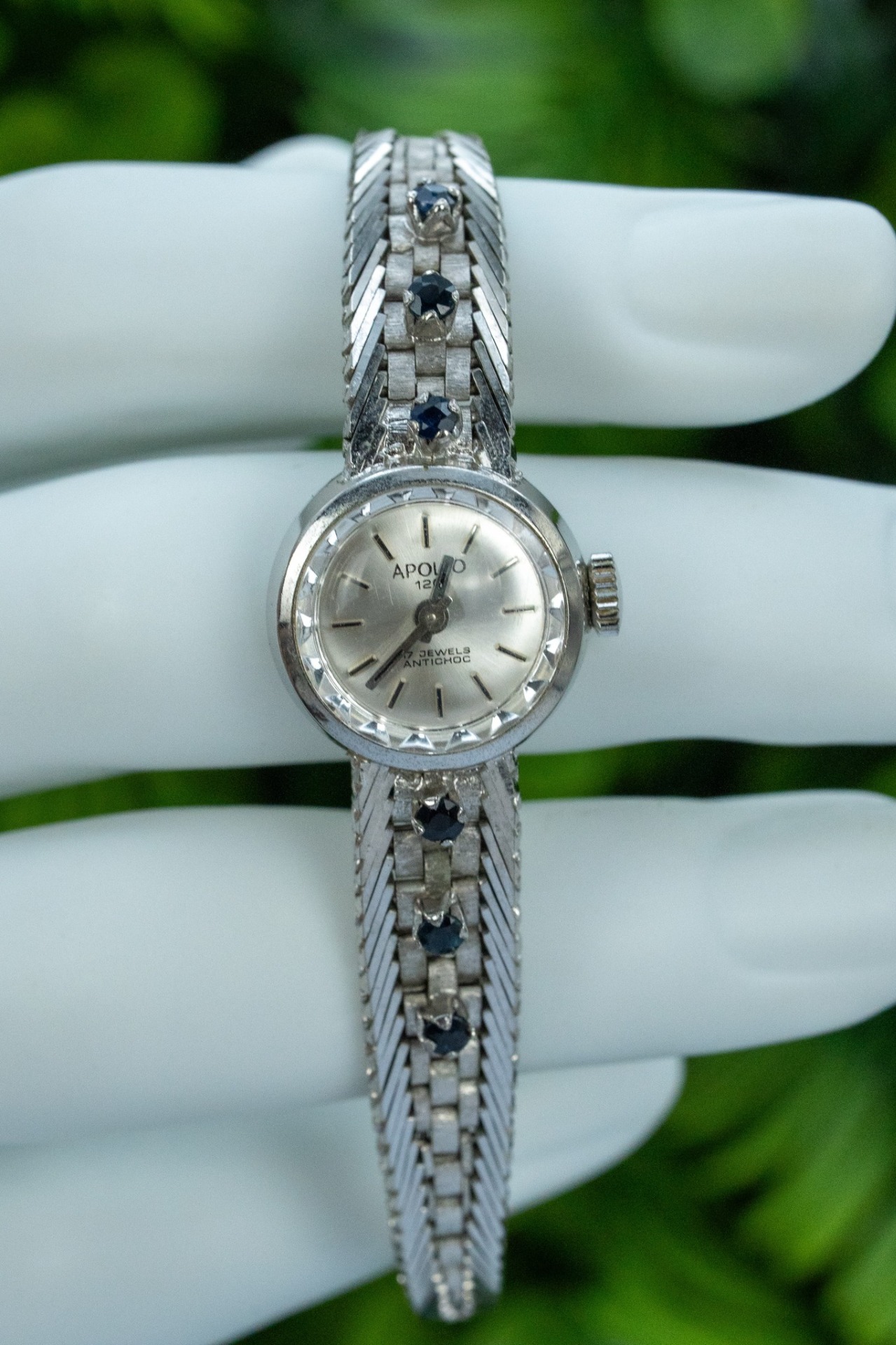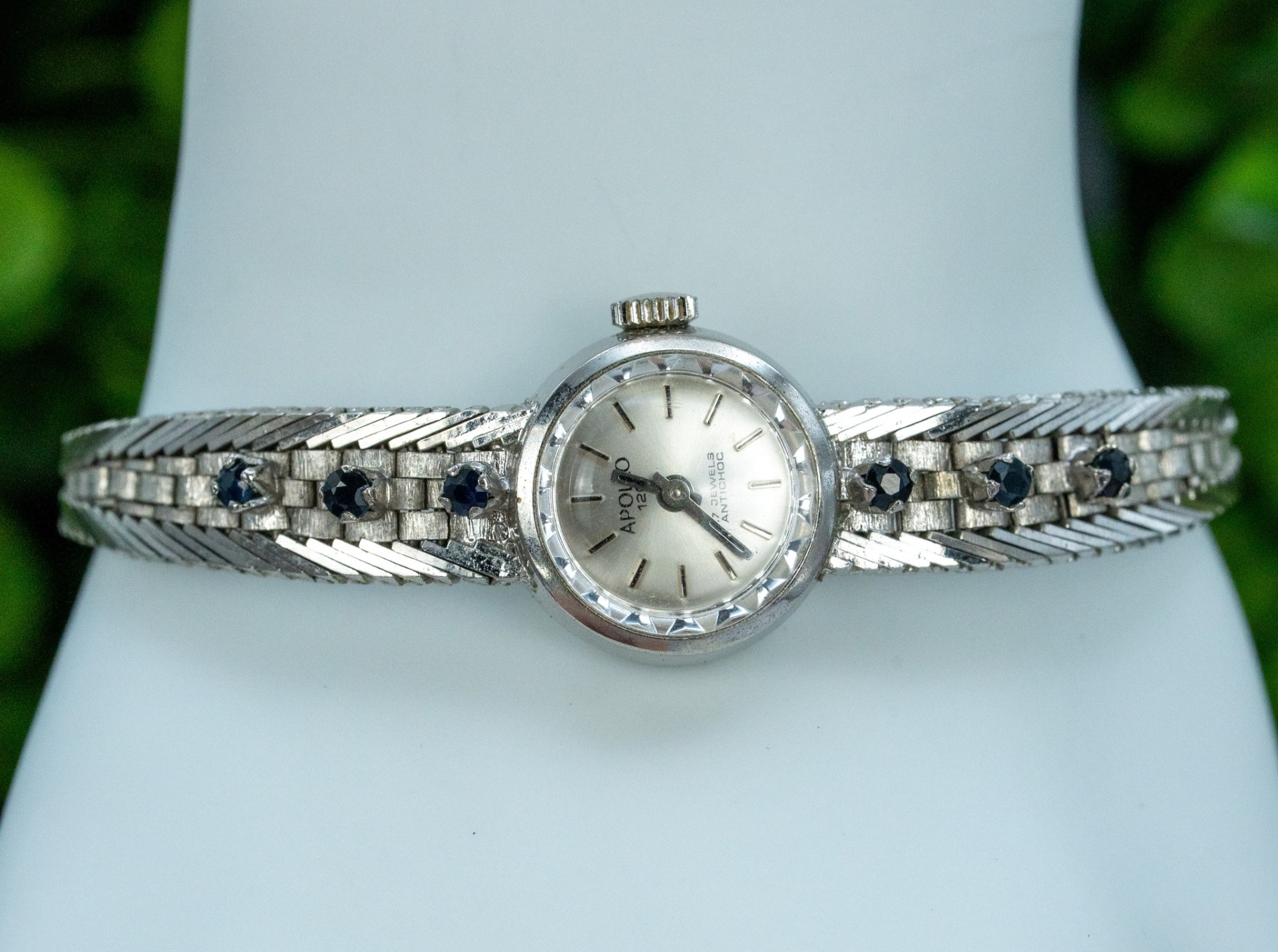 Ceas vintage, din argint rodiat, cu 6 safire naturale, elegant, de colecție, mecanism cu armare manuală, 17 jewels, în stare de funcționare (anii 1960, Germania).