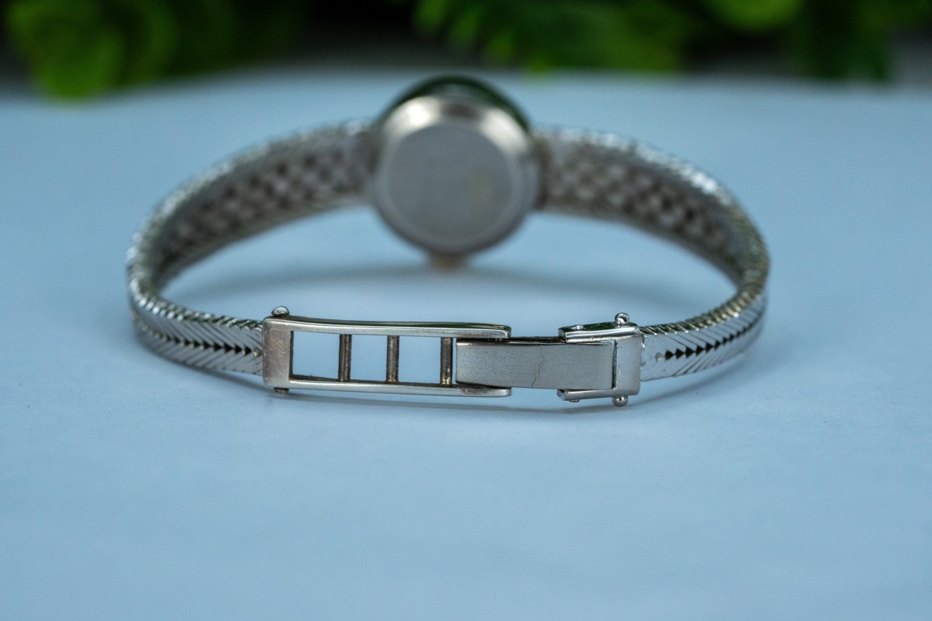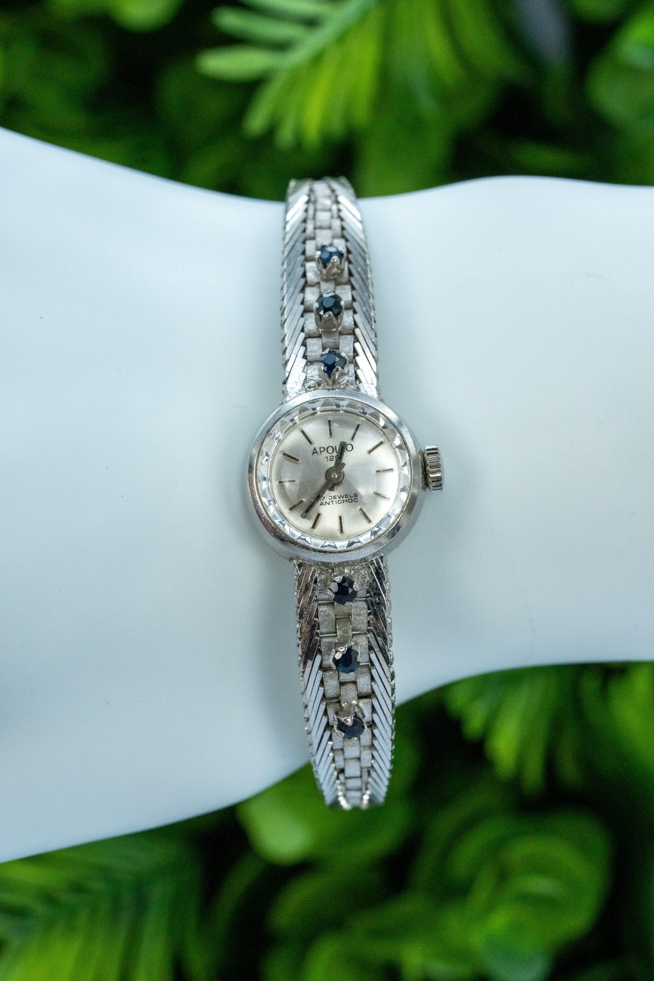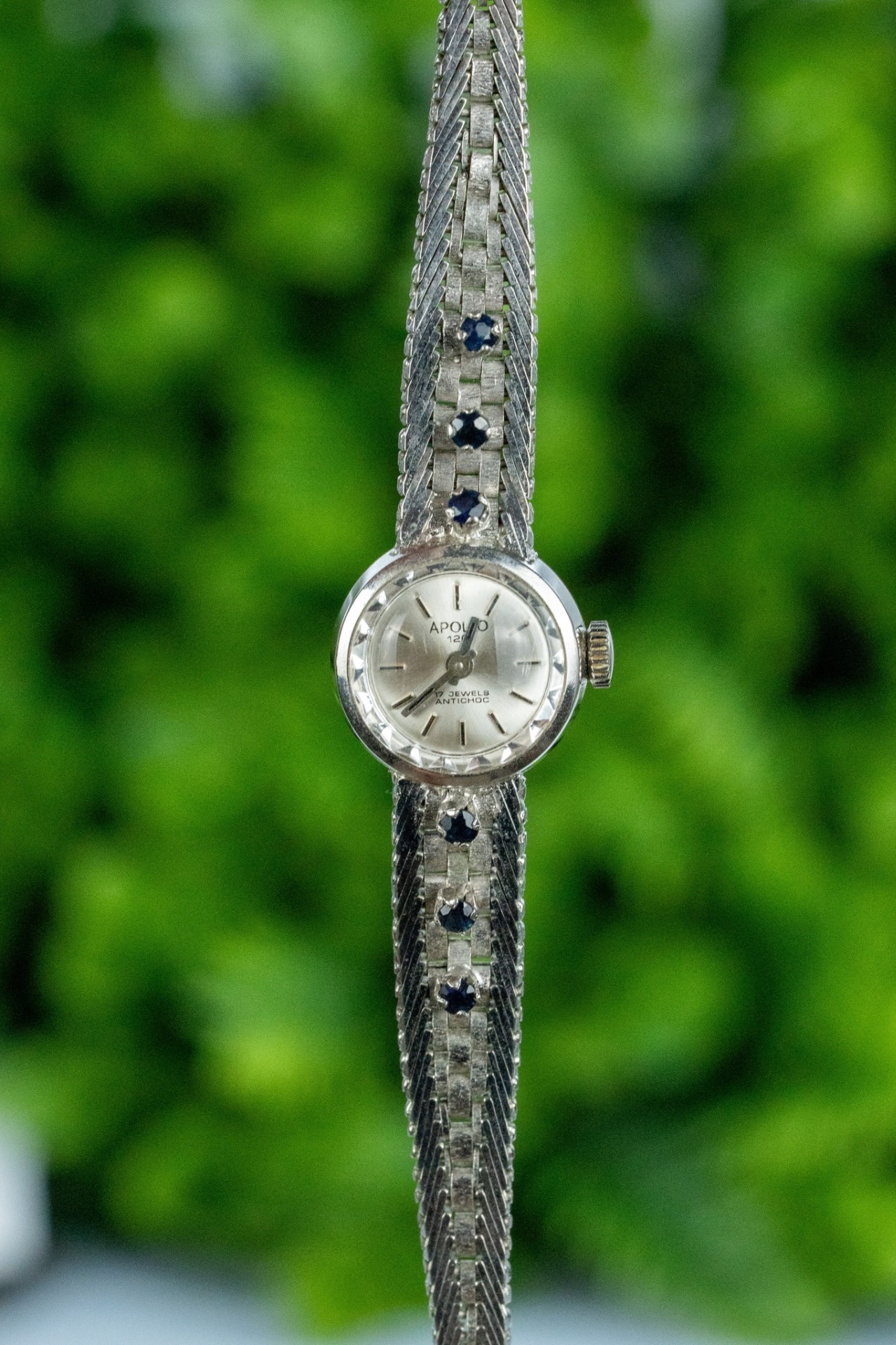 Ceas vintage, din argint rodiat, cu 6 safire naturale, elegant, de colecție, mecanism cu armare manuală, 17 jewels, în stare de funcționare (anii 1960, Germania).