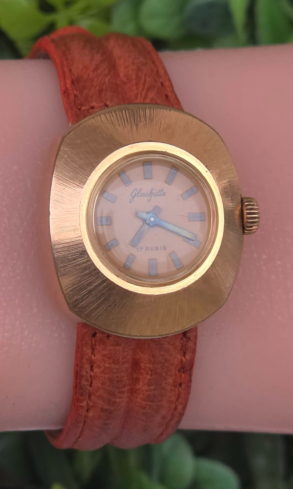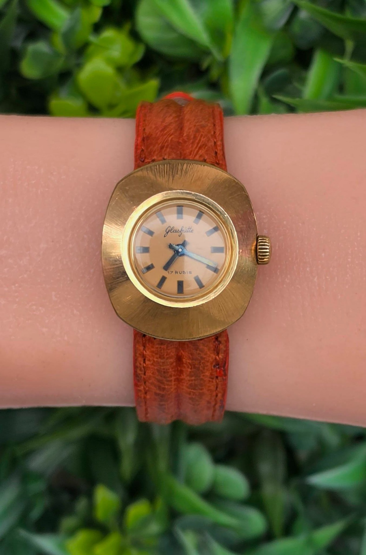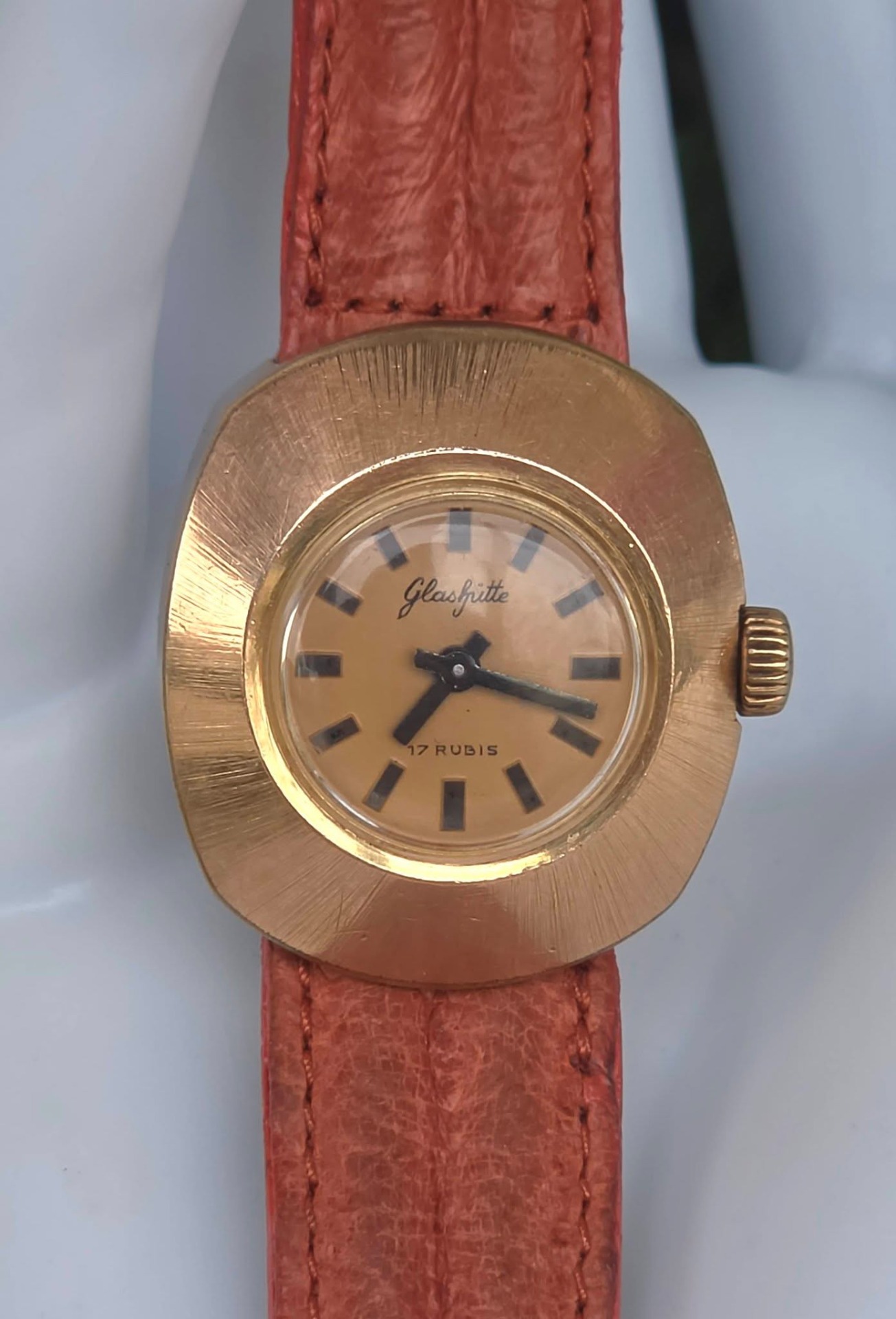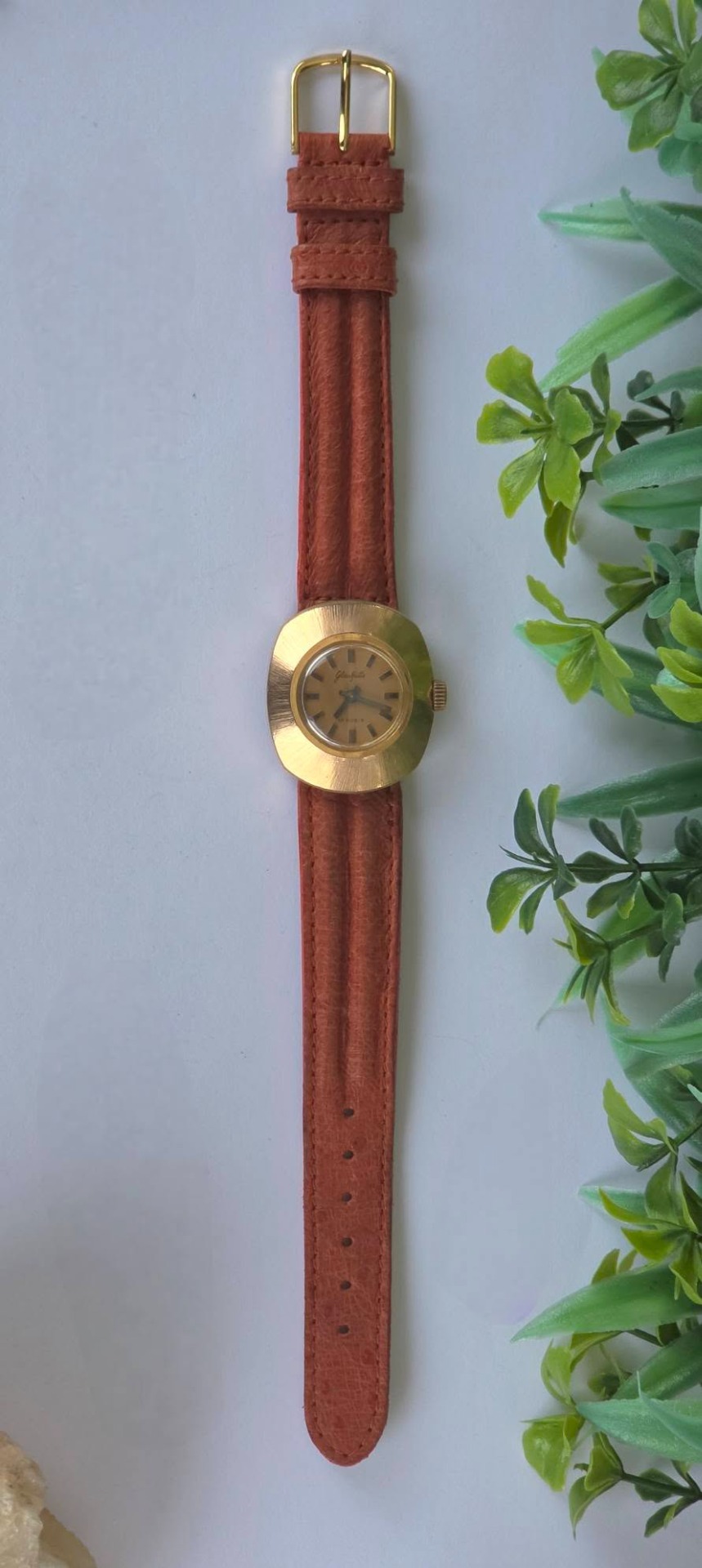 Ceas vintage Glashütte est-german, de damă, cu design "retro-chic", din oțel placat cu aur, cu mecanism cu armare manuală, 17 jewels, funcțional, cu curea impecabilă din piele.