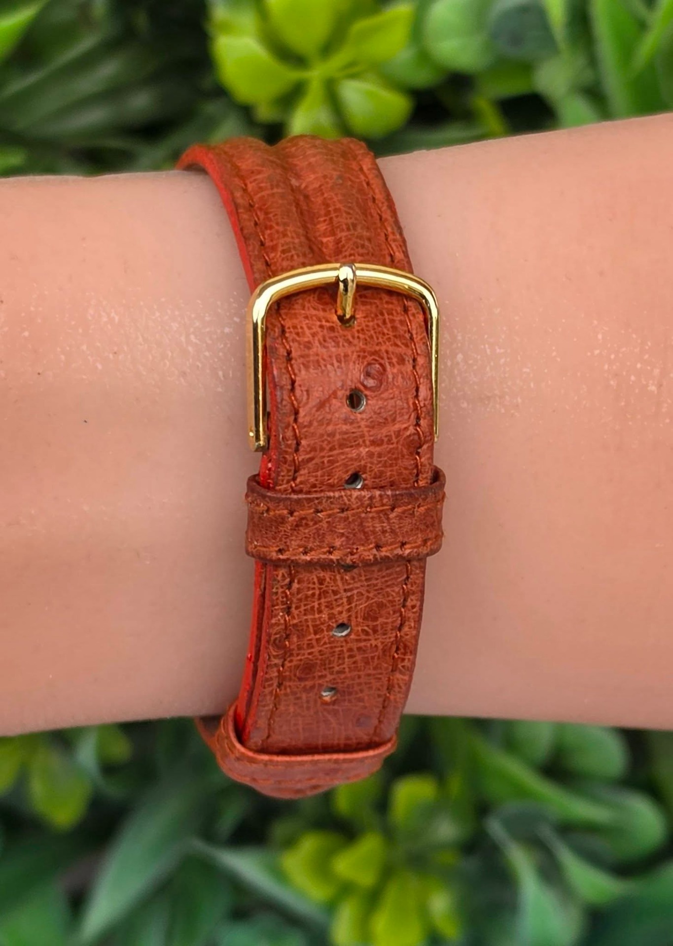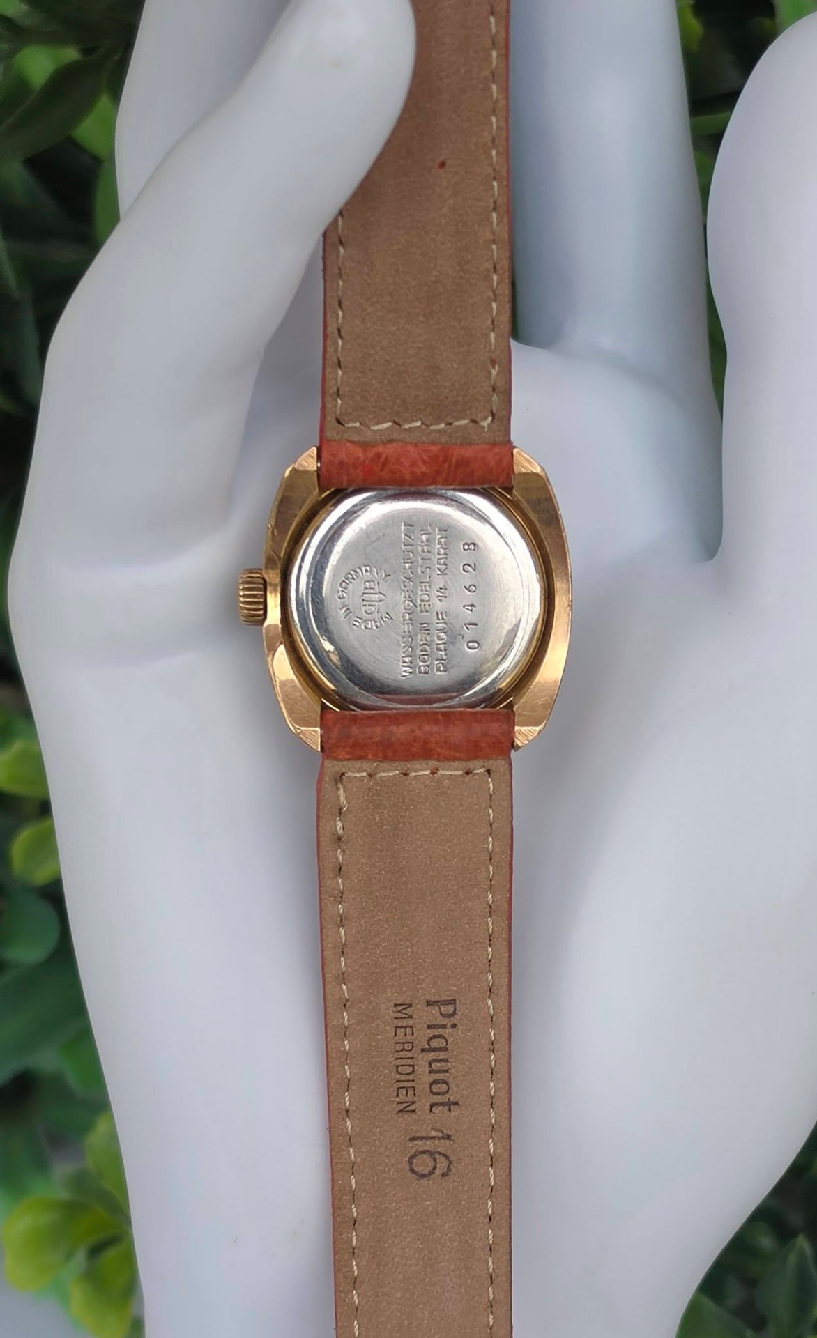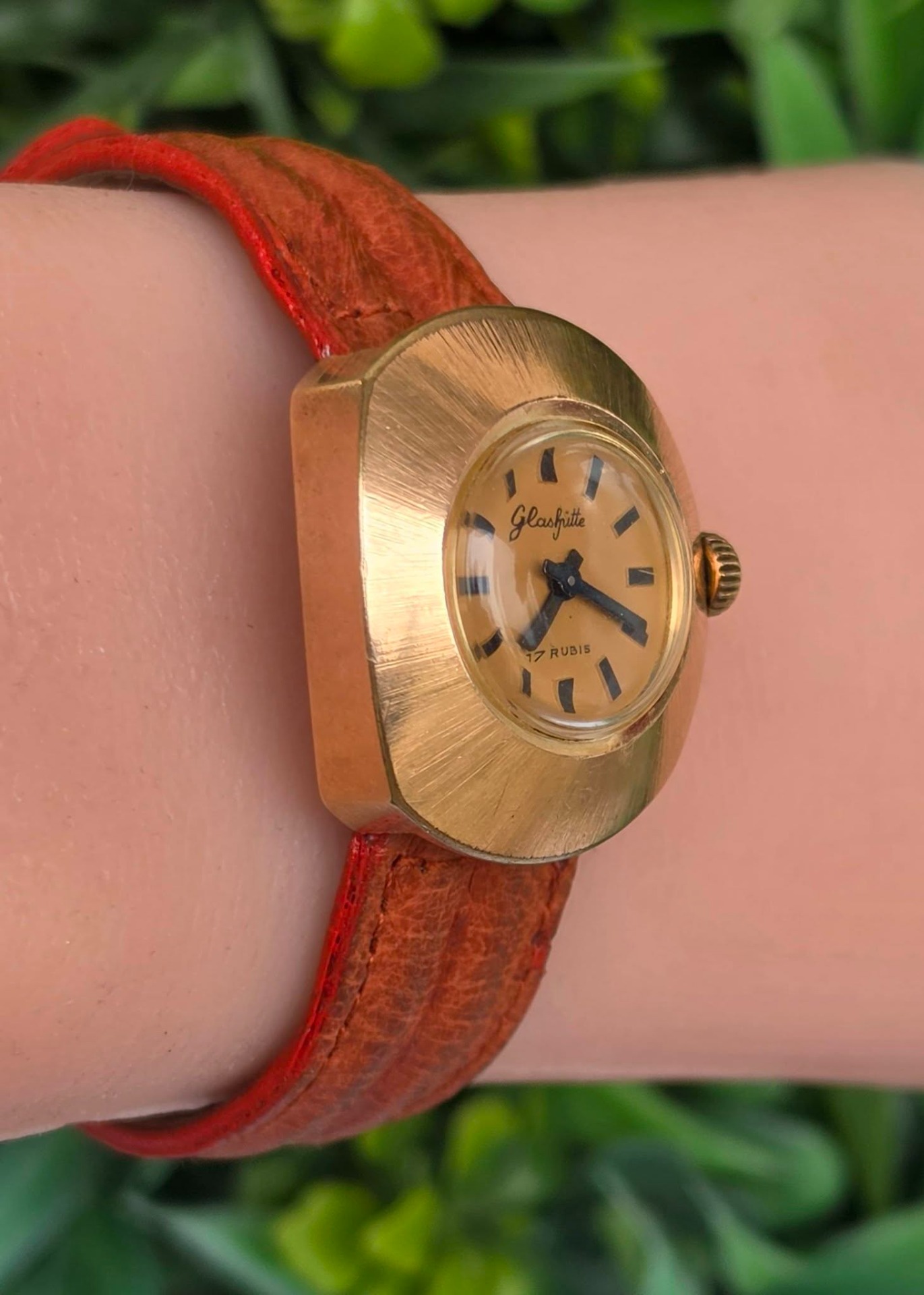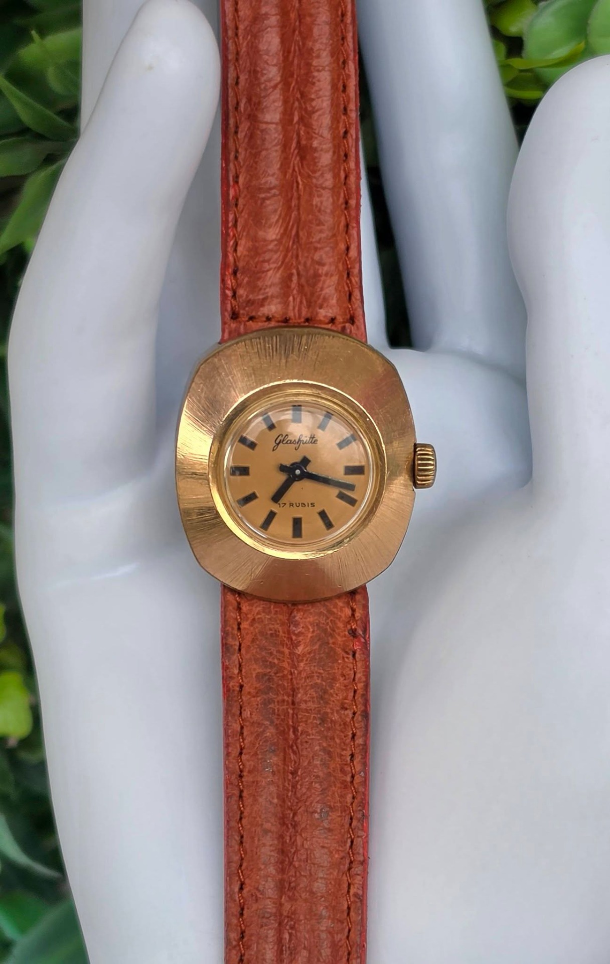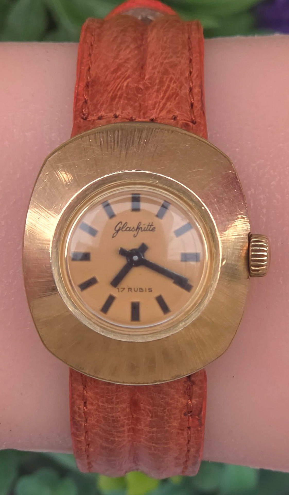 Ceas vintage Glashütte est-german, de damă, cu design "retro-chic", din oțel placat cu aur, cu mecanism cu armare manuală, 17 jewels, funcțional, cu curea impecabilă din piele.