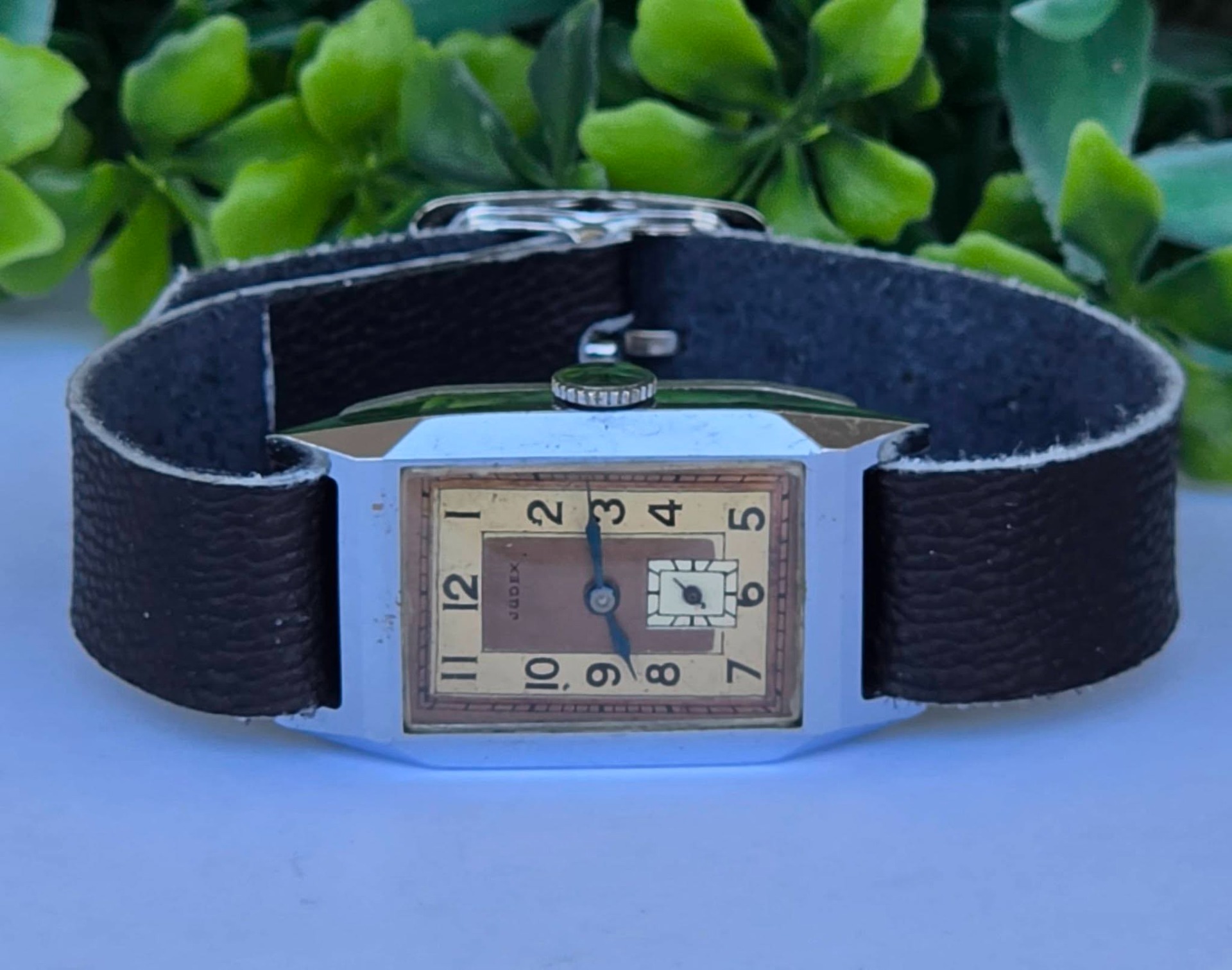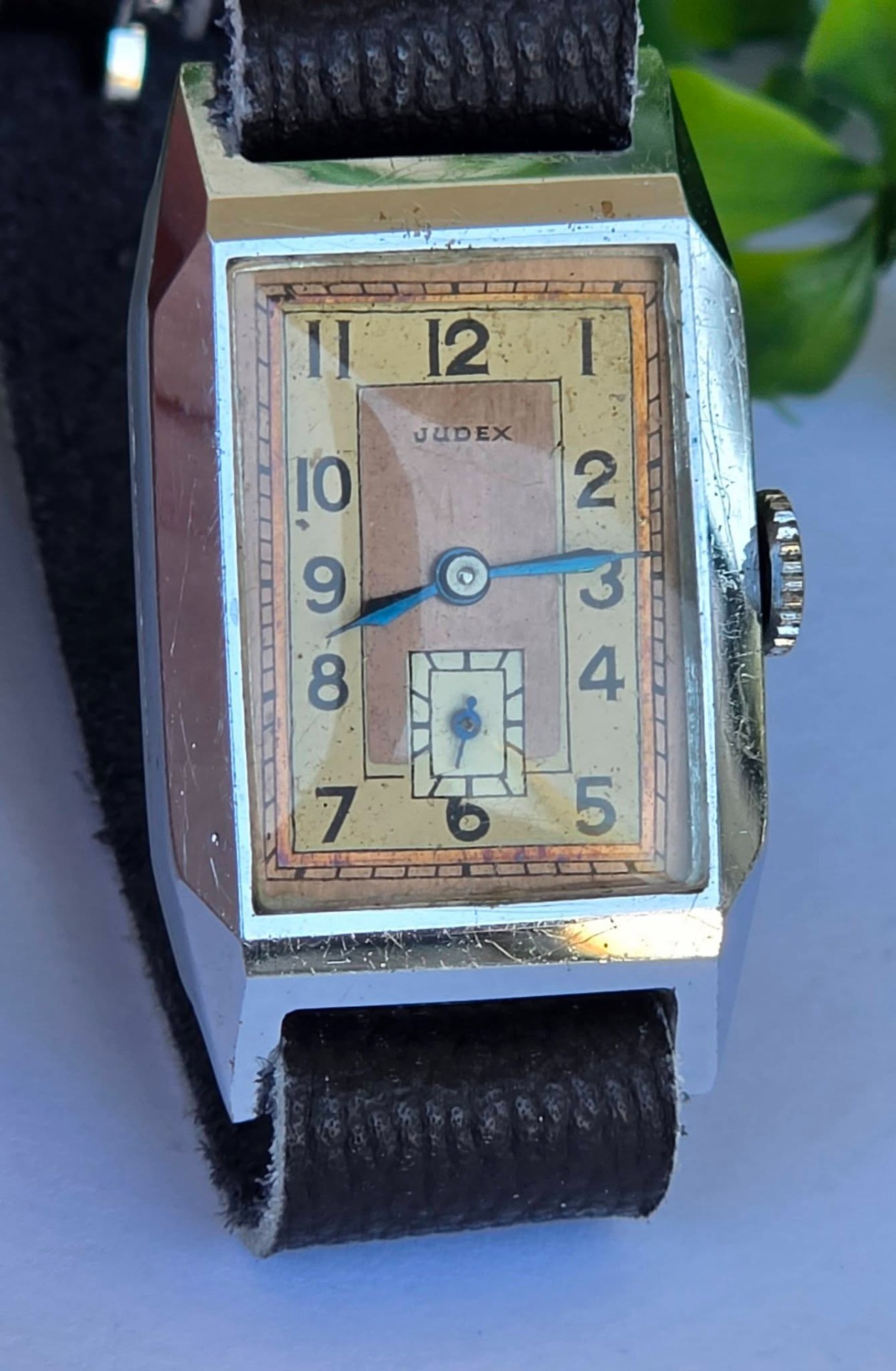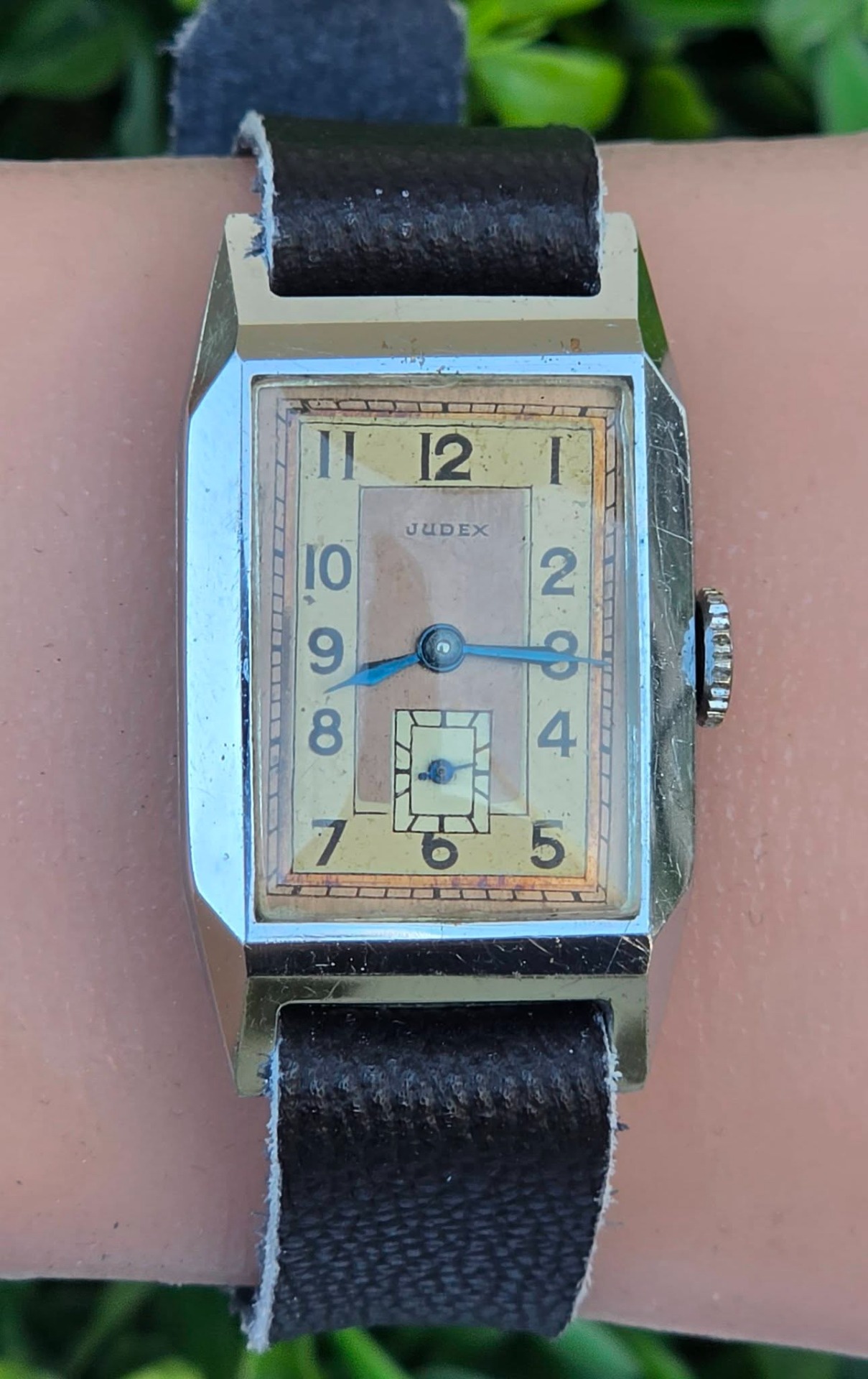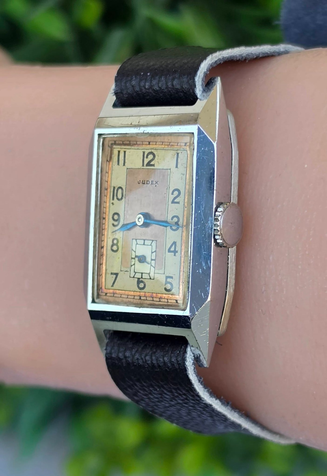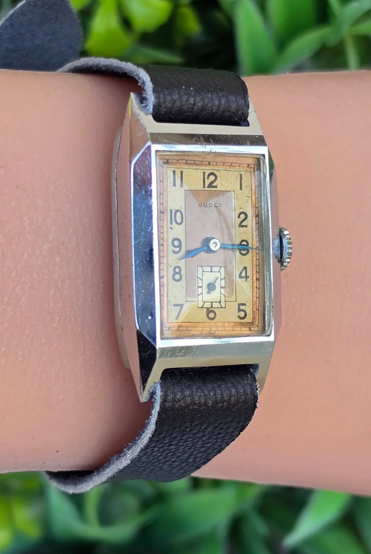 Ceas vintage Judex, raritate, piesă autentică de perioadă Art Deco (aprox. 1935-1945), fabricat în Franța (regiunea Villers-le-Lac), design "tank" dreptunghiular, cu muchii bine definite specific perioadei, mecanism cu întoarcere manuală, 17 jewels, funcțional, carcasă dreptunghiulară tip "Tank", cu muchii bine definite, specifică erei, cadran autentic, în două tonuri (sector dial), cu cifre arabe și secundar periferic la ora 6, cu indicatori din oțel albăstrui (blued steel) care previne coroziunea și oferă reflexii deosebite în lumină, curea din piele neagră, tip minimalist (Franța, anii 1930-1940).