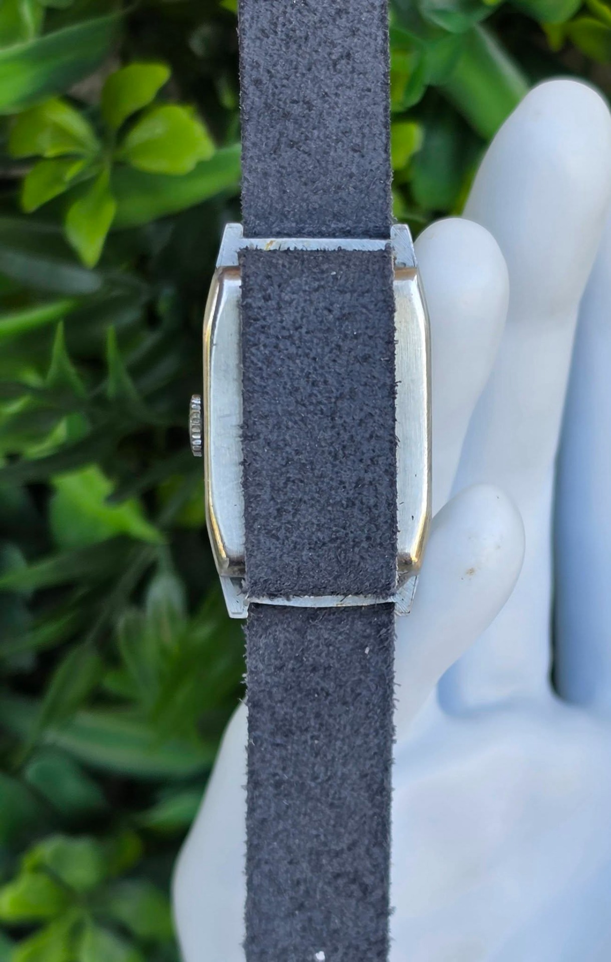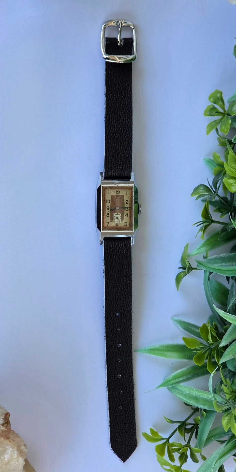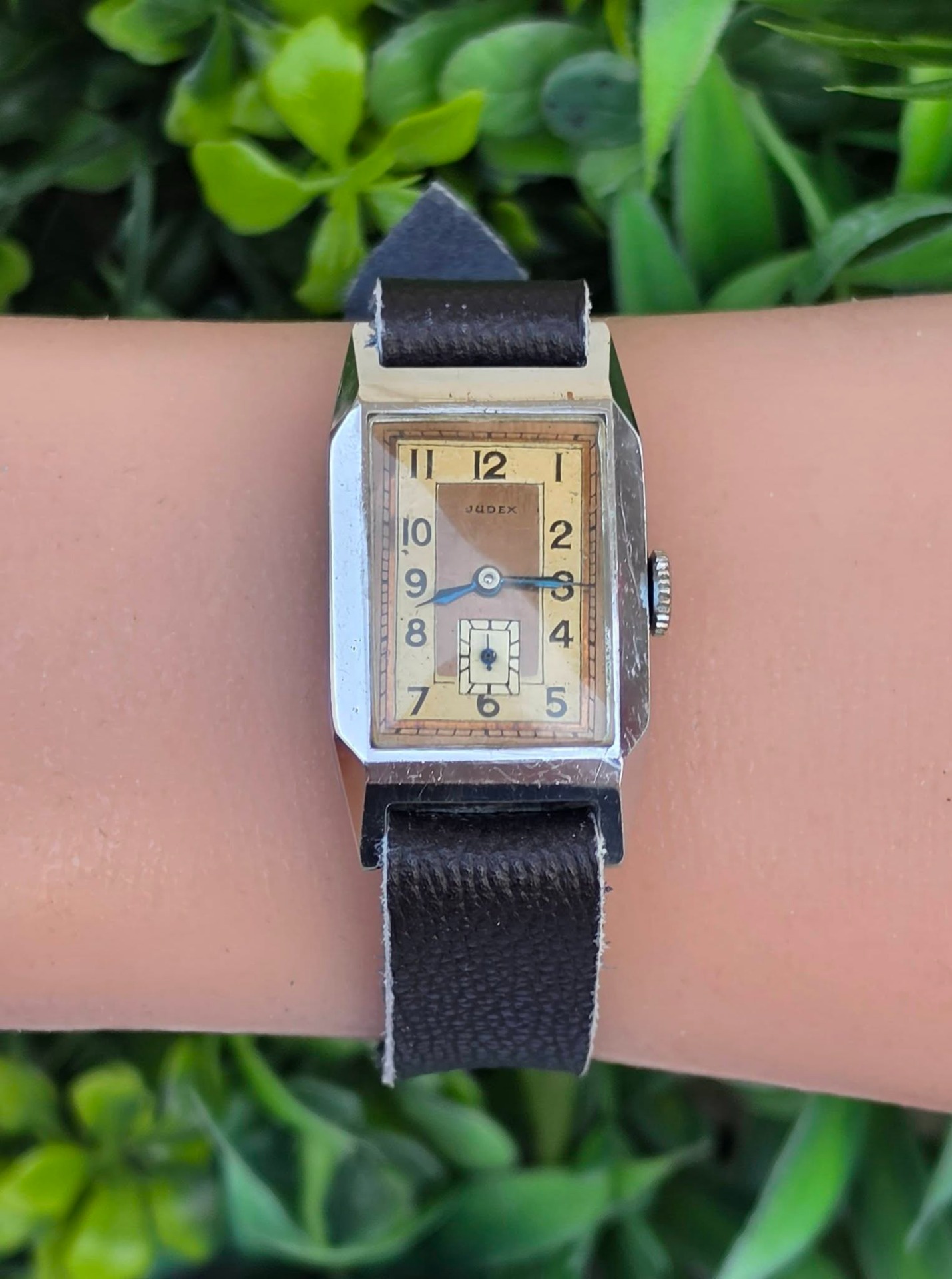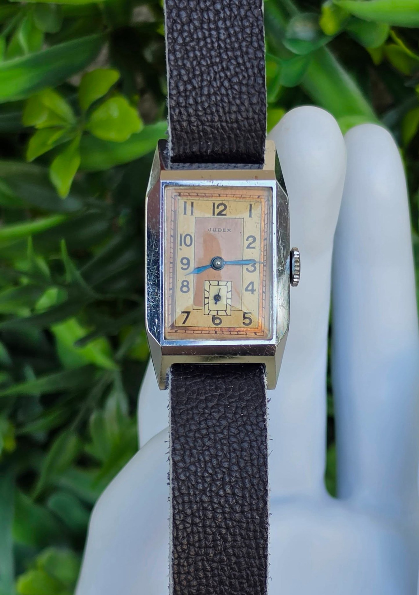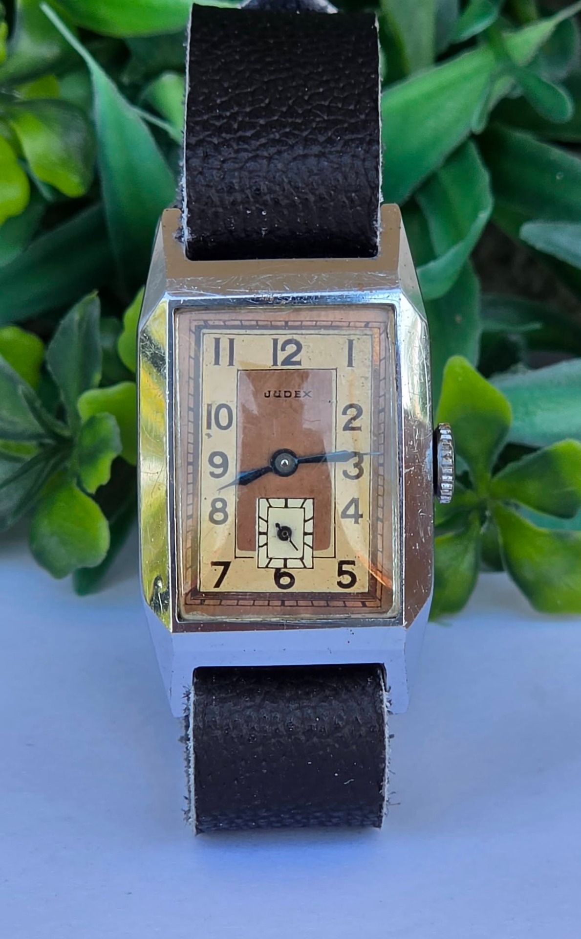 Ceas vintage Judex, raritate, piesă autentică de perioadă Art Deco (aprox. 1935-1945), fabricat în Franța (regiunea Villers-le-Lac), design "tank" dreptunghiular, cu muchii bine definite specific perioadei, mecanism cu întoarcere manuală, 17 jewels, funcțional, carcasă dreptunghiulară tip "Tank", cu muchii bine definite, specifică erei, cadran autentic, în două tonuri (sector dial), cu cifre arabe și secundar periferic la ora 6, cu indicatori din oțel albăstrui (blued steel) care previne coroziunea și oferă reflexii deosebite în lumină, curea din piele neagră, tip minimalist (Franța, anii 1930-1940).