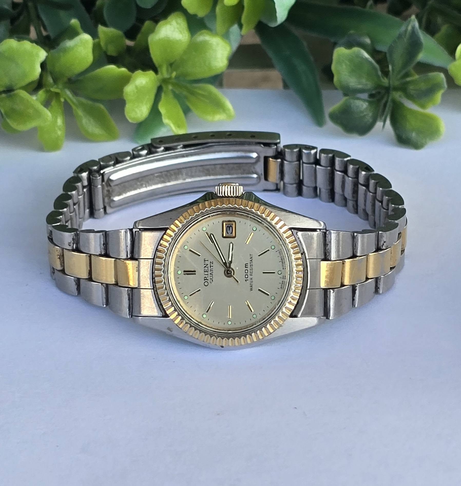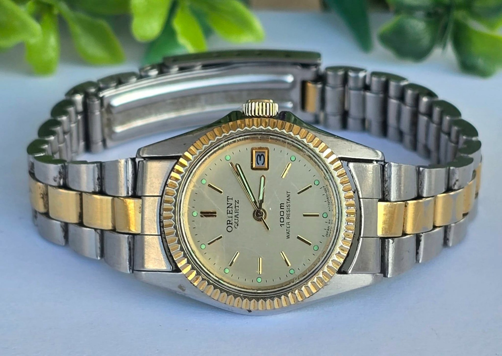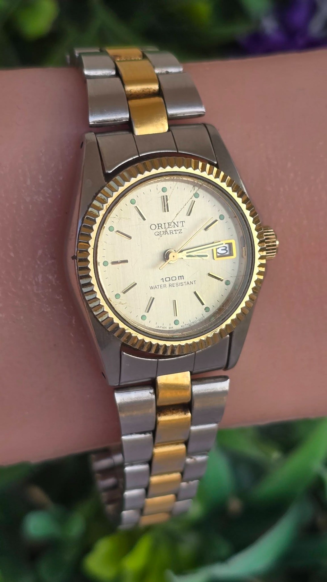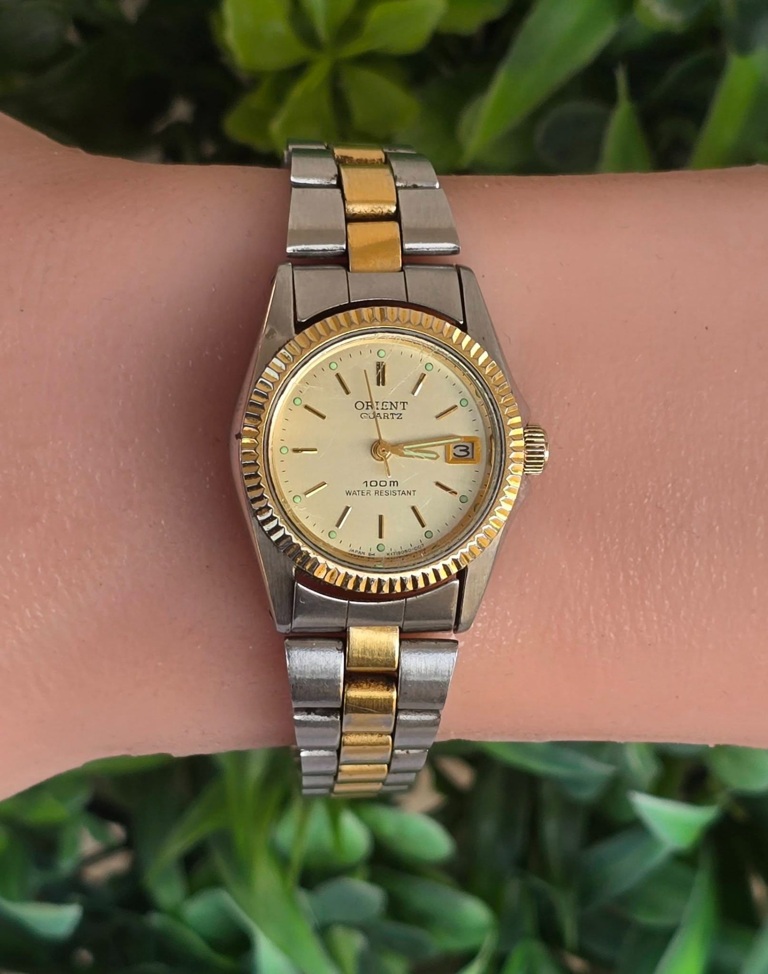 Ceas vintage Orient Datejust de damă, bicolor, din oțel inoxidabil cu elemente placate cu aur, cu mecanism quartz în stare de funcționare, cadran "champagne" și indicator de dată în dreptul orei 3.