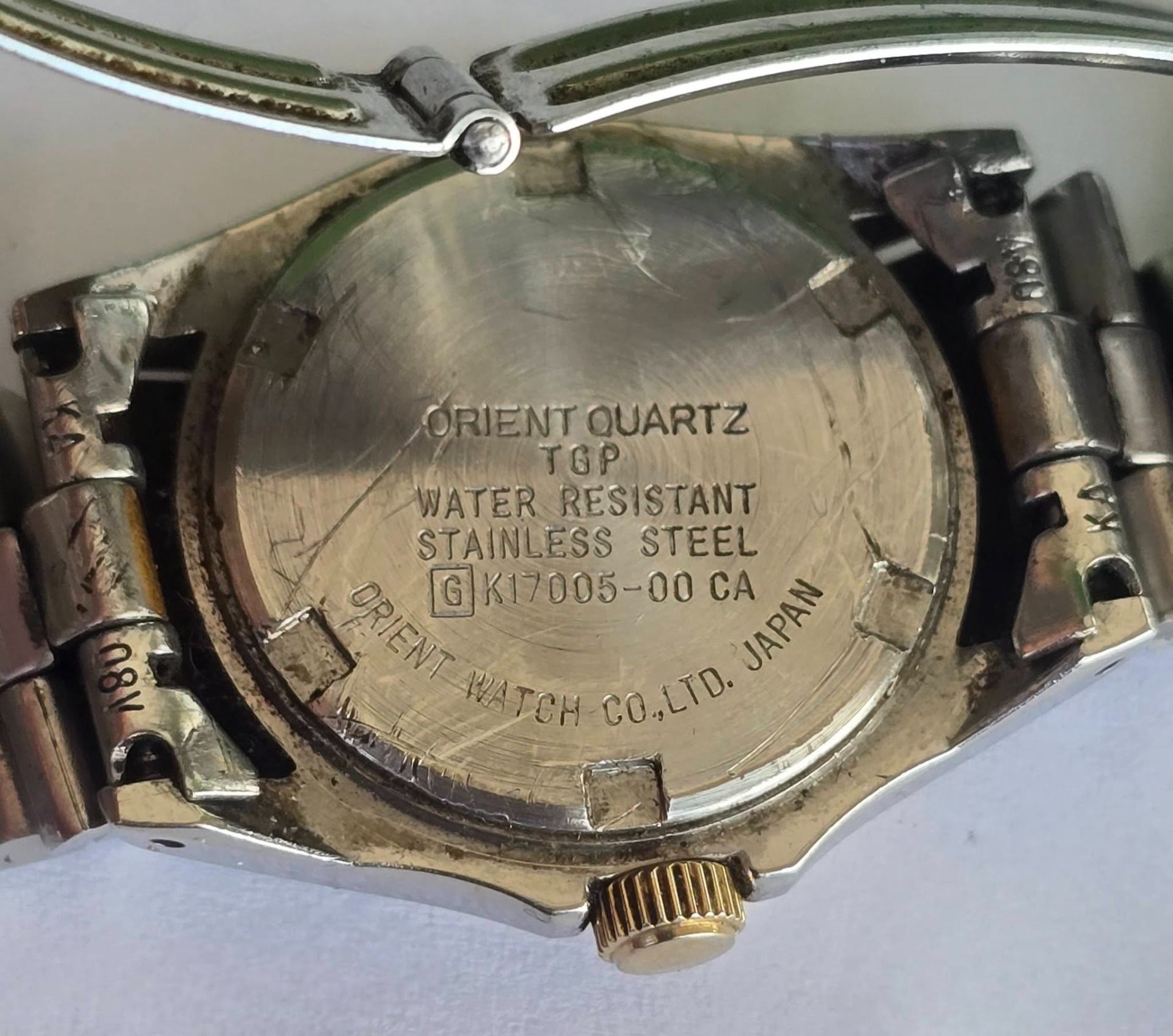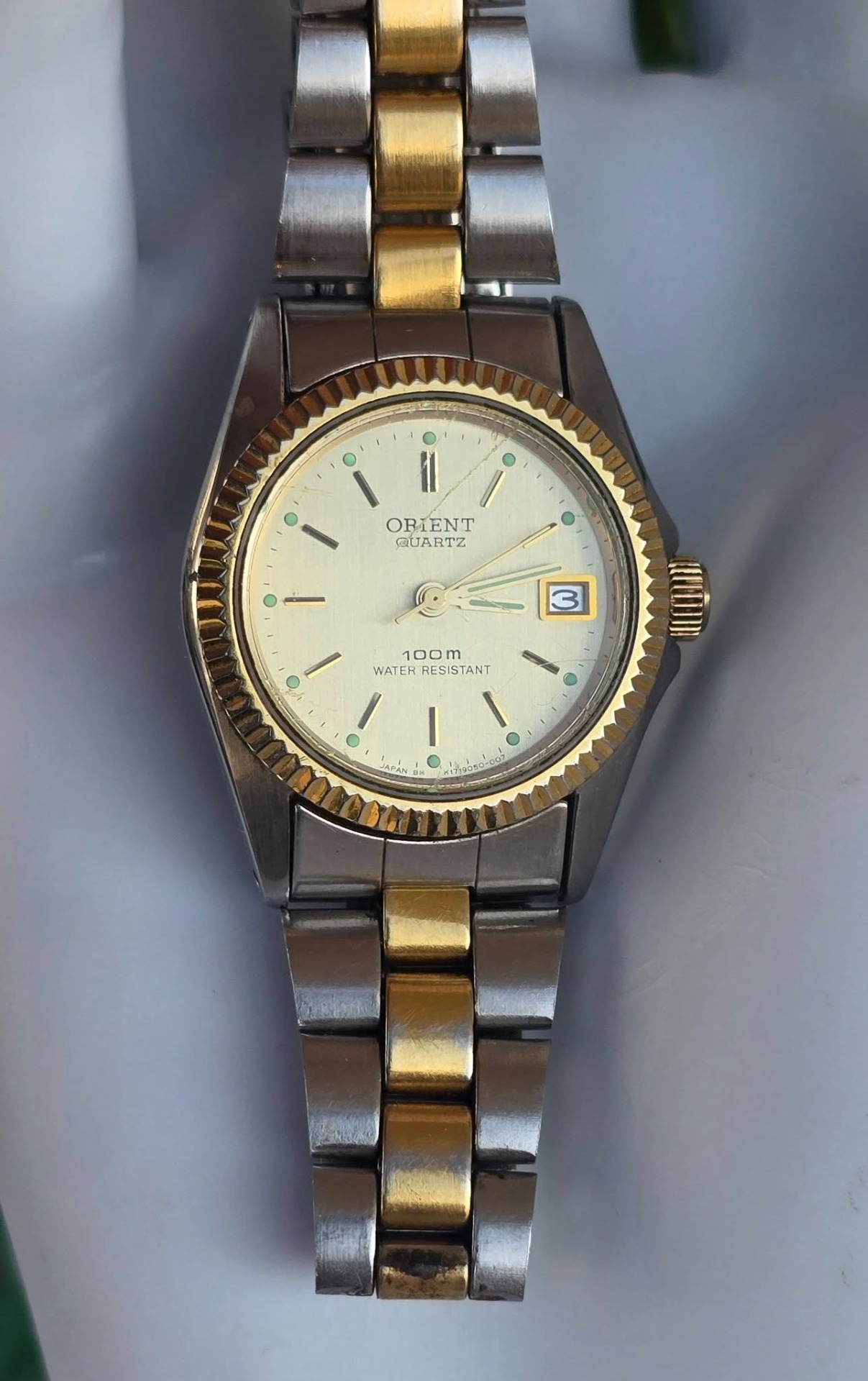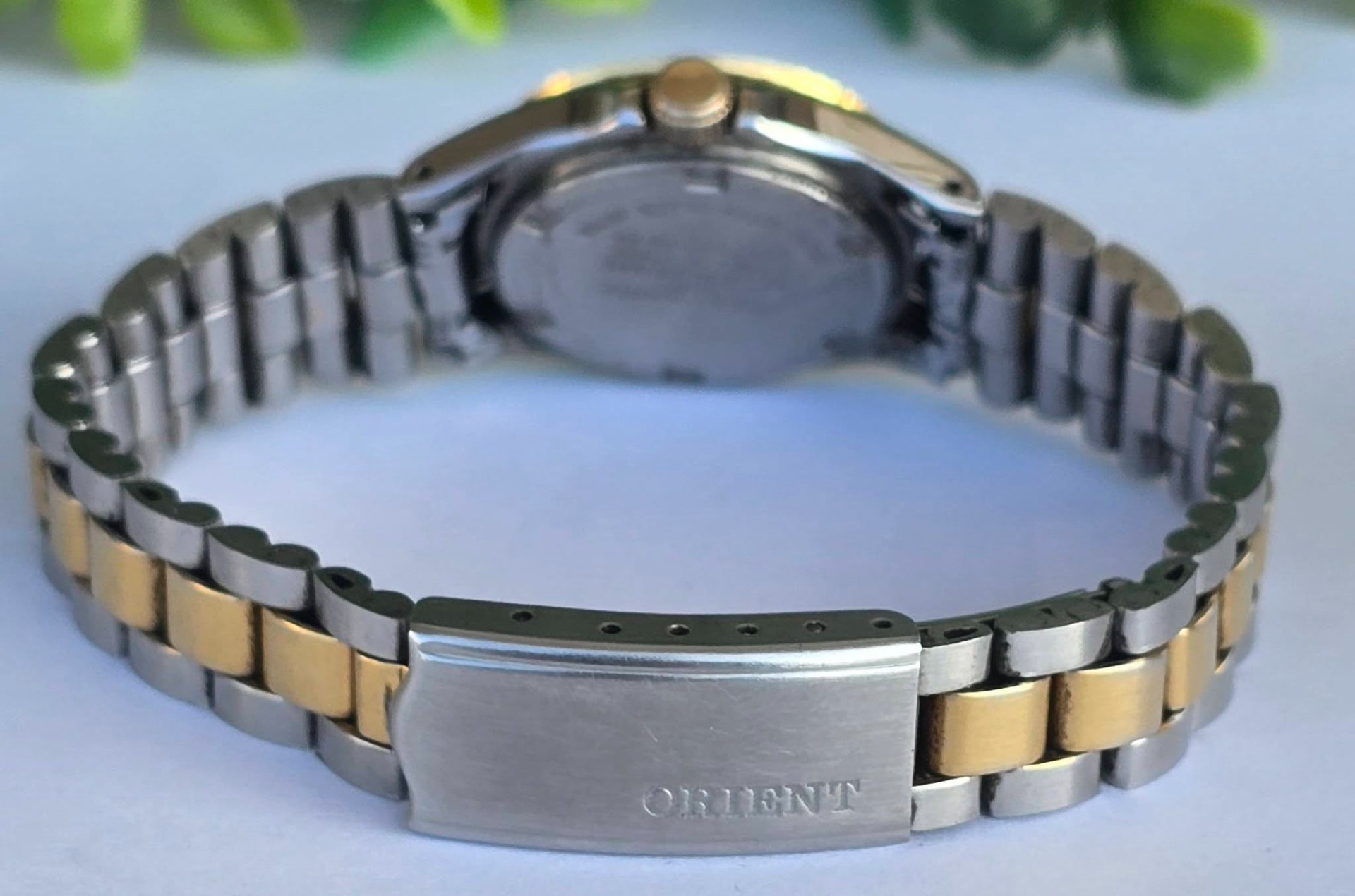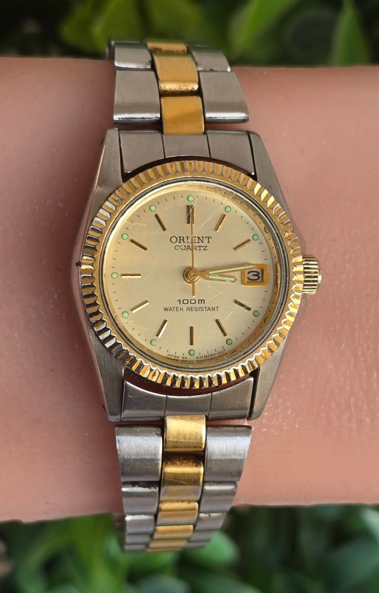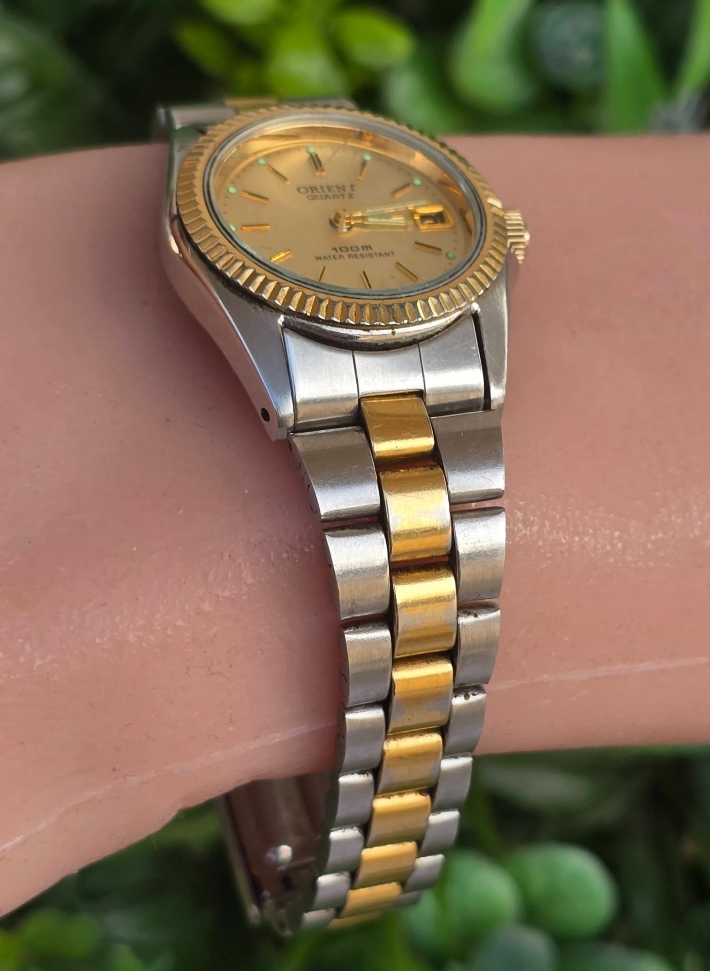 Ceas vintage Orient Datejust de damă, bicolor, din oțel inoxidabil cu elemente placate cu aur, cu mecanism quartz în stare de funcționare, cadran "champagne" și indicator de dată în dreptul orei 3.