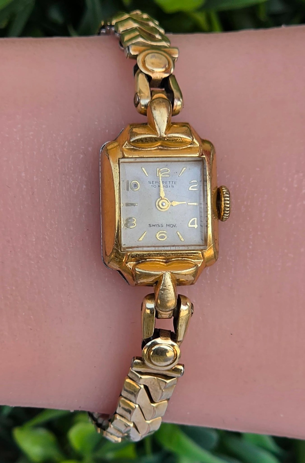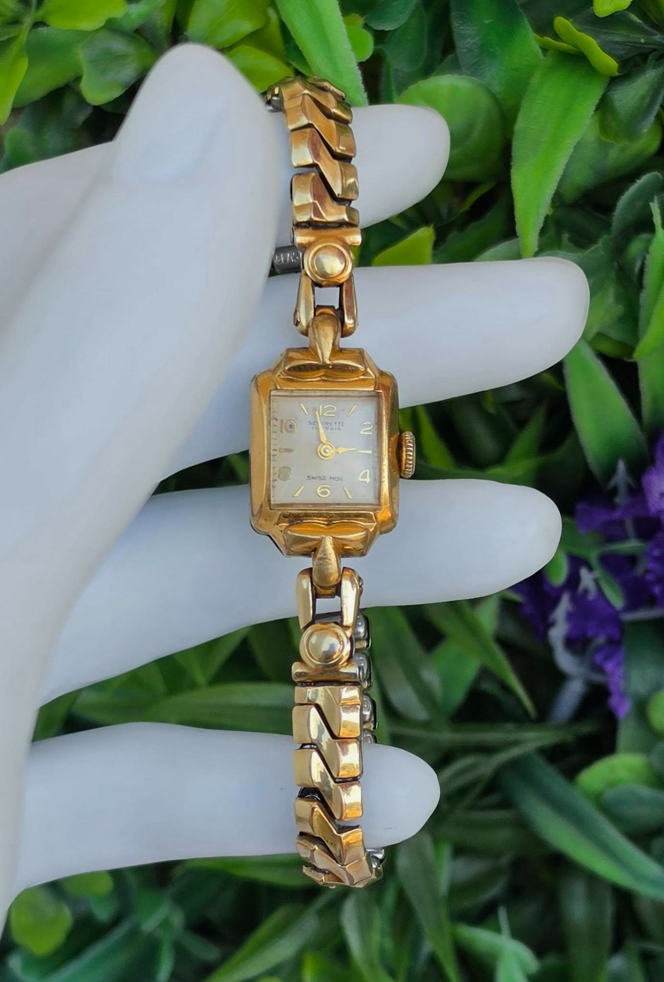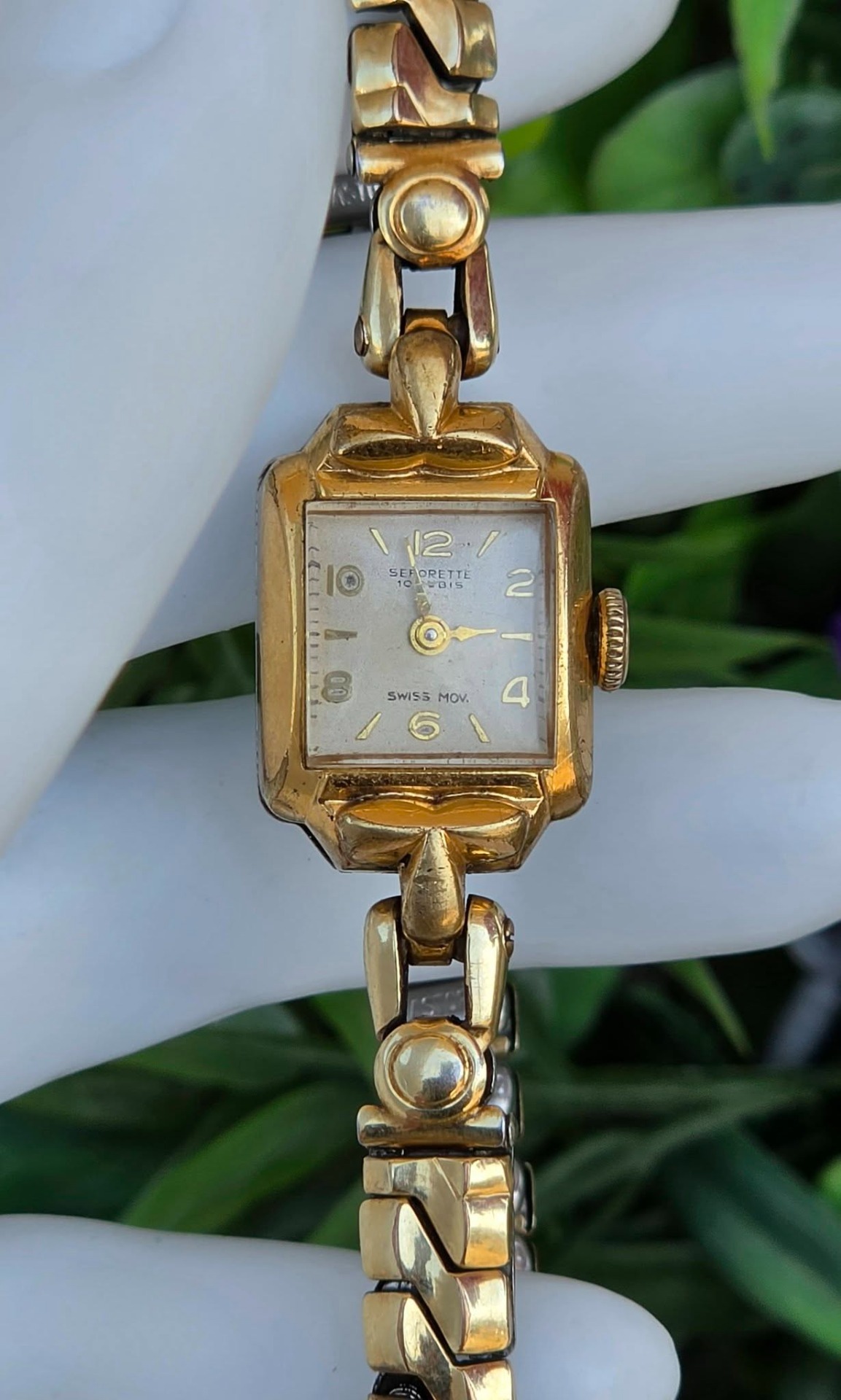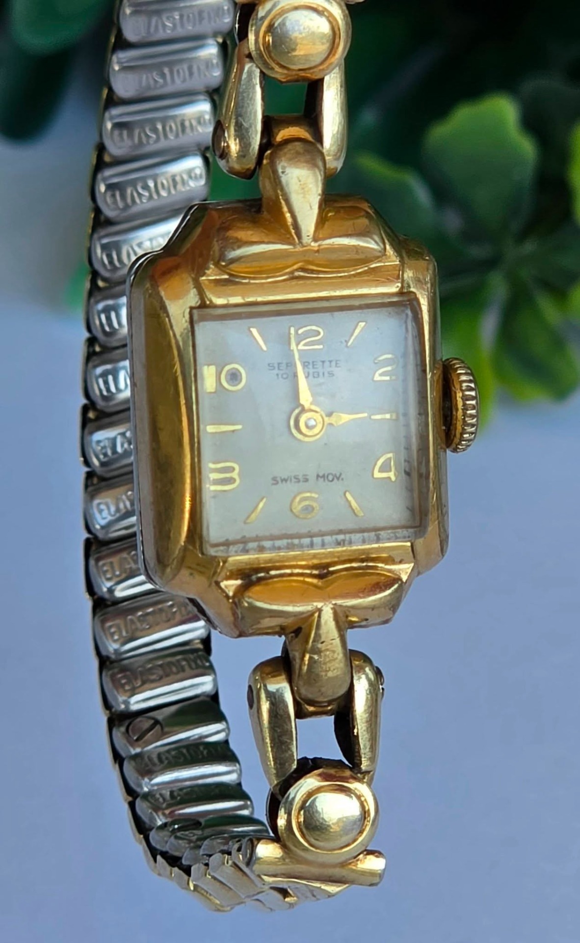 Ceas vintage Seporette elvețian, de damă, din metal aurit, cu mecanism cu armare manuală, 10 jewels, funcțional, cu brățară elastică.
