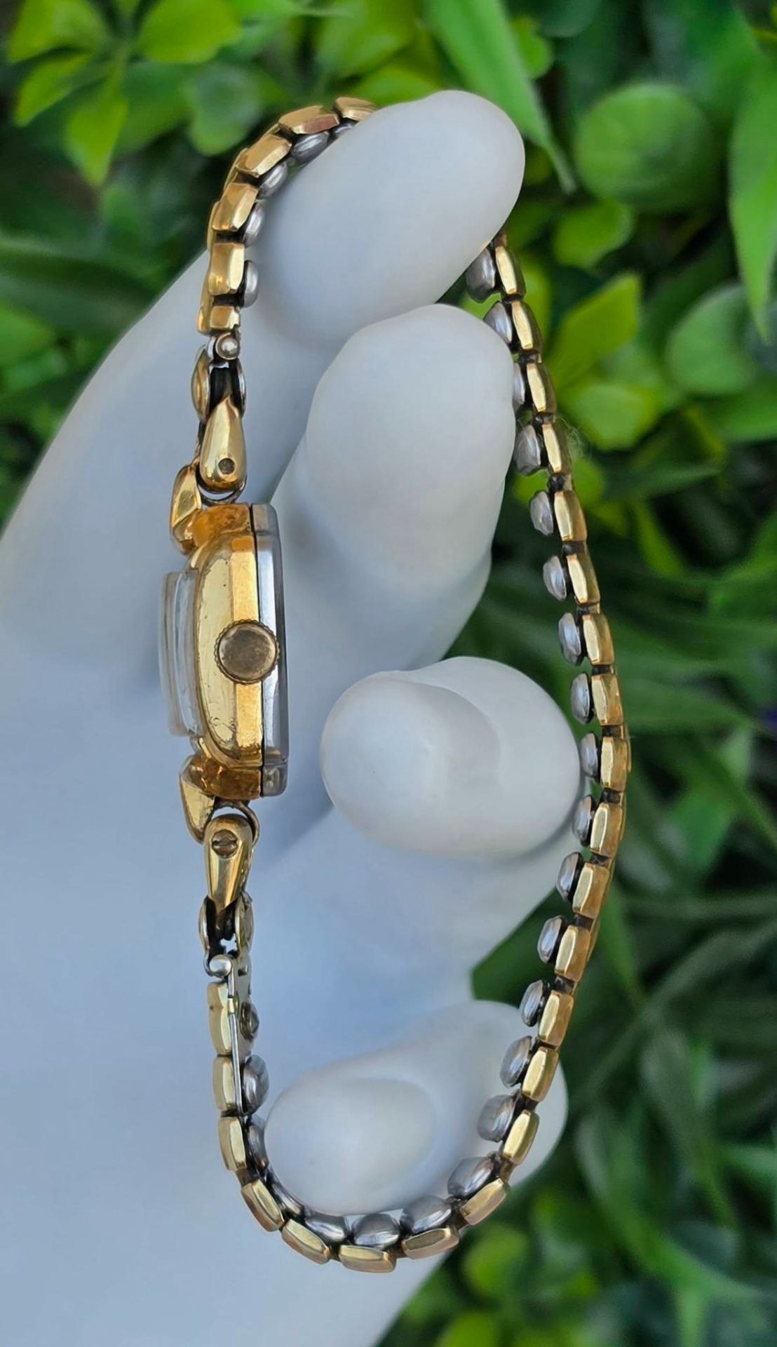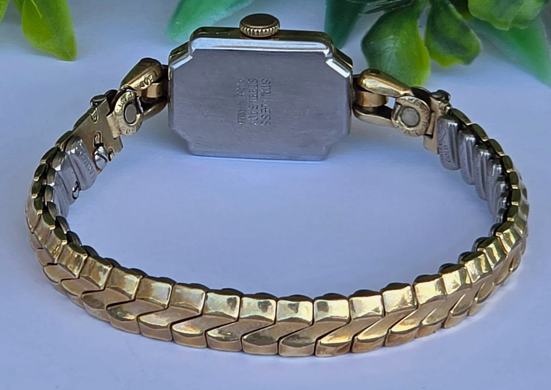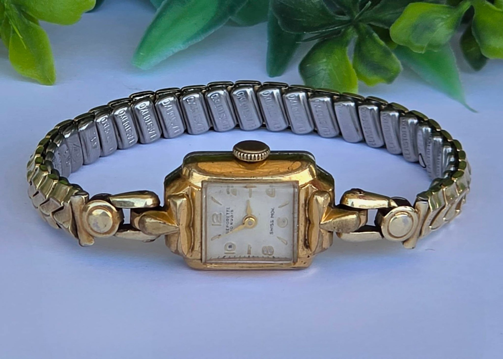 Ceas vintage Seporette elvețian, de damă, din metal aurit, cu mecanism cu armare manuală, 10 jewels, funcțional, cu brățară elastică.