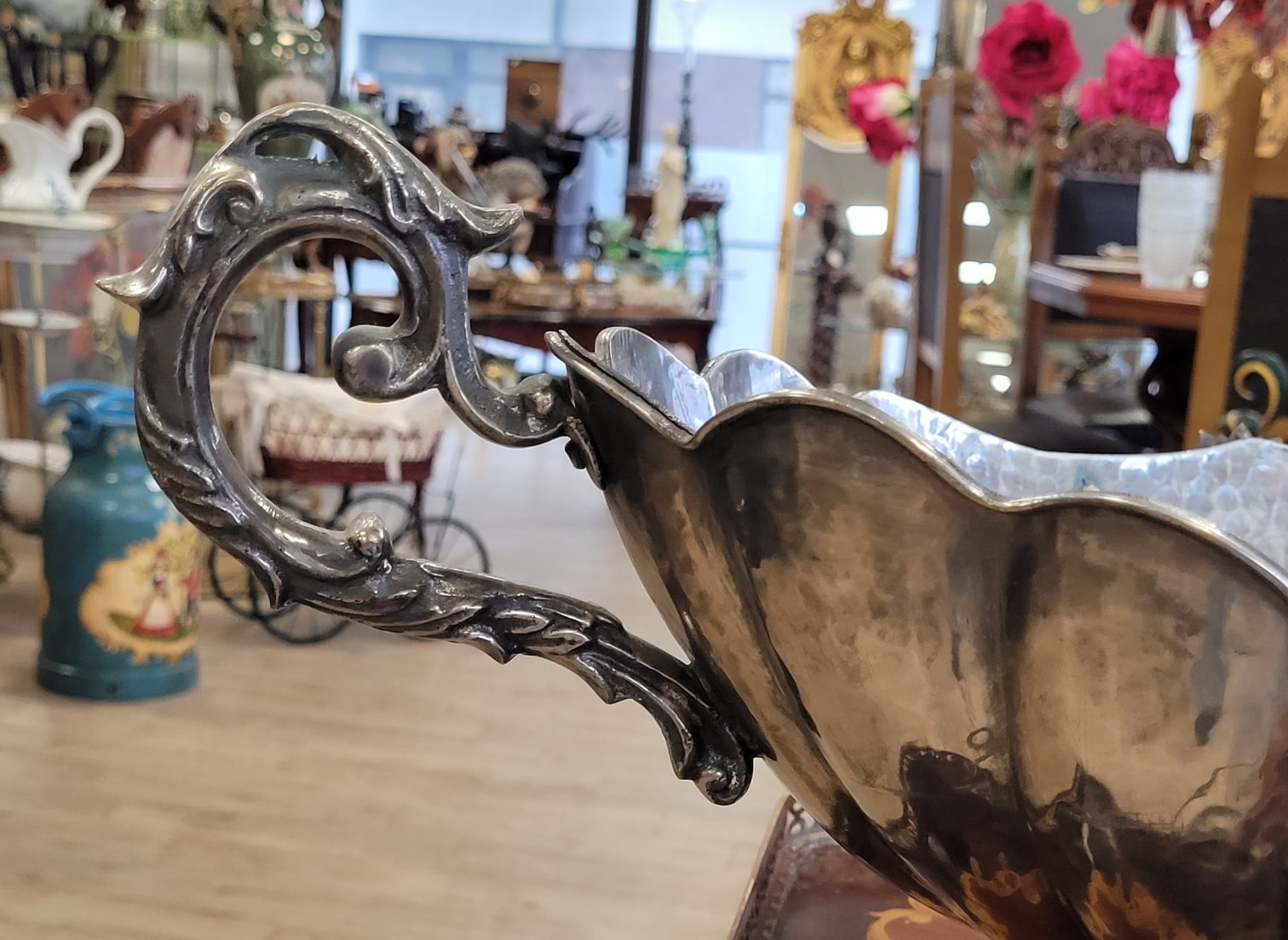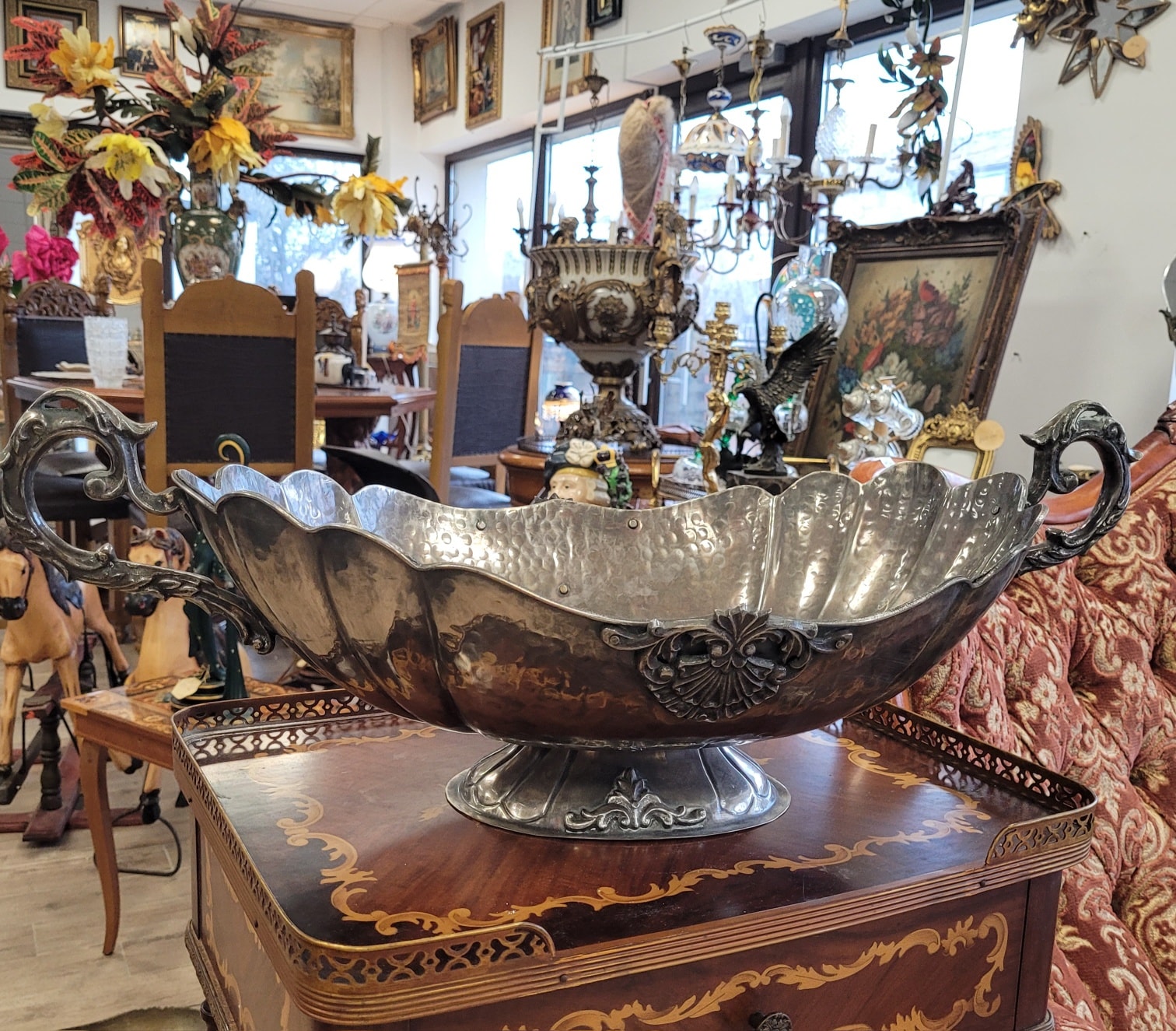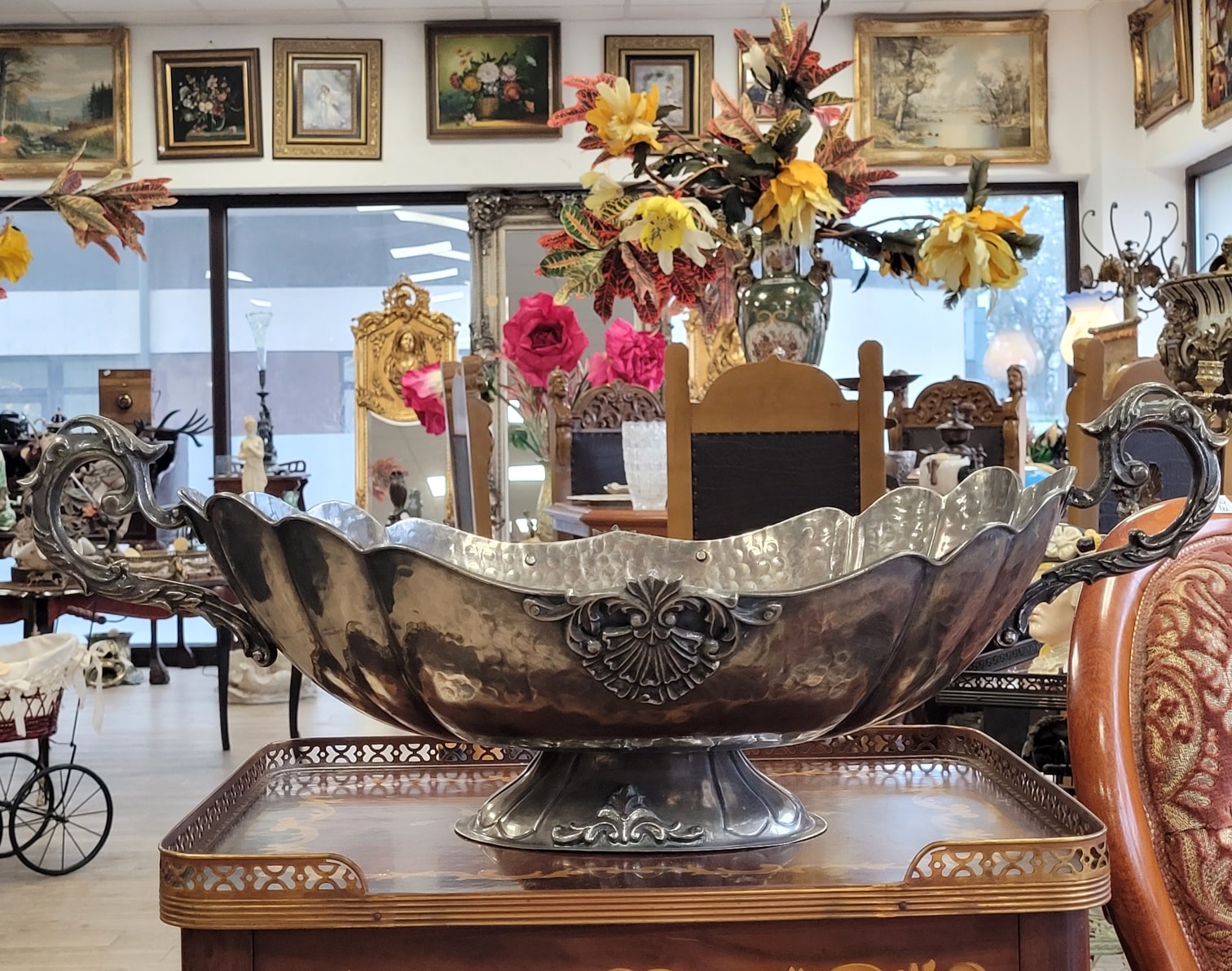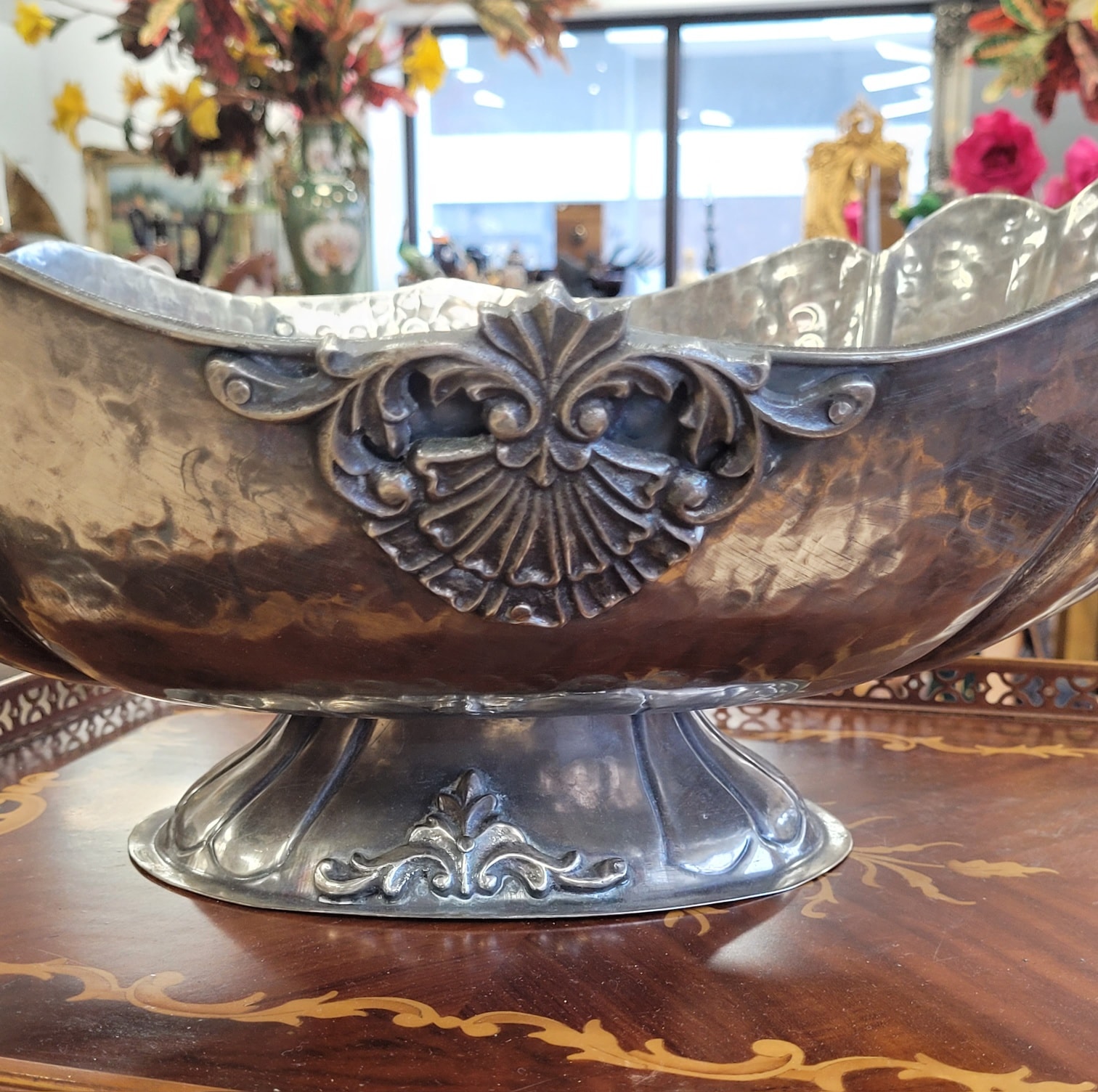 Centru de masă impresionant, fructieră în stil baroc/rococo, din metal argintat, de formă "navette" cu margini ondulate și detalii ornamentale bogate.