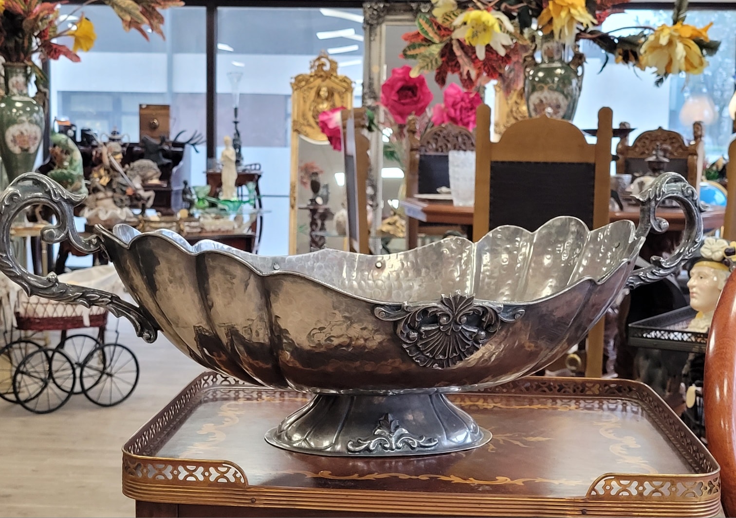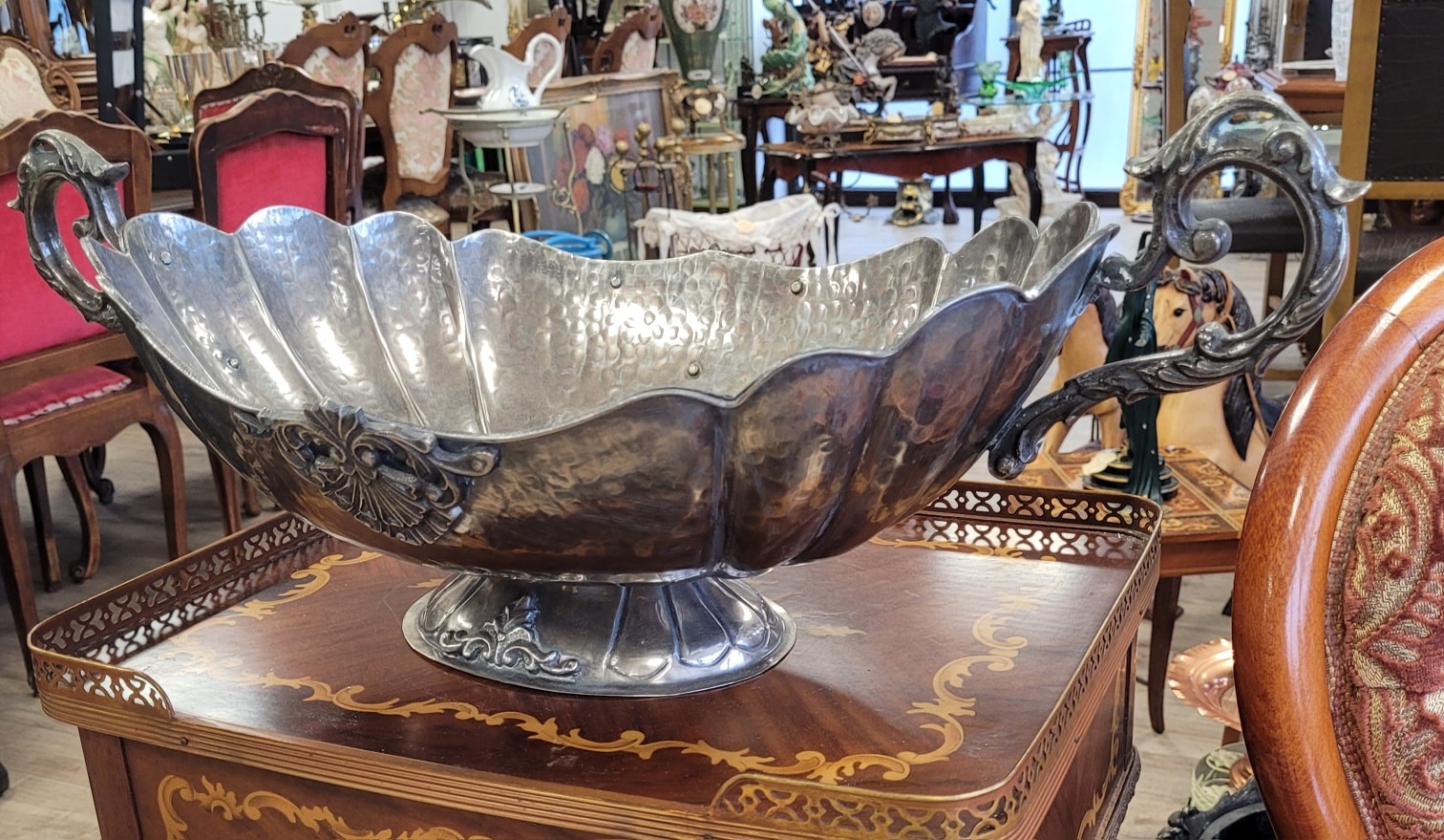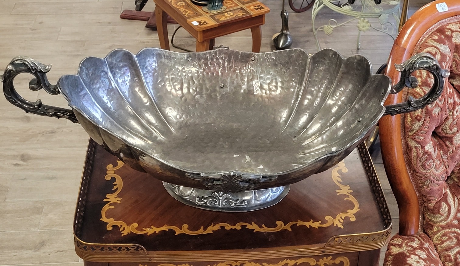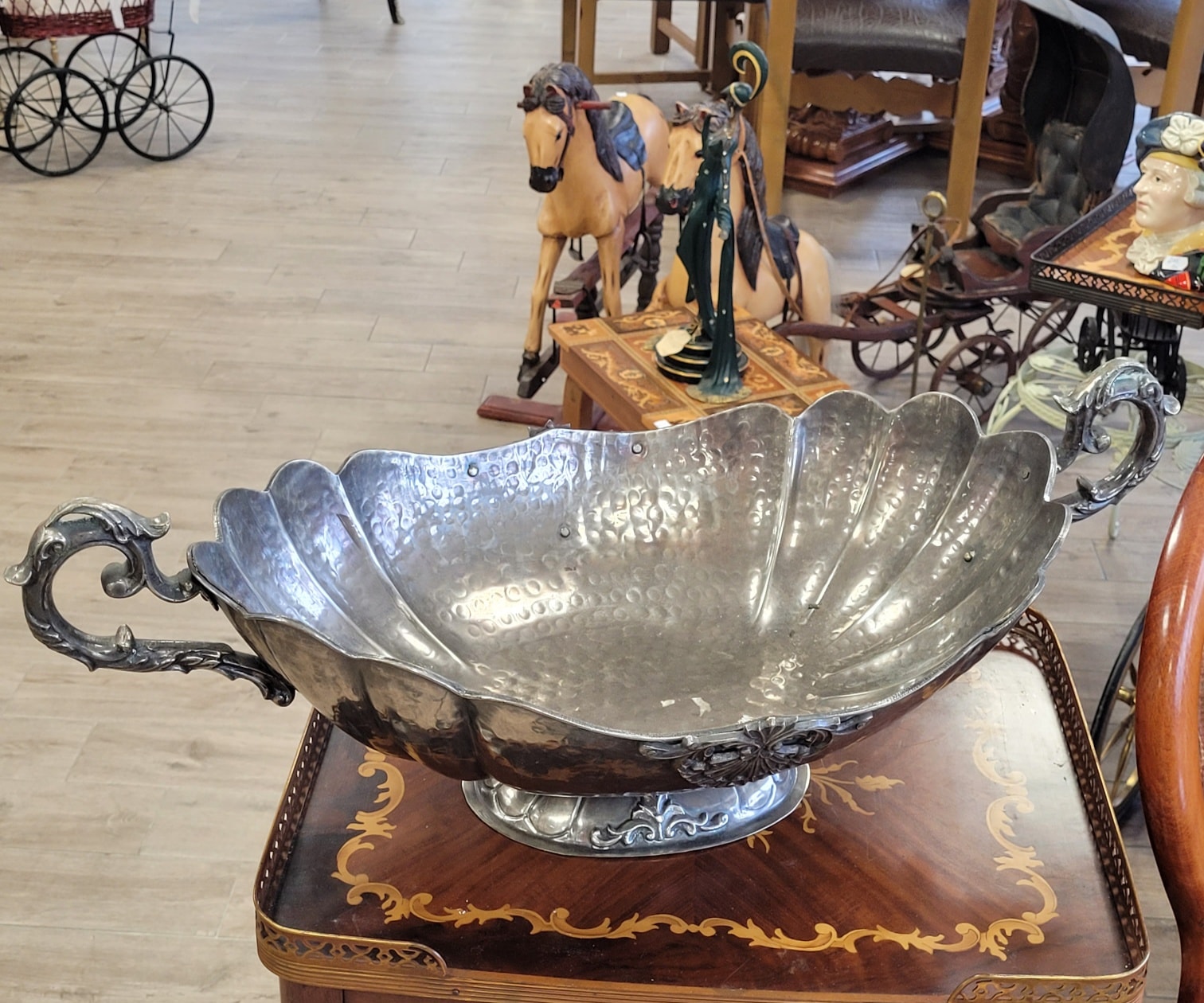 Centru de masă impresionant, fructieră în stil baroc/rococo, din metal argintat, de formă "navette" cu margini ondulate și detalii ornamentale bogate.