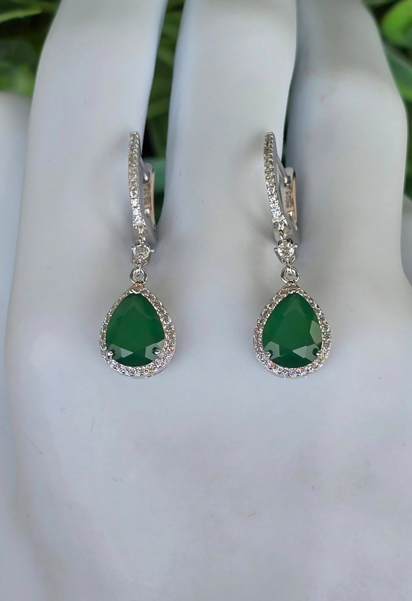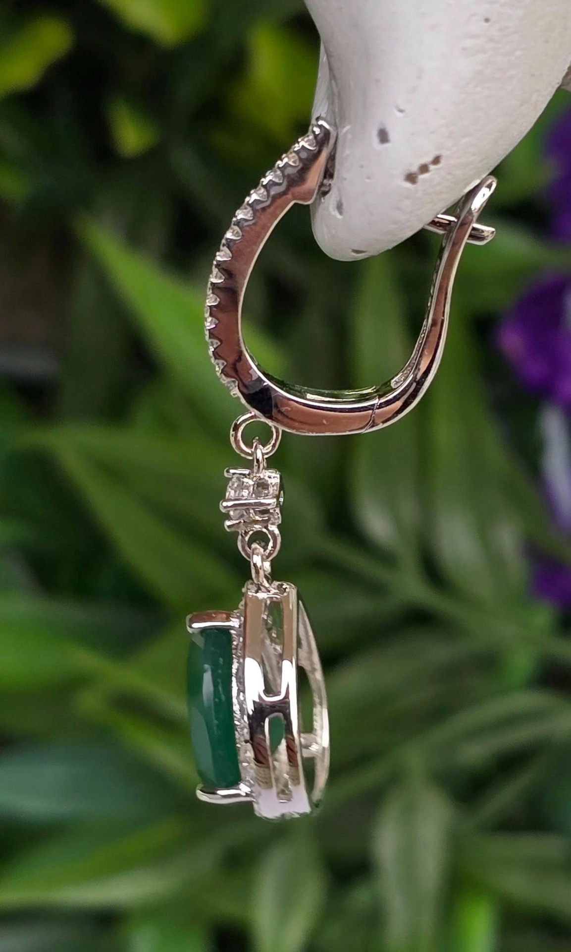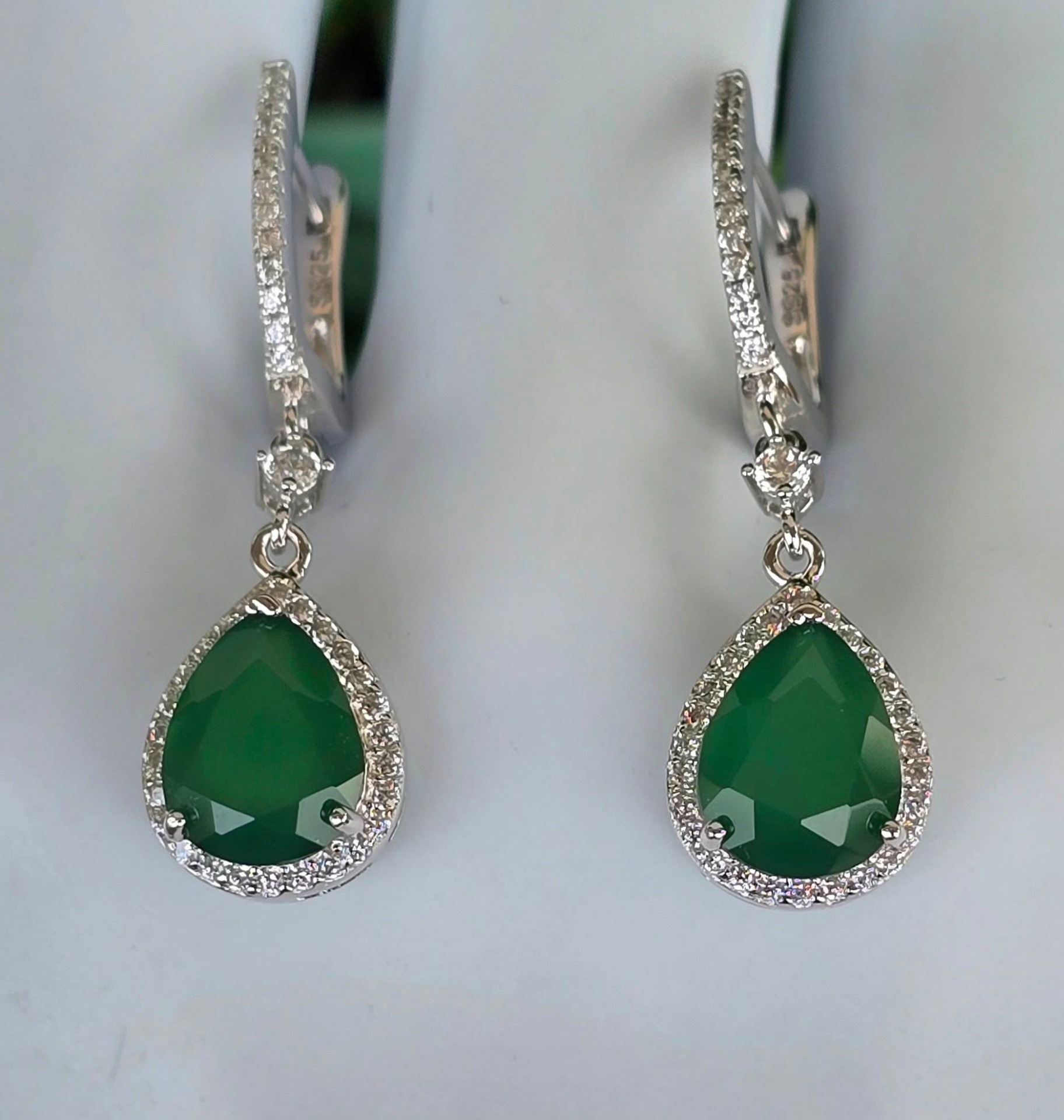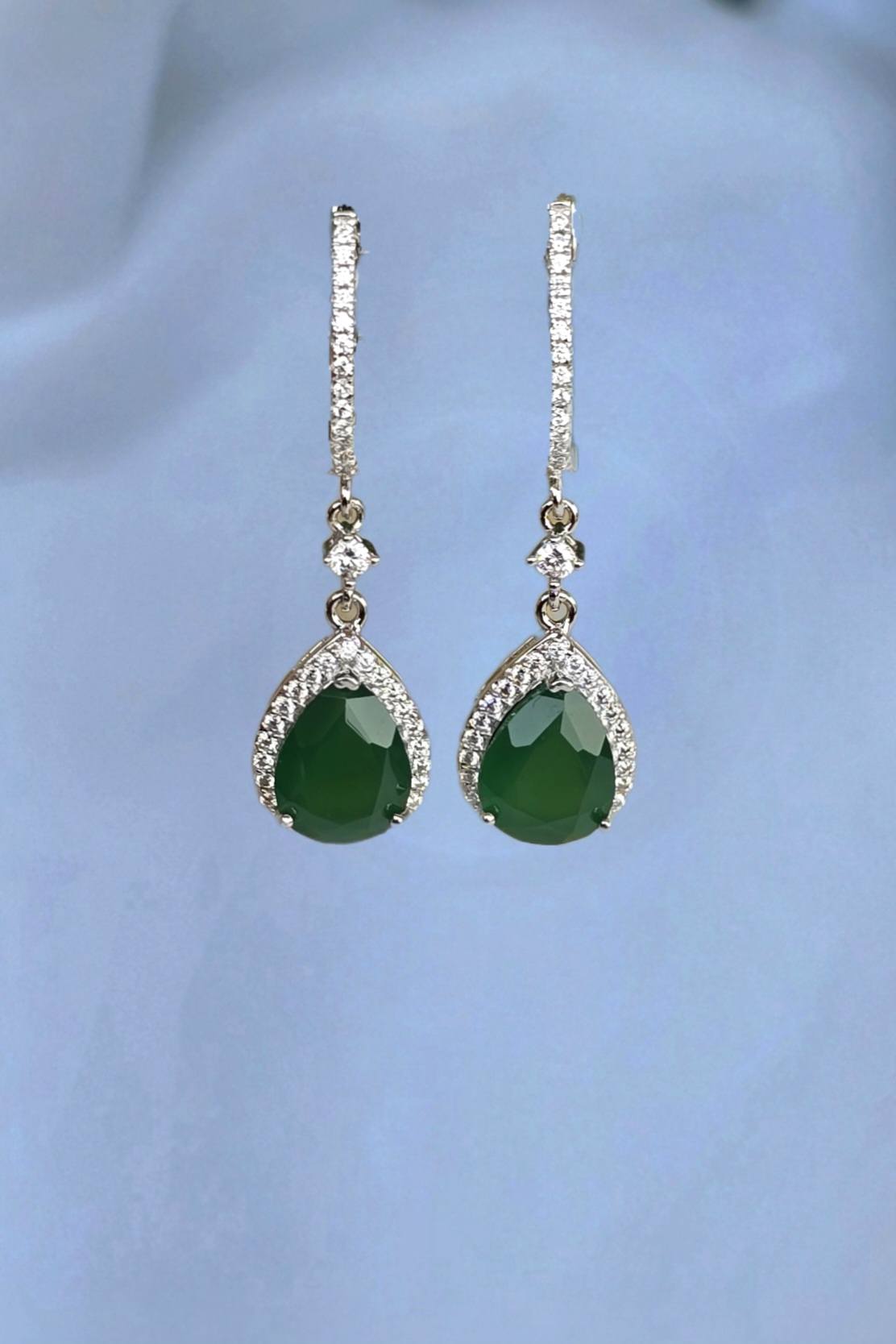 Cercei contemporani din argint rodiat, cu calcedonie verde naturală și pietre cubic zirconia.