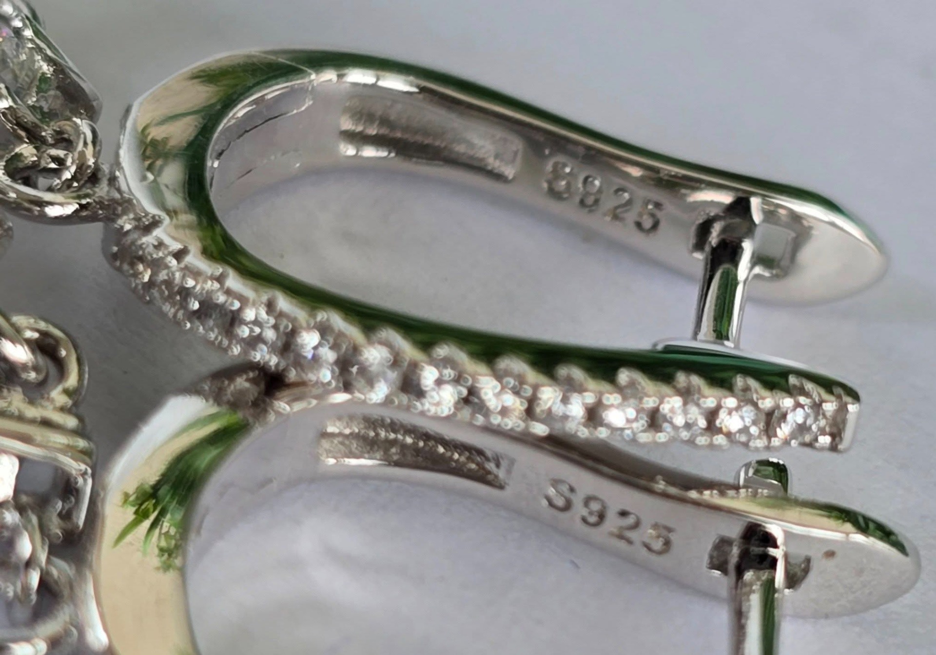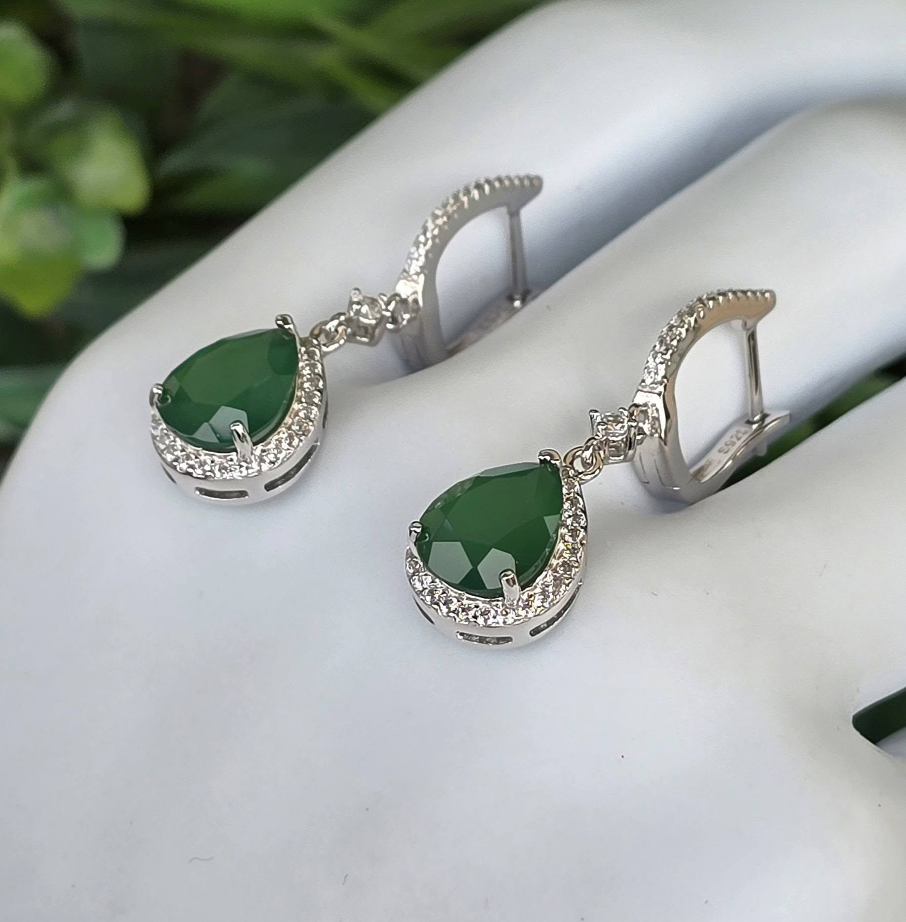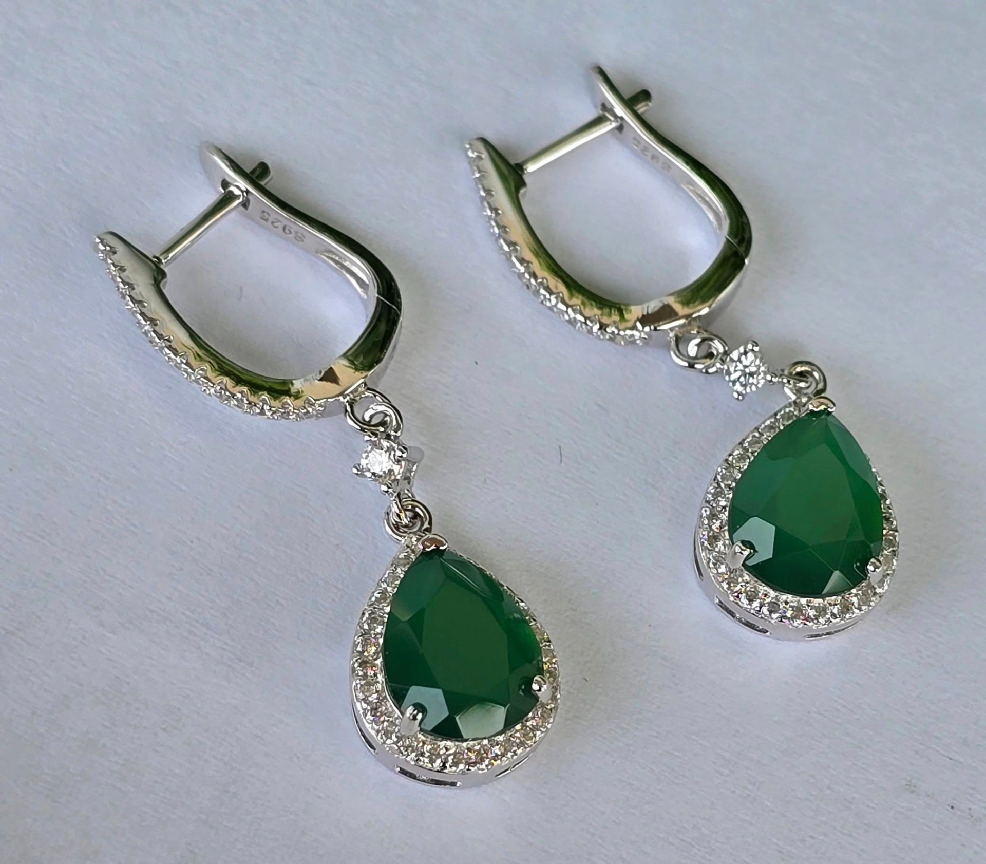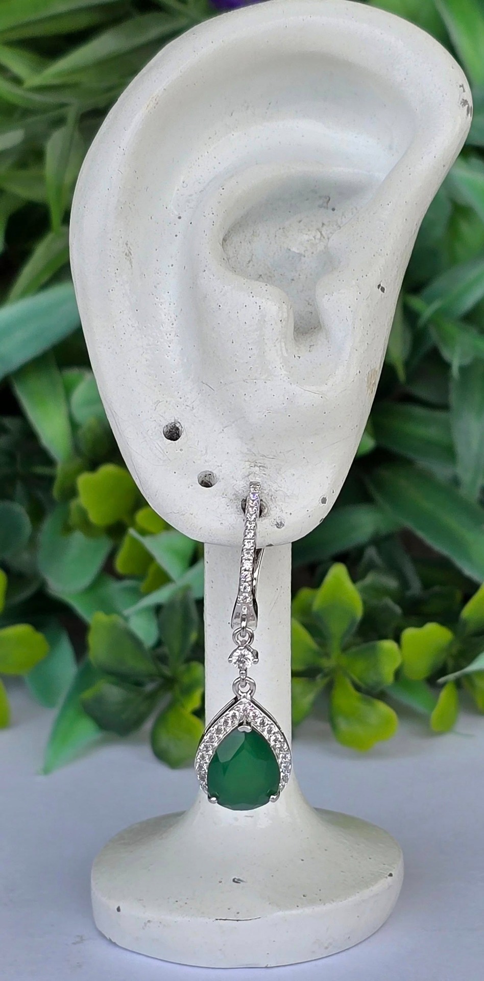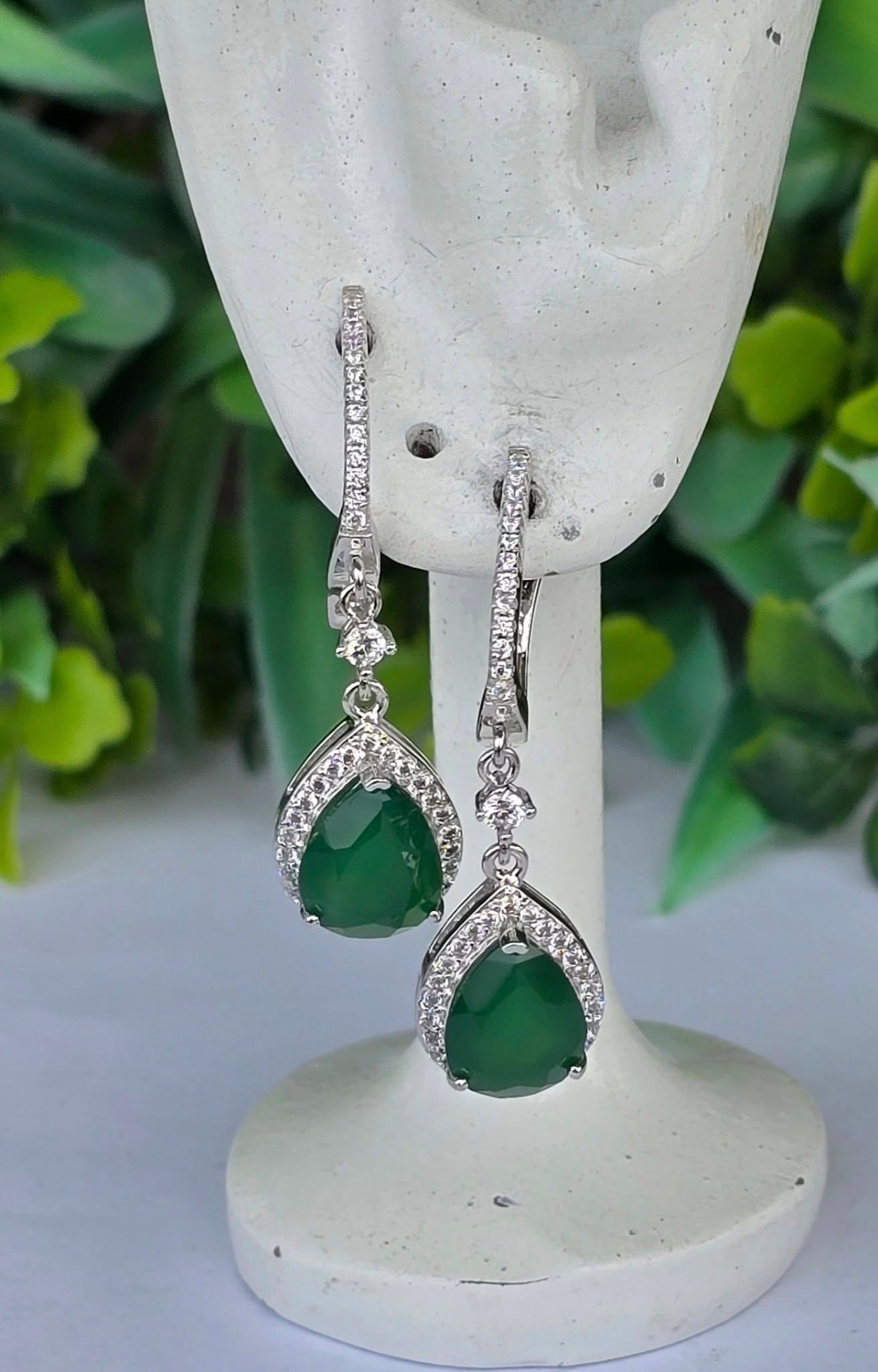 Cercei contemporani din argint rodiat, cu calcedonie verde naturală și pietre cubic zirconia.