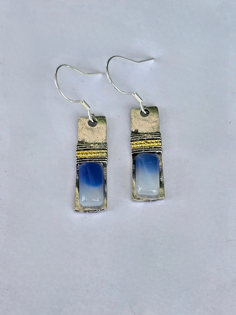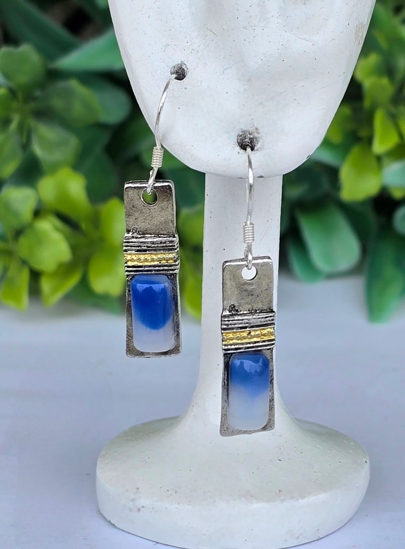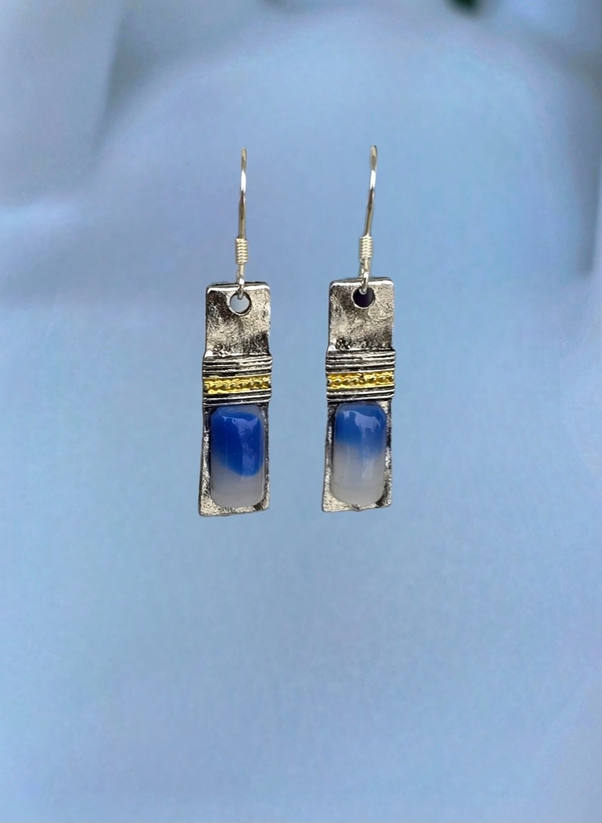 Cercei contemporani geometrici, de influență Art Deco, cu tortițe din argint, din metal argintat și agat albastru natural.