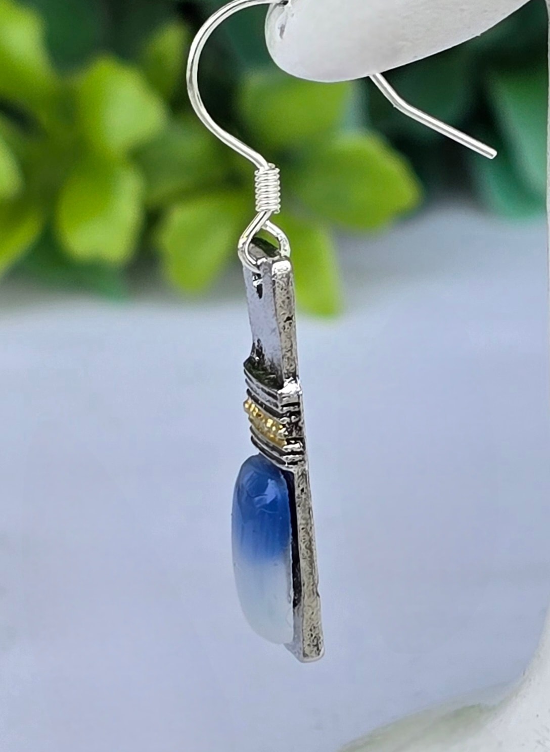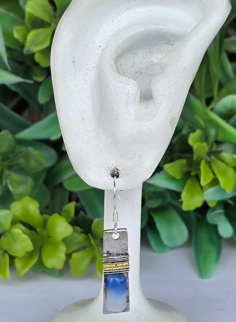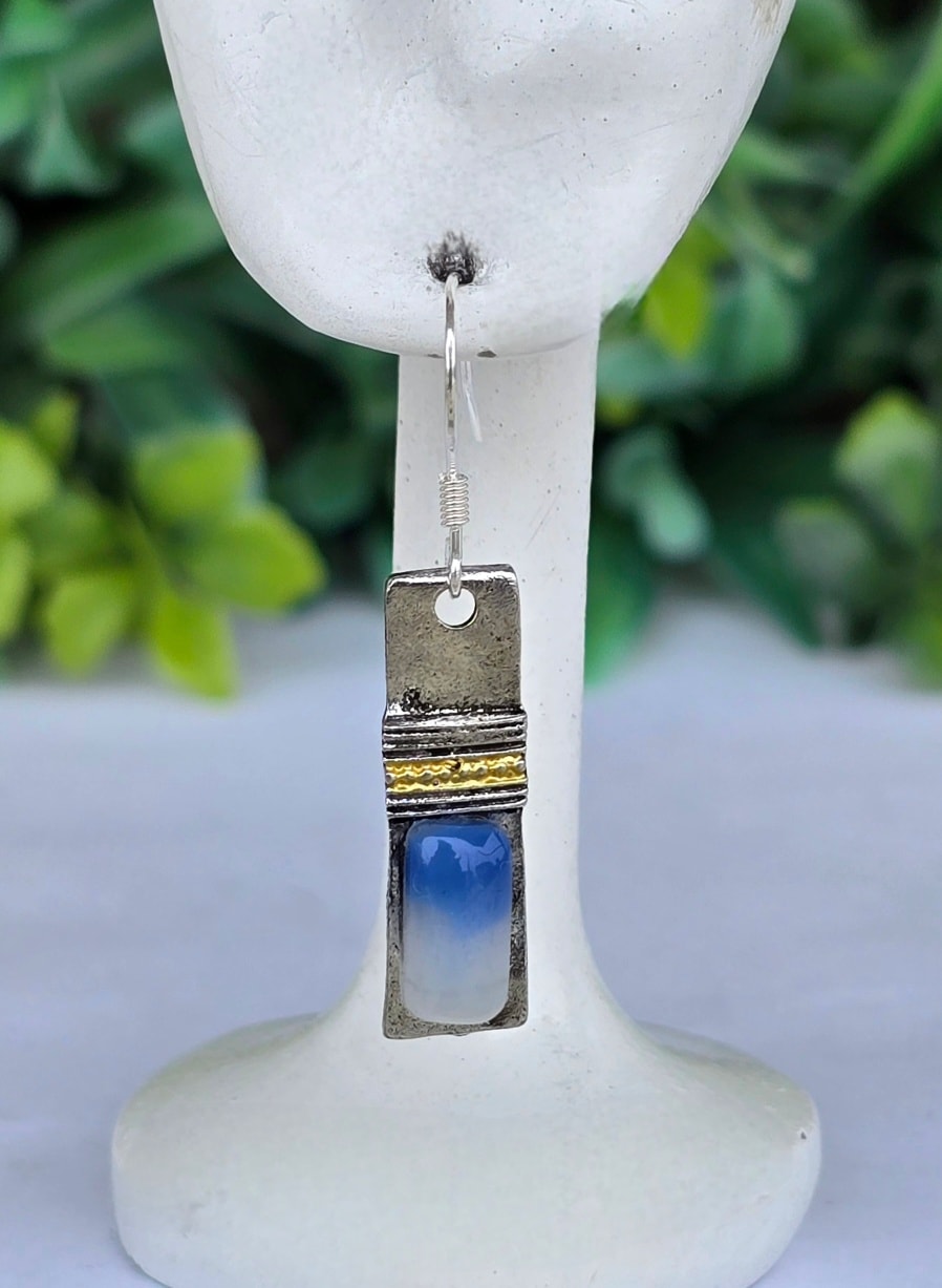 Cercei contemporani geometrici, de influență Art Deco, cu tortițe din argint, din metal argintat și agat albastru natural.