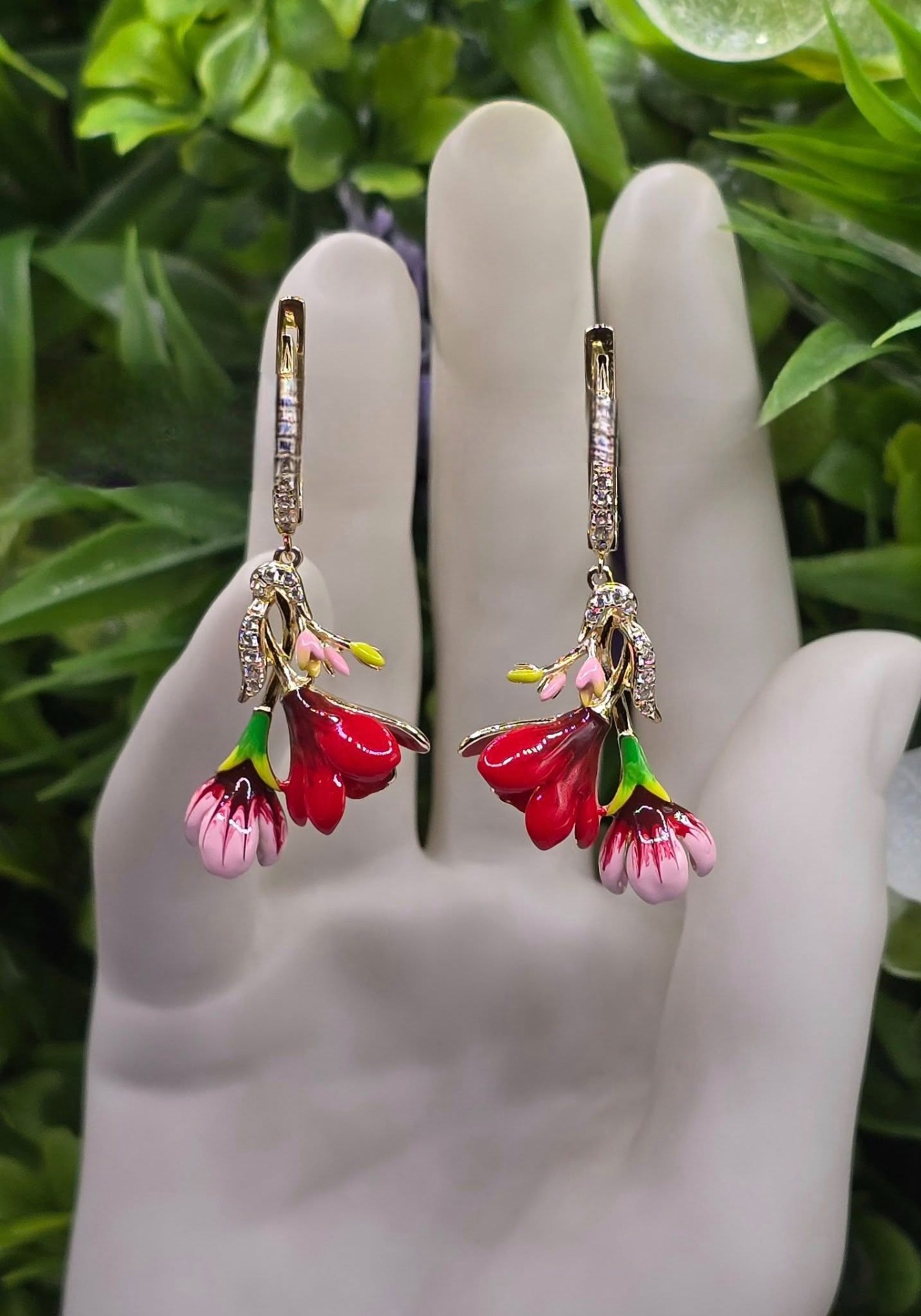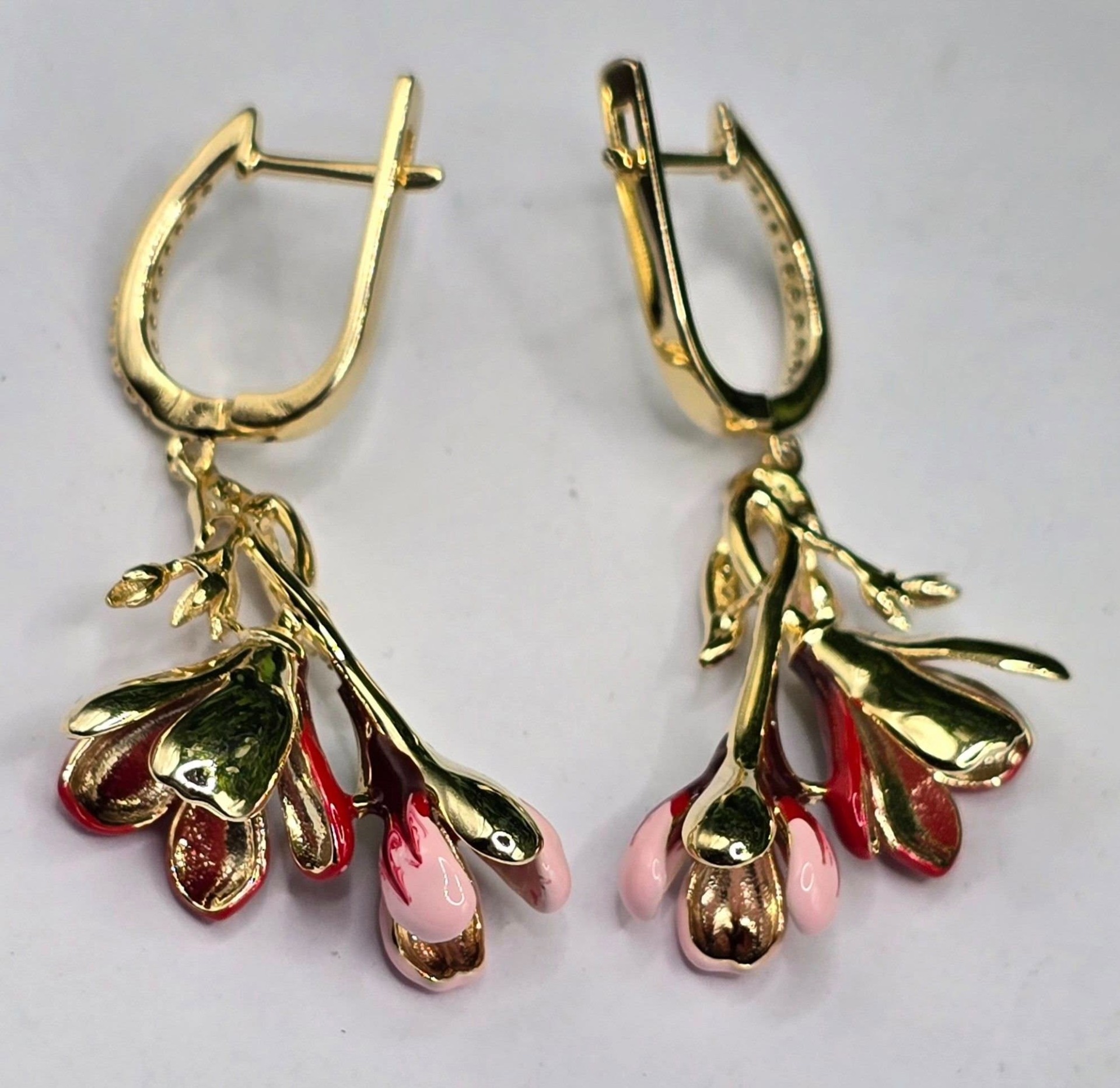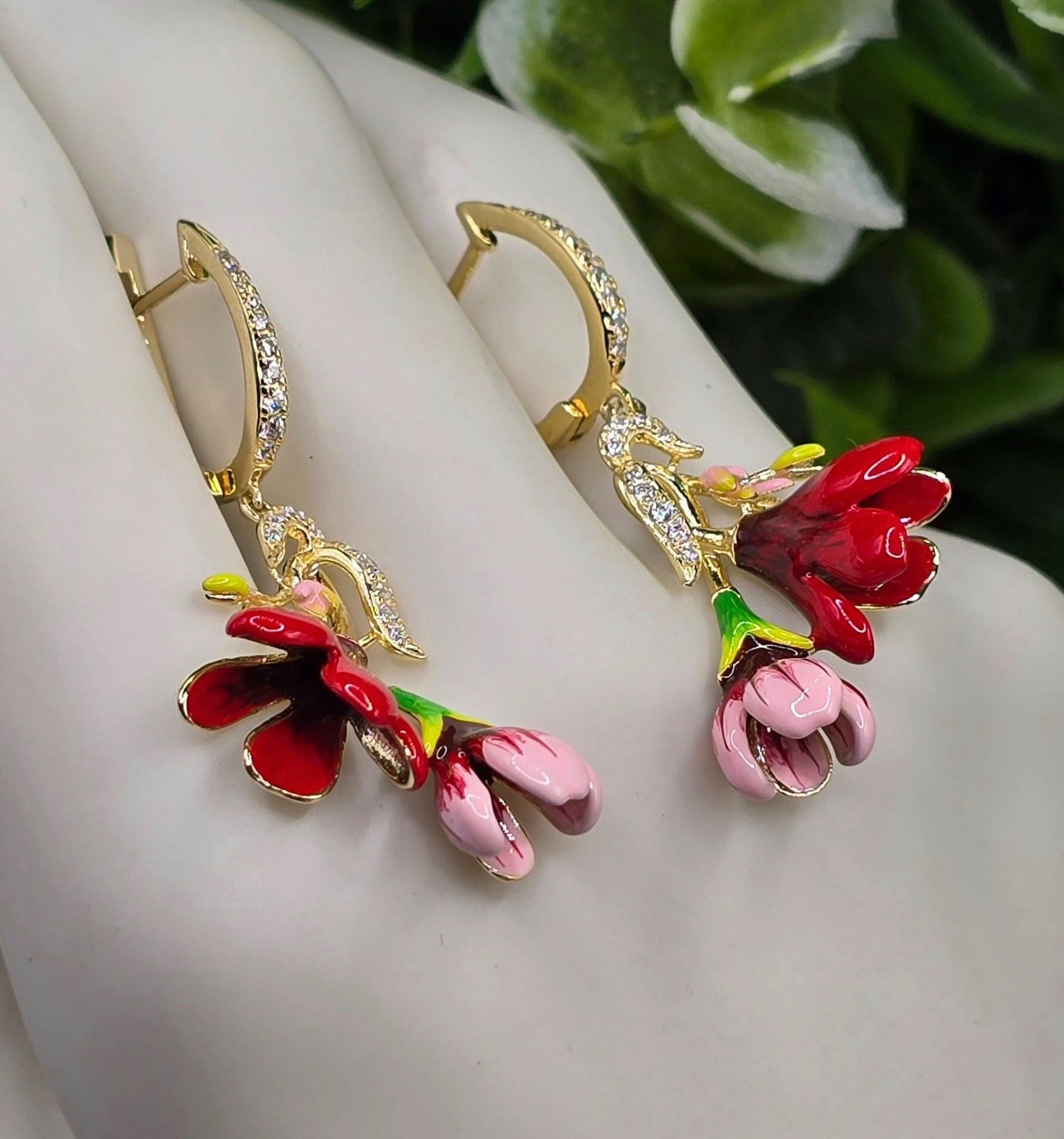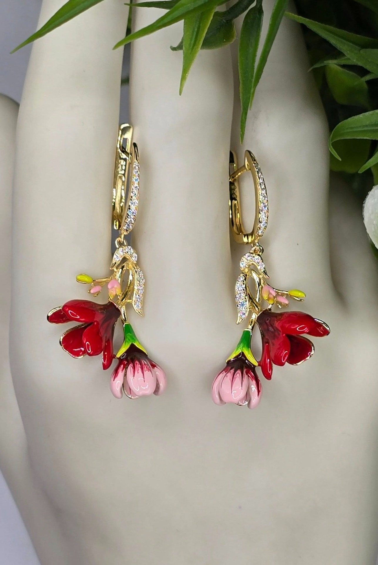 Cercei contemporani spectaculoși, din argint aurit, cu email și pietre cubic zirconia, stilizați în motiv floral, manufactură de excepție.