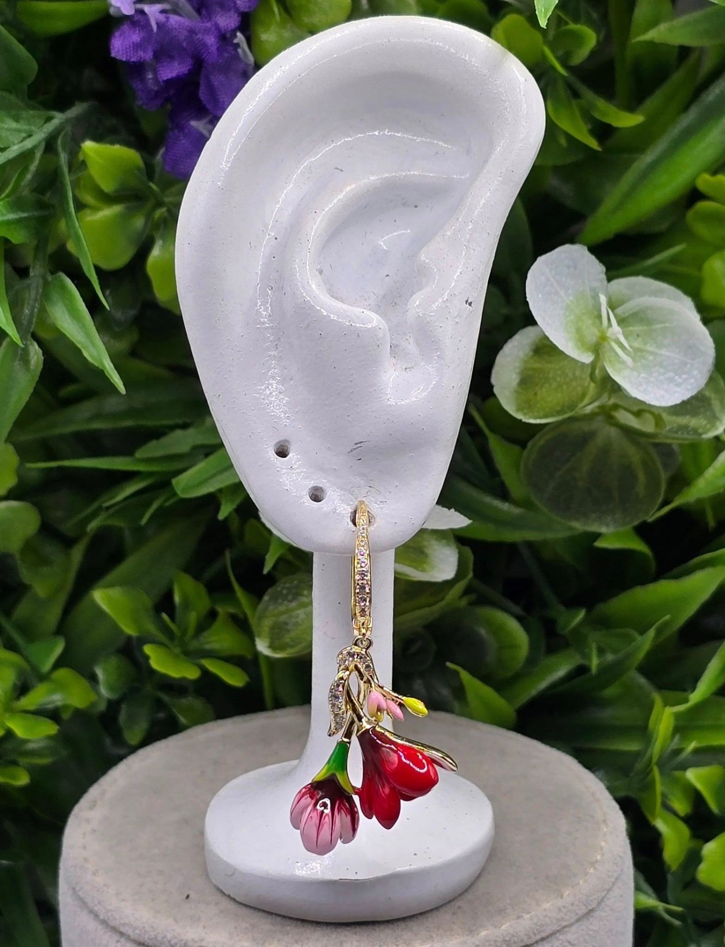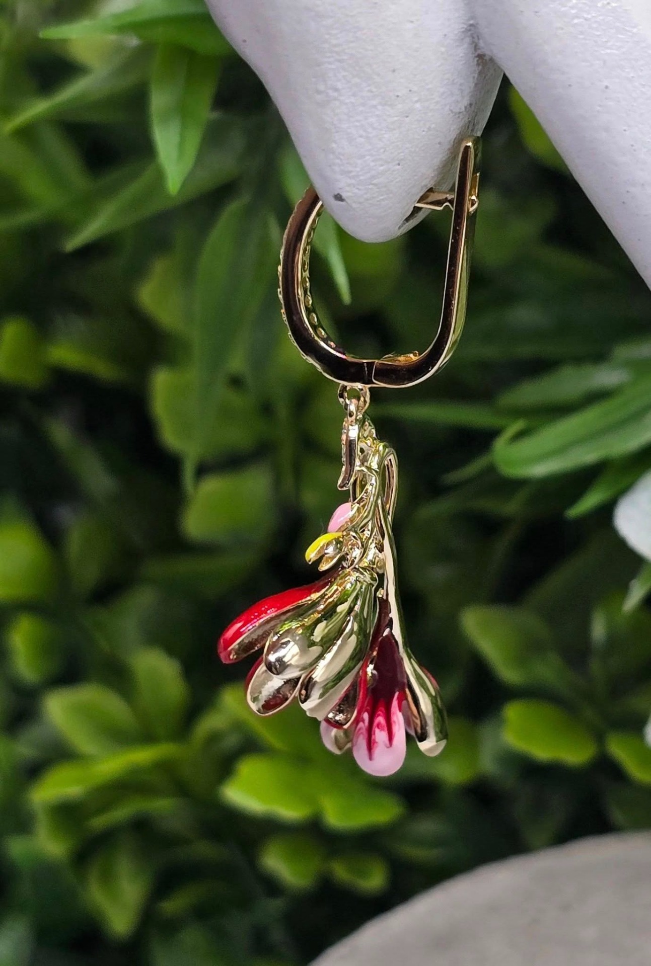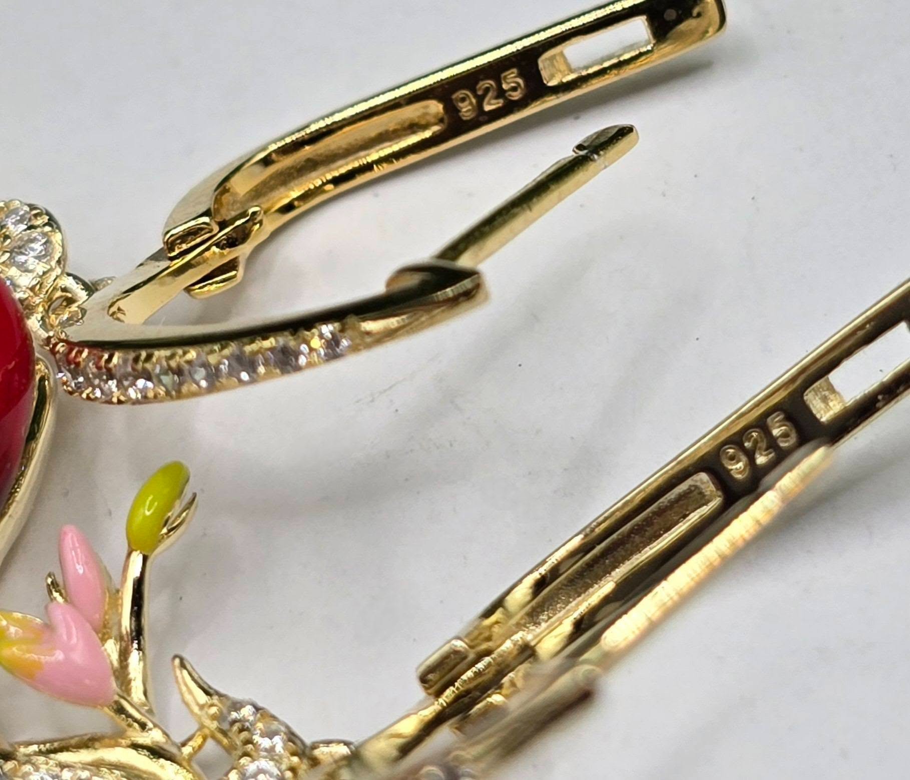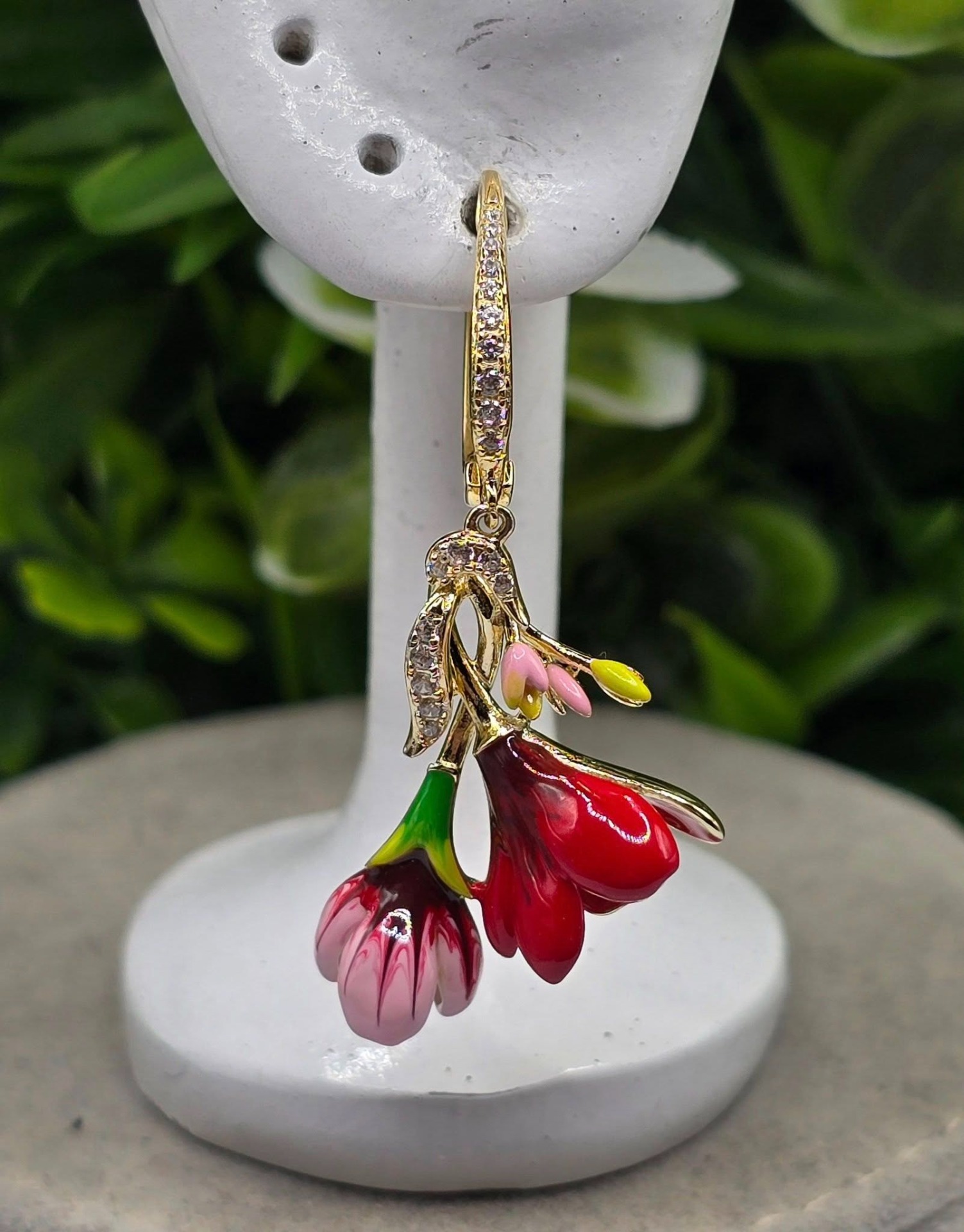 Cercei contemporani spectaculoși, din argint aurit, cu email și pietre cubic zirconia, stilizați în motiv floral, manufactură de excepție.