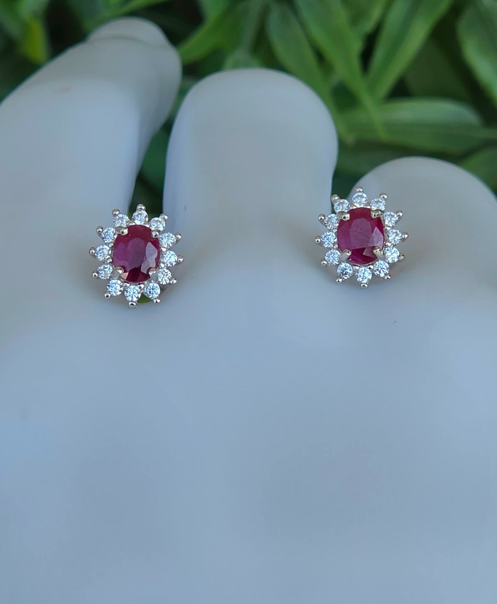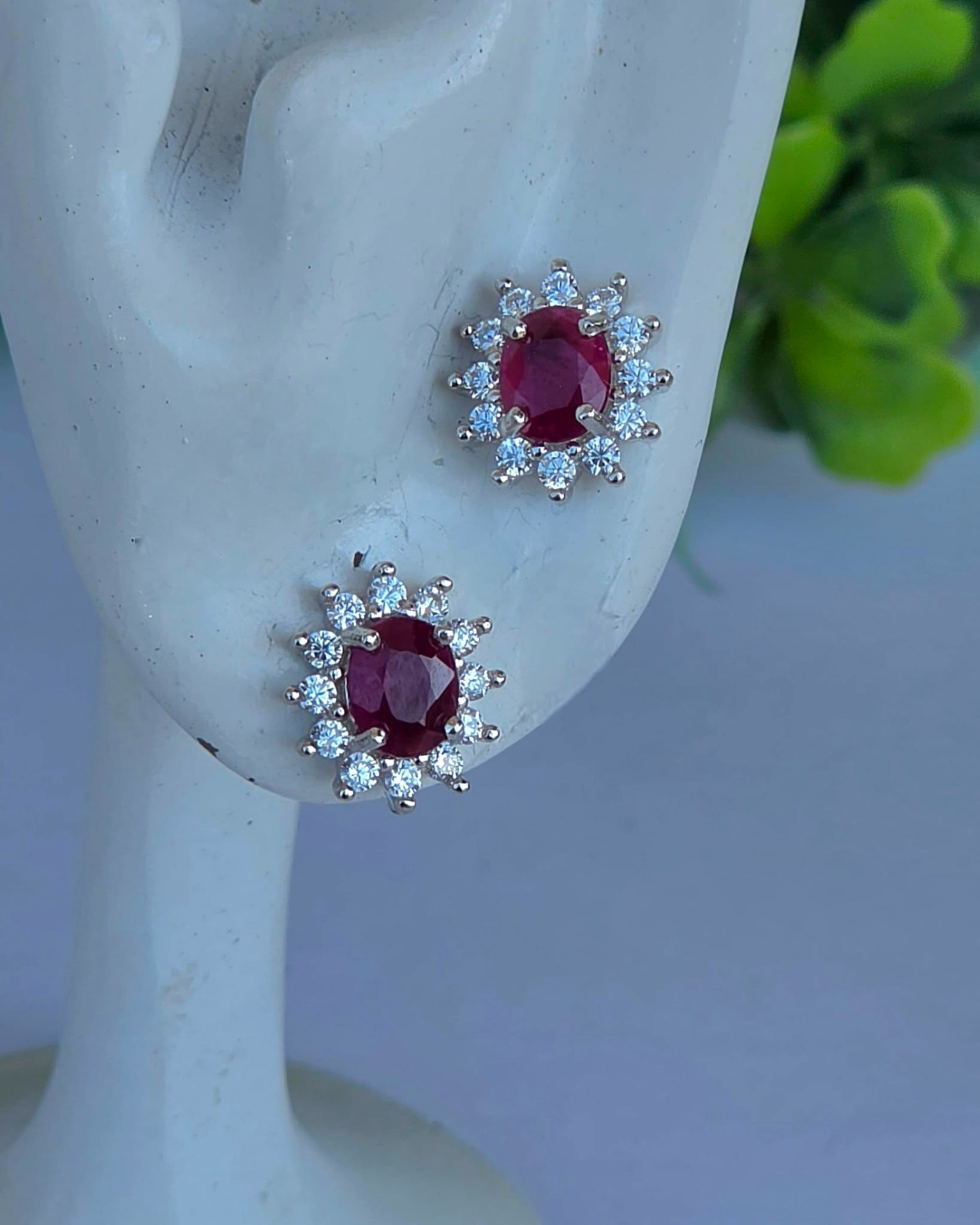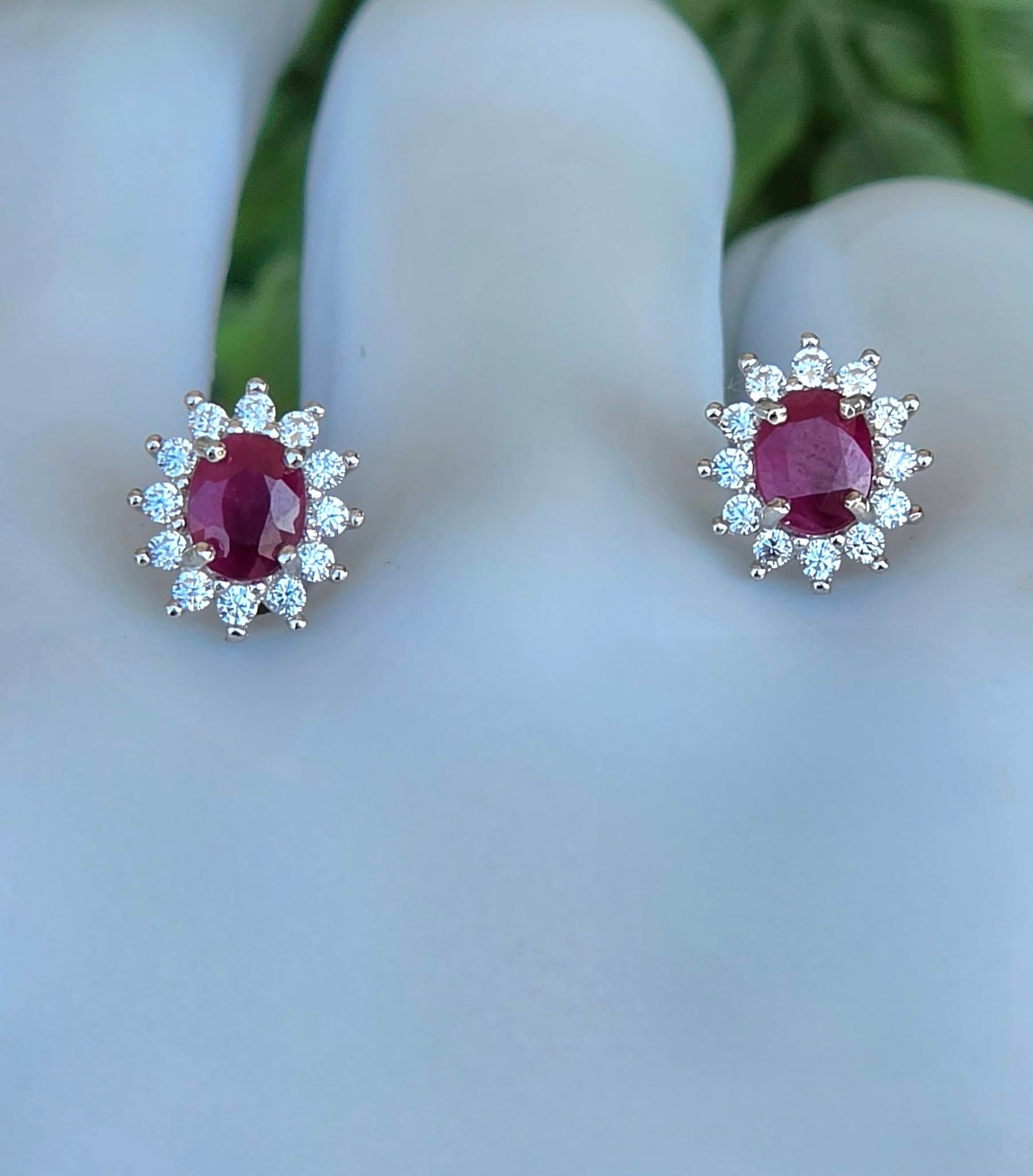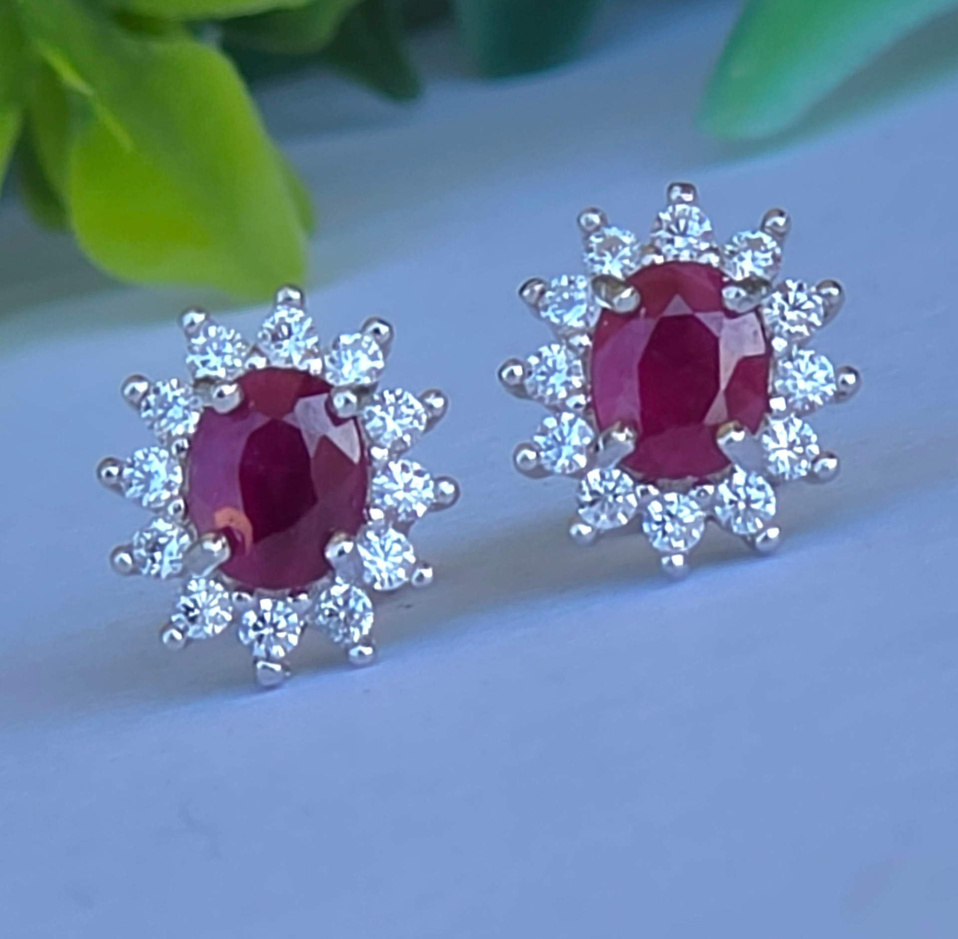 Cercei contemporani spectaculoși, din argint platinat, cu 2 superbe rubine naturale și pietre cubic zirconia.