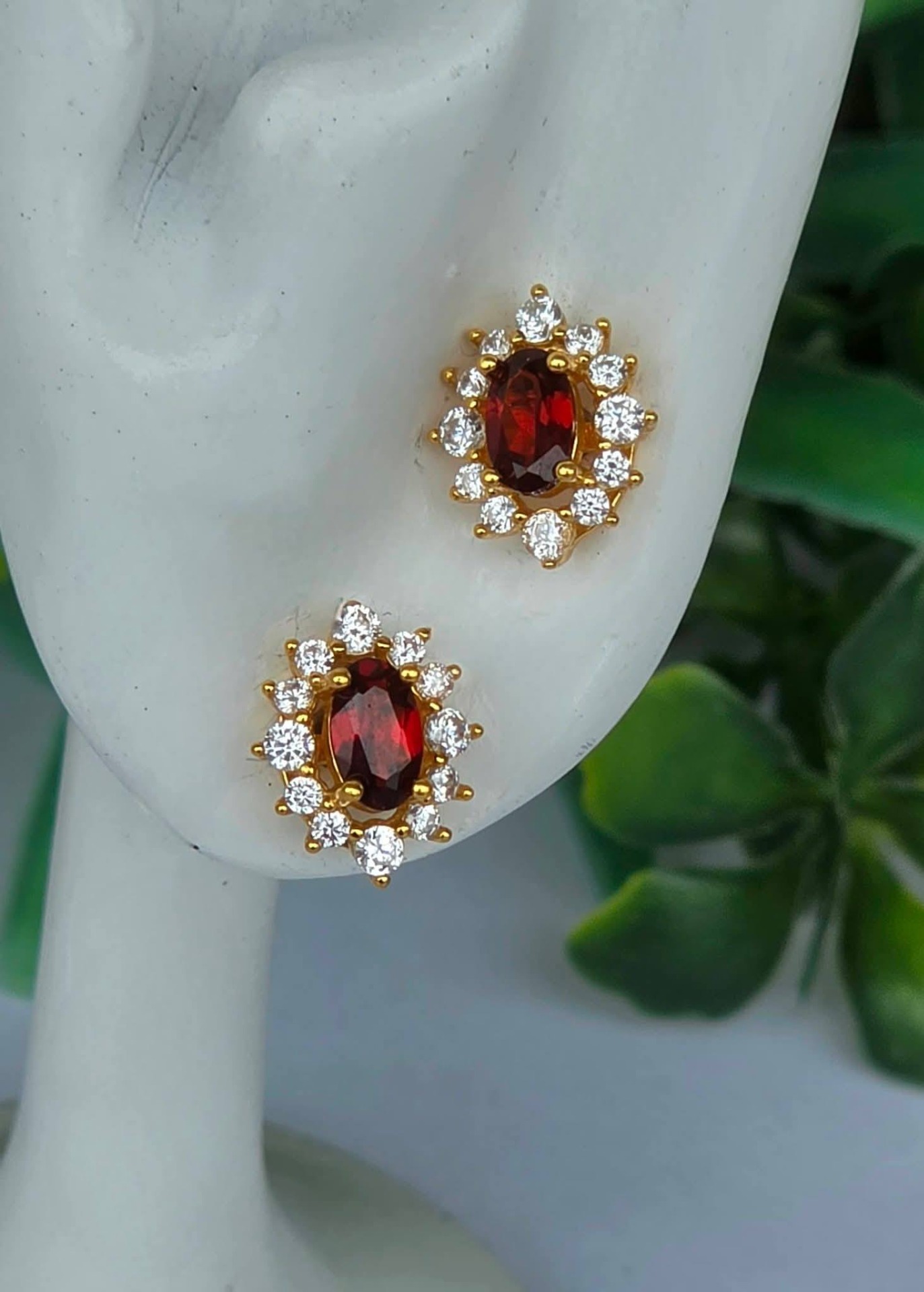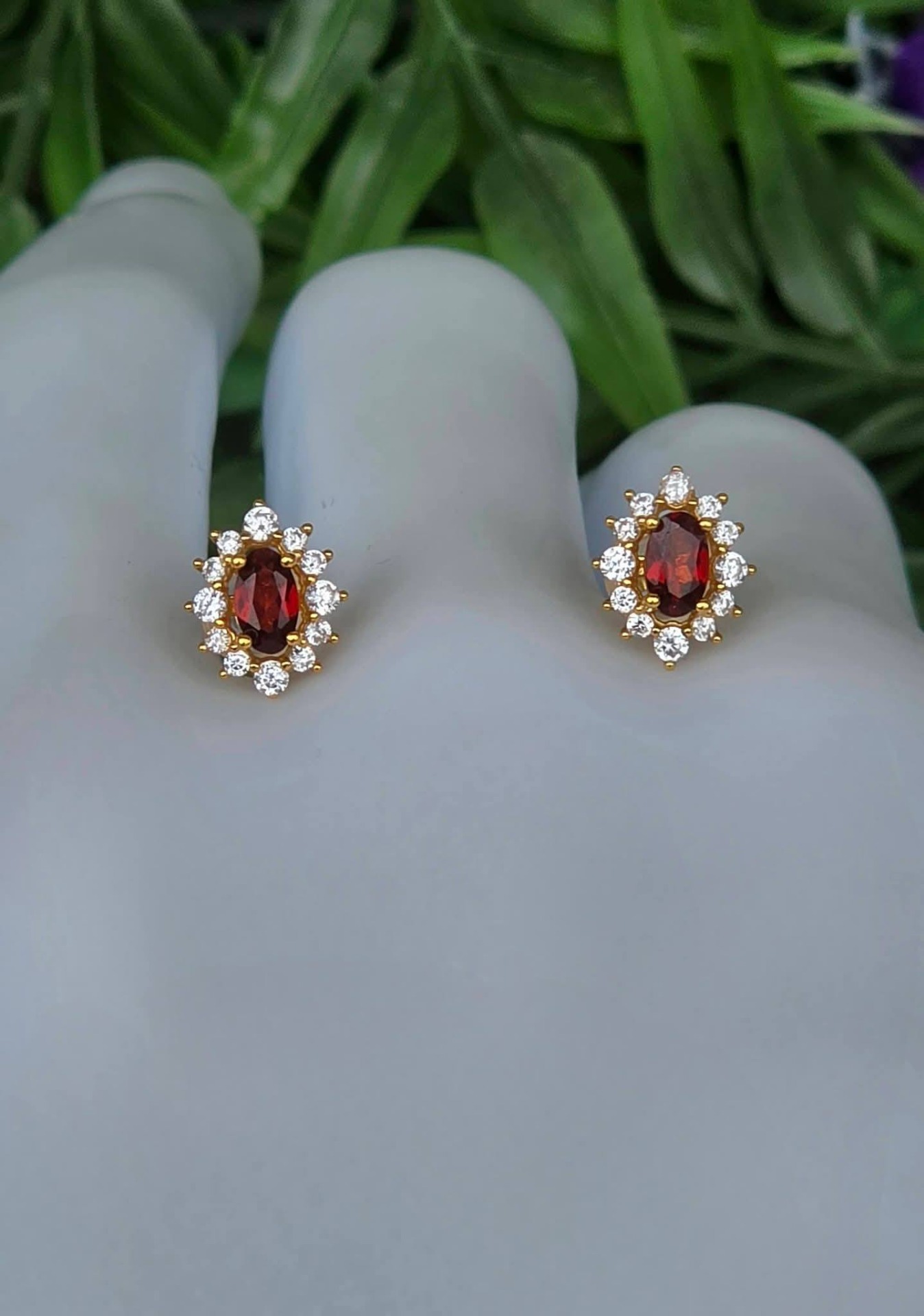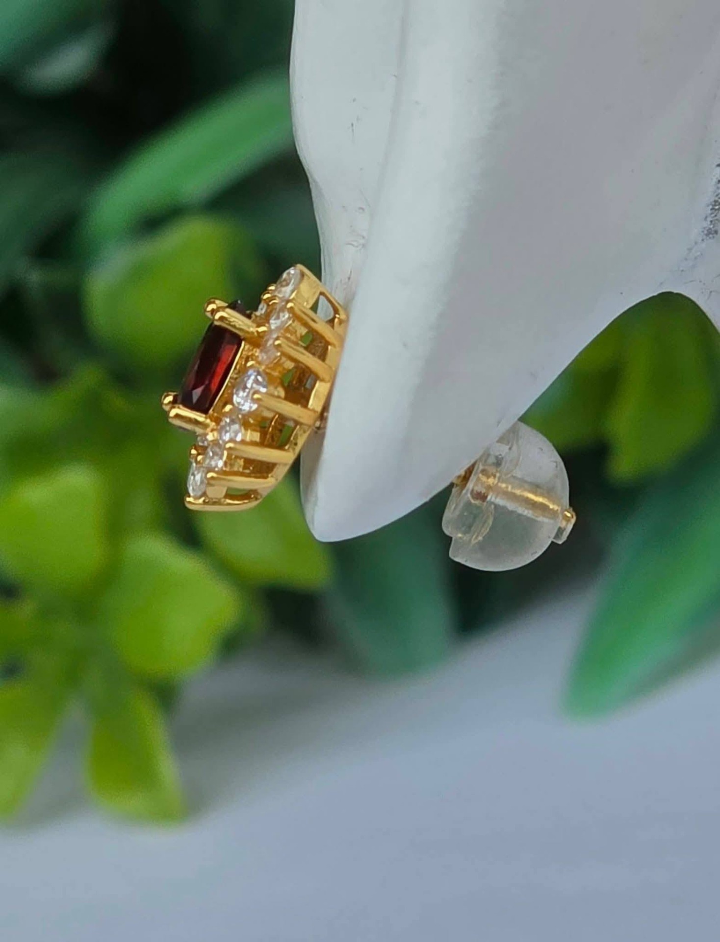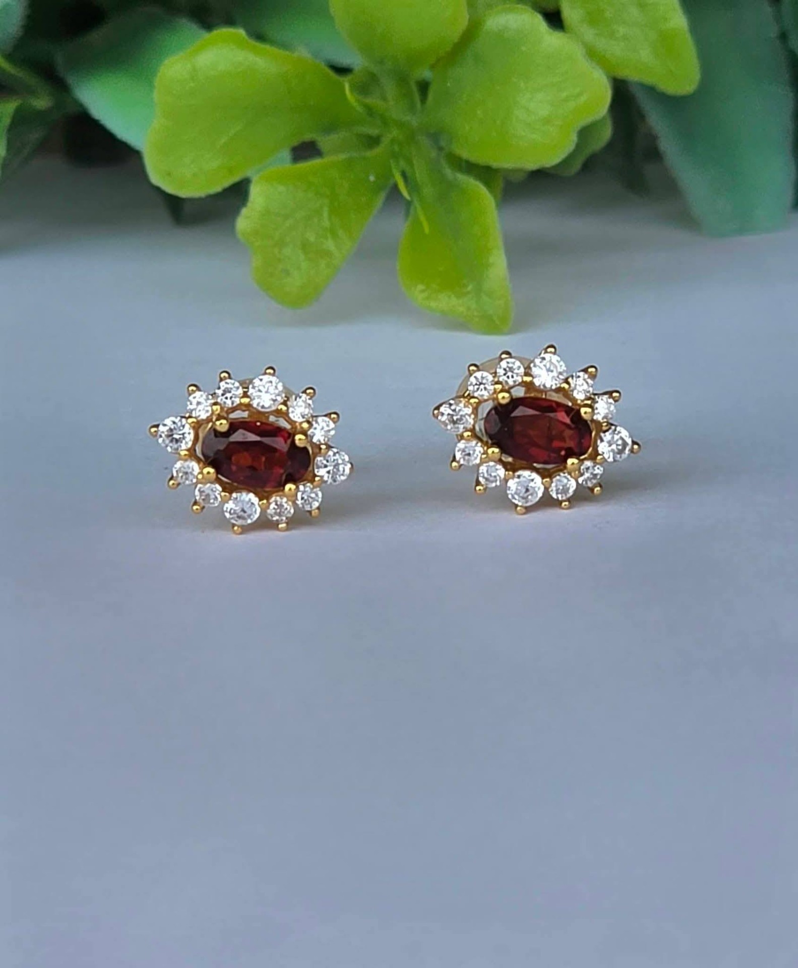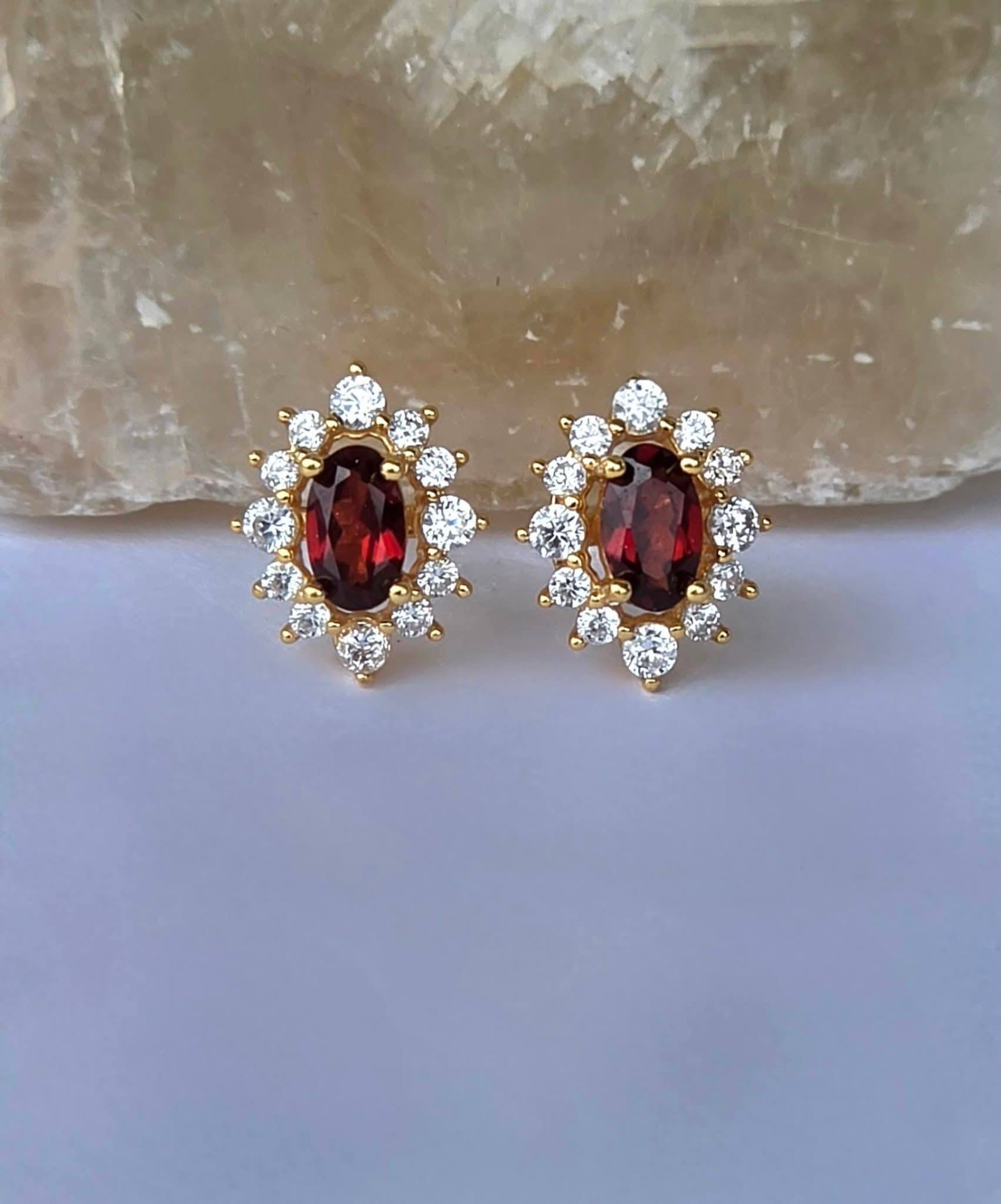 Cercei contemporani superbi, din argint aurit, cu granate naturale și pietre cubic zirconia.