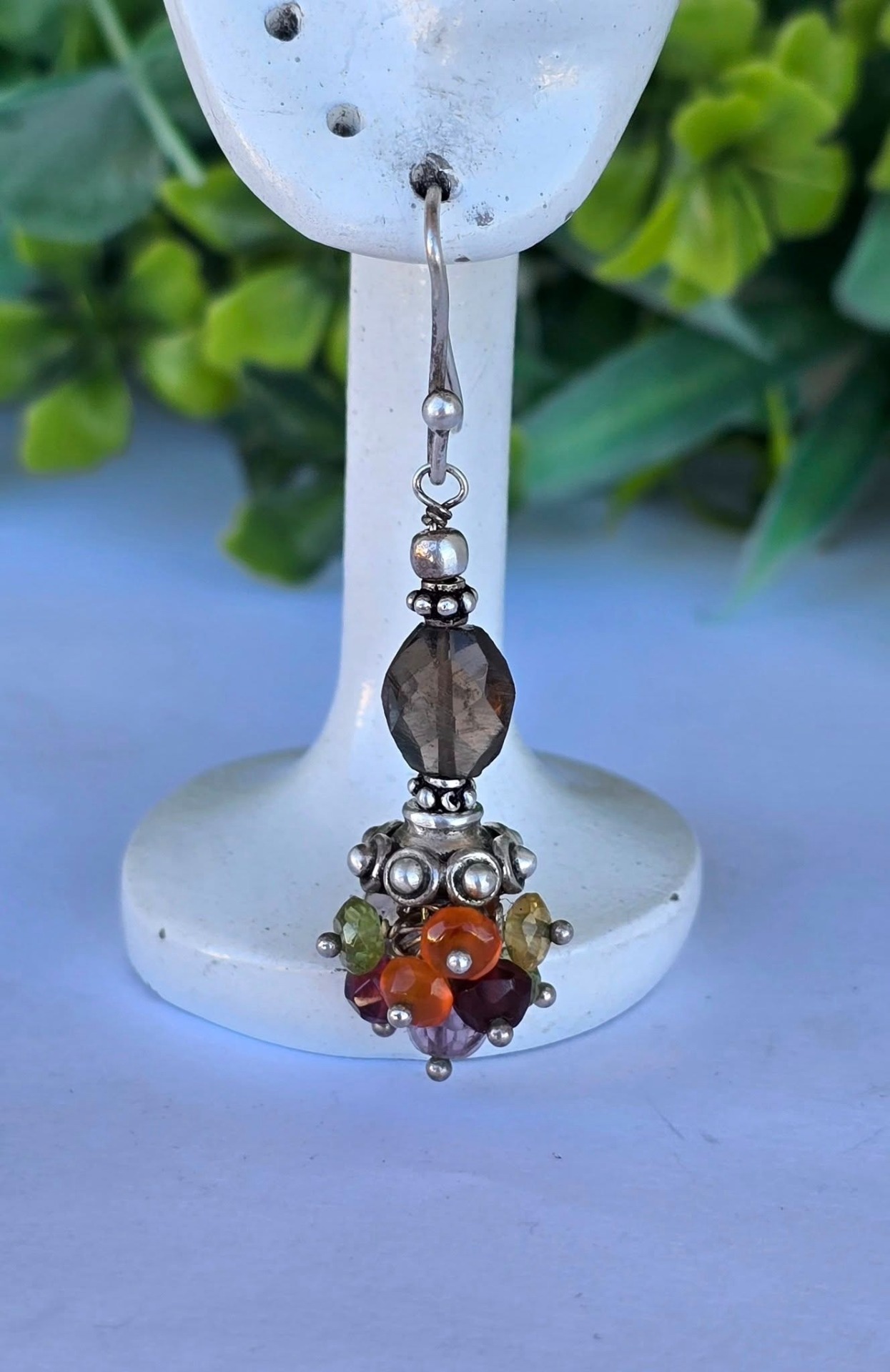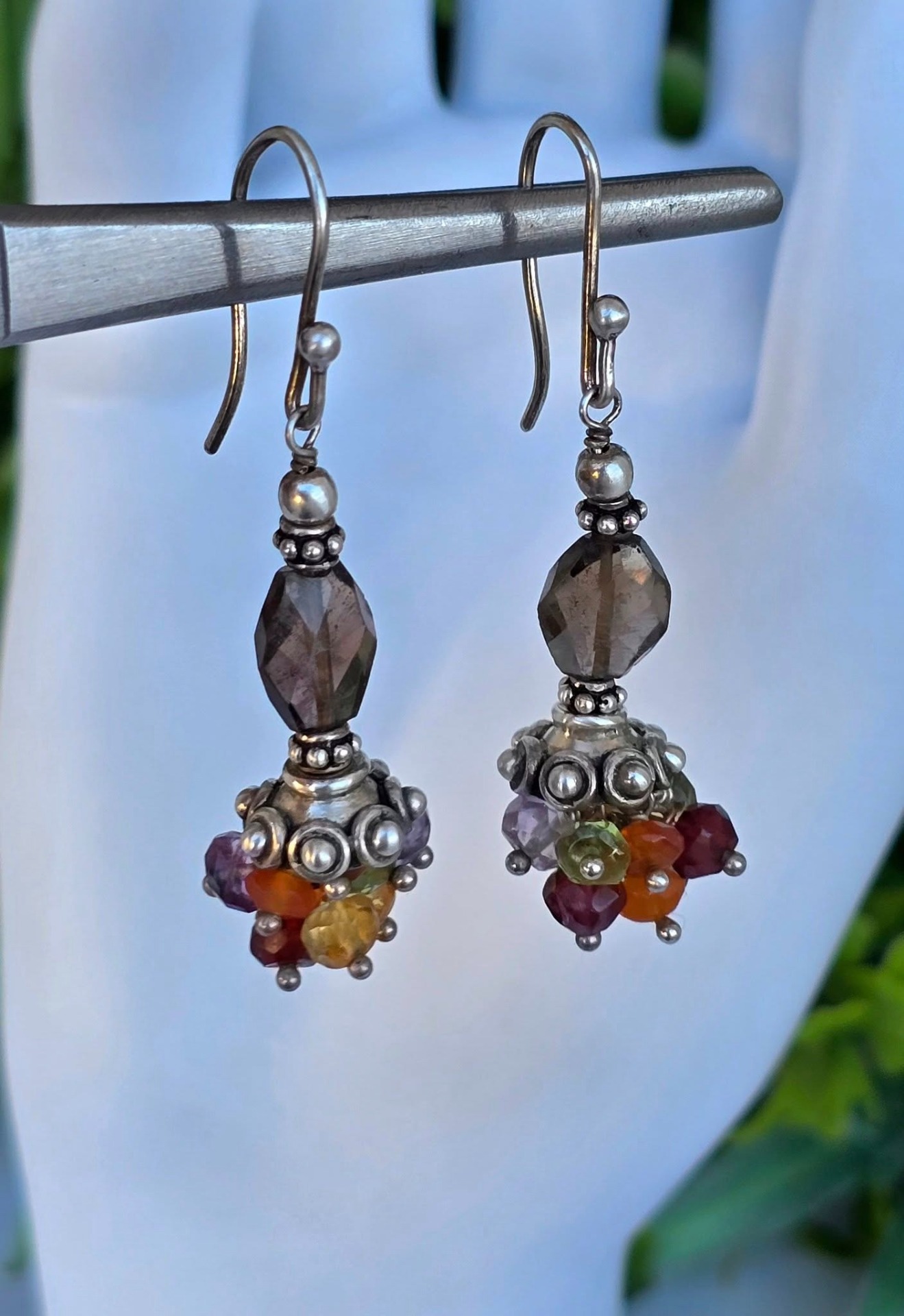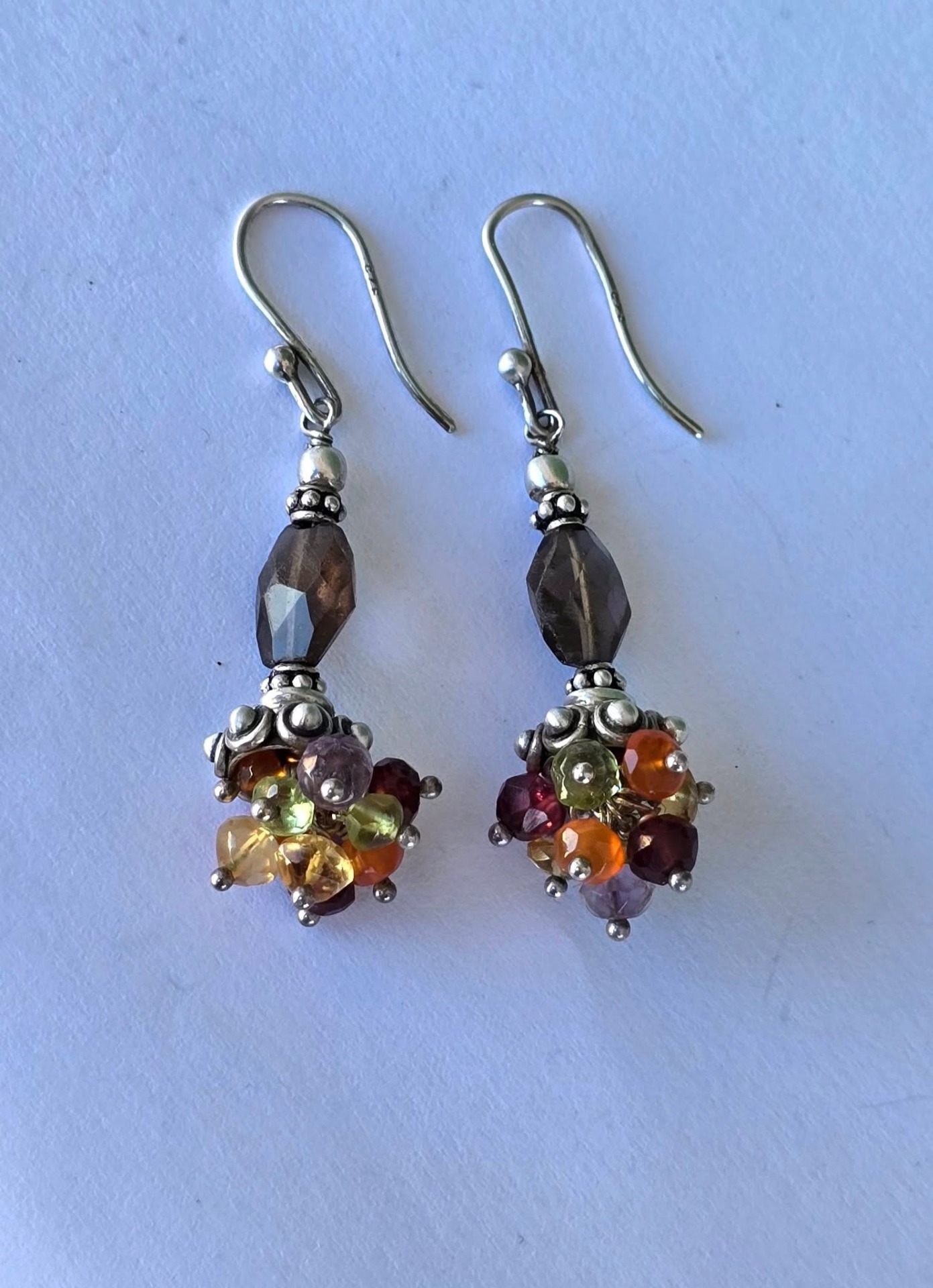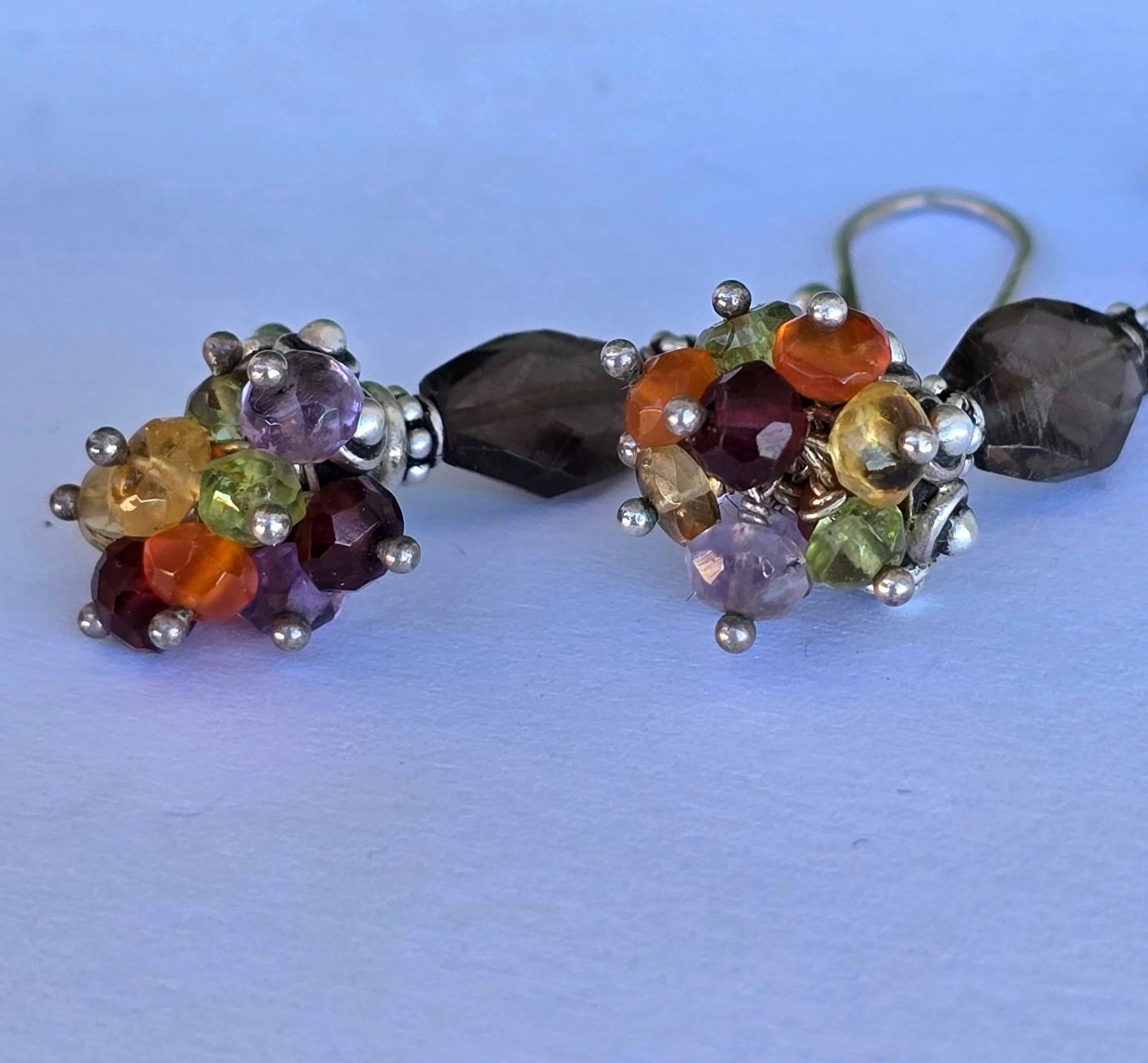 Cercei "multigem" vechi, din argint, cu "briolette" de cuarț fumuriu, ametist, granat, citrin și peridot naturale.