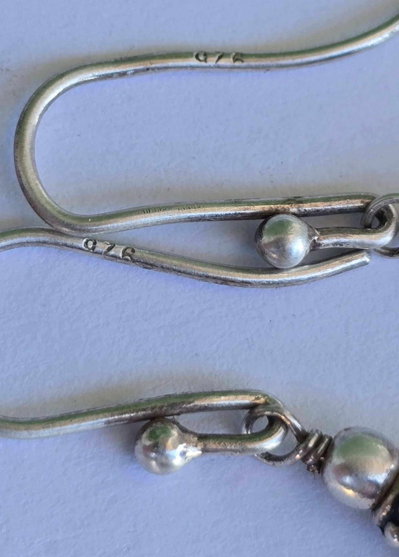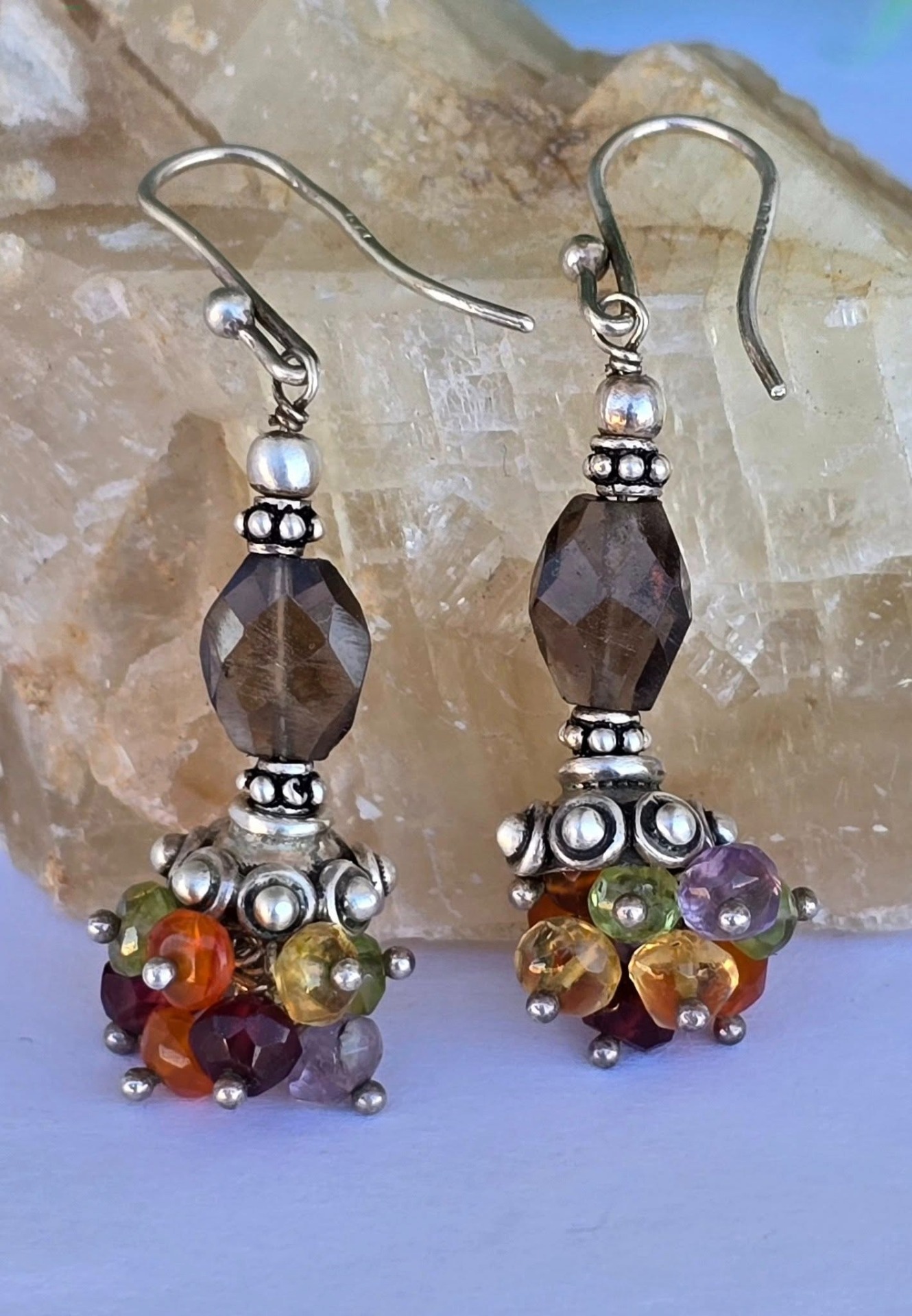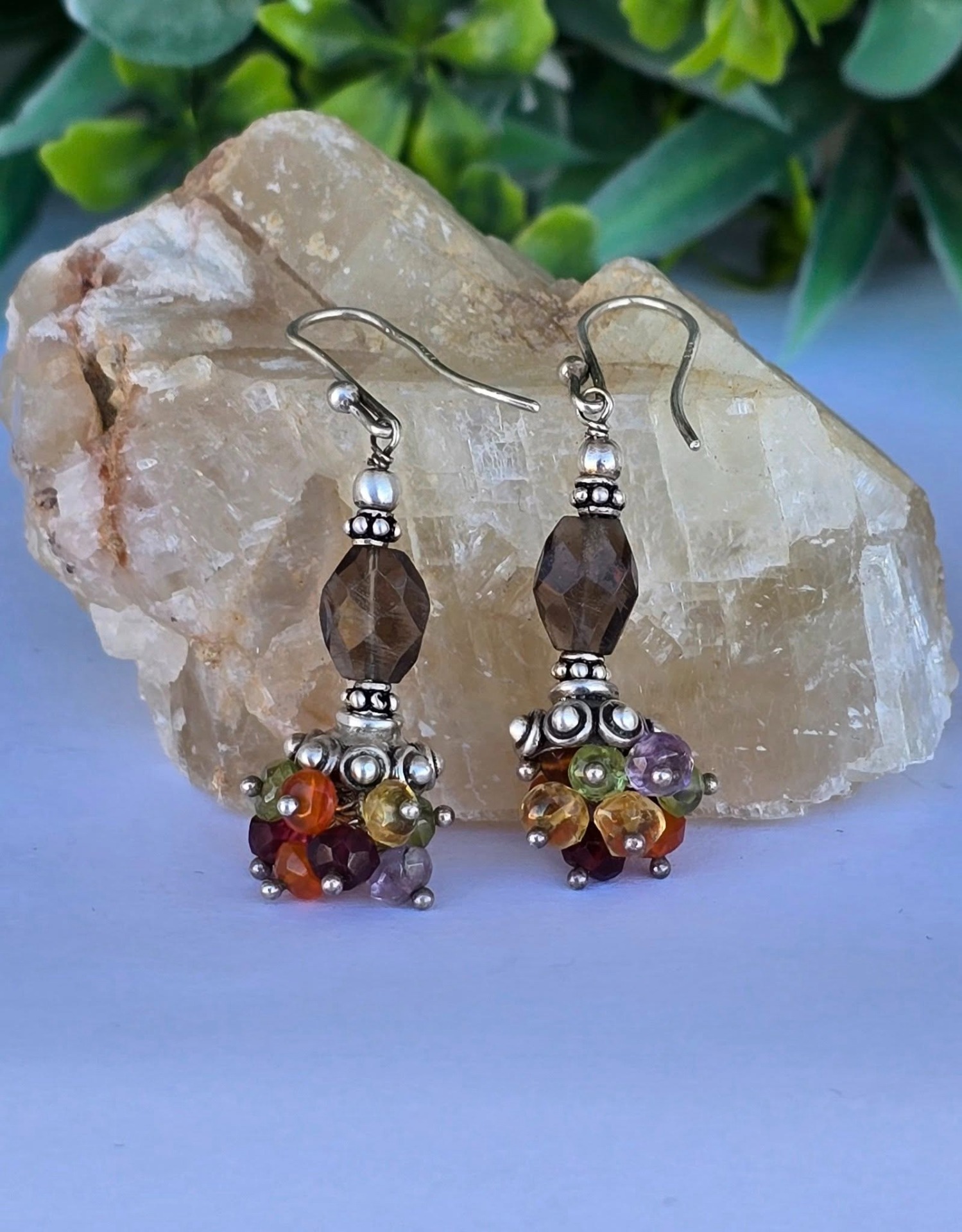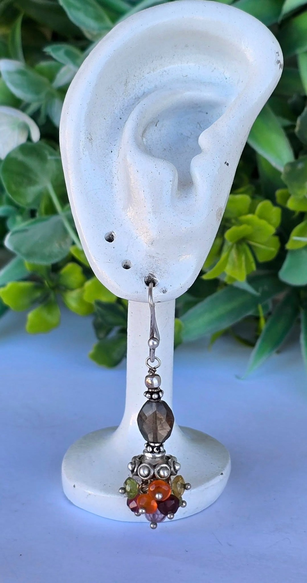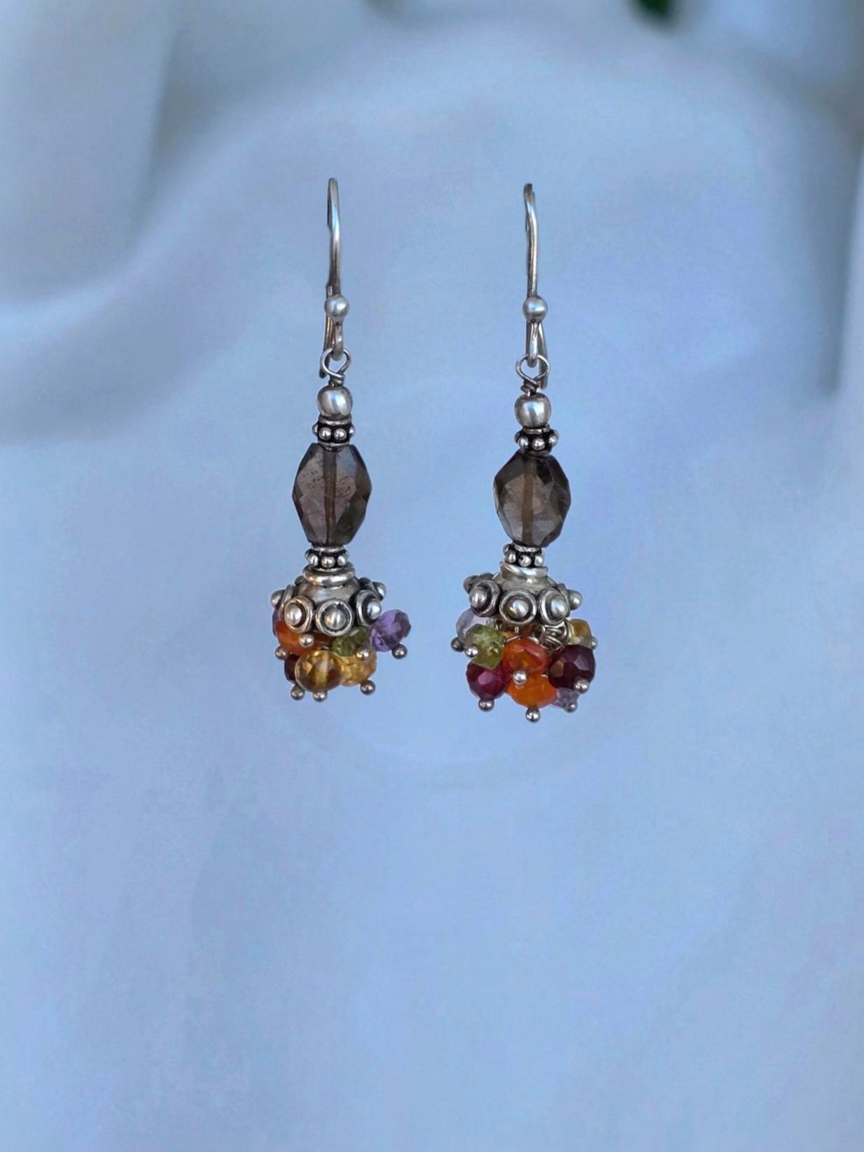 Cercei "multigem" vechi, din argint, cu "briolette" de cuarț fumuriu, ametist, granat, citrin și peridot naturale.