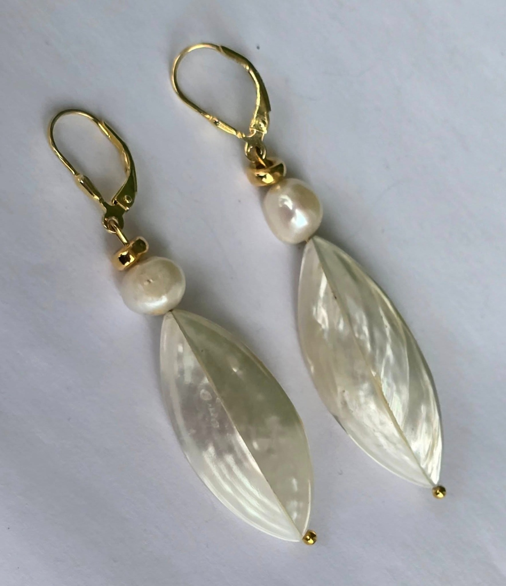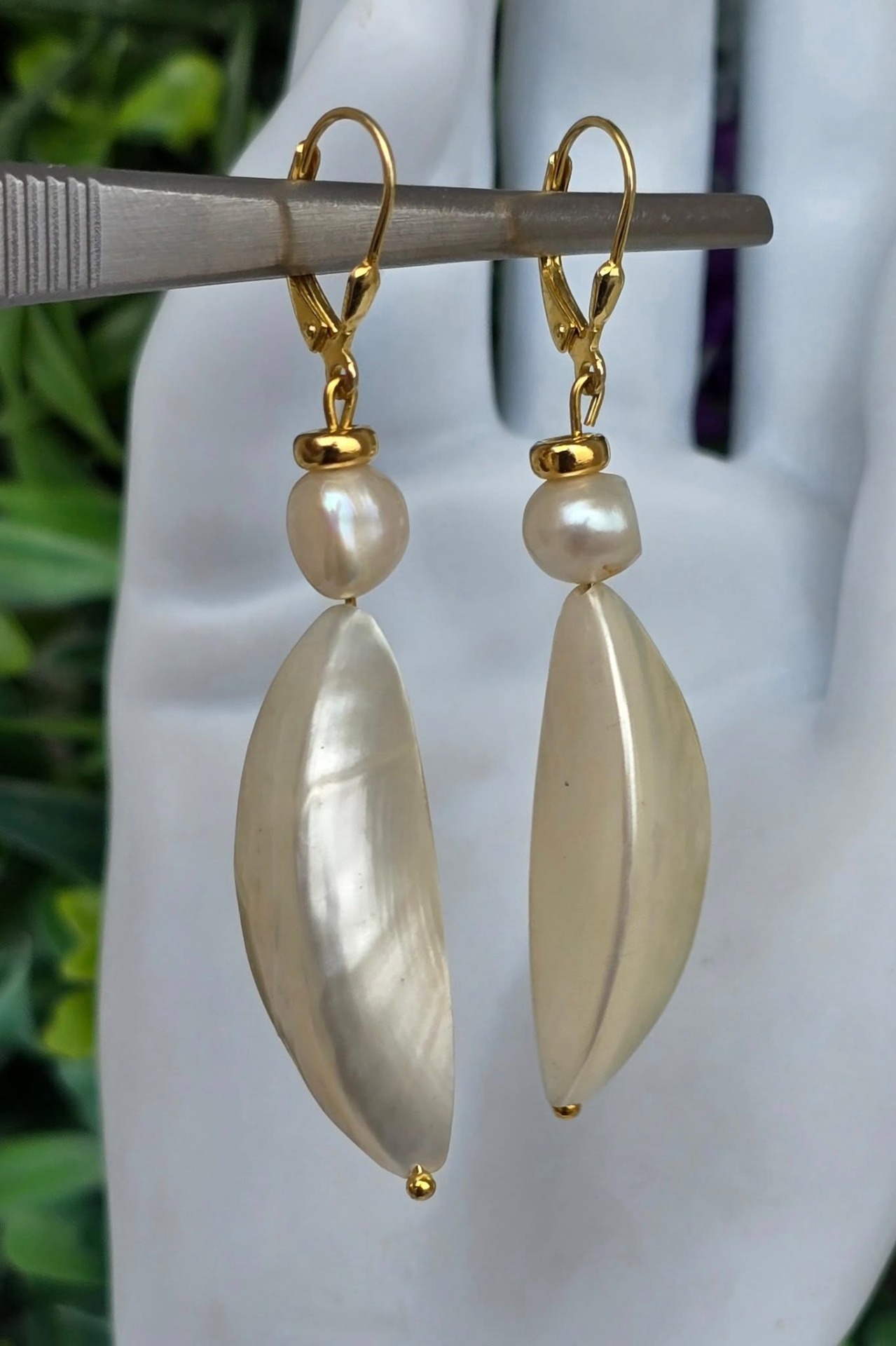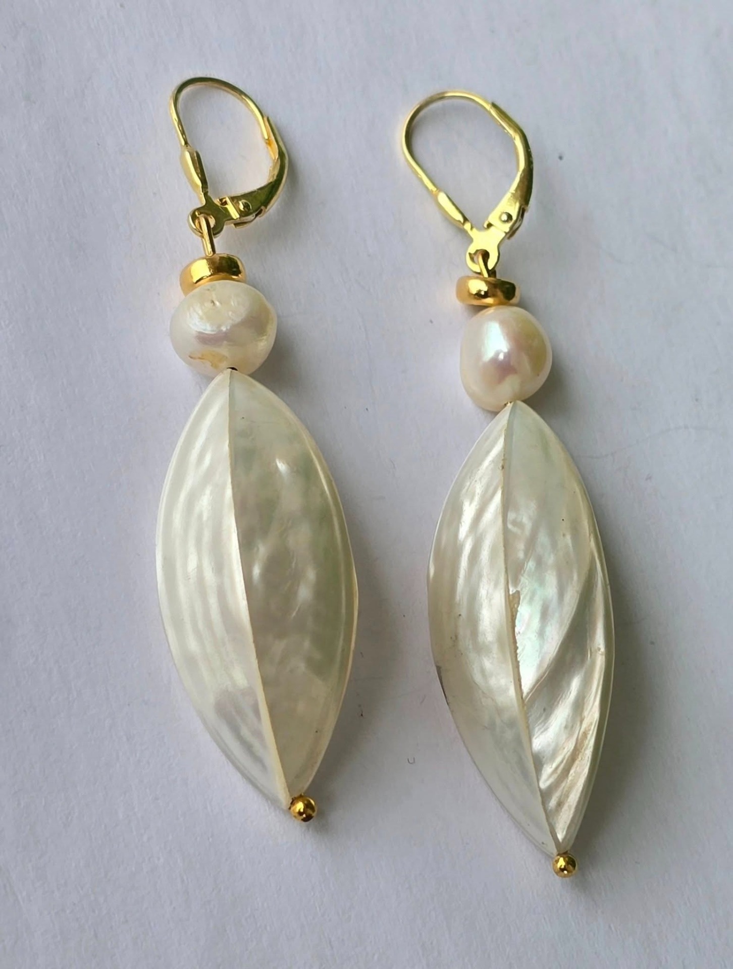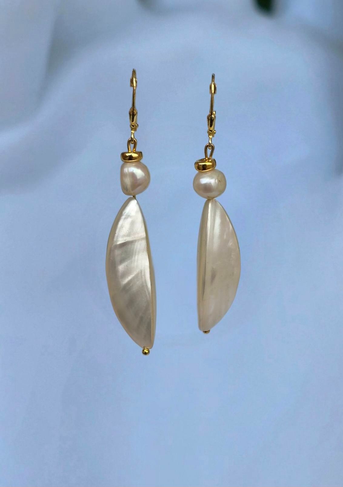 Cercei vechi, asimetrici, cu perle naturale de cultură și sidef natural, cu tortițe din argint aurit.