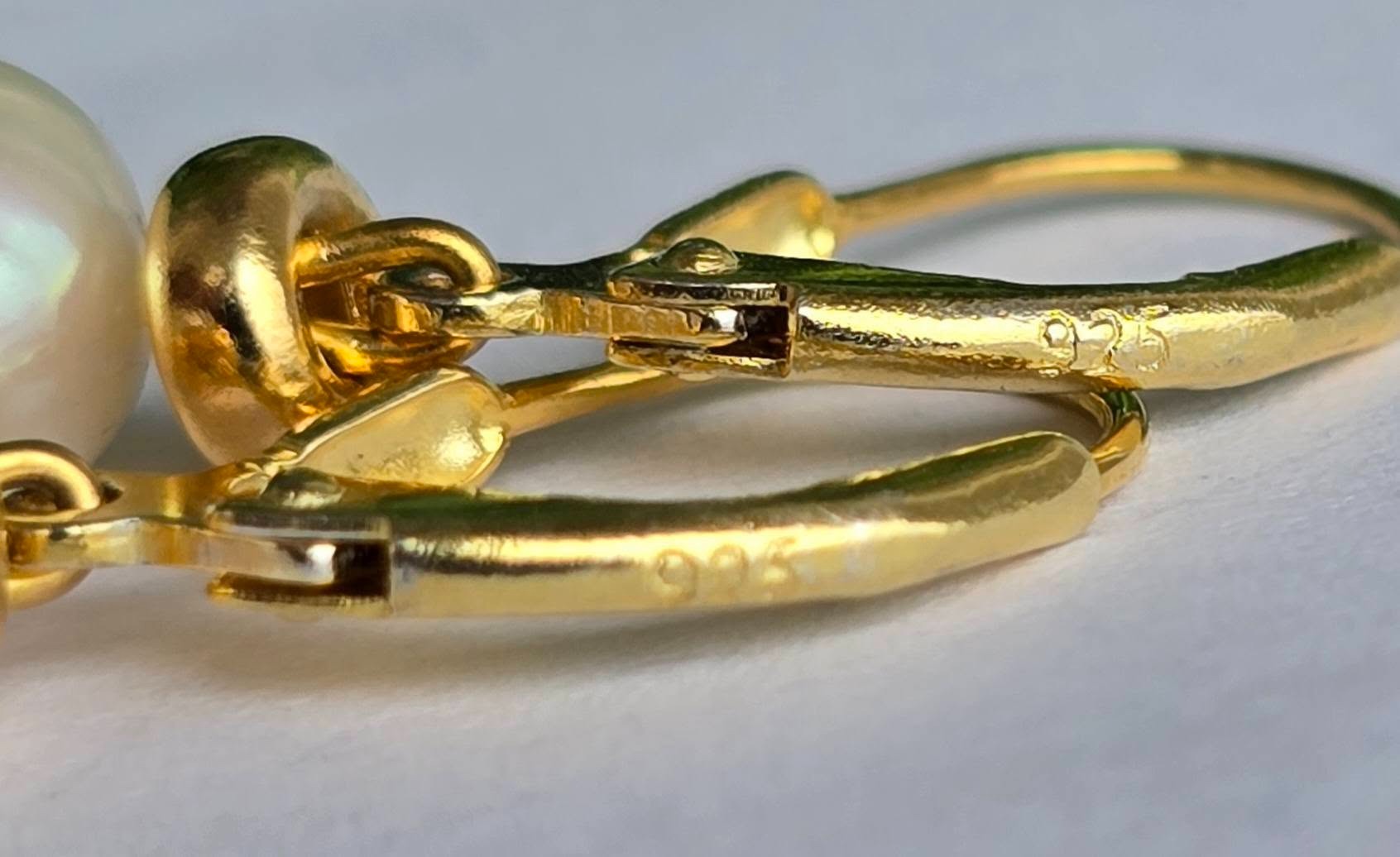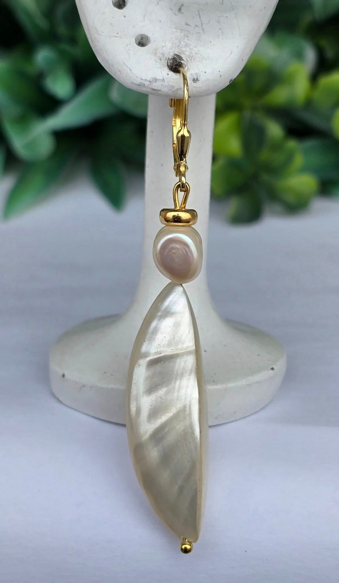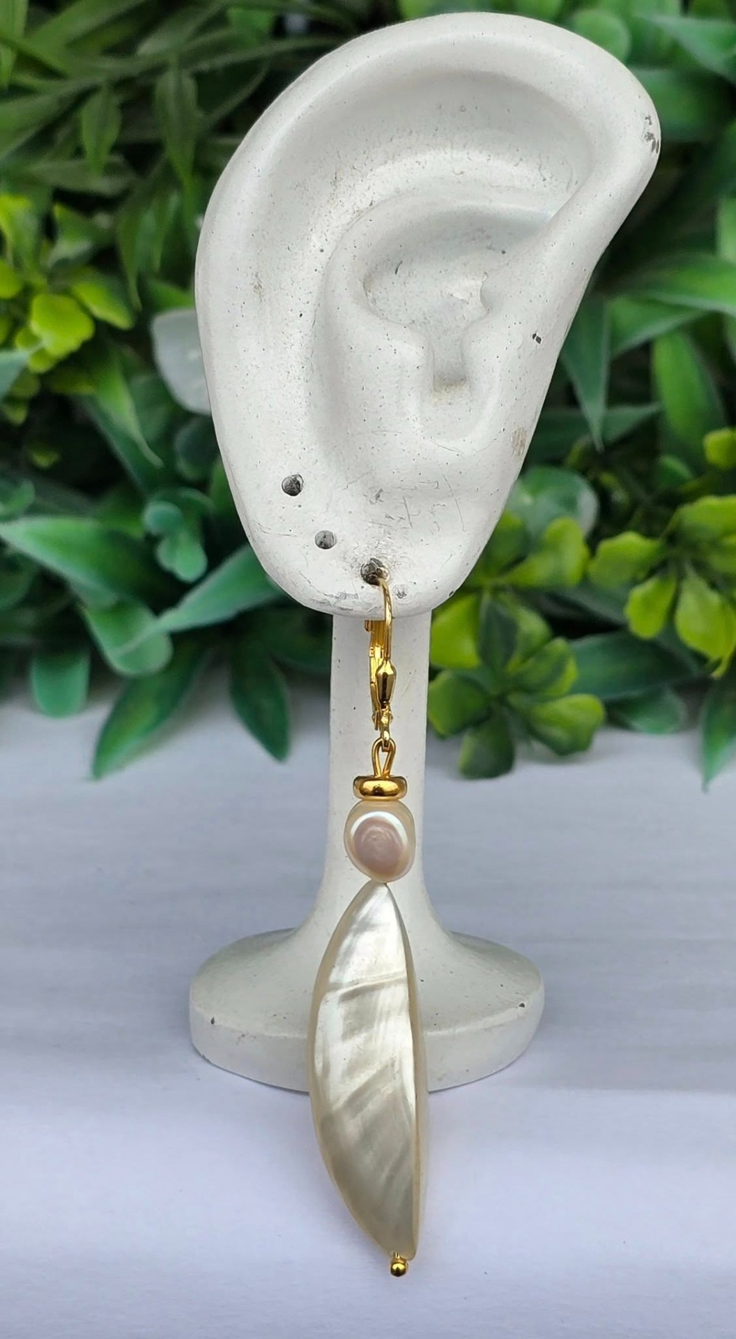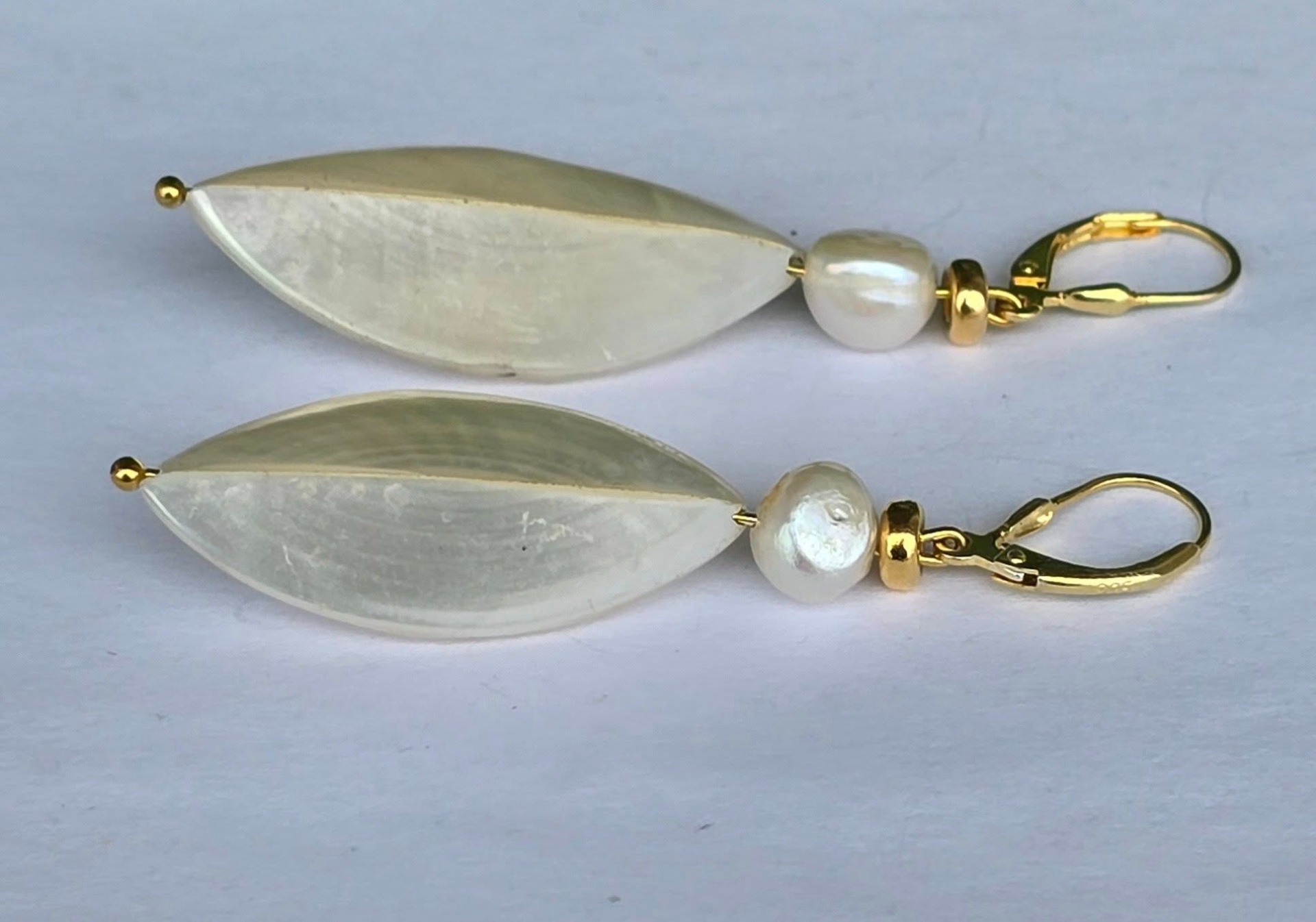 Cercei vechi, asimetrici, cu perle naturale de cultură și sidef natural, cu tortițe din argint aurit.